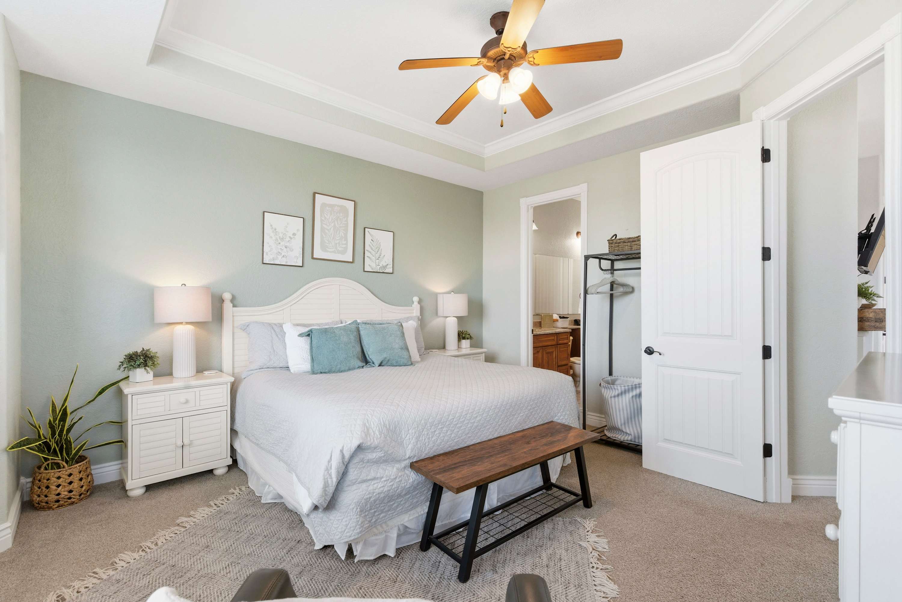Bedroom #1 includes a queen size bed, a smart TV, and an ensuite bathroom with a single vanity and a shower/tub combo.