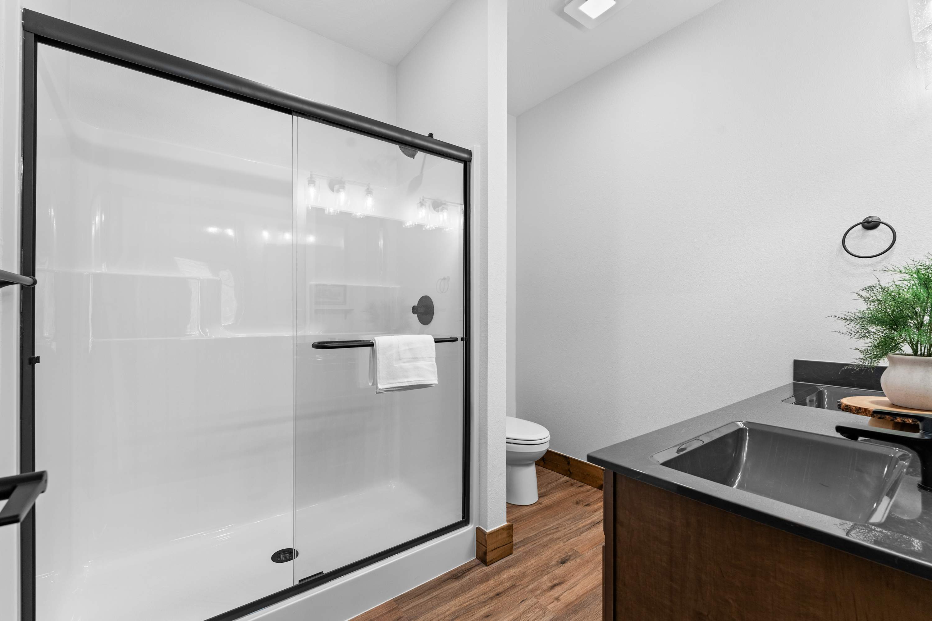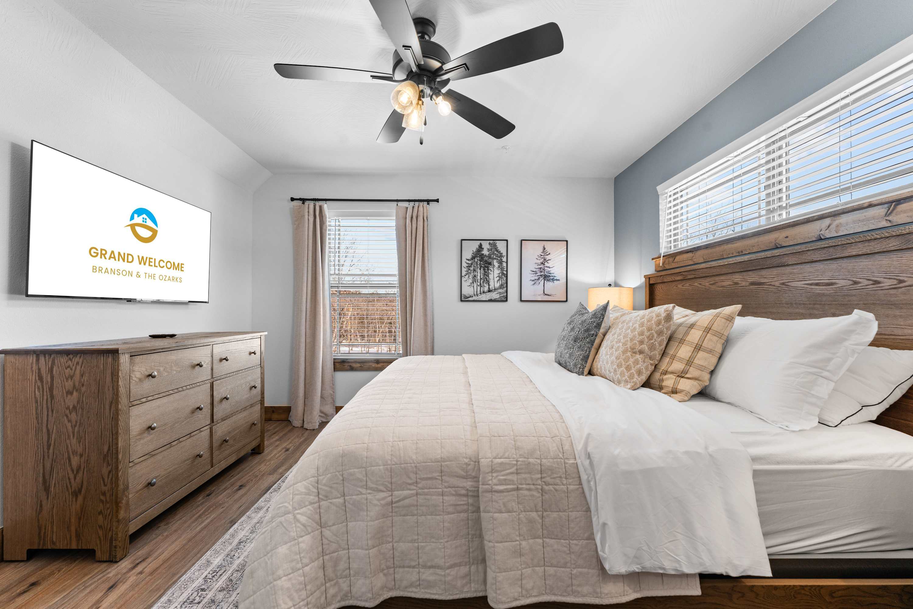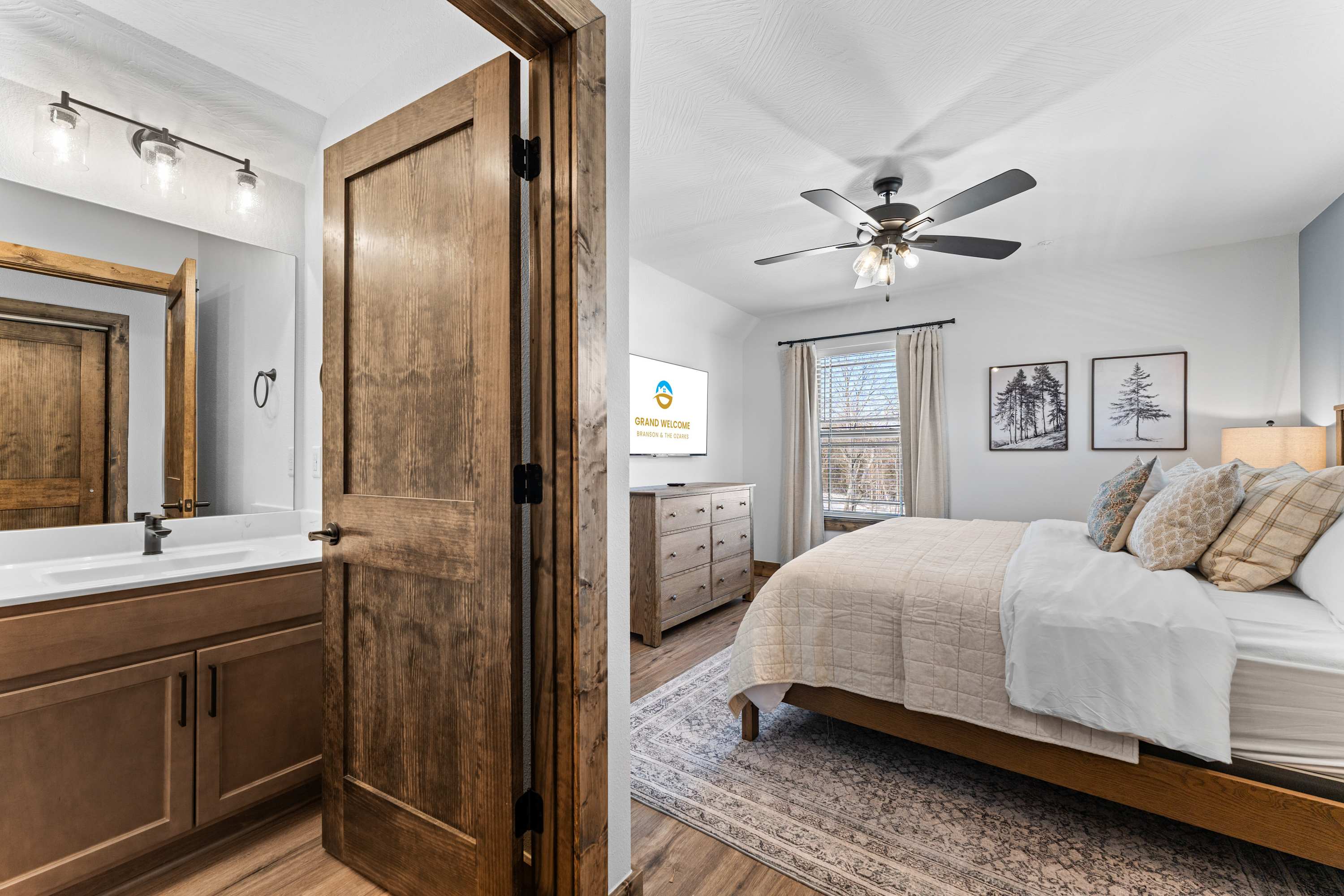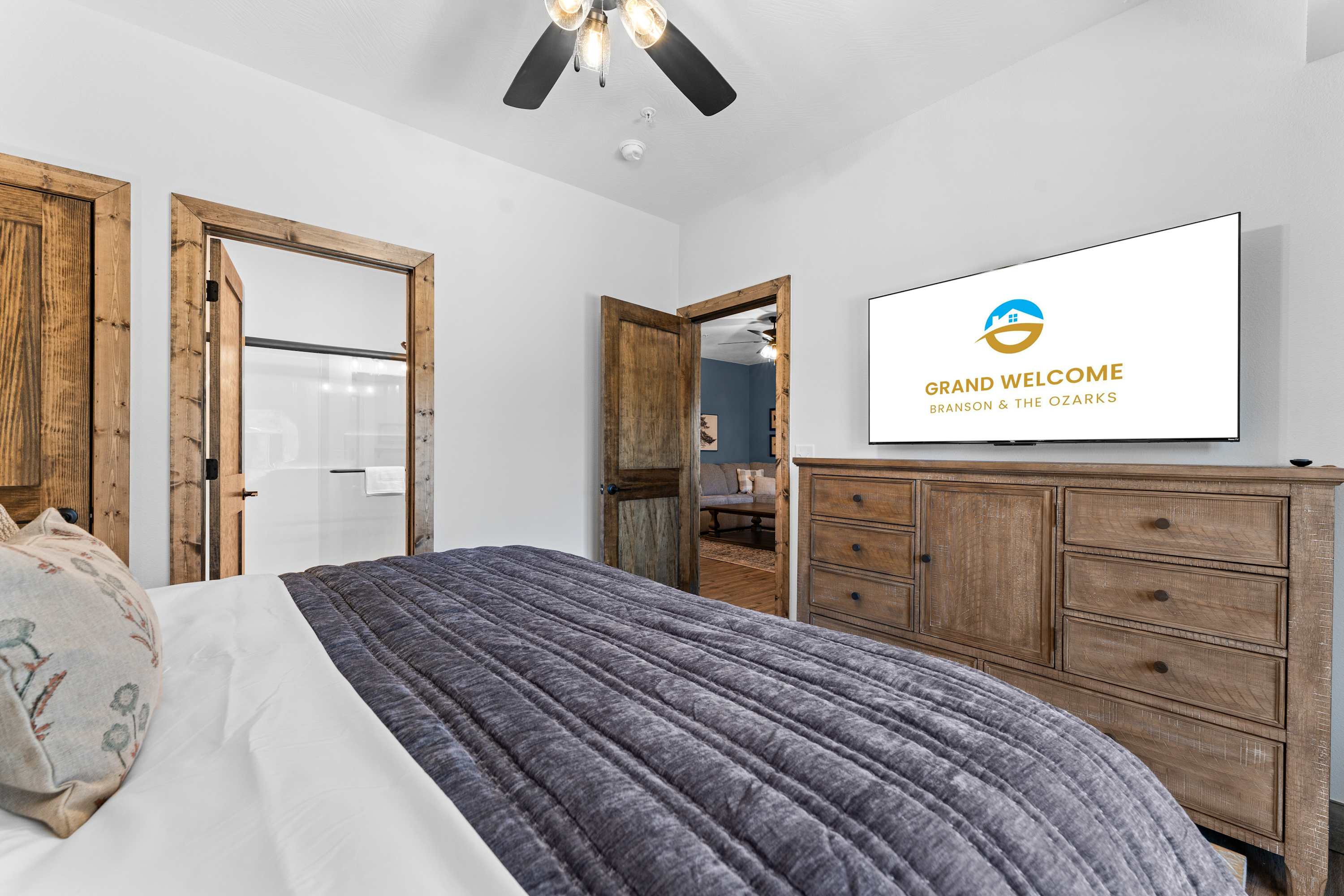 Bedroom #3 includes a king size bed, a smart TV, and an ensuite bathroom with a dual vanity and a walk-in shower.