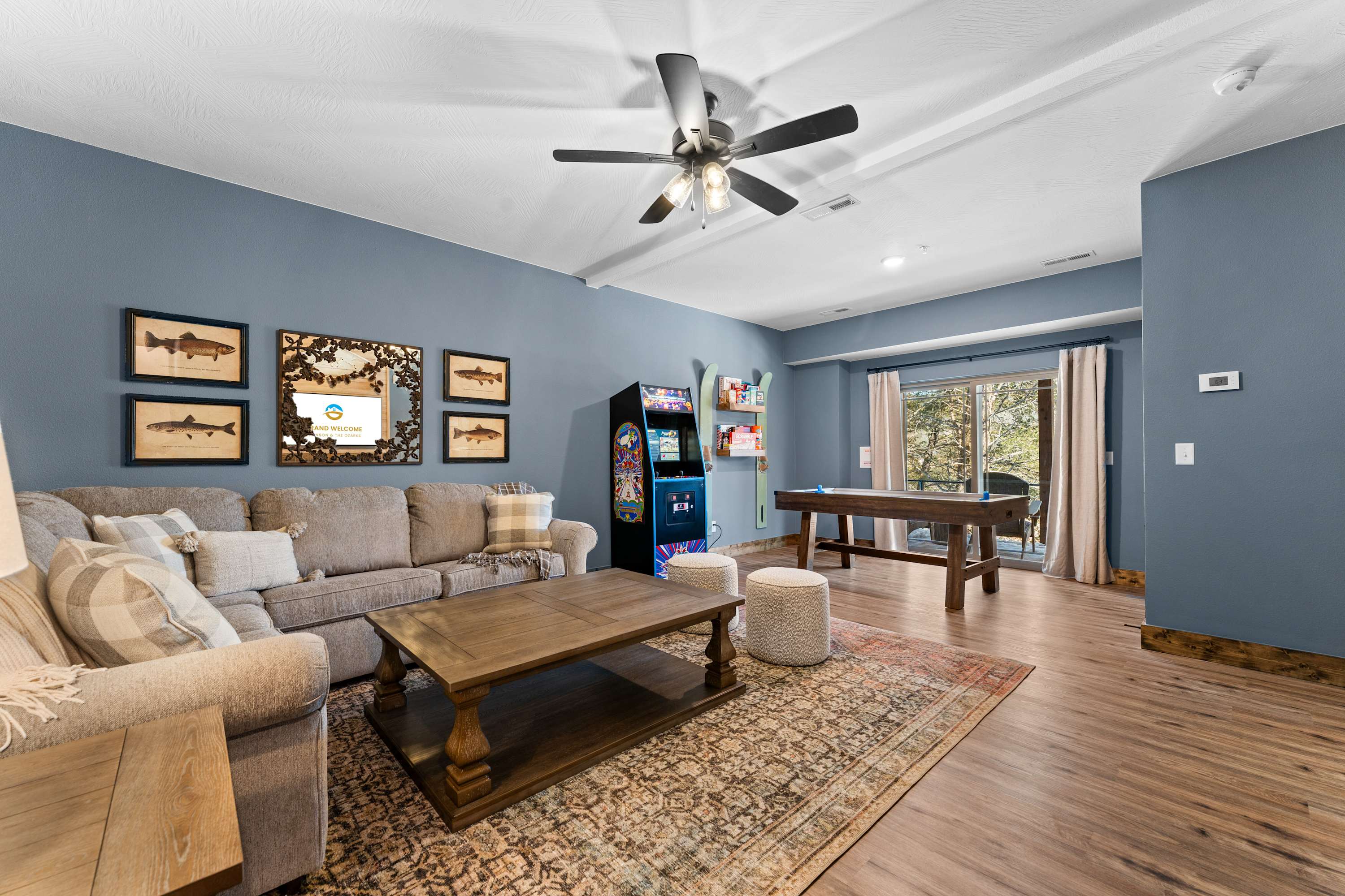 We loved this rental! So cozy and much to do! The kids loved the basement with the arcade games and cozy couch for movies. The hot tub was very clean and it was nice that some of us could do hot tub while others did campfire all in the same space. The entire rental was cozy enough for togetherness, but had lots of seating and things to do if someone wanted some down time. The mattresses were very comfortable and everything was very clean! All the resort amenities were within walking distance. The indoor pool was warm (hallelujah)! They also had pickleball and basketball courts which came with equipment. We also ate at the food truck on site- had really good burgers! We also loved that this was closer to Big Cedar than the crazy Branson strip. We also checked out the ice cream dairy at College of the Ozarks down the road- totally worth the trip! We highly recommend and will be back!