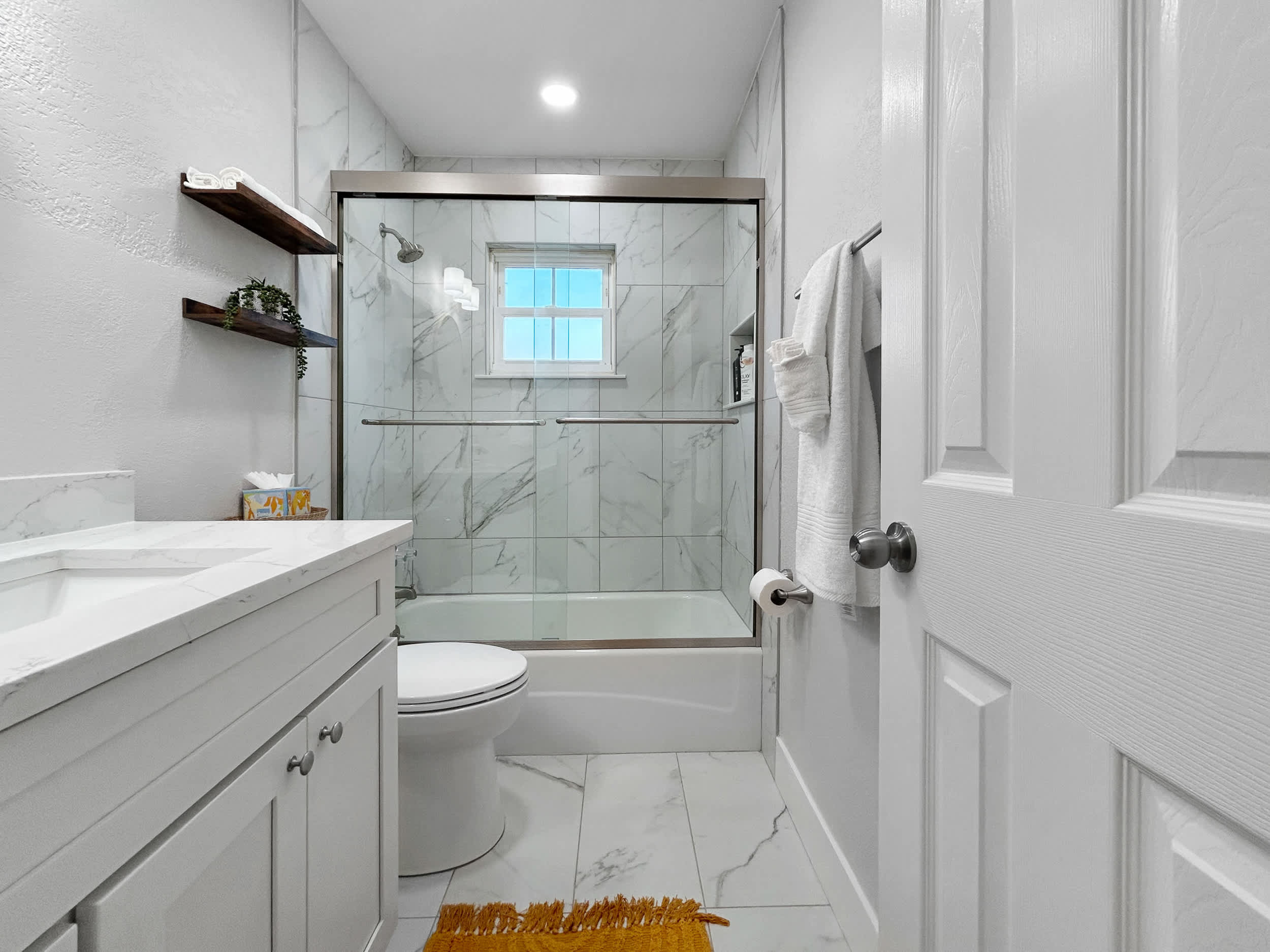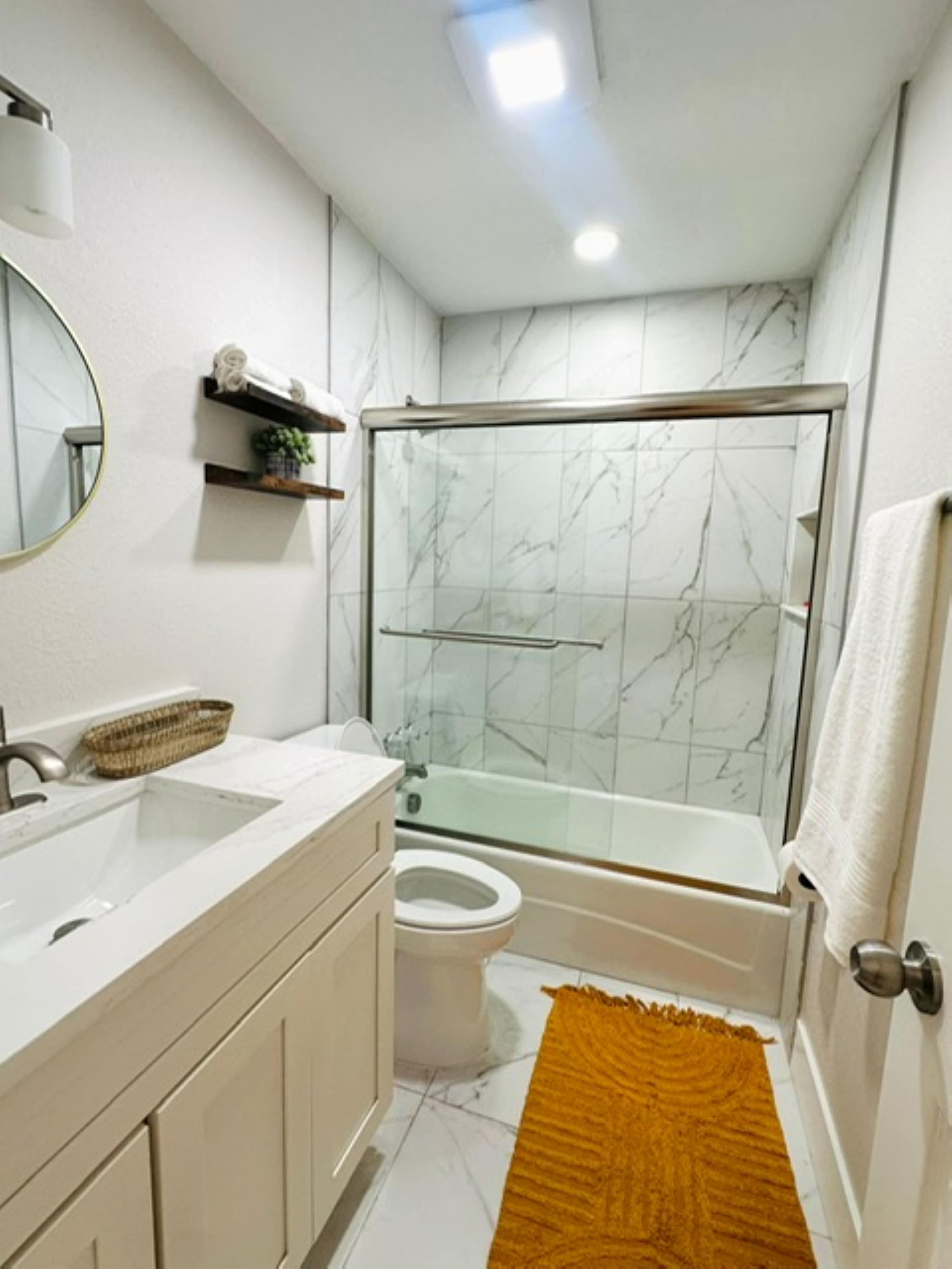 This unit also includes a full guest bathroom with a single vanity and a shower/tub combo.