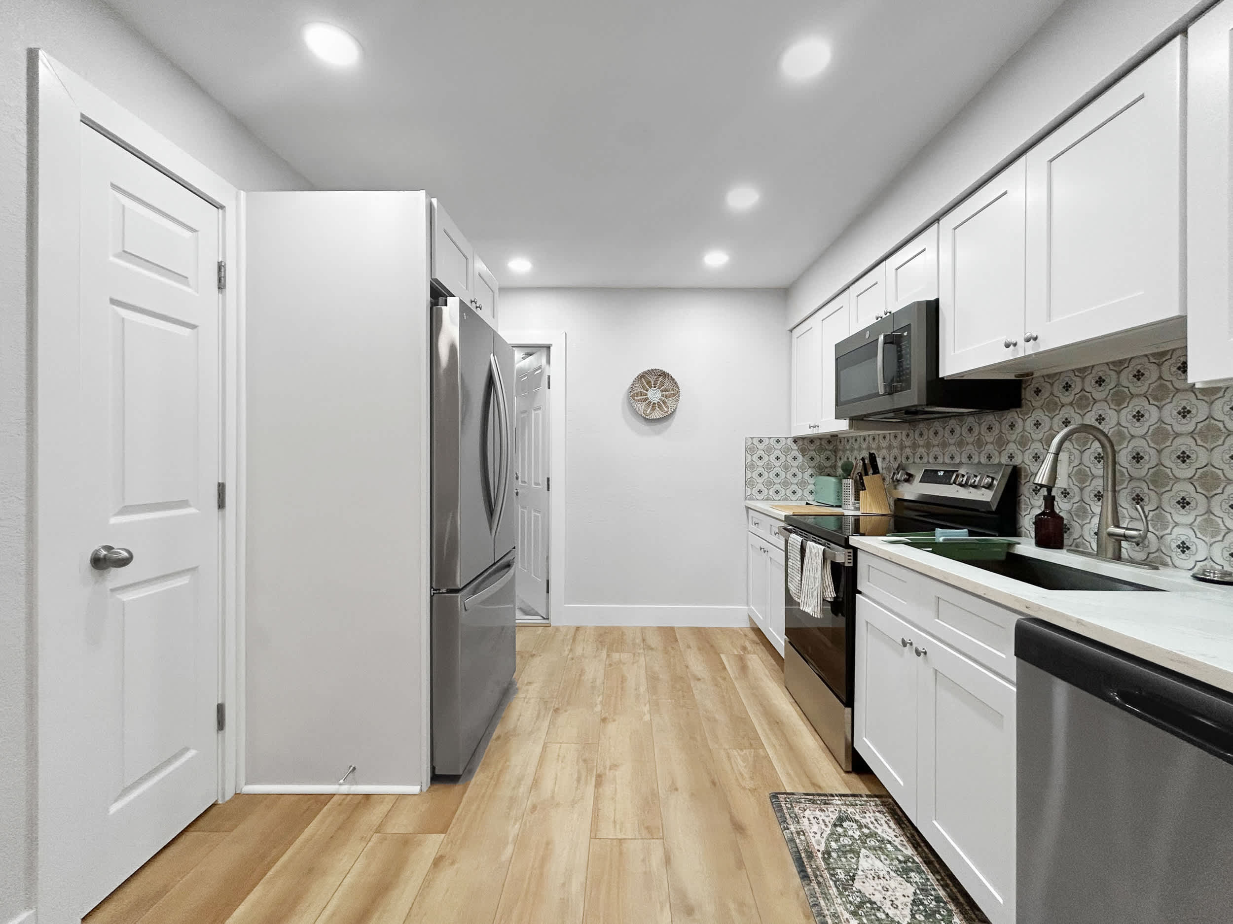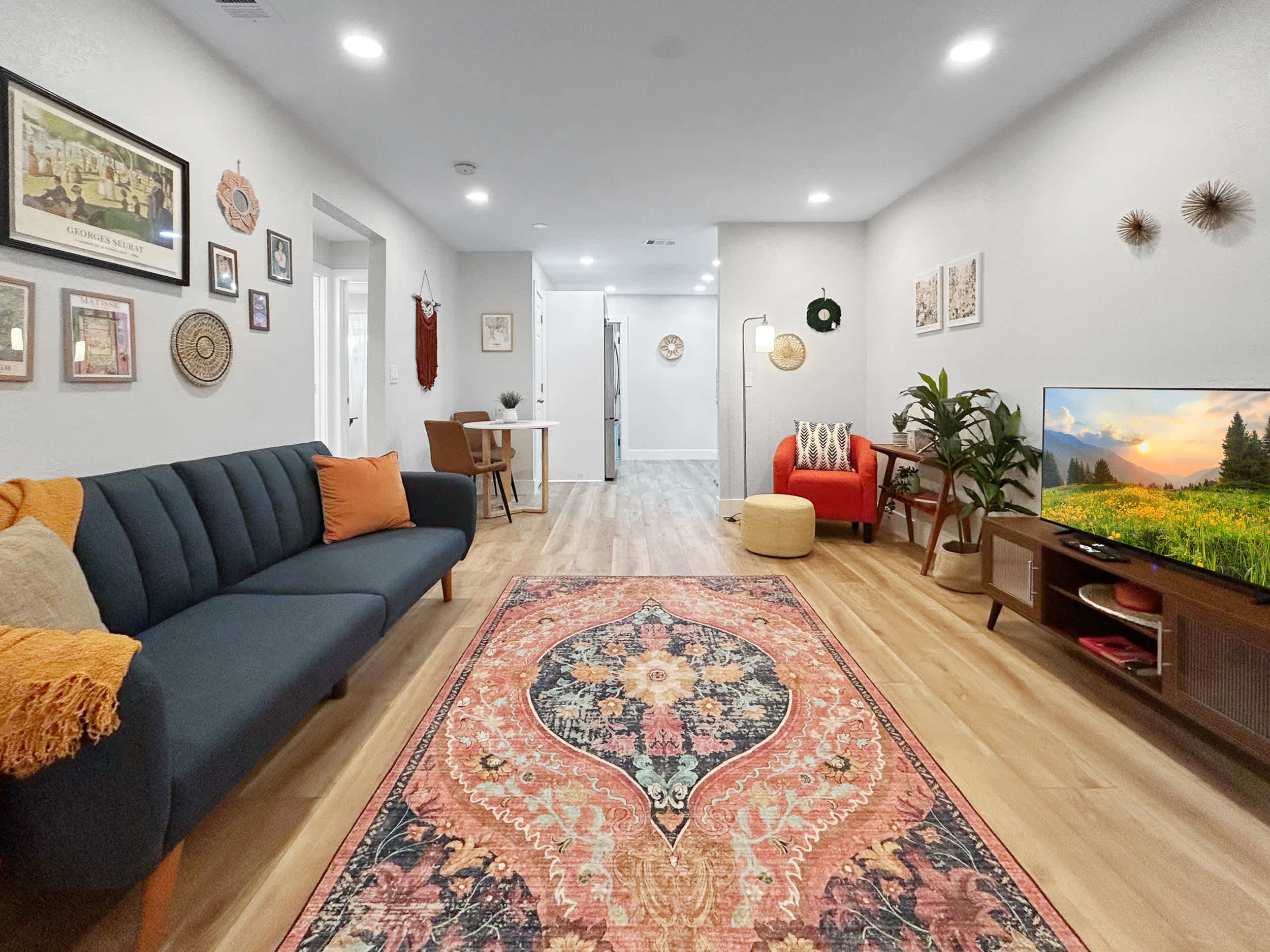 Comprised of 2 completely separate units that can be booked individually, Casa De Campo Unit A and Unit B, guests now have the flexibility and convenience to book both together, where the entire property becomes yours for the duration of your stay. With full access to both units, the duplex blends comfort and flexibility. Each unit features an open, airy floor plan with a warm, casual vibe that makes it easy to settle in. Relax in cozy living areas with comfortable seating and smart TVs for streaming after a day out. Both bright kitchens are finished in crisp white with stainless steel appliances and Keurigs, plus dining tables for two that work well for meals or remote work.
