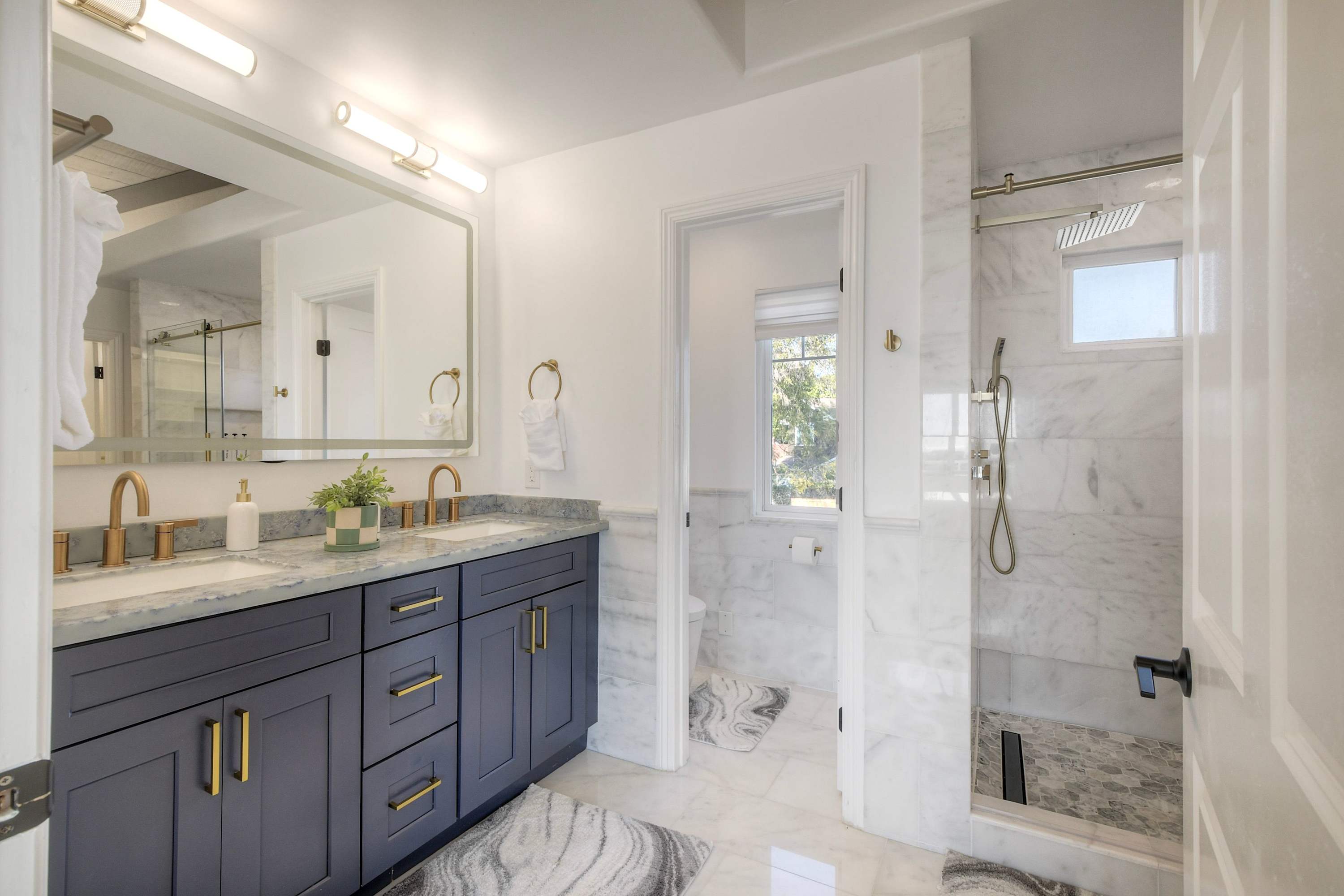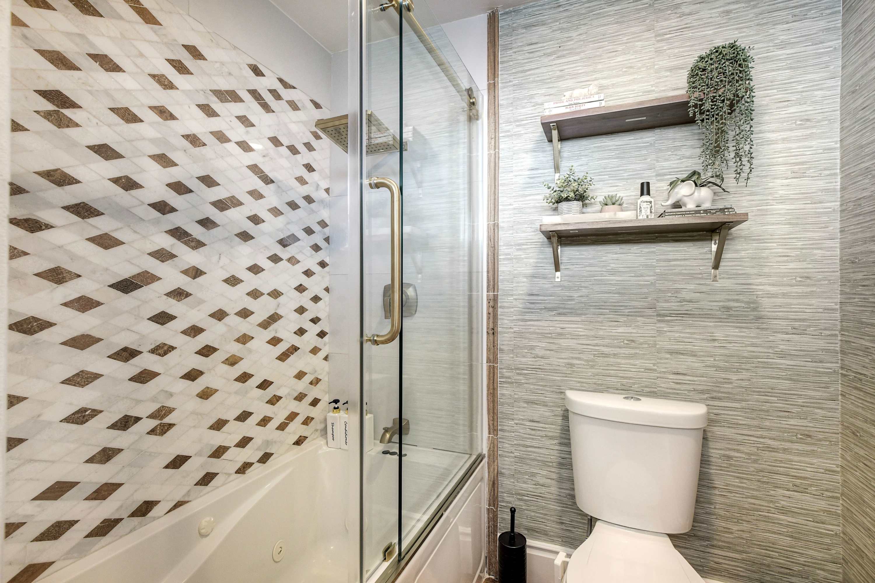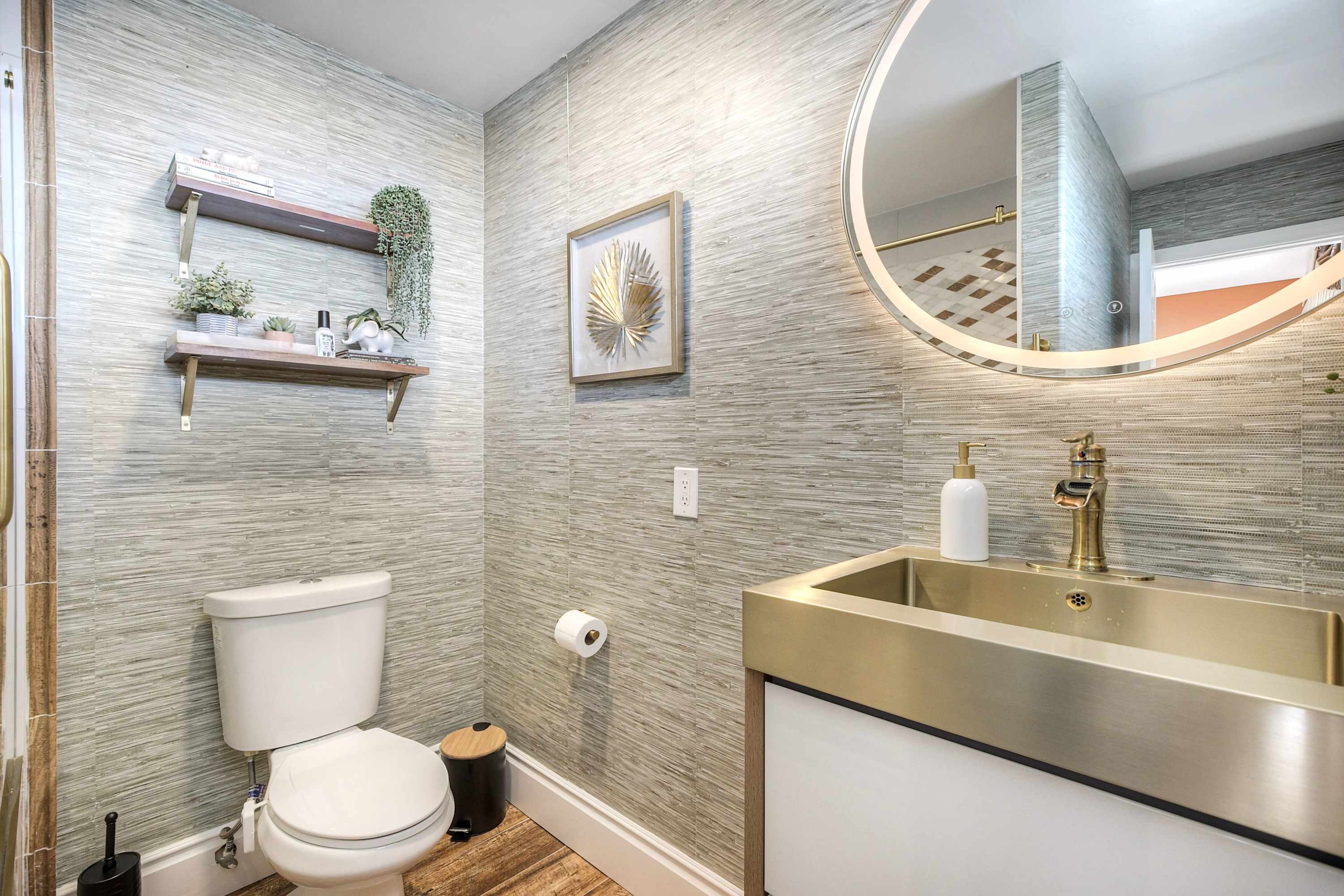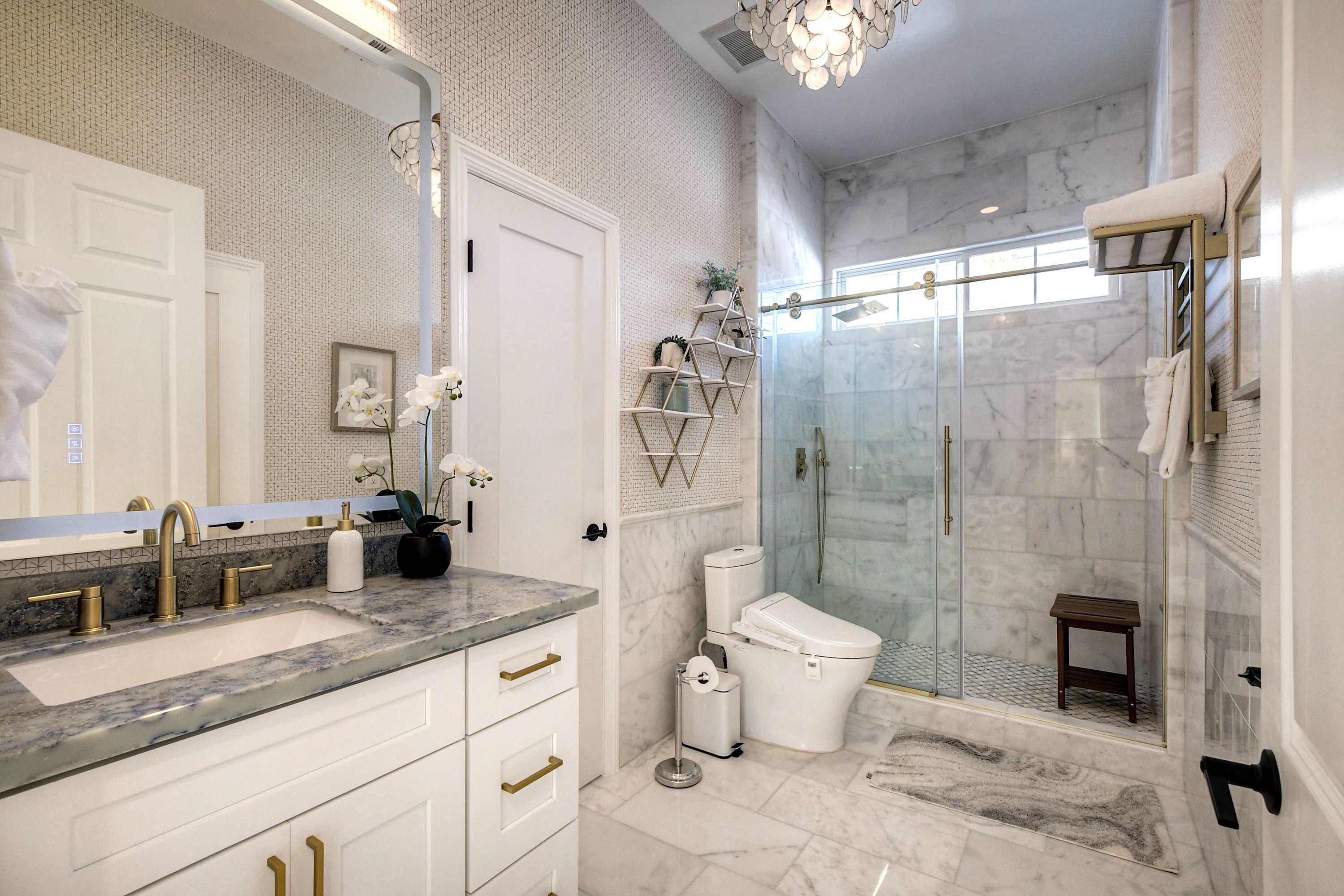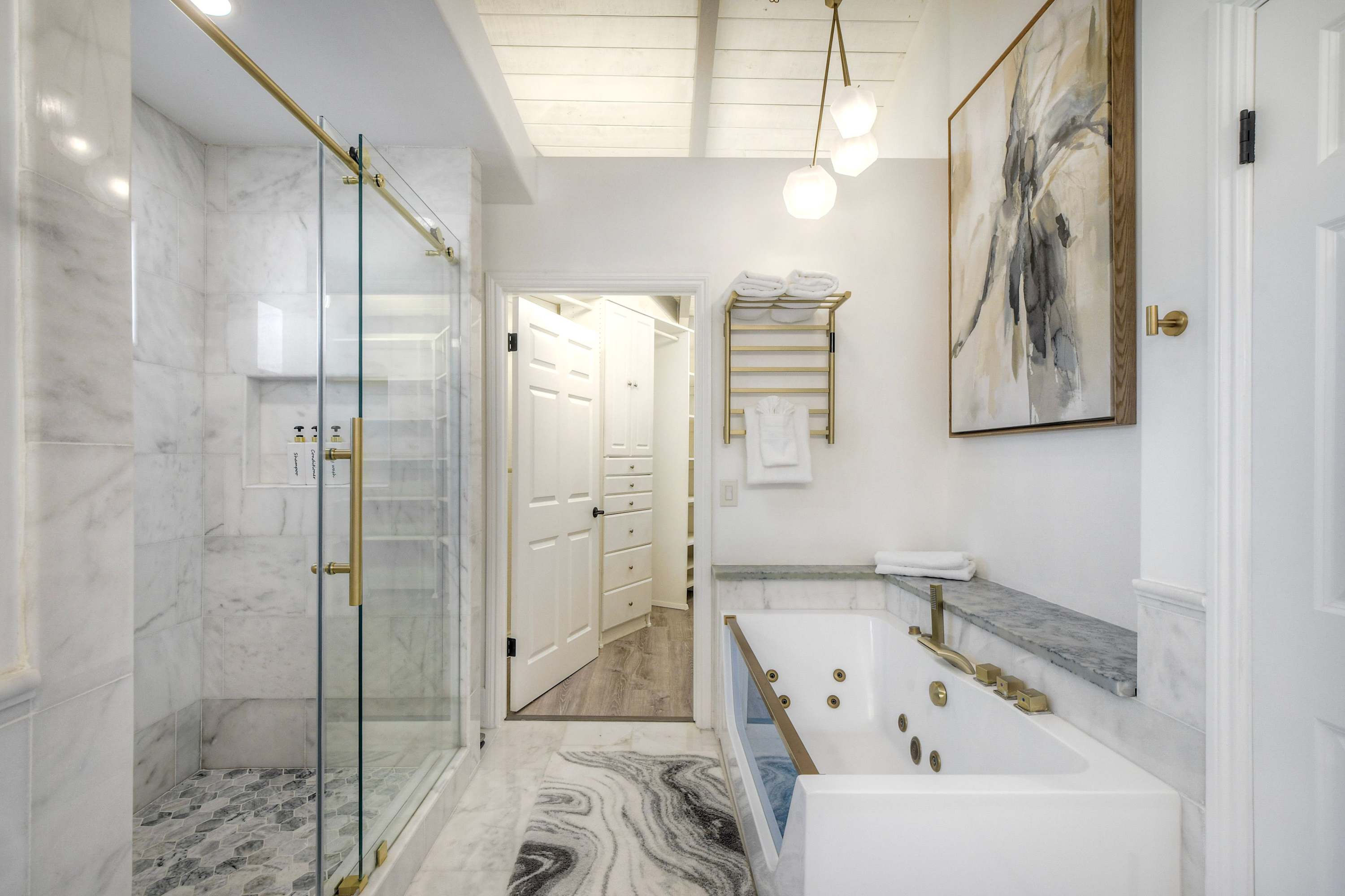 This home also includes an additional full guest bathroom, located inside the home gym, with a single vanity and a shower/tub combo.