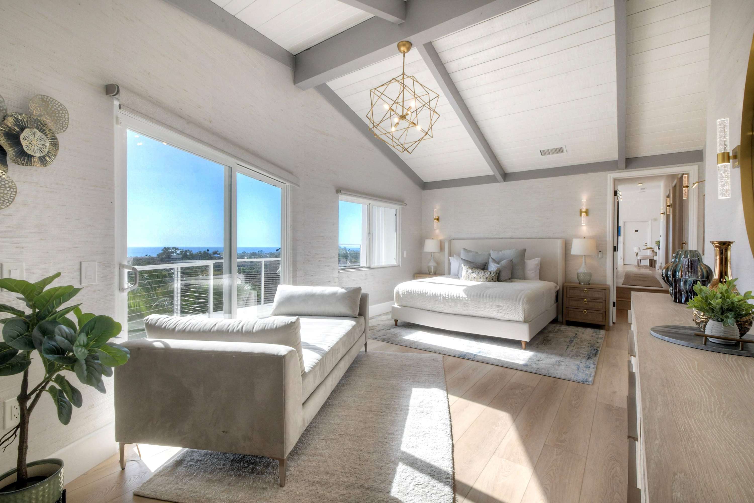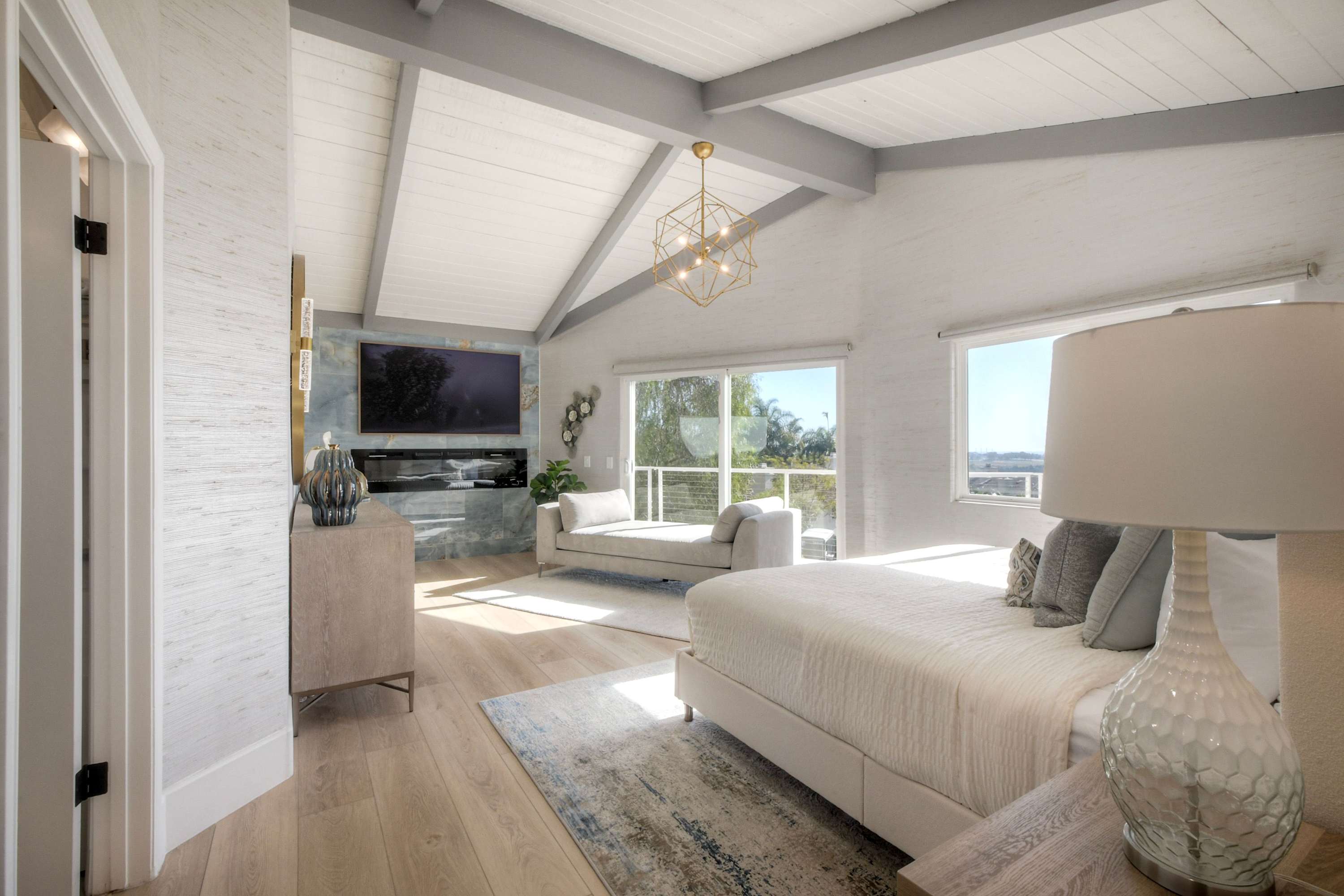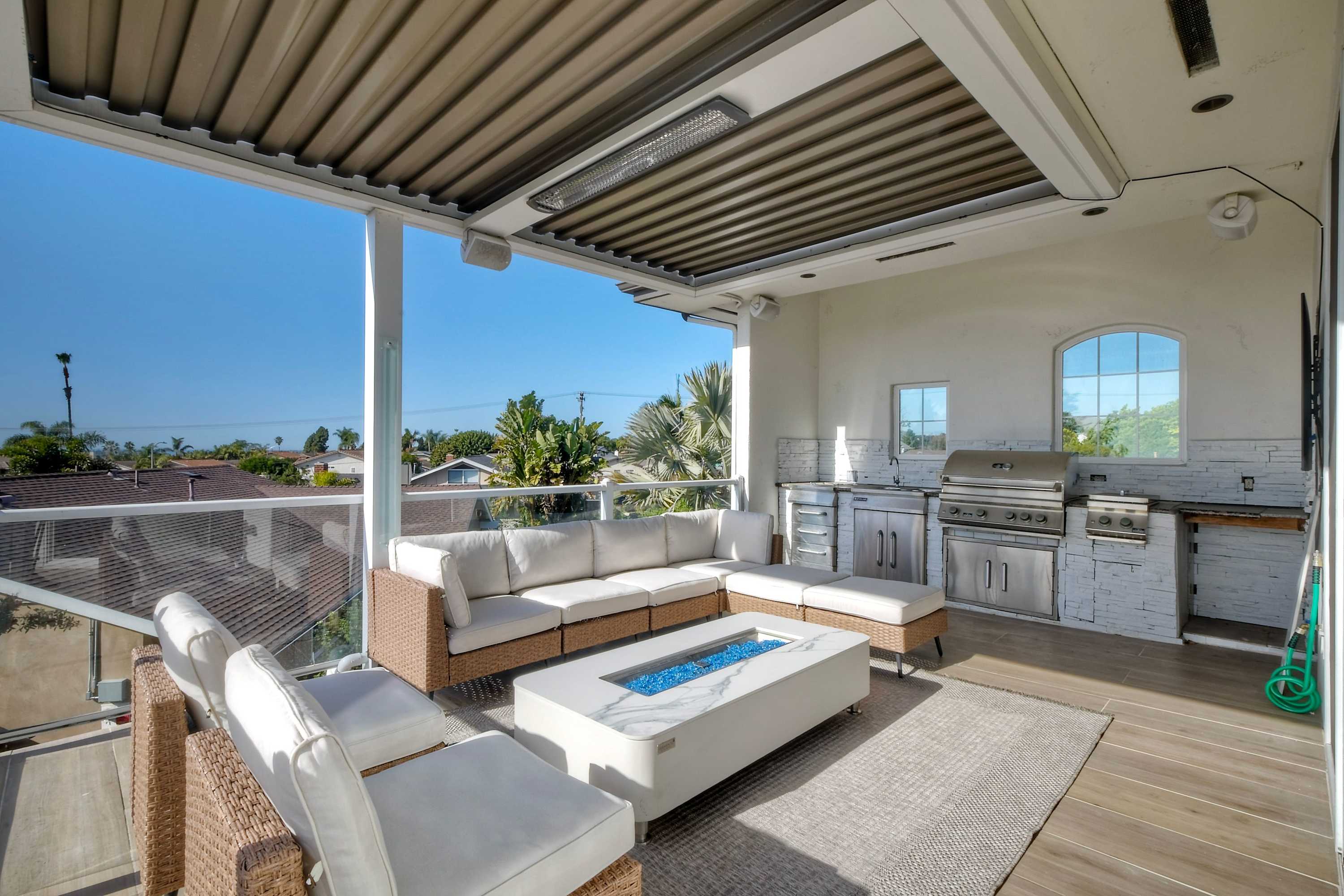 When it’s time to focus or recharge, the home office offers a quiet escape with an office desk, smart TV, and its own indoor fireplace, while the home gym lets you keep up with your fitness routine without leaving the house. The experience truly comes together on the expansive balcony, where you can dine alfresco at the table, relax in comfortable seating, or fire up the BBQ grill under the covered section. With a fire pit, TV, and sweeping views, this outdoor space is ideal for morning coffee, sunset dinners, and memorable evenings under the coastal sky.