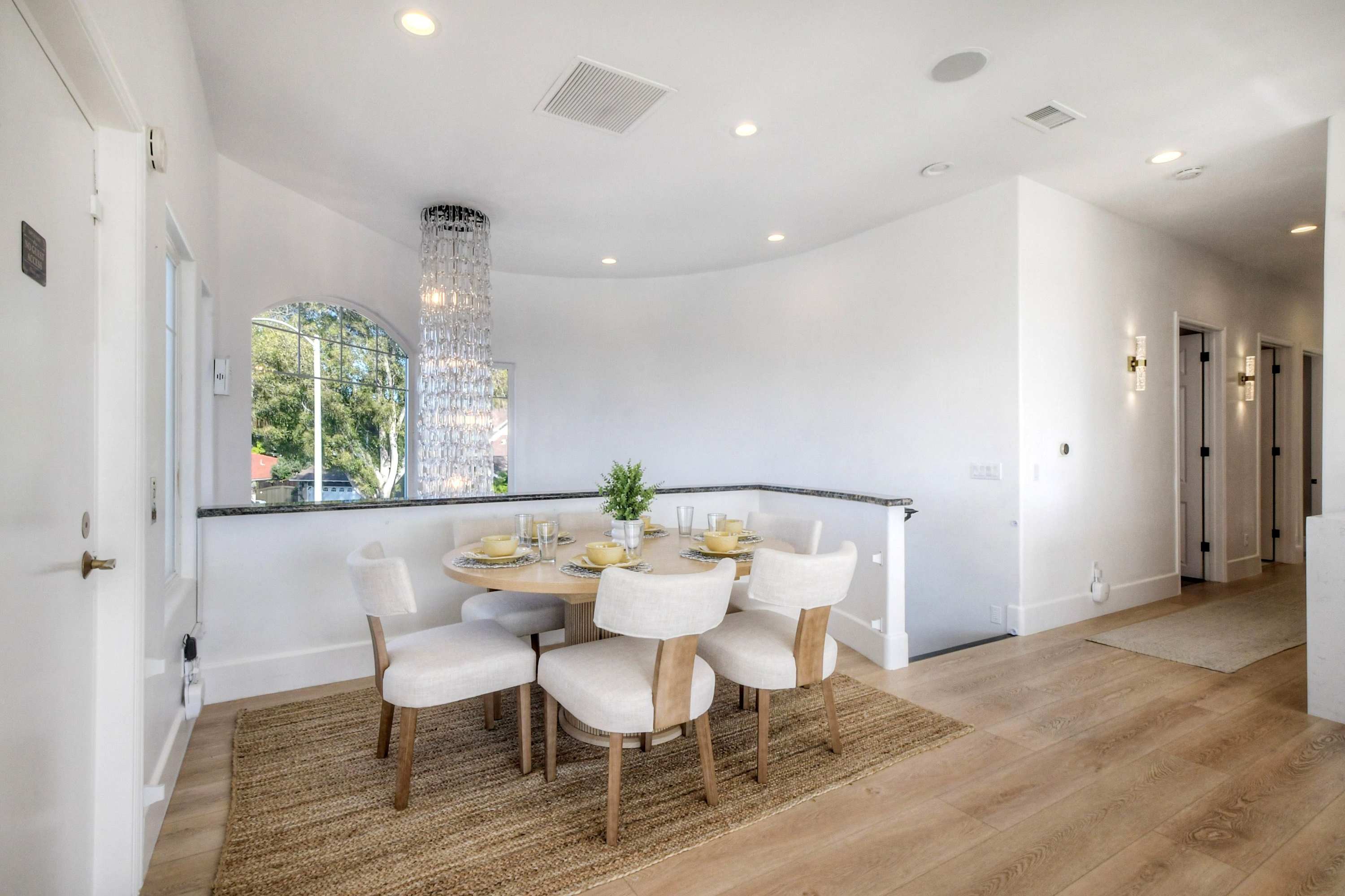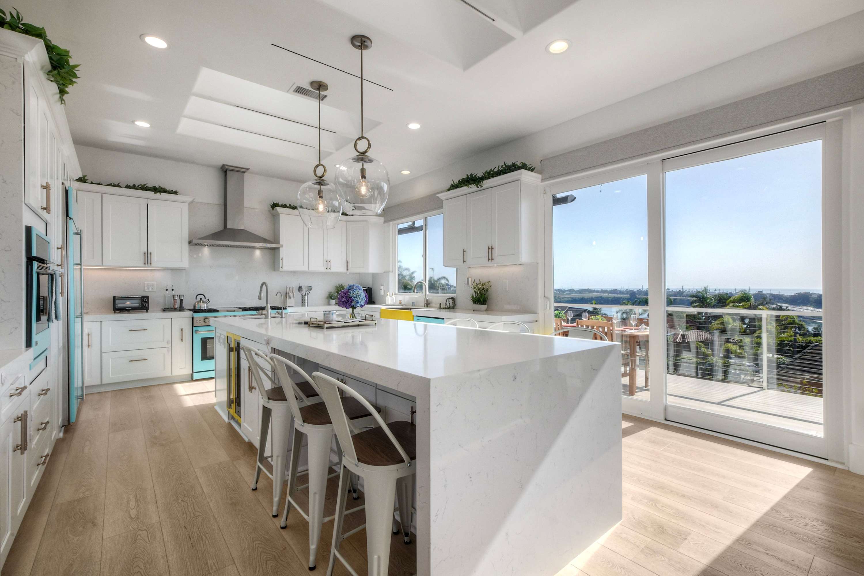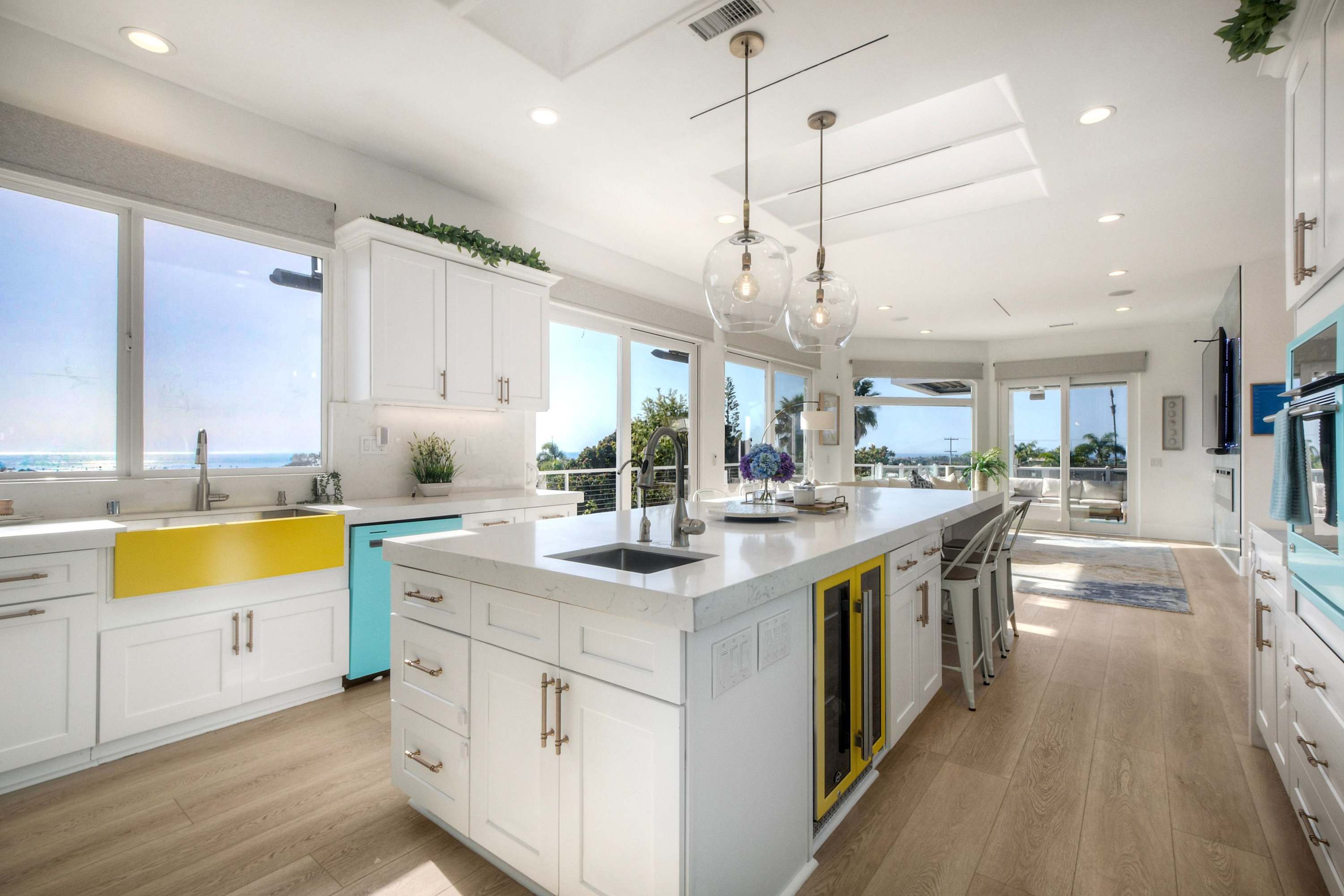 Step inside through a large formal foyer that sets the tone for a bright, spacious retreat designed for comfort and connection. The living room is warm and inviting, featuring a cozy fireplace and smart TV, perfect for unwinding after a day by the ocean. Just beyond, the kitchen steals the show with abundant natural light, incredible views, and plenty of room to cook and gather. Outfitted with a Keurig and counter seating for six, it flows seamlessly into the dining area with seating for six, making meals and conversation effortless.