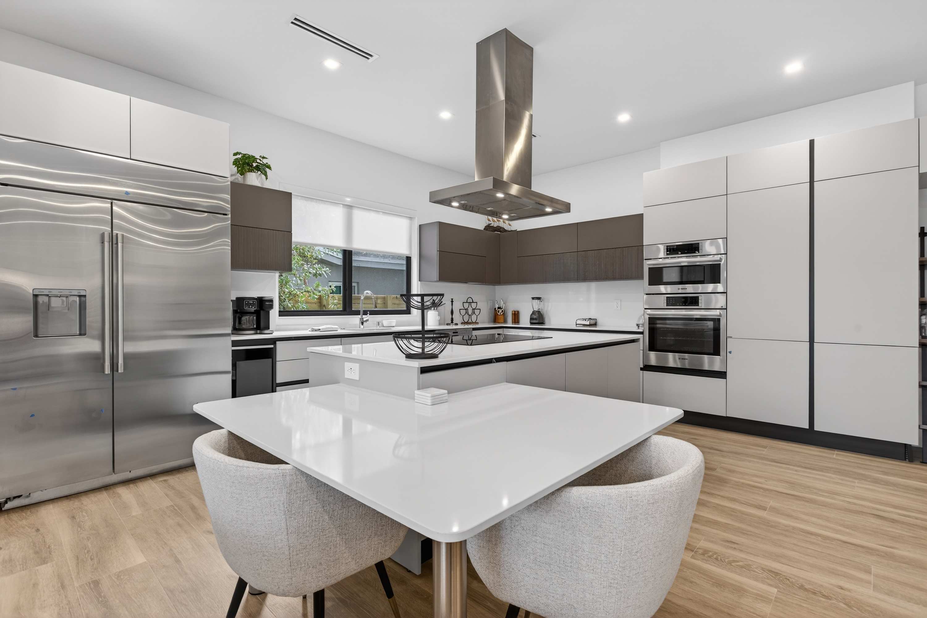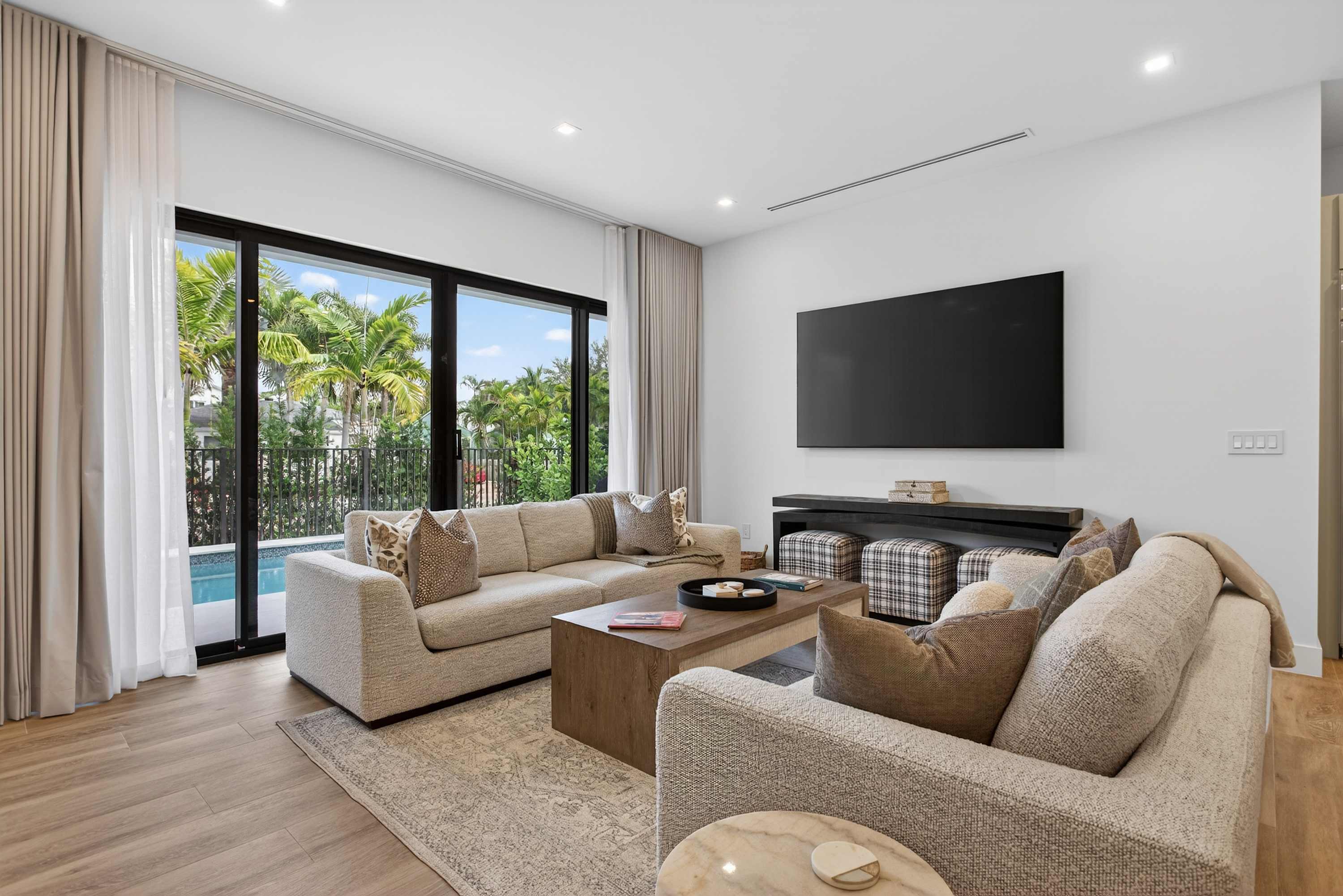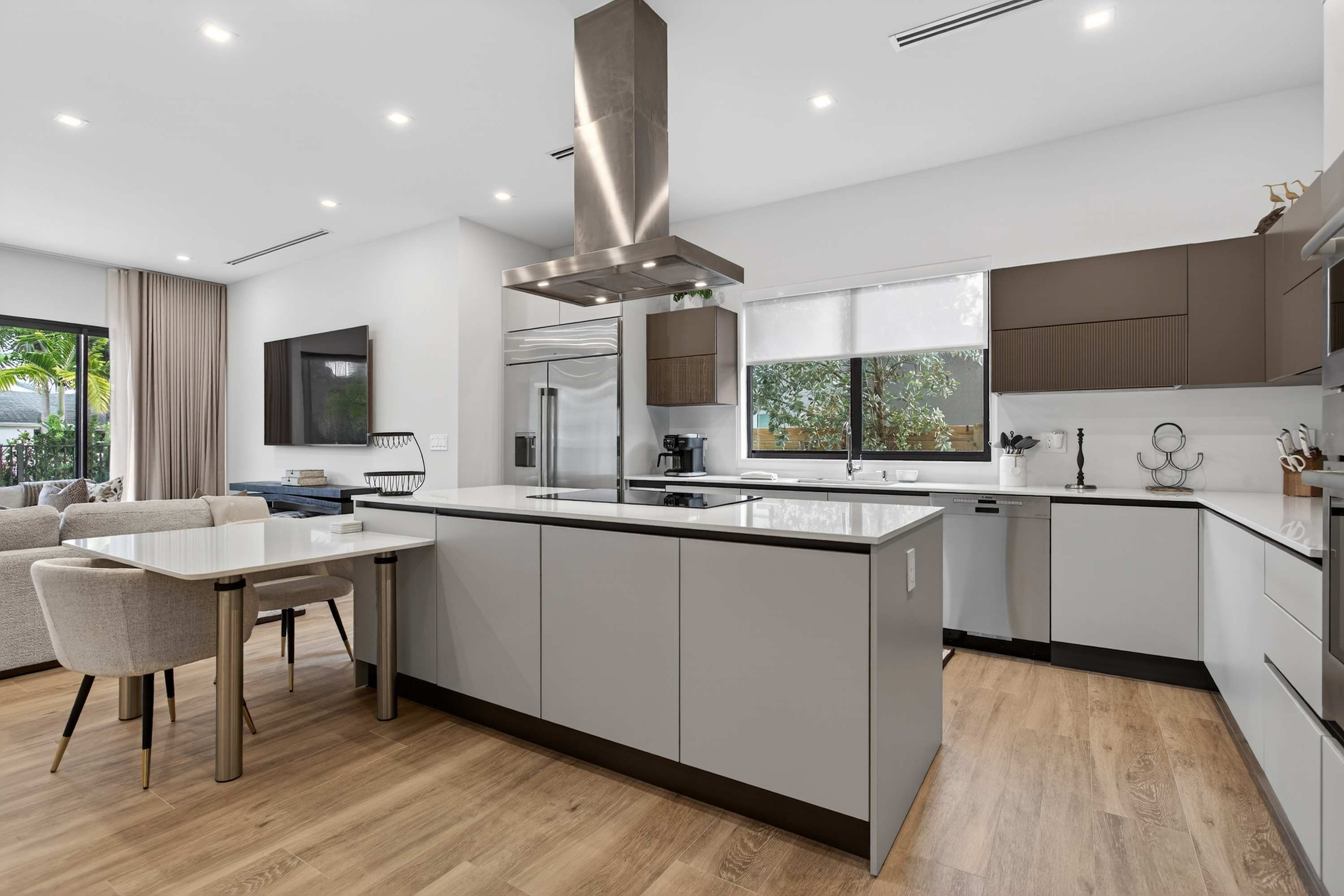 As you step inside, you’re greeted by a spacious, open-concept living and kitchen area filled with natural light and styled with new, modern furnishings throughout. The living room invites you to unwind with two comfortable couches and a smart TV, perfect for movie nights after a day out. The sleek kitchen features white cabinetry and countertops, a striking steel hood over the island stove, both Keurig drip and pod coffee options, counter seating for two, and a dining table for six that’s ideal for shared meals. Outside, your private oasis awaits with a sparkling pool, patio seating, and a BBQ—perfect for soaking up the Florida sunshine.