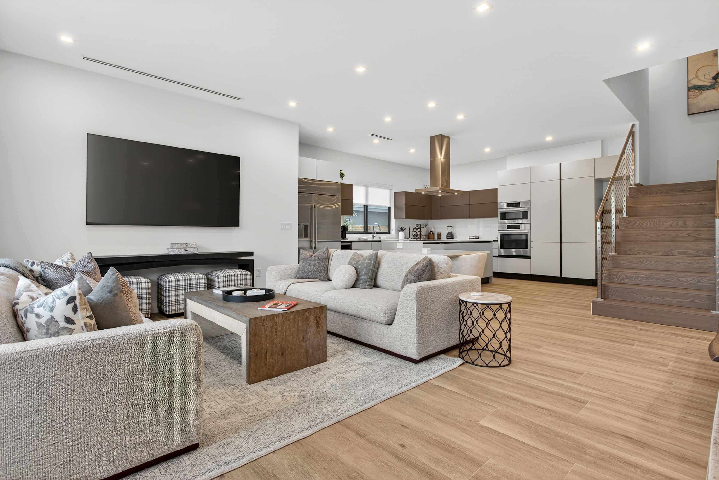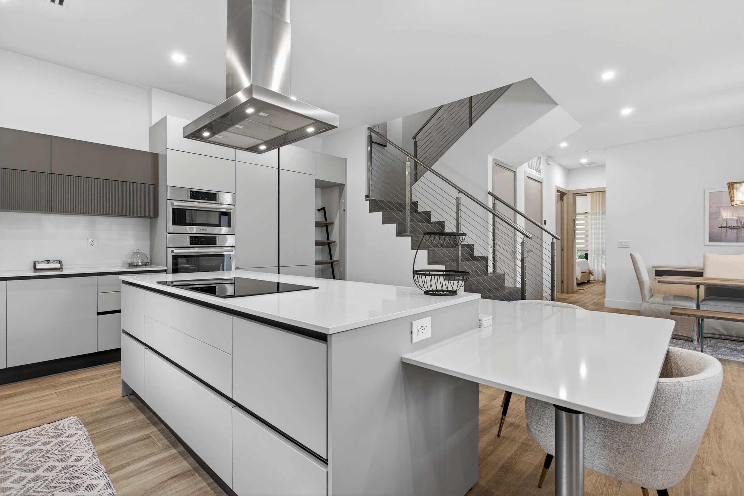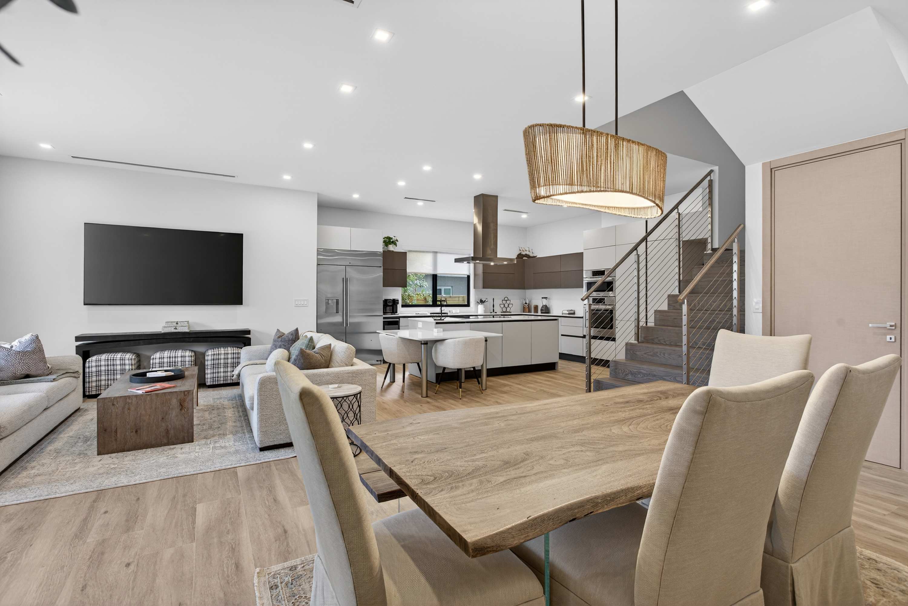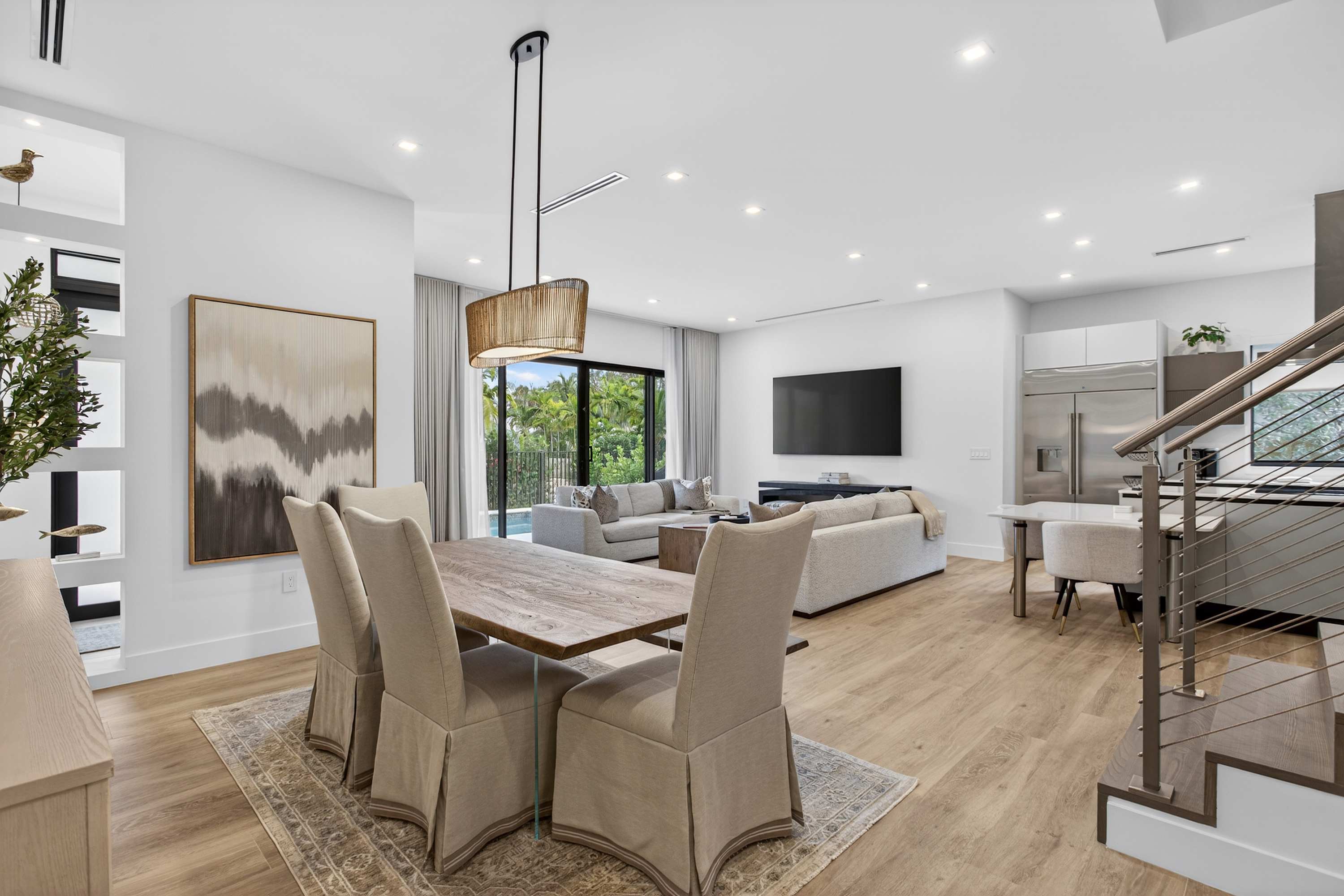 As you step inside, you’re greeted by a spacious, open-concept living and kitchen area filled with natural light and styled with new, modern furnishings throughout. The living room invites you to unwind with two comfortable couches and a smart TV, perfect for movie nights after a day out. The sleek kitchen features white cabinetry and countertops, a striking steel hood over the island stove, both Keurig drip and pod coffee options, counter seating for two, and a dining table for six that’s ideal for shared meals. Outside, your private oasis awaits with a sparkling pool, patio seating, and a BBQ—perfect for soaking up the Florida sunshine.