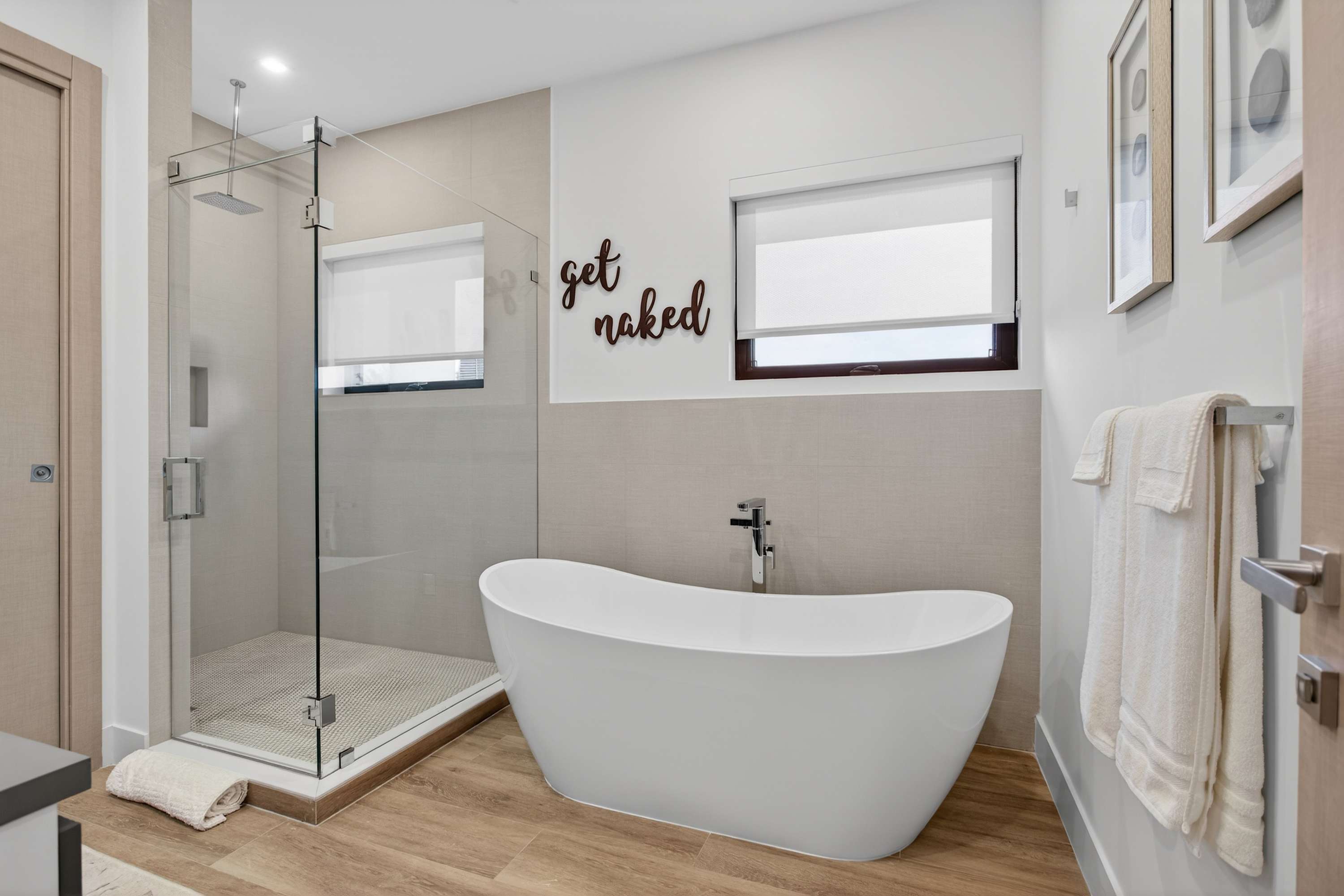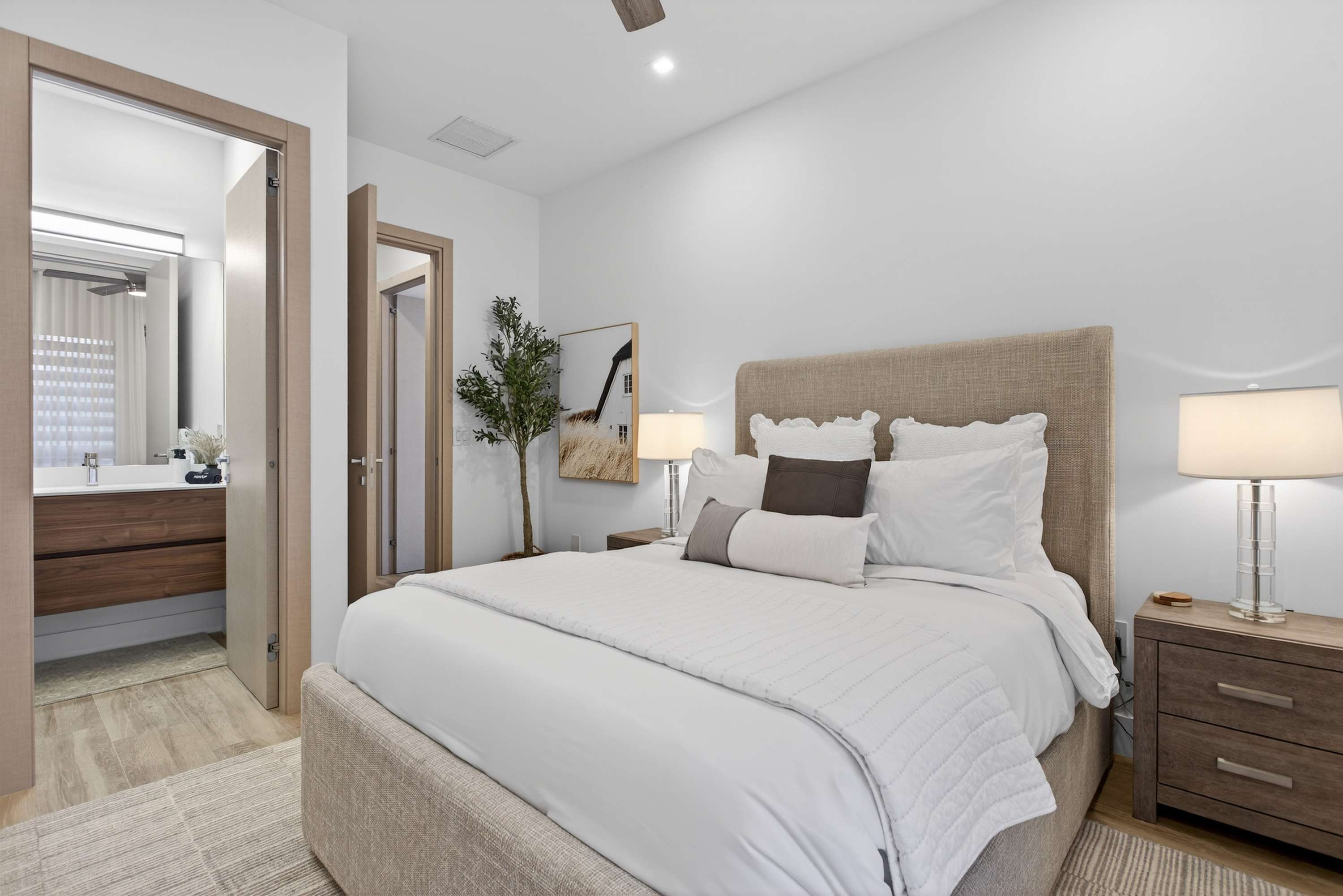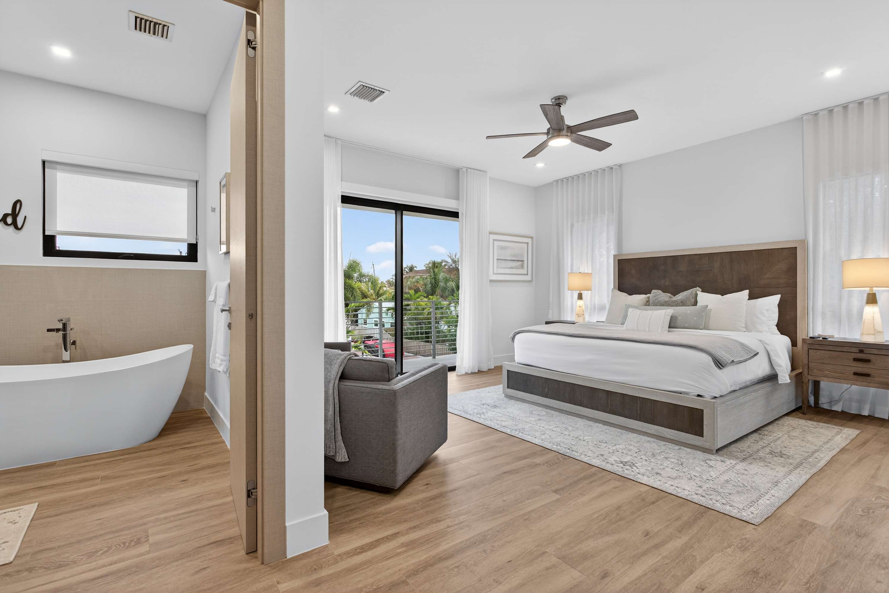 Bedroom #1 includes a king size bed, balcony access, and an ensuite bathroom with a dual vanity, a soaking tub, and a walk-in shower.
