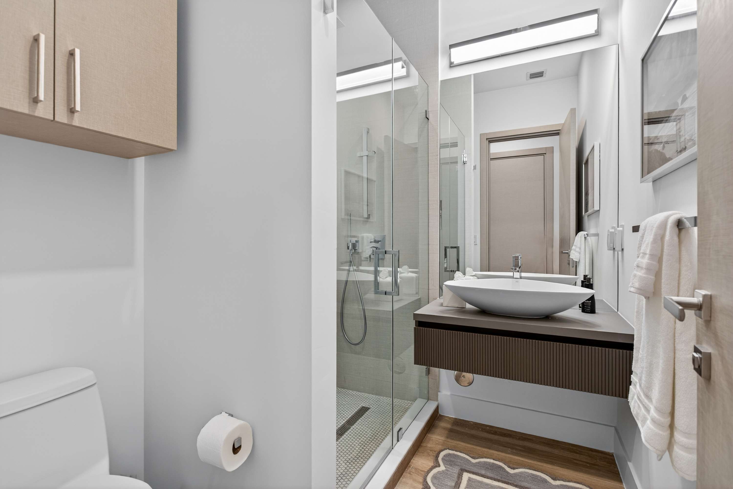 Bedroom #3 includes a king size bed, a smart TV, and an ensuite bathroom with a single vanity and a walk-in shower.