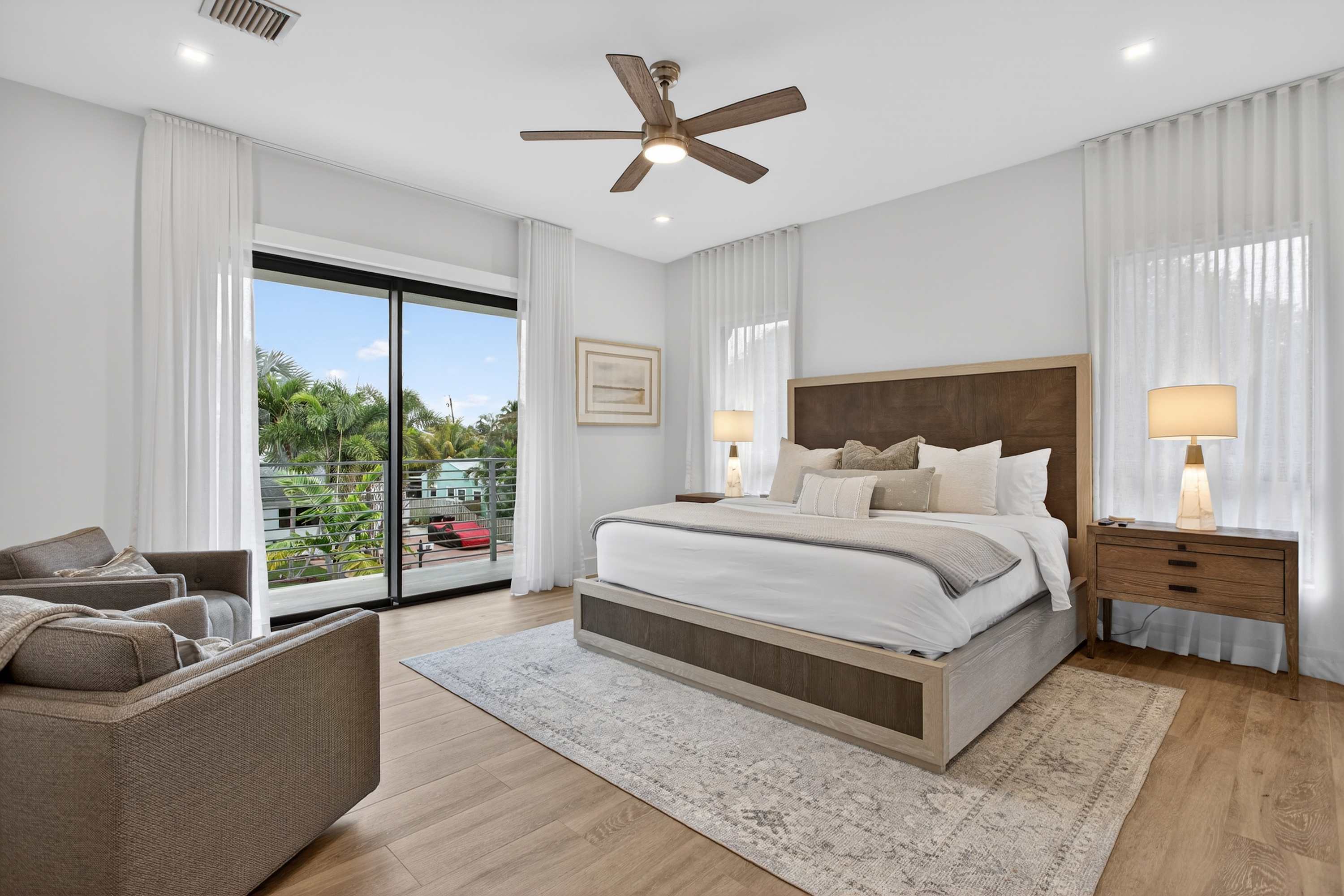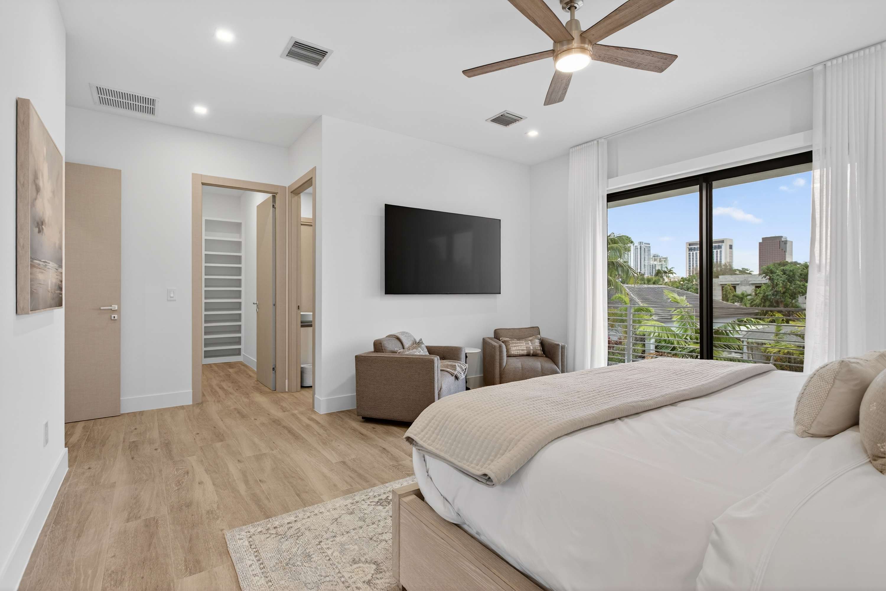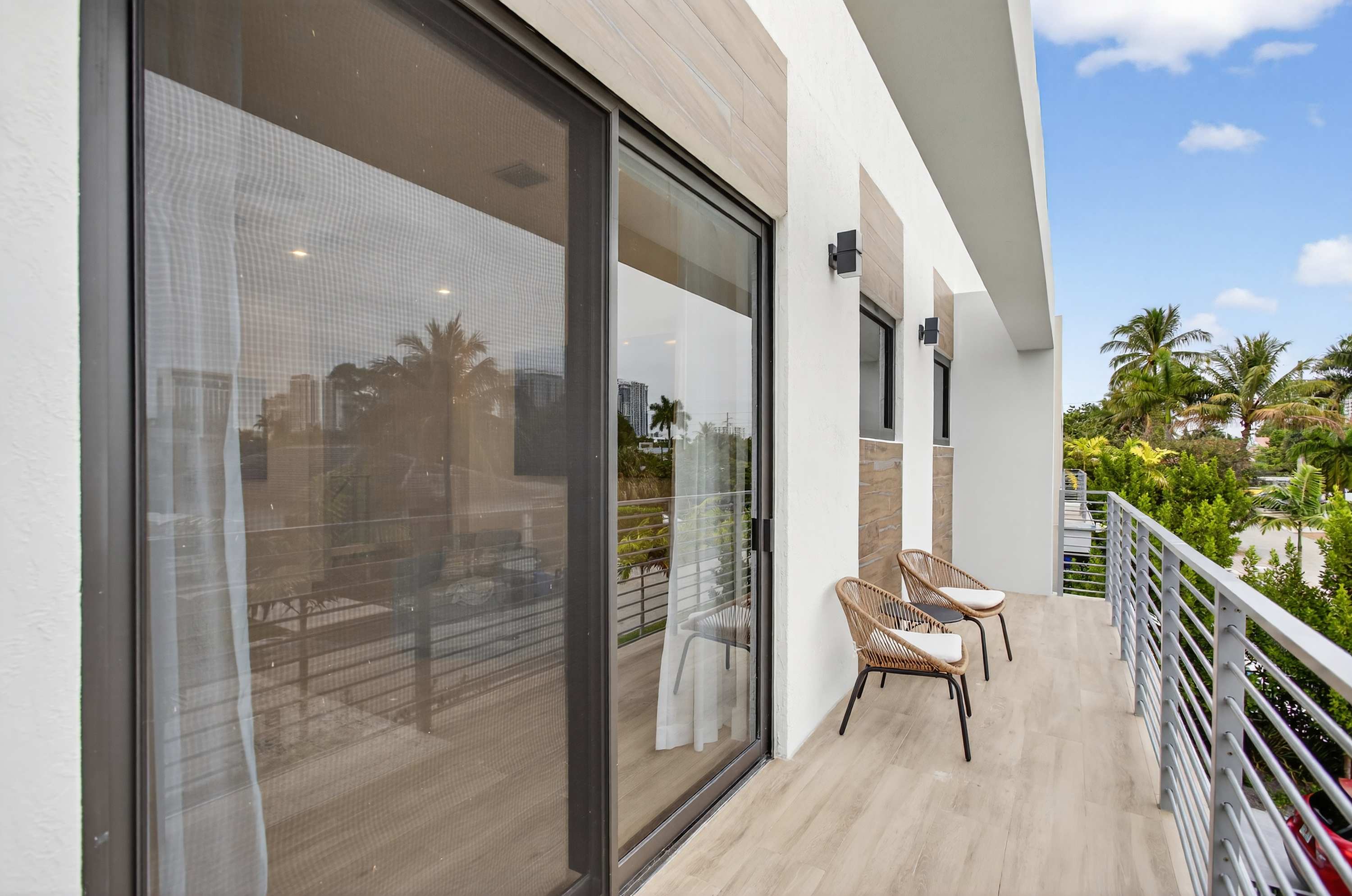 One of the home’s standout features is the converted garage game room and lounge, fully air-conditioned and designed for flexibility. Keep the door closed for a cozy indoor hangout or open it up for a seamless indoor/outdoor recreation space. Inside, you’ll find a classic arcade cabinet, basketball game, foosball, a smart TV, and comfortable seating—fun for all ages. Upstairs, escape to the private balcony with seating for two, where you can relax with morning coffee or evening drinks while enjoying views of downtown Fort Lauderdale, the perfect way to end each day at Tarpon River Enclave.