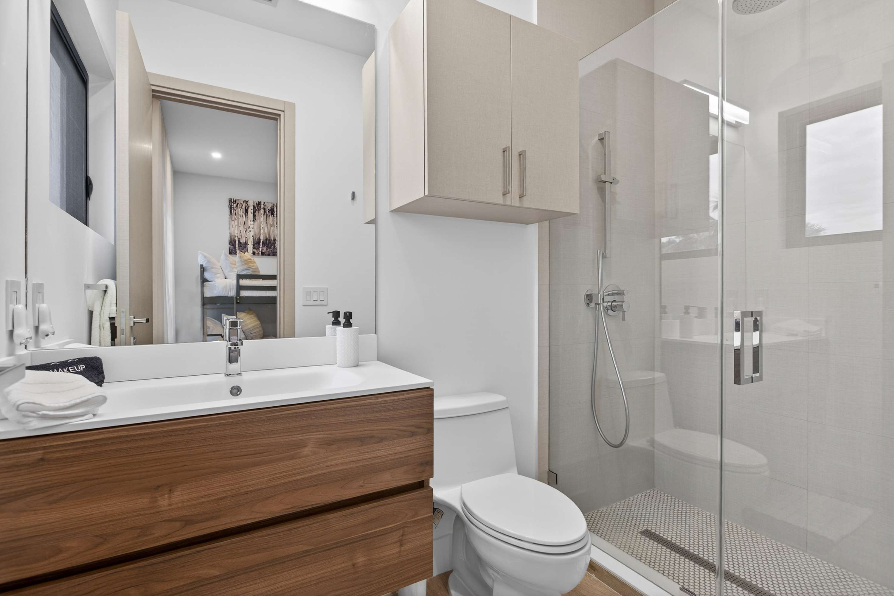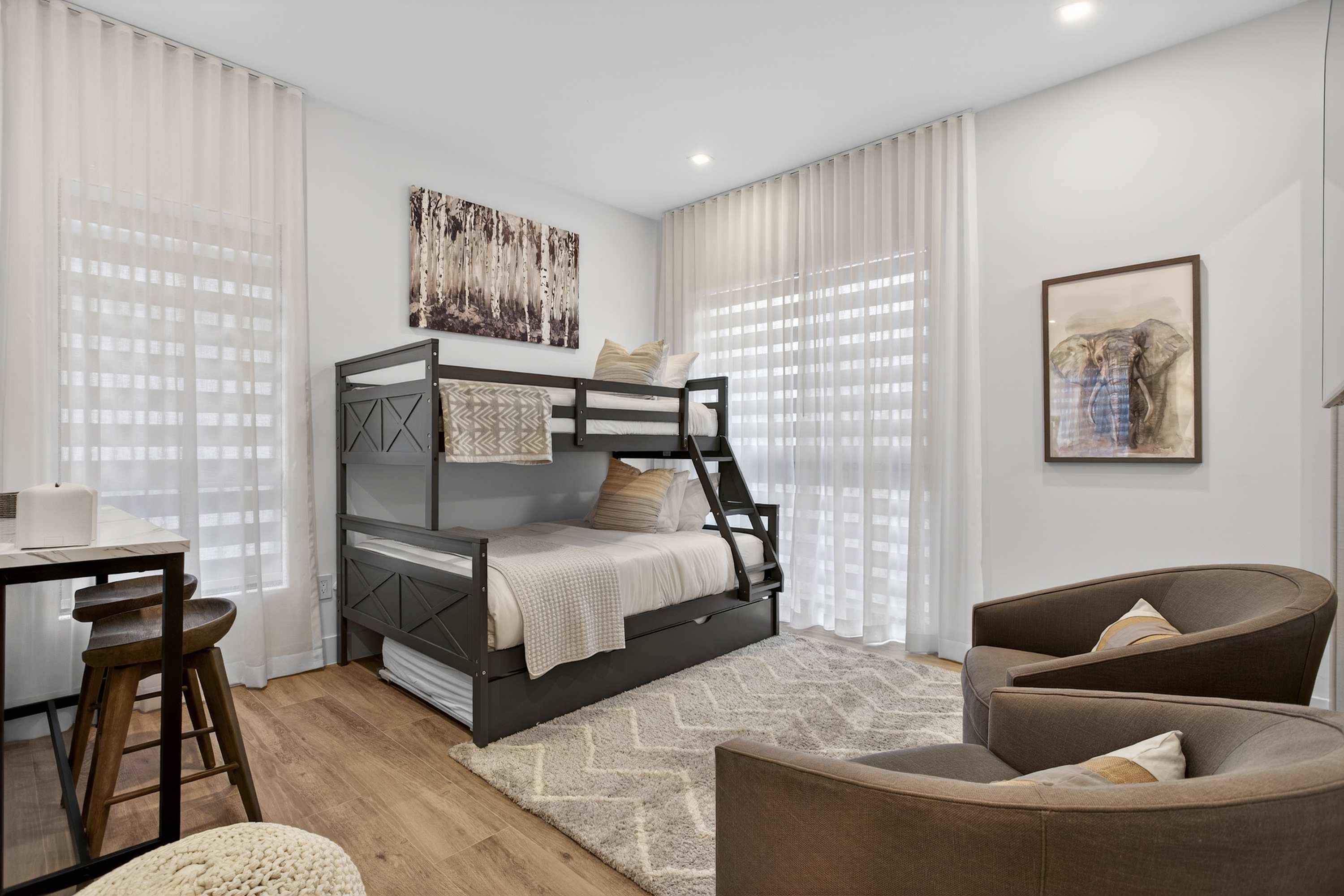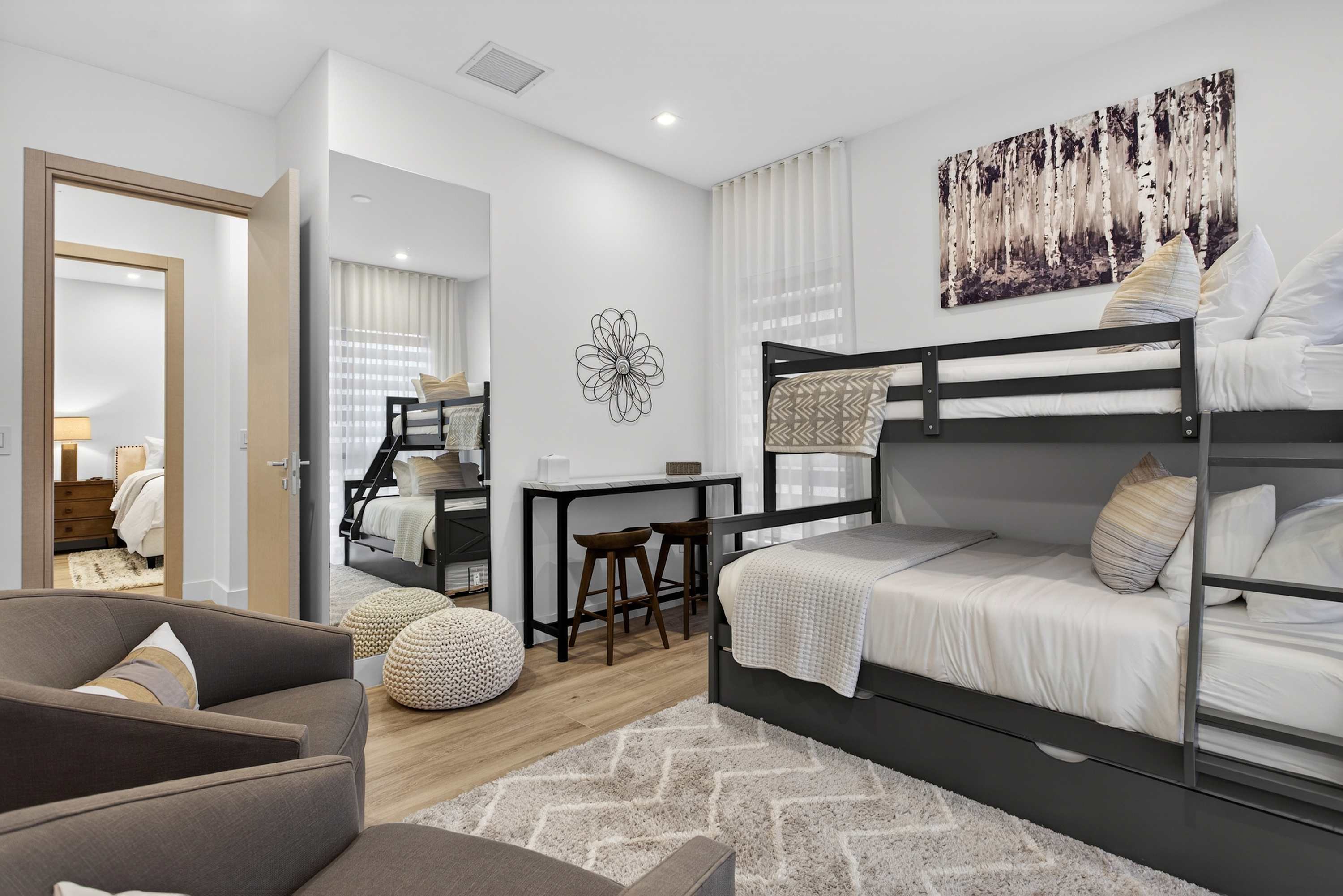 Bedroom #2 includes a set of twin-over-full bunk beds, a twin size trundle bed, a small desk, and an ensuite bathroom with a single vanity and a walk-in shower.