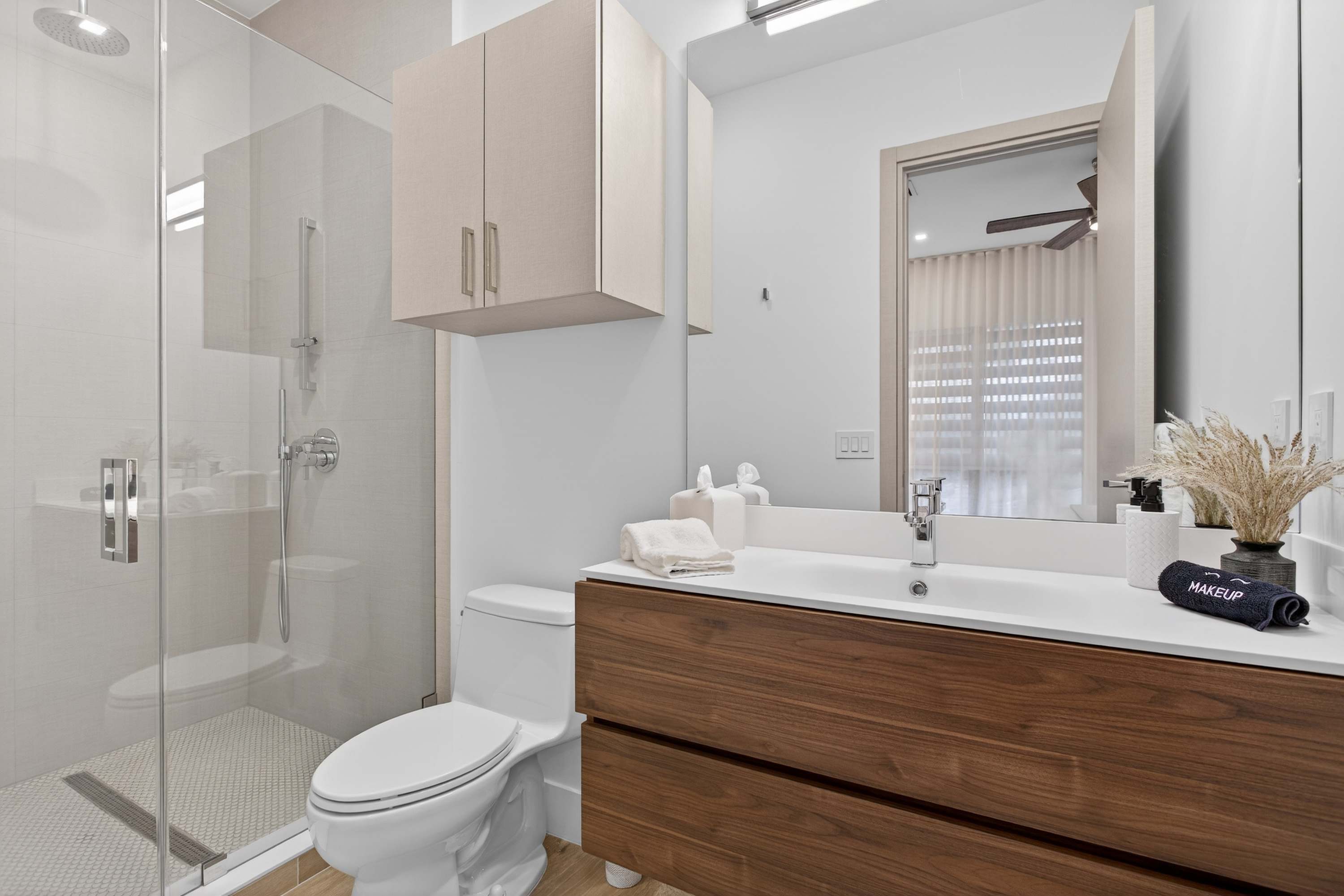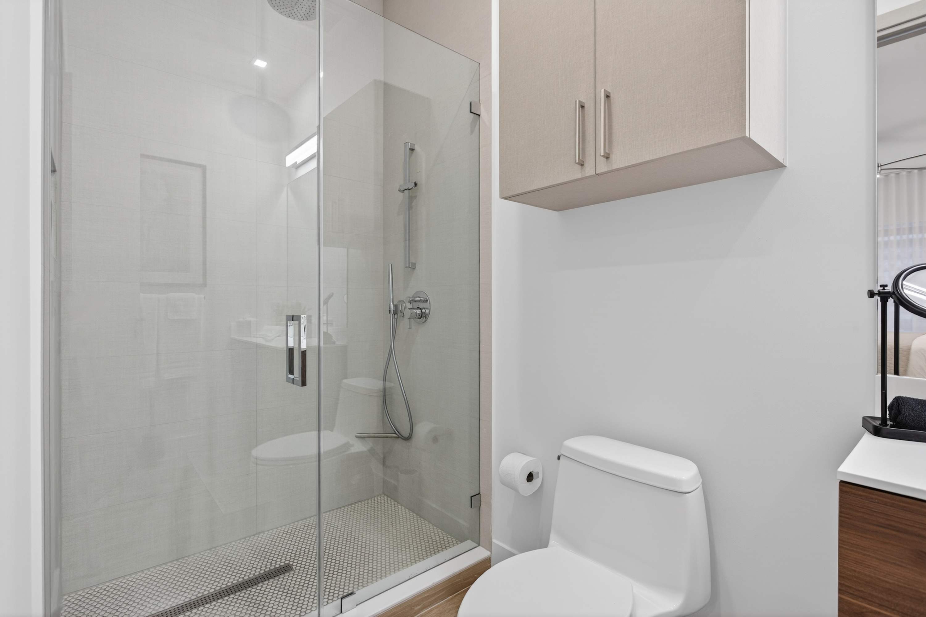 Bedroom #4 includes a queen size bed, a smart TV, and an ensuite bathroom with a single vanity and a walk-in shower.