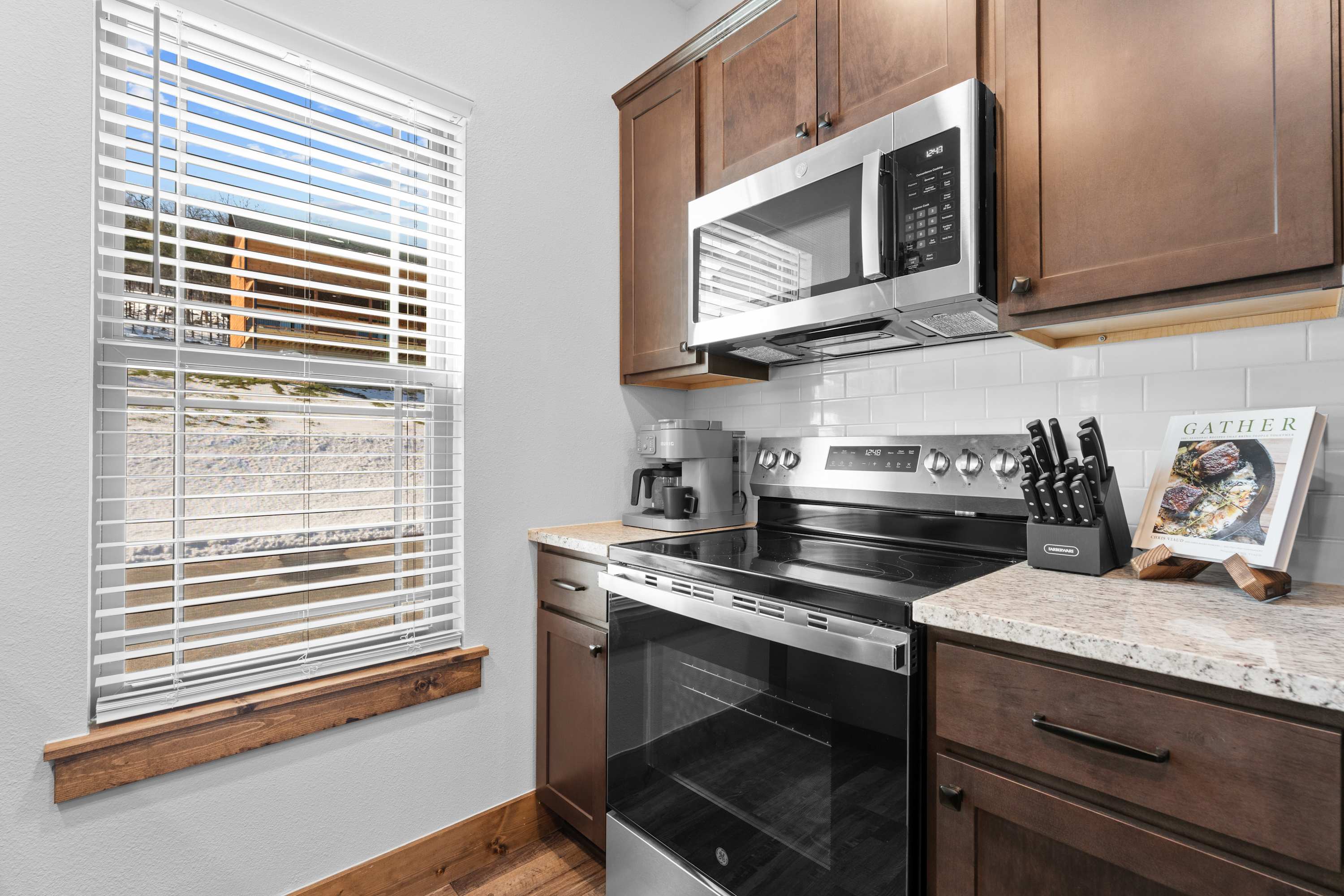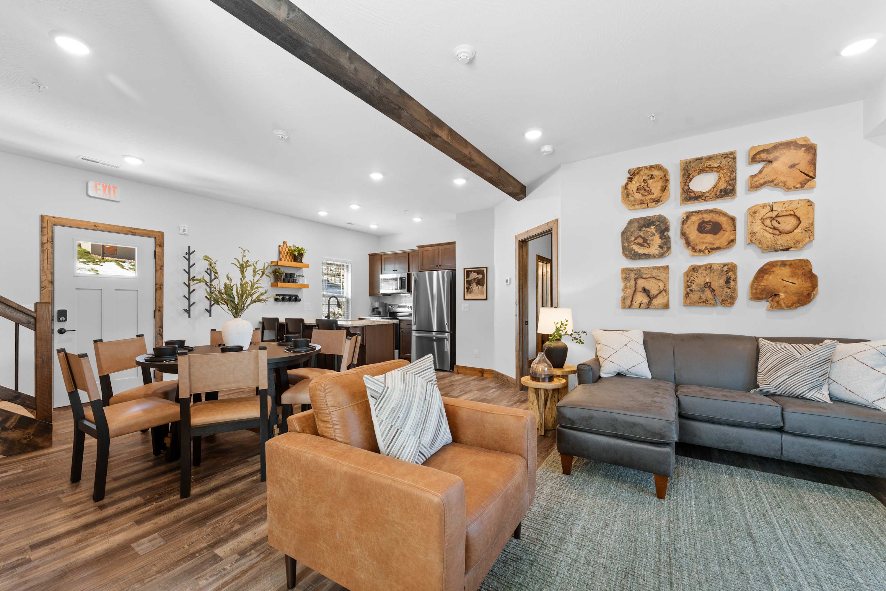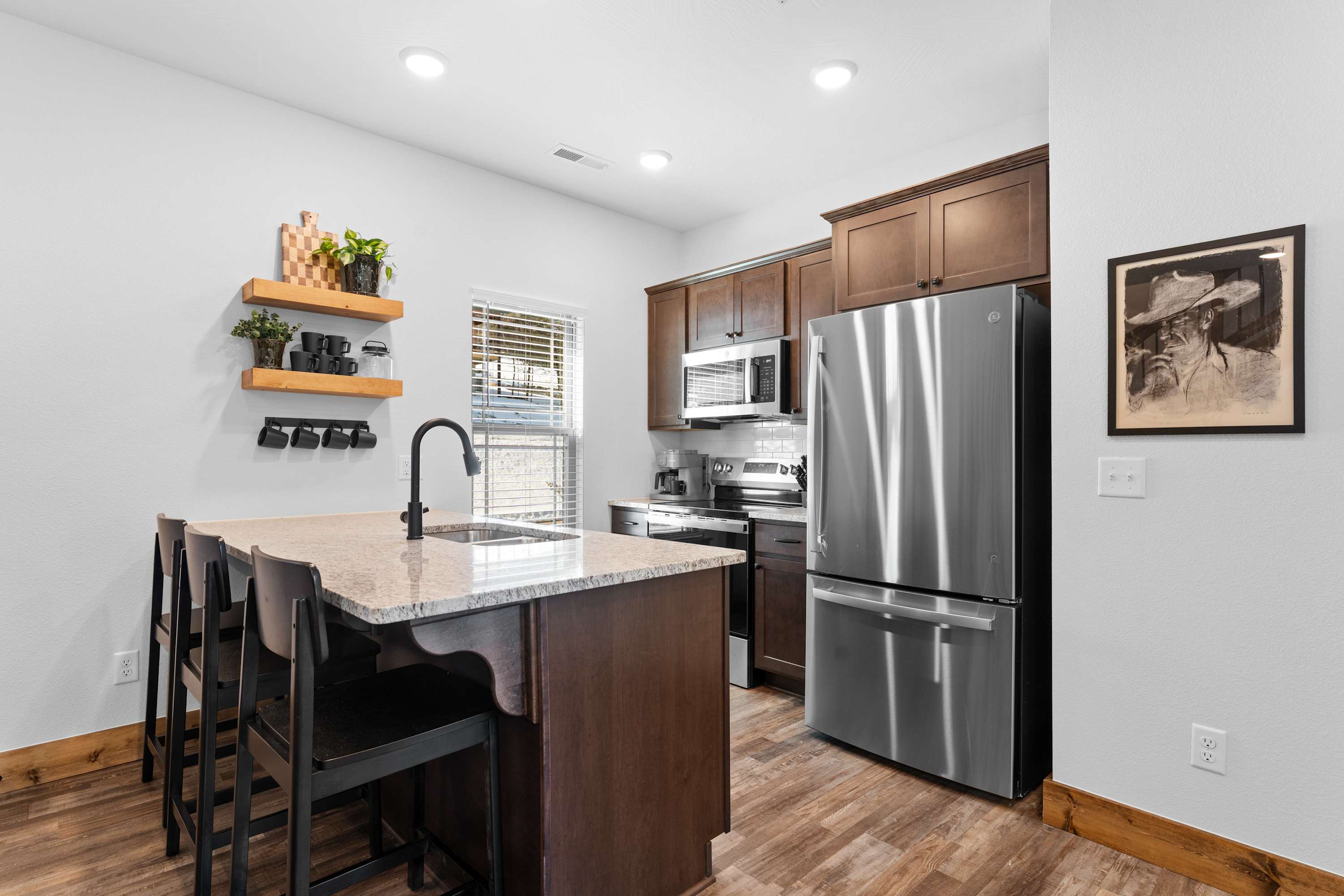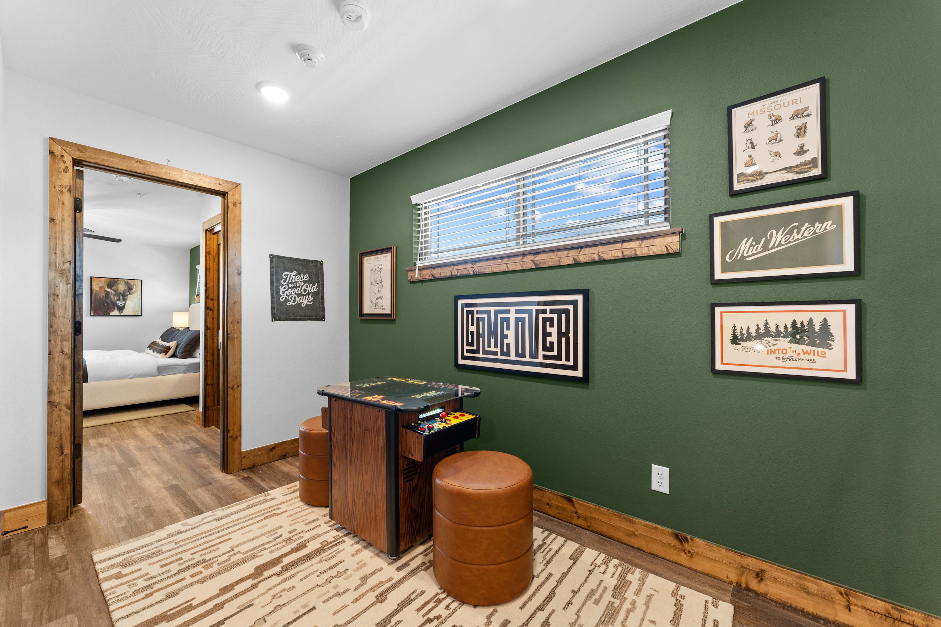 Step inside to an inviting open-concept living, kitchen, and dining space designed for connection and comfort. The living room features a smart TV, a couch with chaise, and a cozy armchair, creating a relaxed space to unwind. The kitchen blends style and function with stone countertops, stainless steel appliances, a drip/Keurig combo coffee maker, and counter seating for three, while the dining table for six sits nearby for shared meals. Head upstairs and you’ll find a fun surprise in the hall—a Pac-Man arcade game that adds a playful touch for all ages.