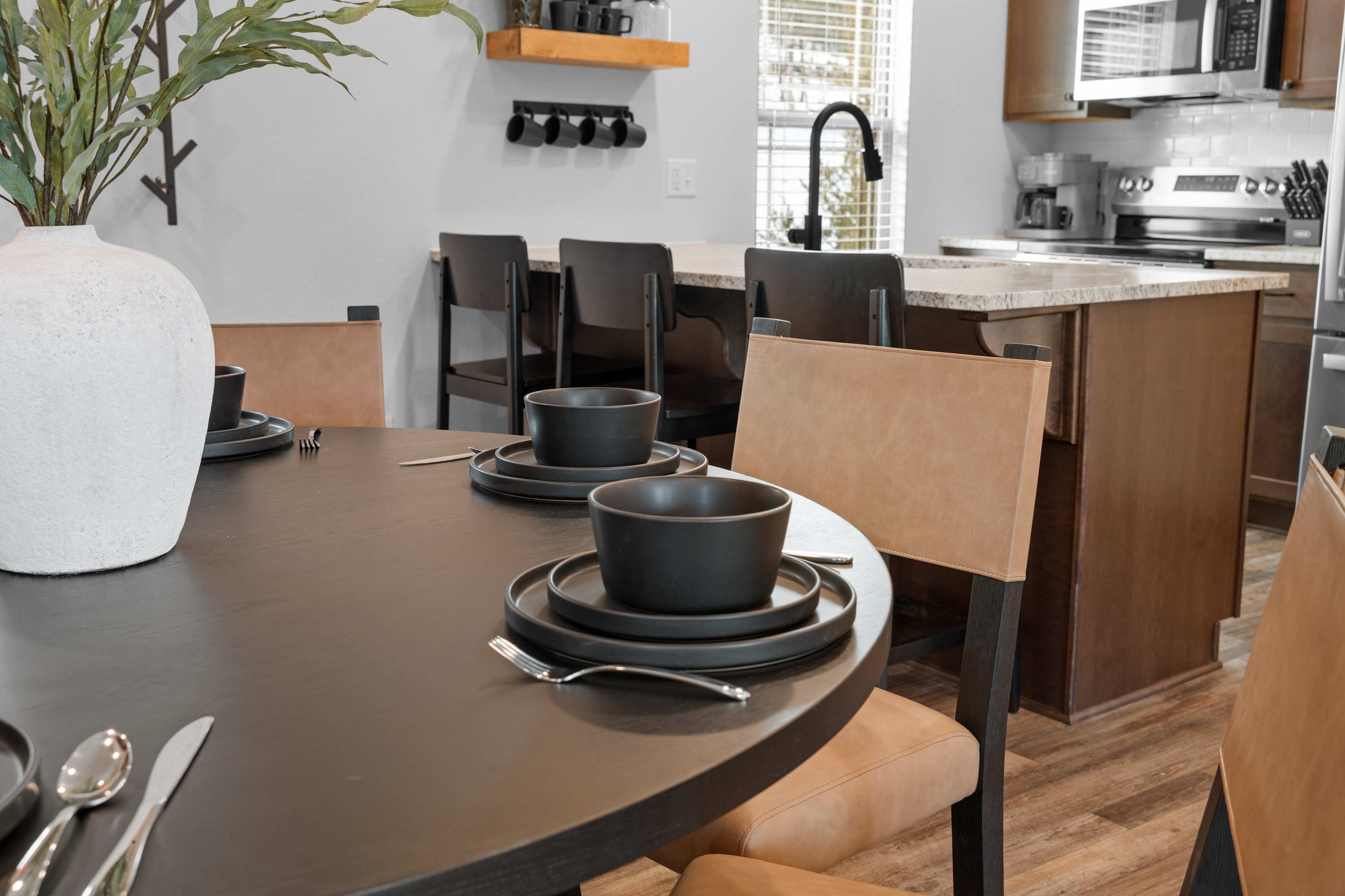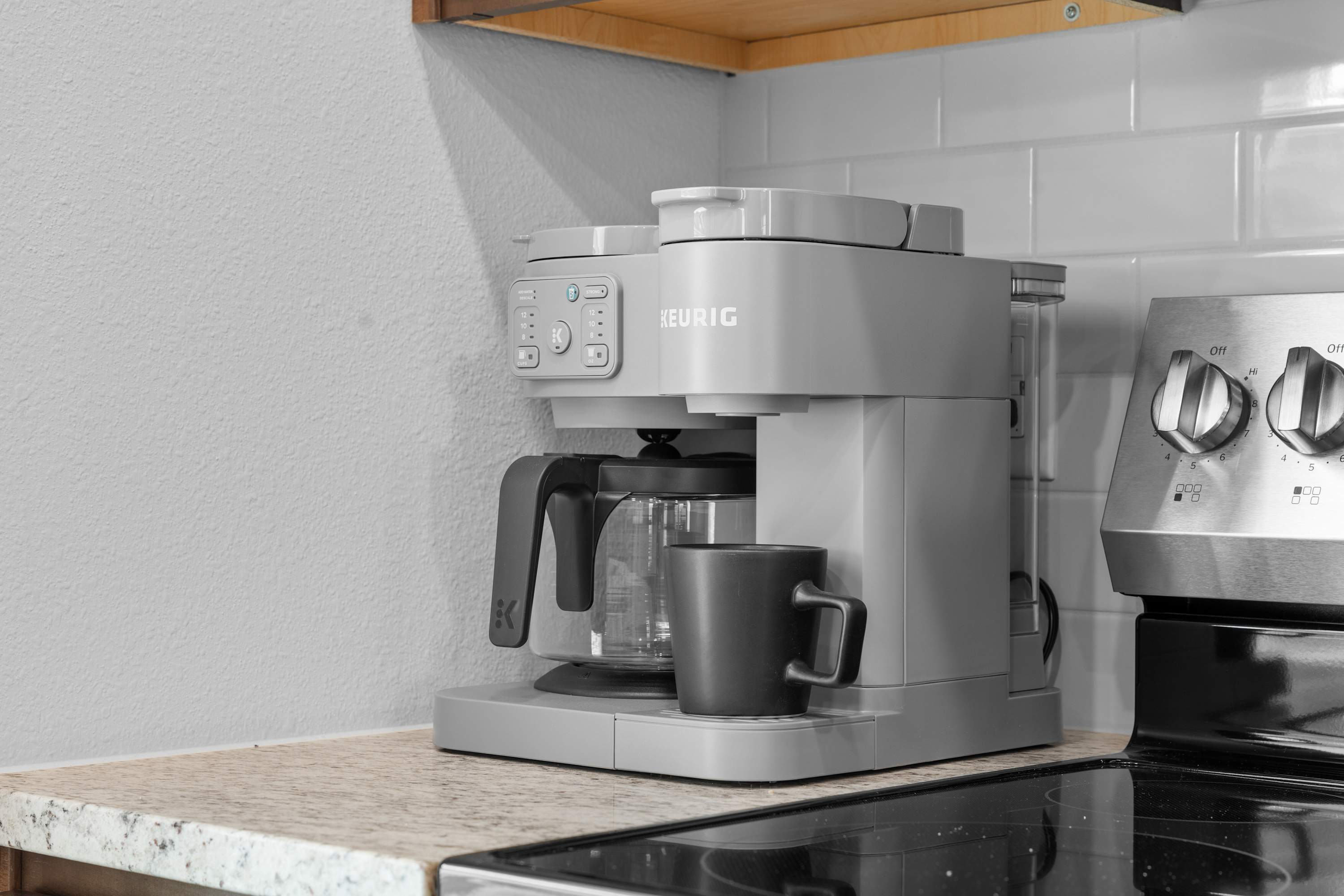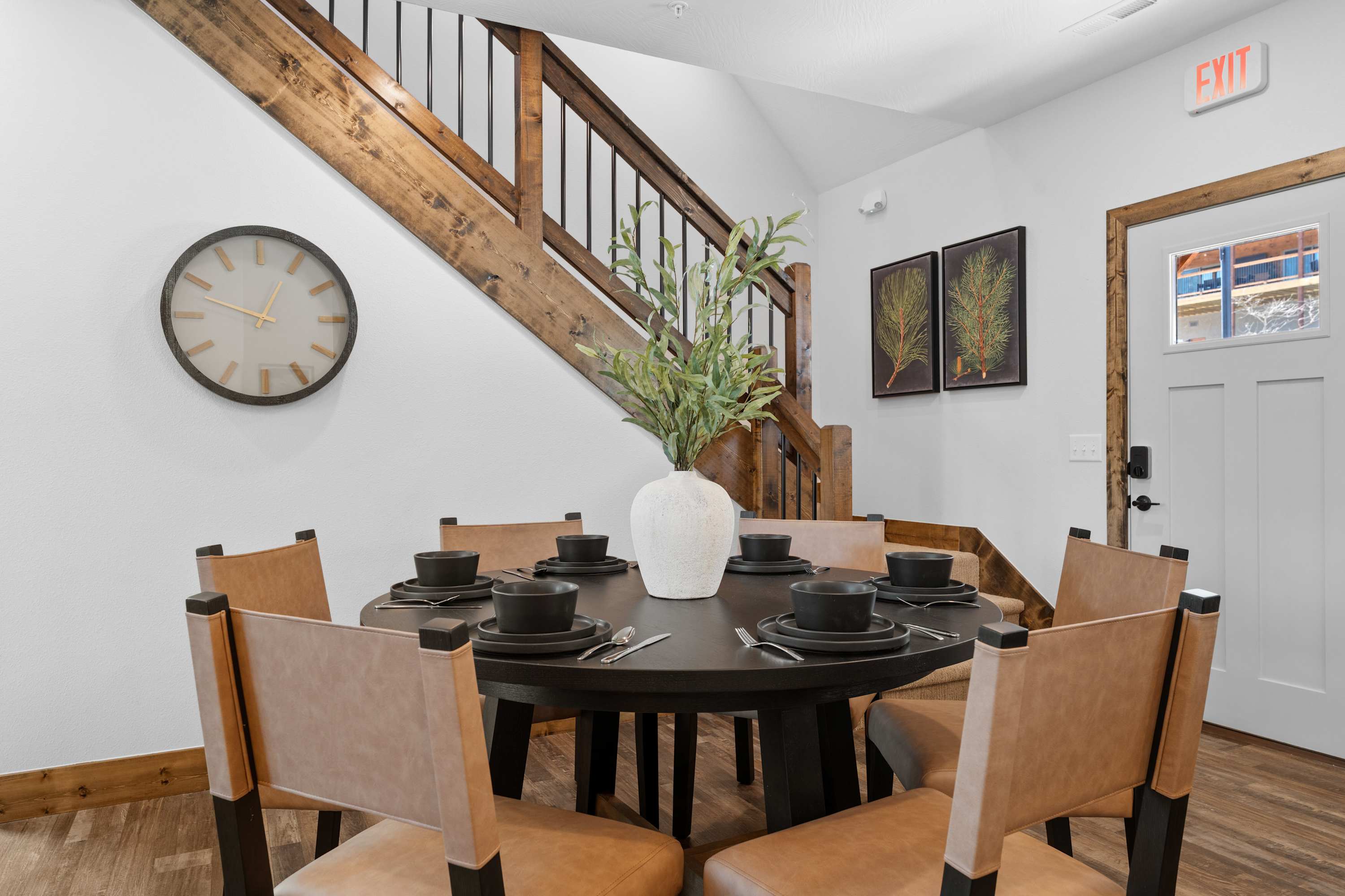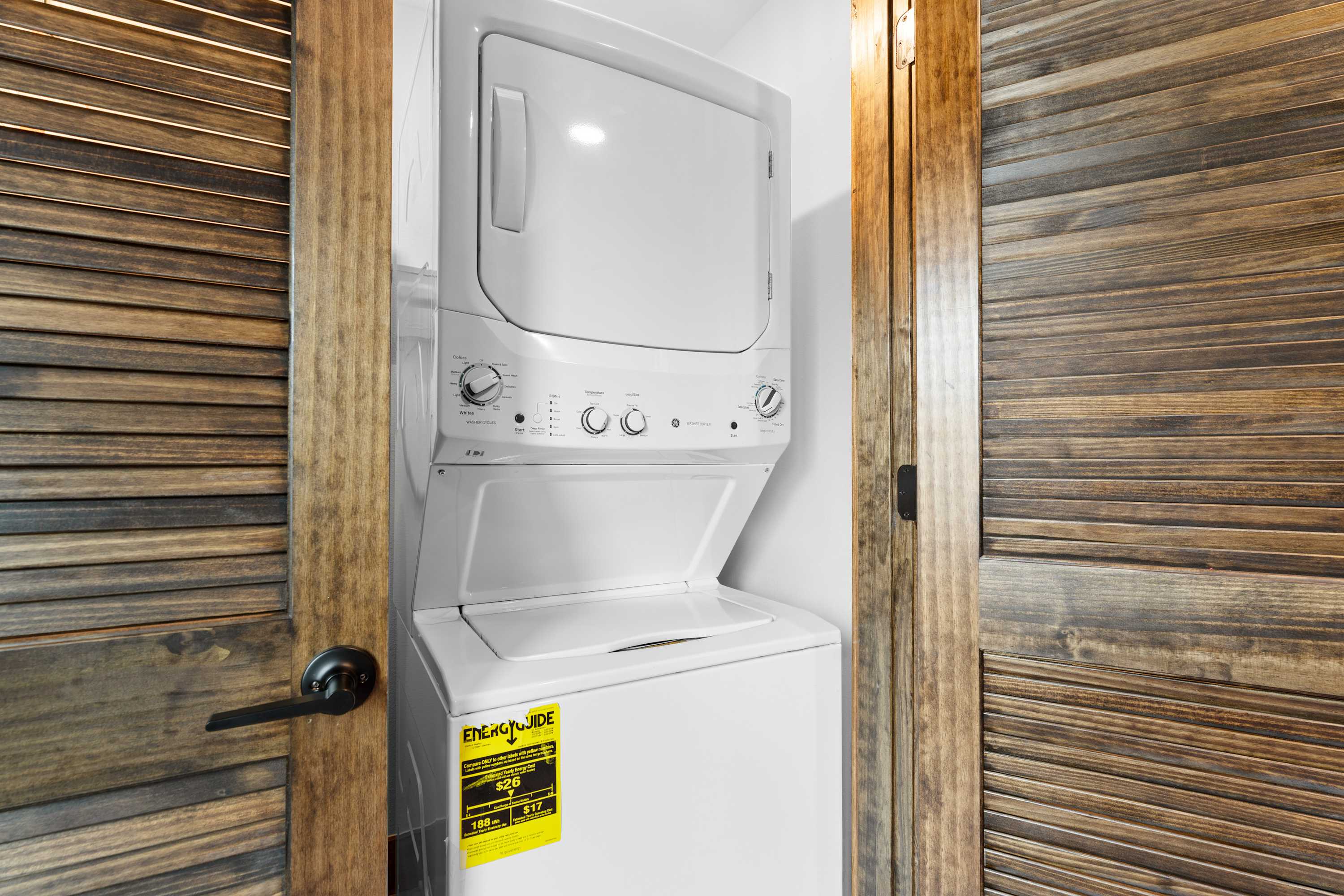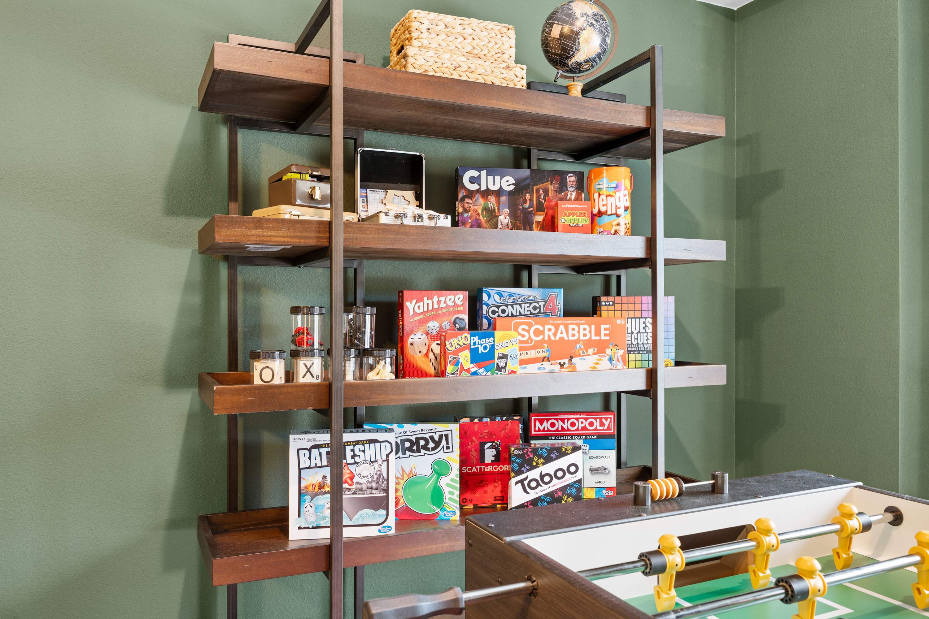 Step inside to an inviting open-concept living, kitchen, and dining space designed for connection and comfort. The living room features a smart TV, a couch with chaise, and a cozy armchair, creating a relaxed space to unwind. The kitchen blends style and function with stone countertops, stainless steel appliances, a drip/Keurig combo coffee maker, and counter seating for three, while the dining table for six sits nearby for shared meals. Head upstairs and you’ll find a fun surprise in the hall—a Pac-Man arcade game that adds a playful touch for all ages.