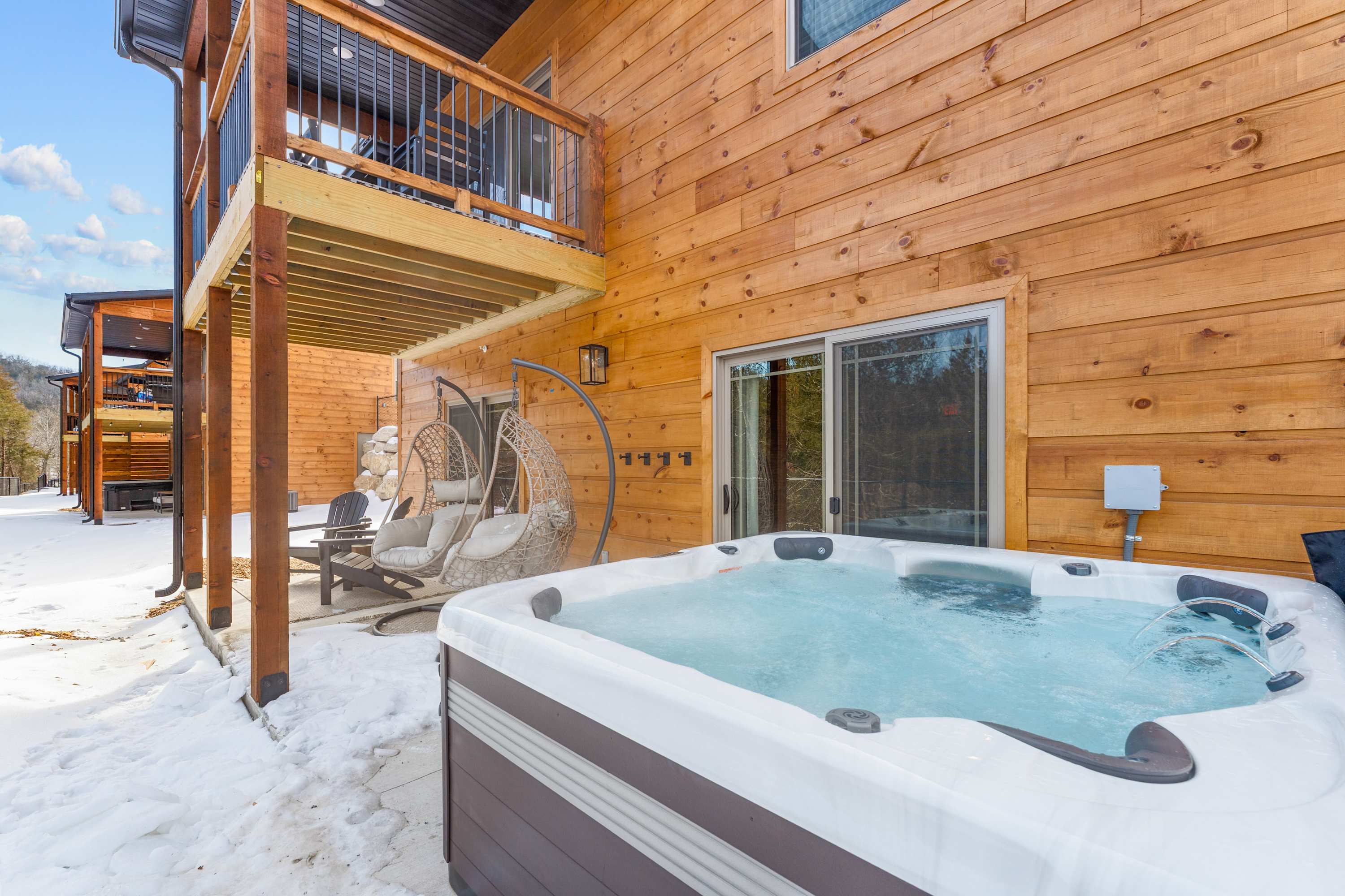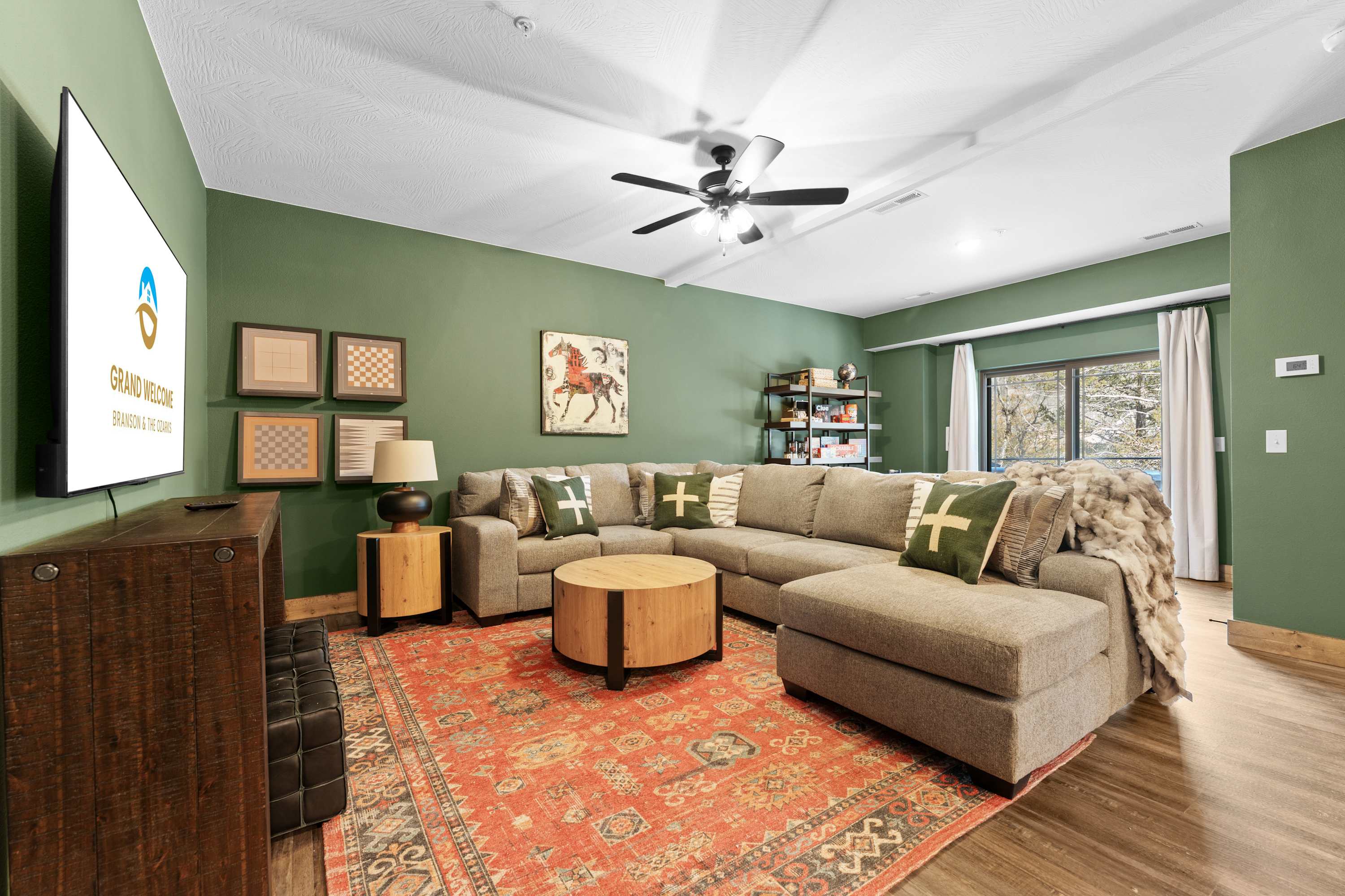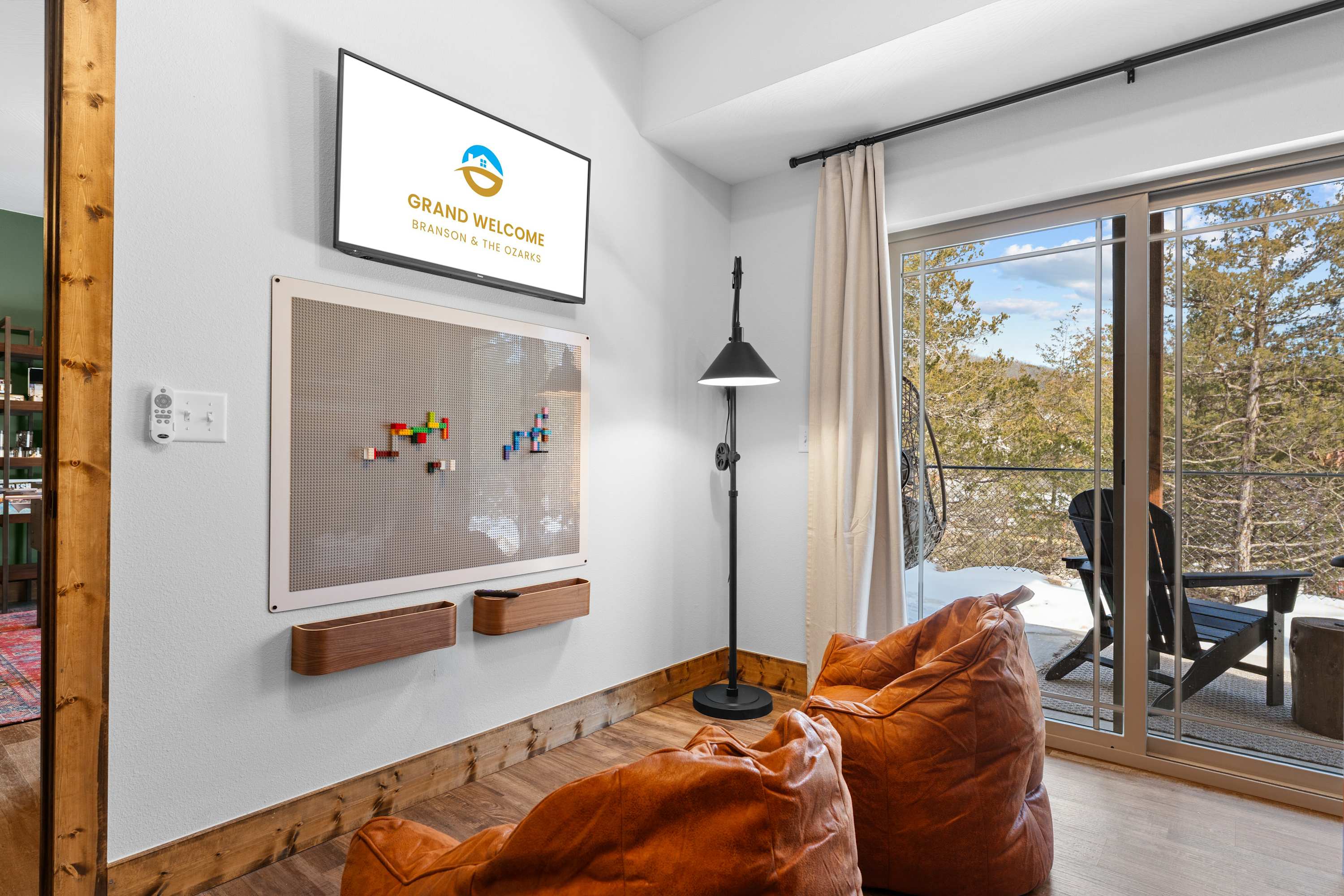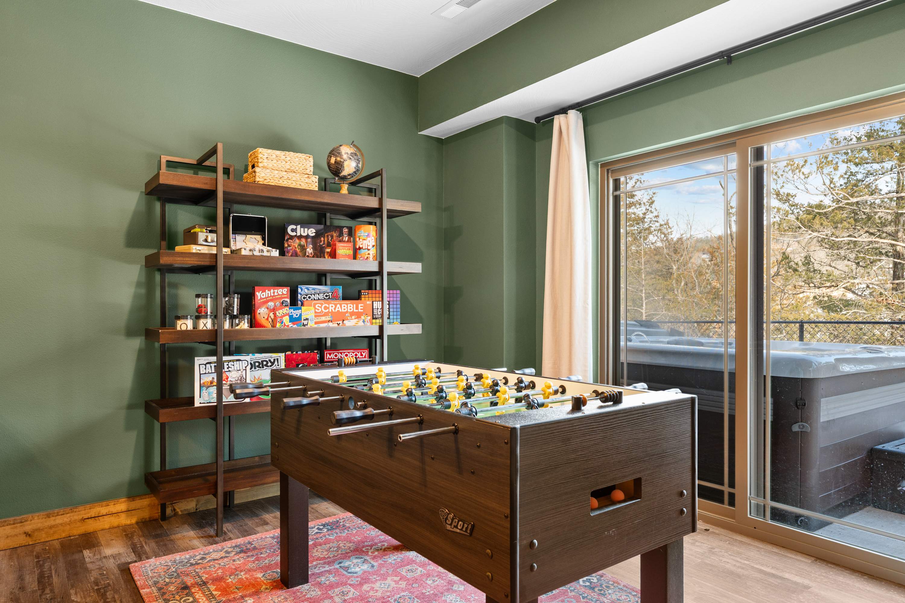 Downstairs, the home opens up to a spacious basement hangout complete with a wraparound sofa, foosball table, smart TV, and board games, making it perfect for movie nights or friendly competition. Outdoor living is just as impressive, with a covered upper-level deck featuring a dining table for six, grill, and incredible mountain views—ideal for sunset dinners. Below, the lower-level patio offers comfortable seating and a private hot tub, creating the perfect place to relax under the Ozarks sky. With multiple spaces to gather, play, and unwind, Timber Creek Retreat is designed for memorable stays with family and friends.