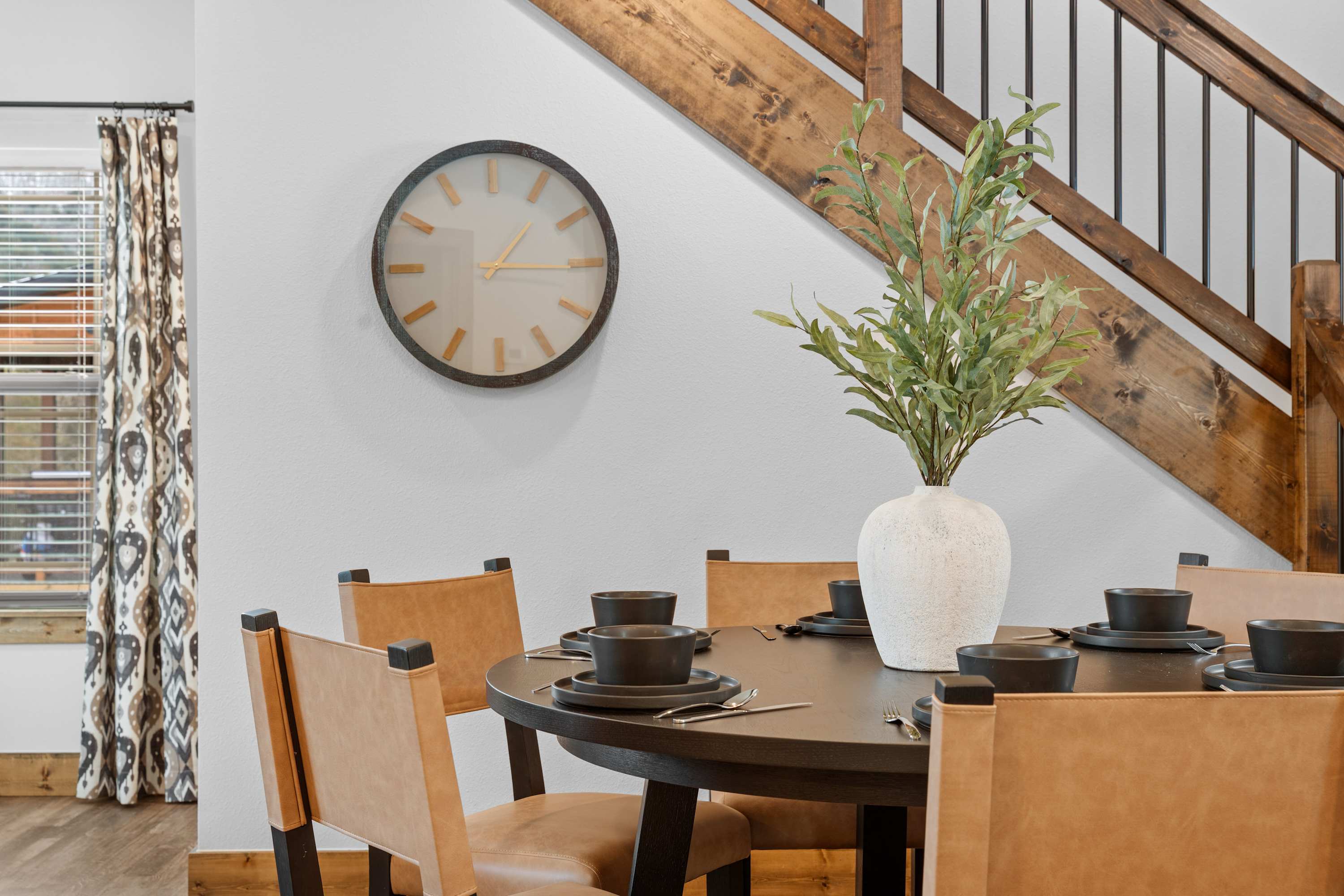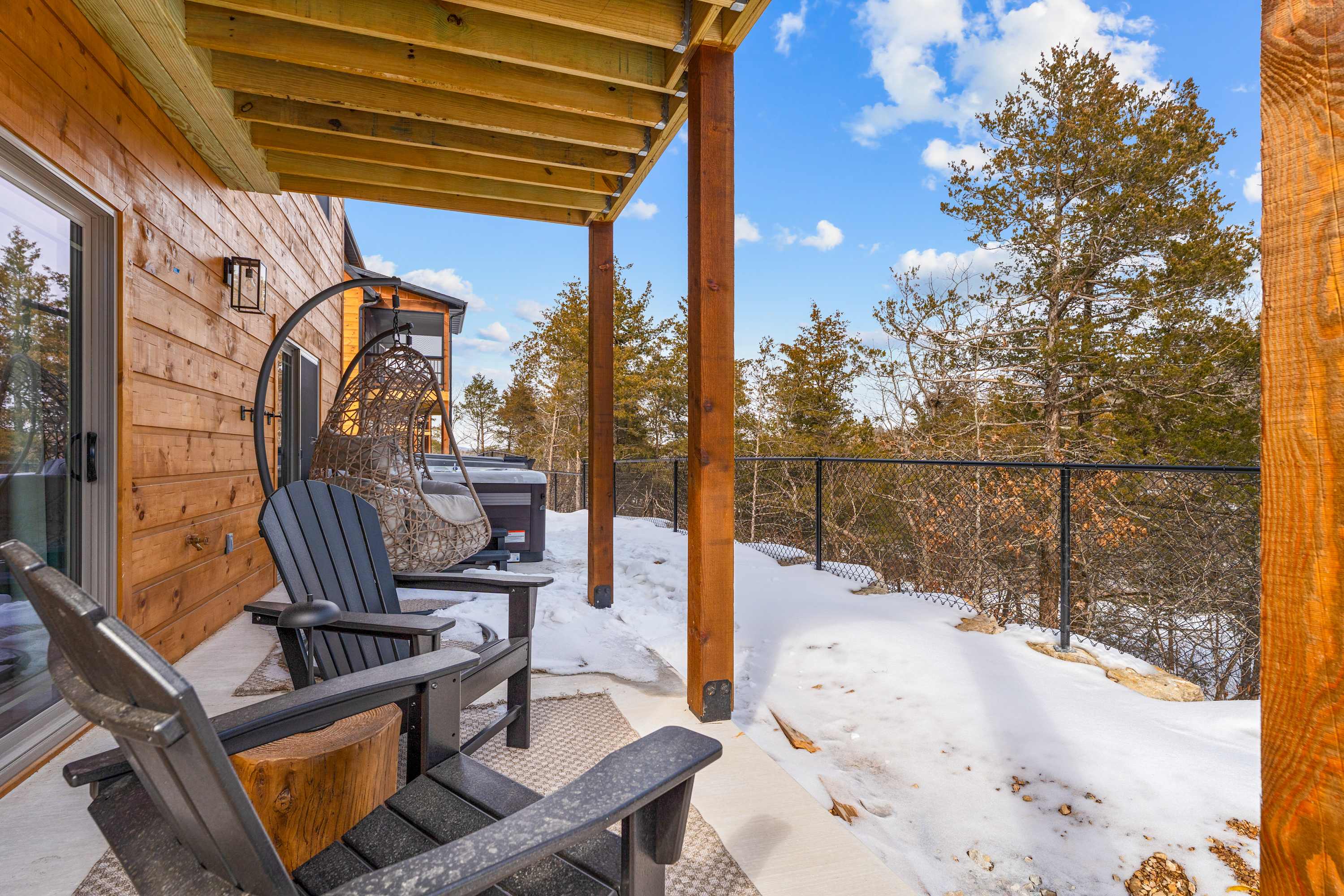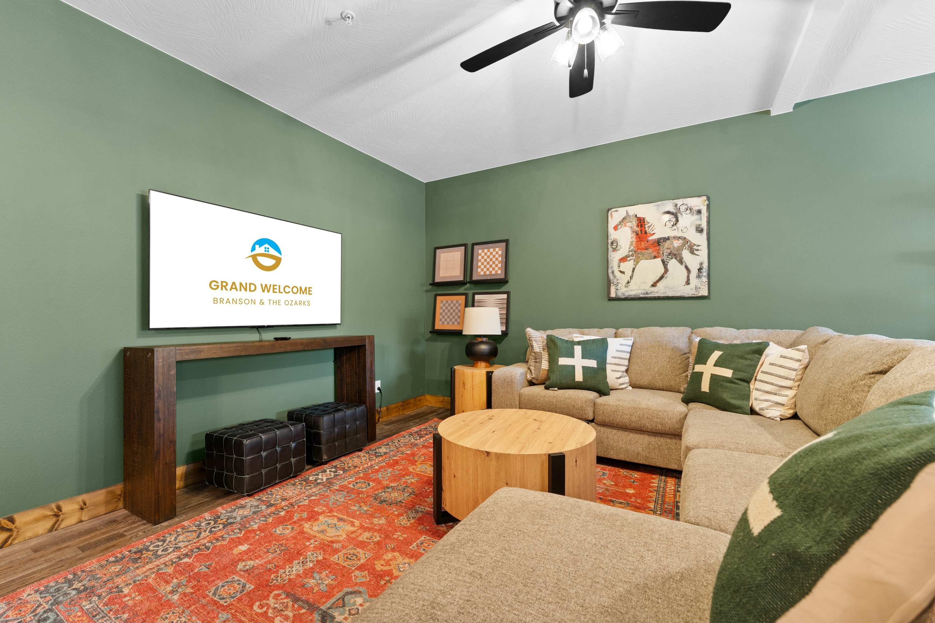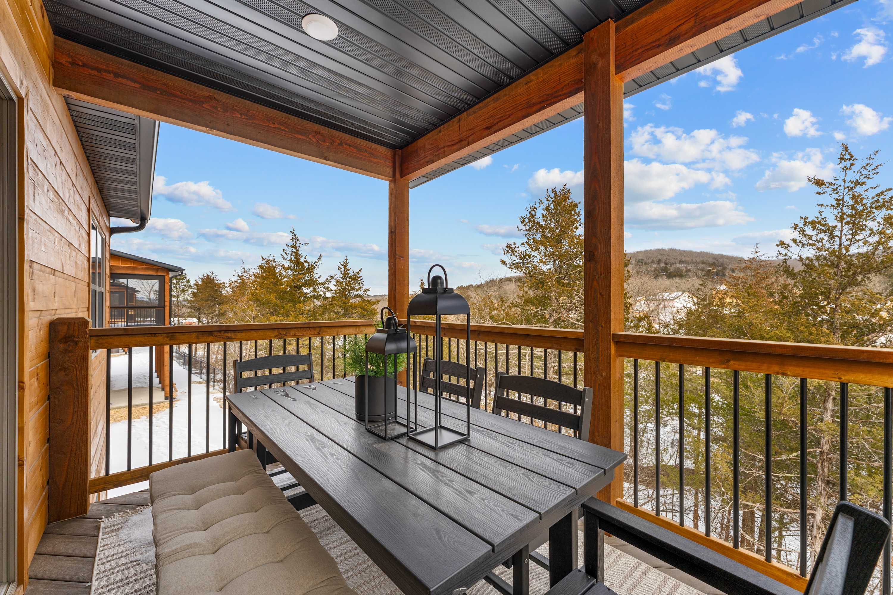 Downstairs, the home opens up to a spacious basement hangout complete with a wraparound sofa, foosball table, smart TV, and board games, making it perfect for movie nights or friendly competition. Outdoor living is just as impressive, with a covered upper-level deck featuring a dining table for six, grill, and incredible mountain views—ideal for sunset dinners. Below, the lower-level patio offers comfortable seating and a private hot tub, creating the perfect place to relax under the Ozarks sky. With multiple spaces to gather, play, and unwind, Timber Creek Retreat is designed for memorable stays with family and friends.