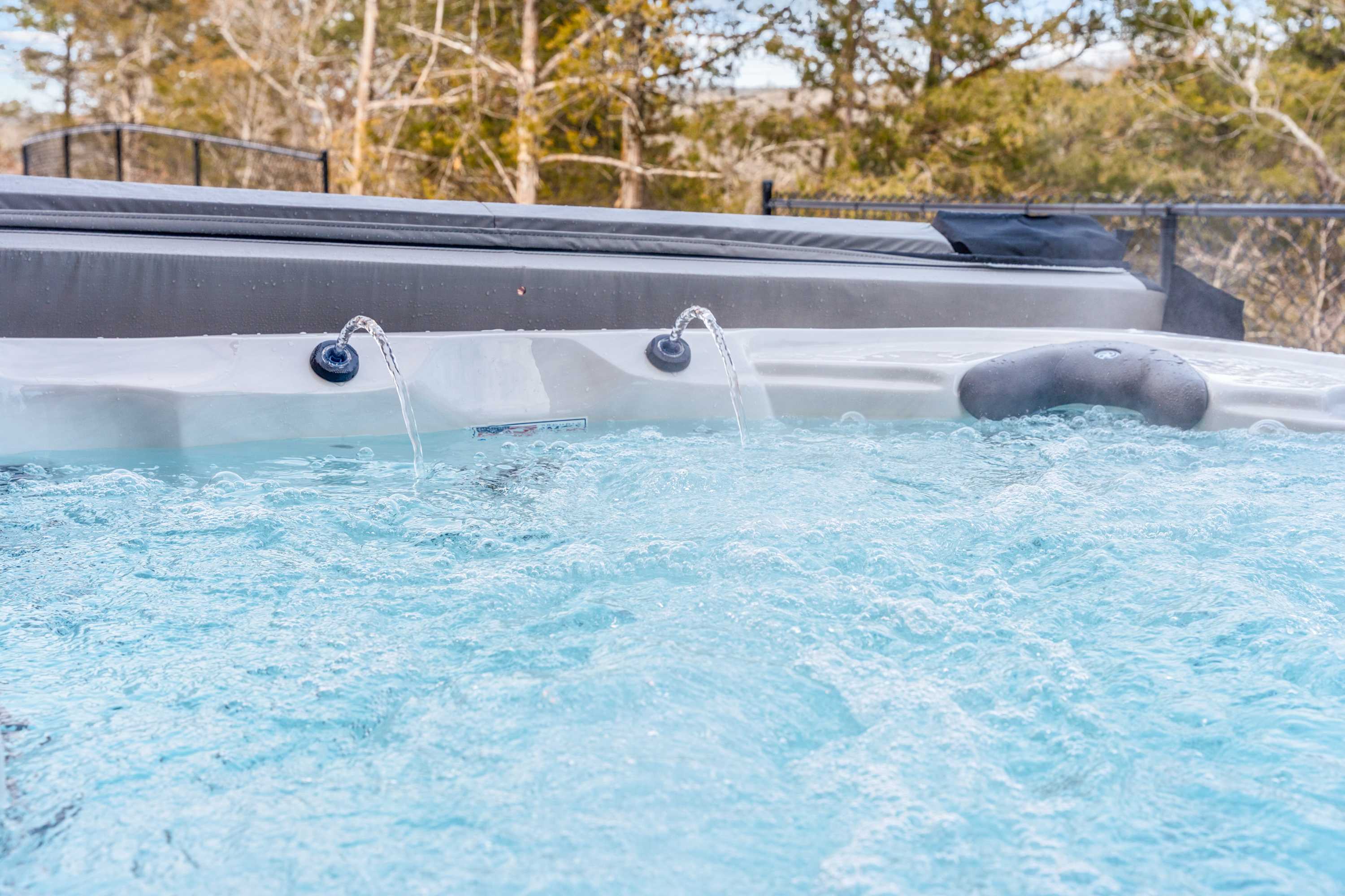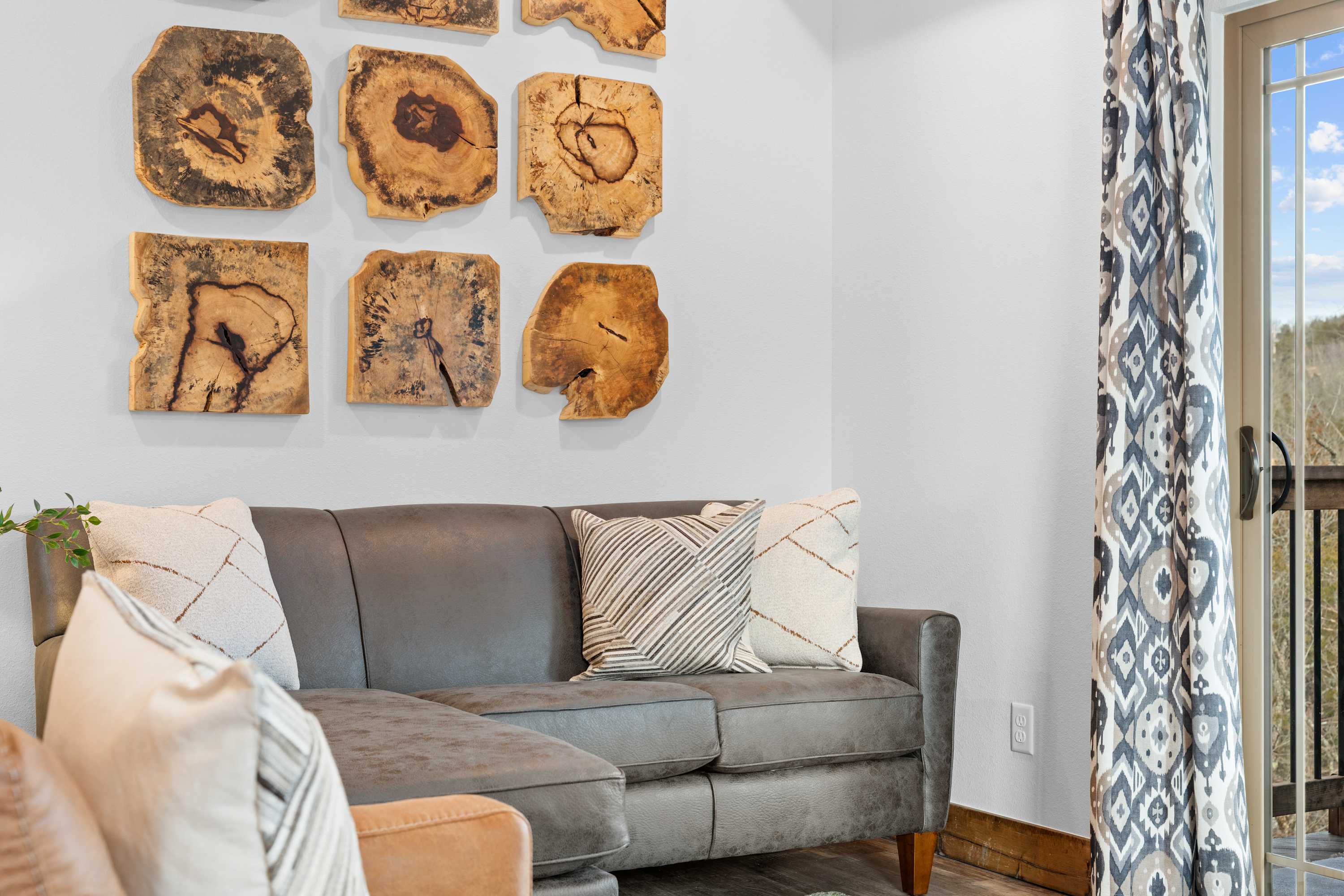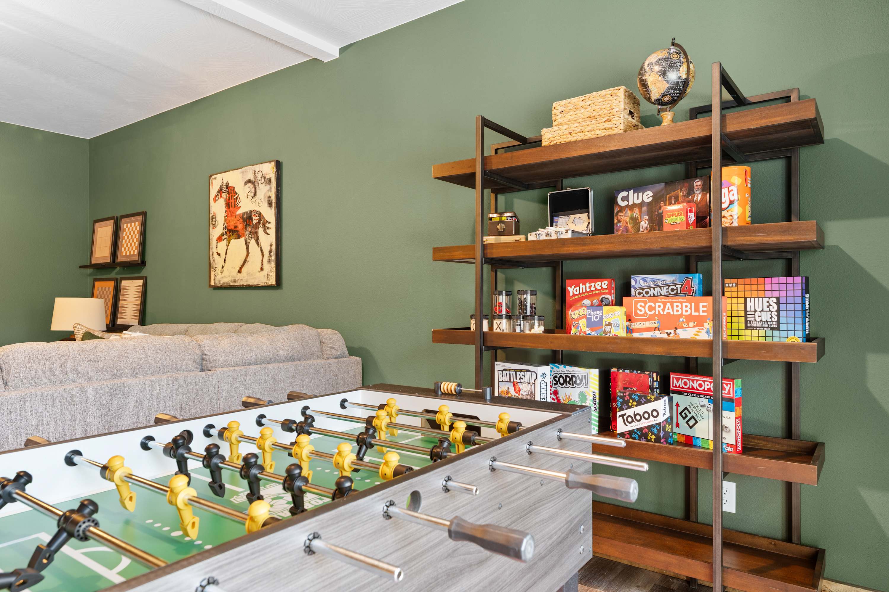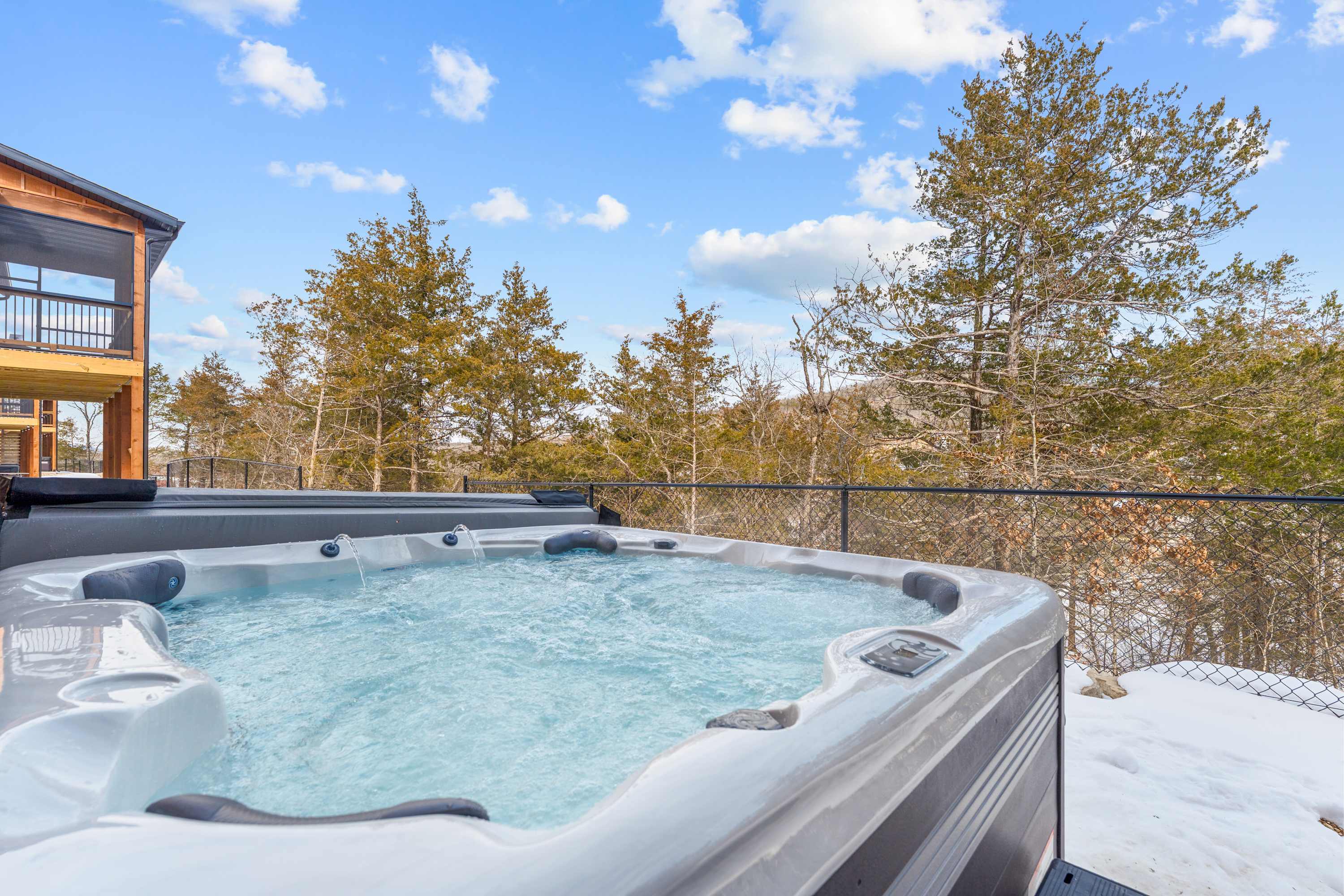 Downstairs, the home opens up to a spacious basement hangout complete with a wraparound sofa, foosball table, smart TV, and board games, making it perfect for movie nights or friendly competition. Outdoor living is just as impressive, with a covered upper-level deck featuring a dining table for six, grill, and incredible mountain views—ideal for sunset dinners. Below, the lower-level patio offers comfortable seating and a private hot tub, creating the perfect place to relax under the Ozarks sky. With multiple spaces to gather, play, and unwind, Timber Creek Retreat is designed for memorable stays with family and friends.