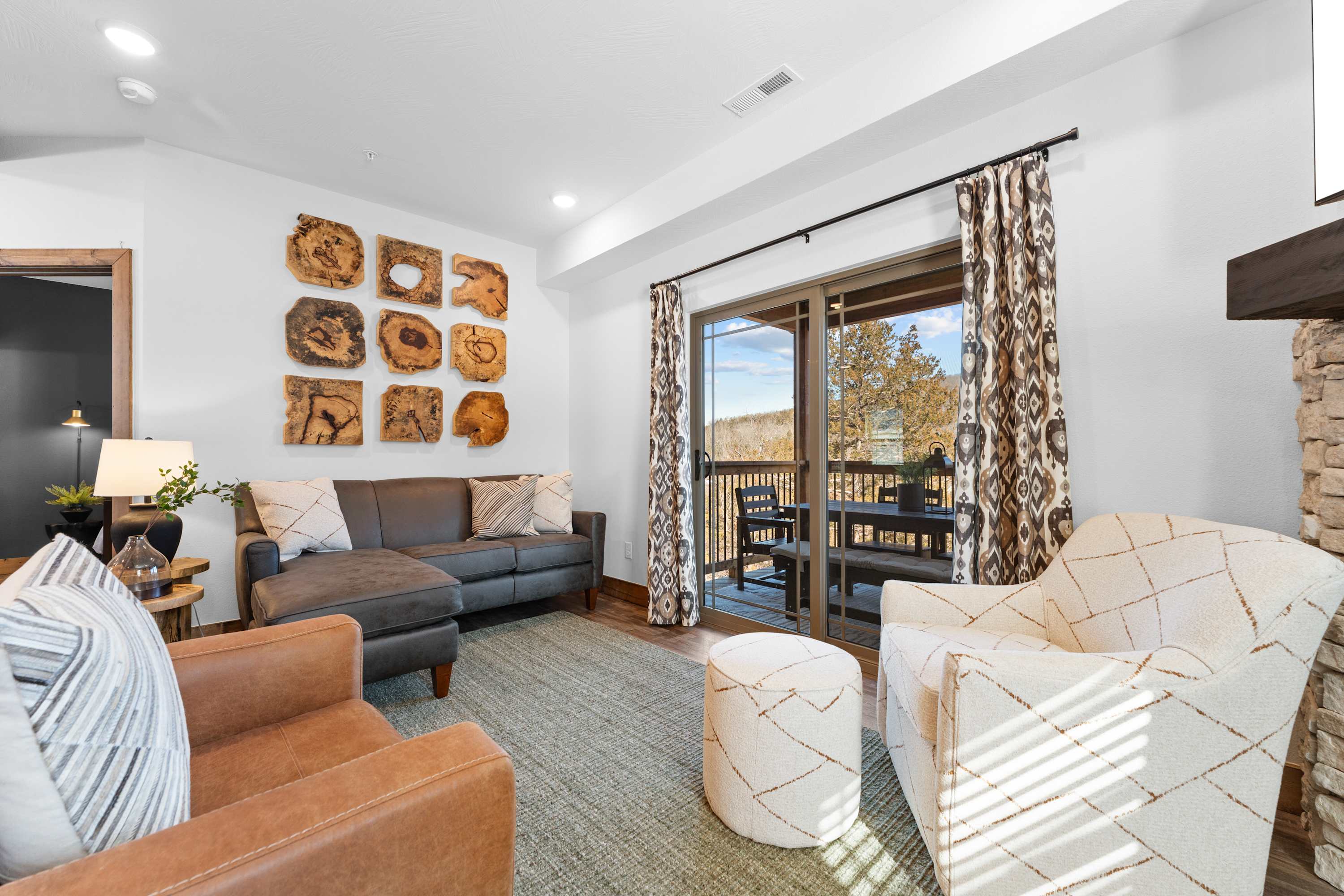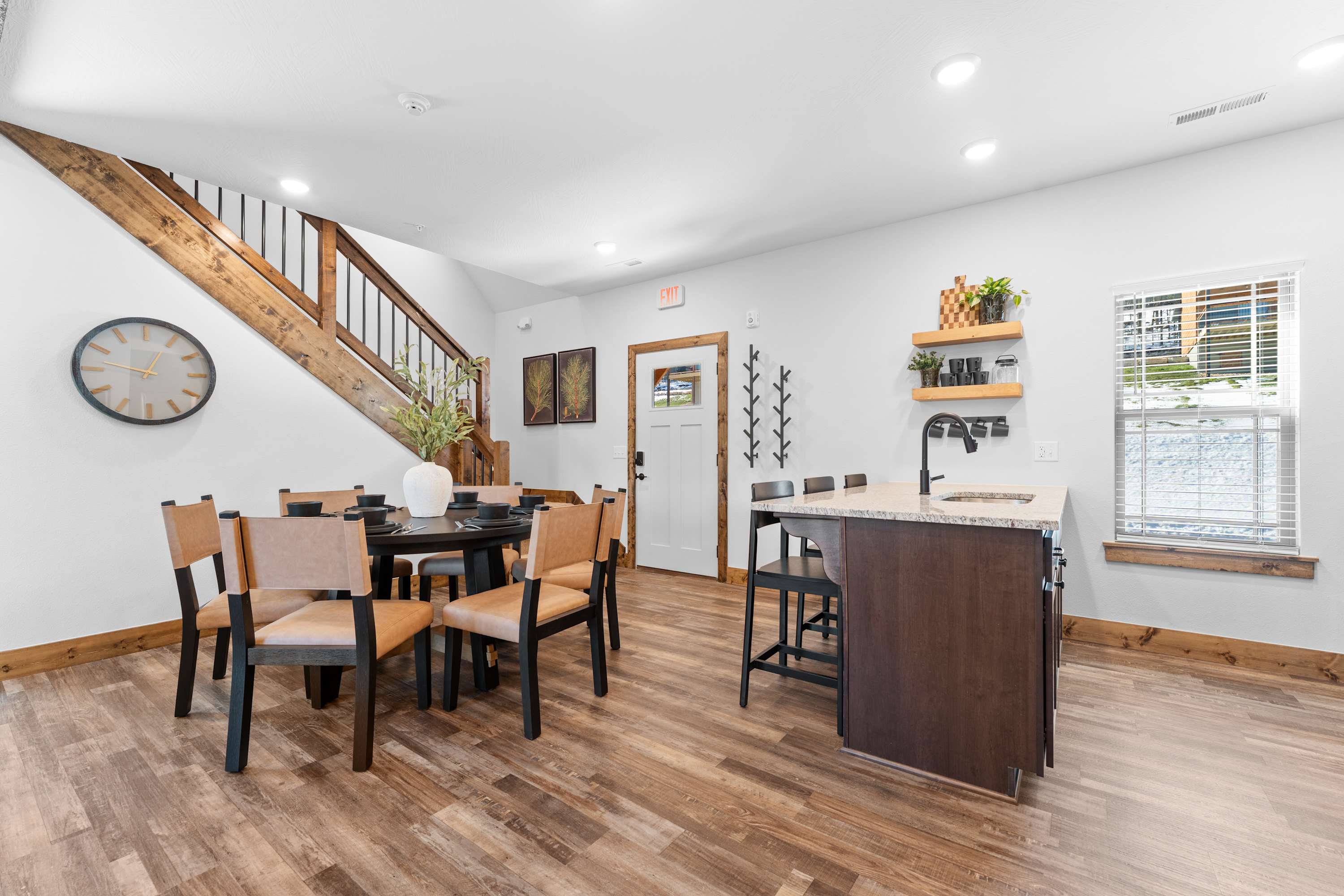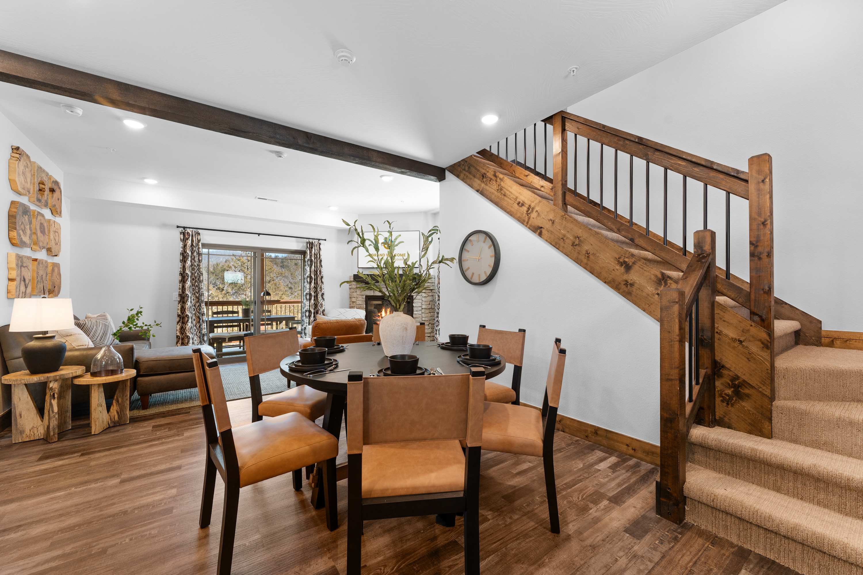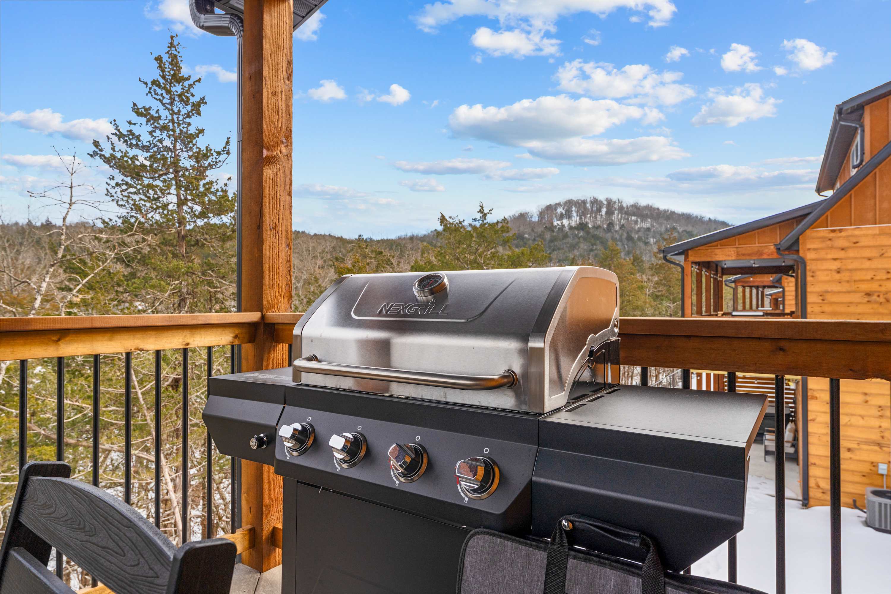 Downstairs, the home opens up to a spacious basement hangout complete with a wraparound sofa, foosball table, smart TV, and board games, making it perfect for movie nights or friendly competition. Outdoor living is just as impressive, with a covered upper-level deck featuring a dining table for six, grill, and incredible mountain views—ideal for sunset dinners. Below, the lower-level patio offers comfortable seating and a private hot tub, creating the perfect place to relax under the Ozarks sky. With multiple spaces to gather, play, and unwind, Timber Creek Retreat is designed for memorable stays with family and friends.