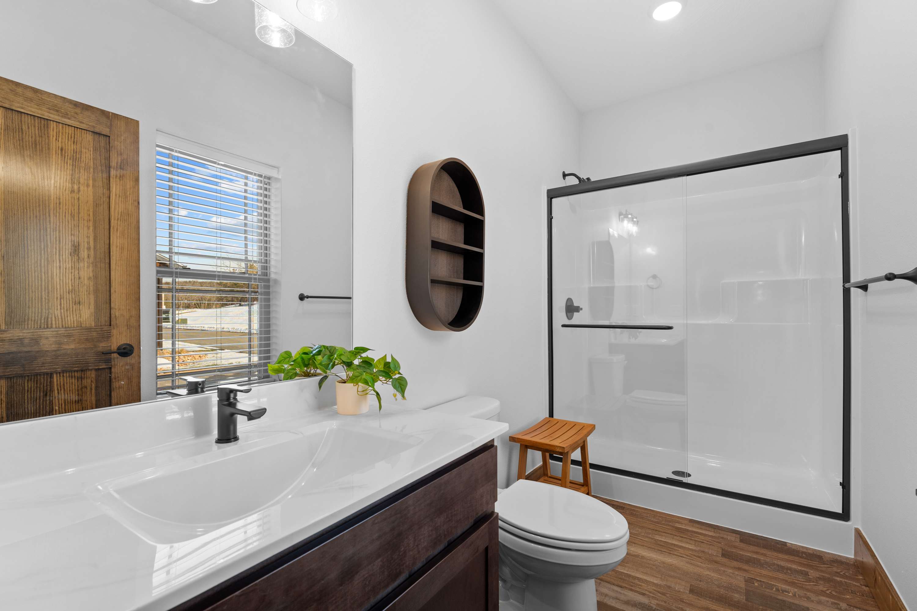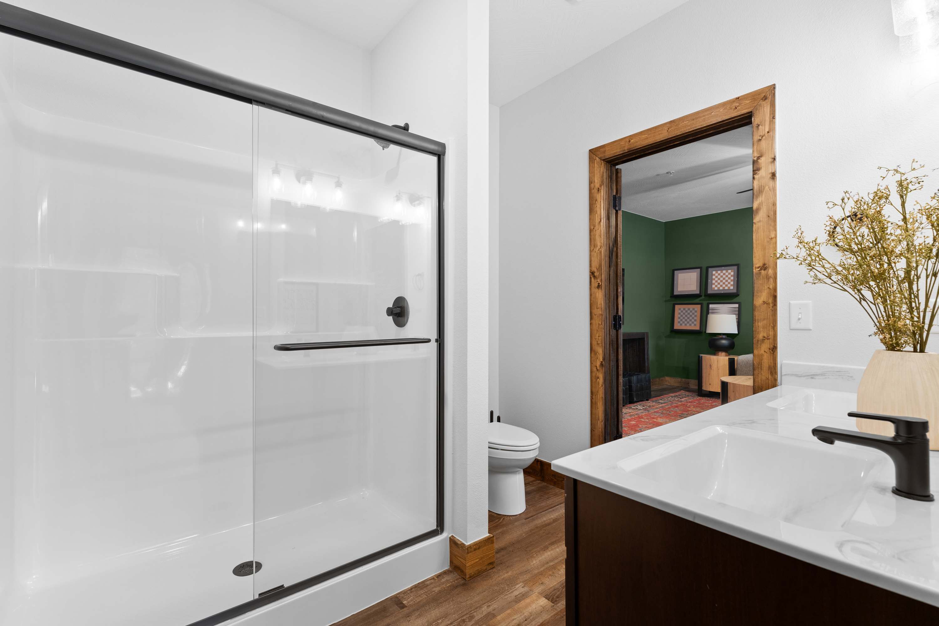 Bedroom #1 includes a king size bed, a smart TV, and an ensuite bathroom with a single vanity and a walk-in shower.