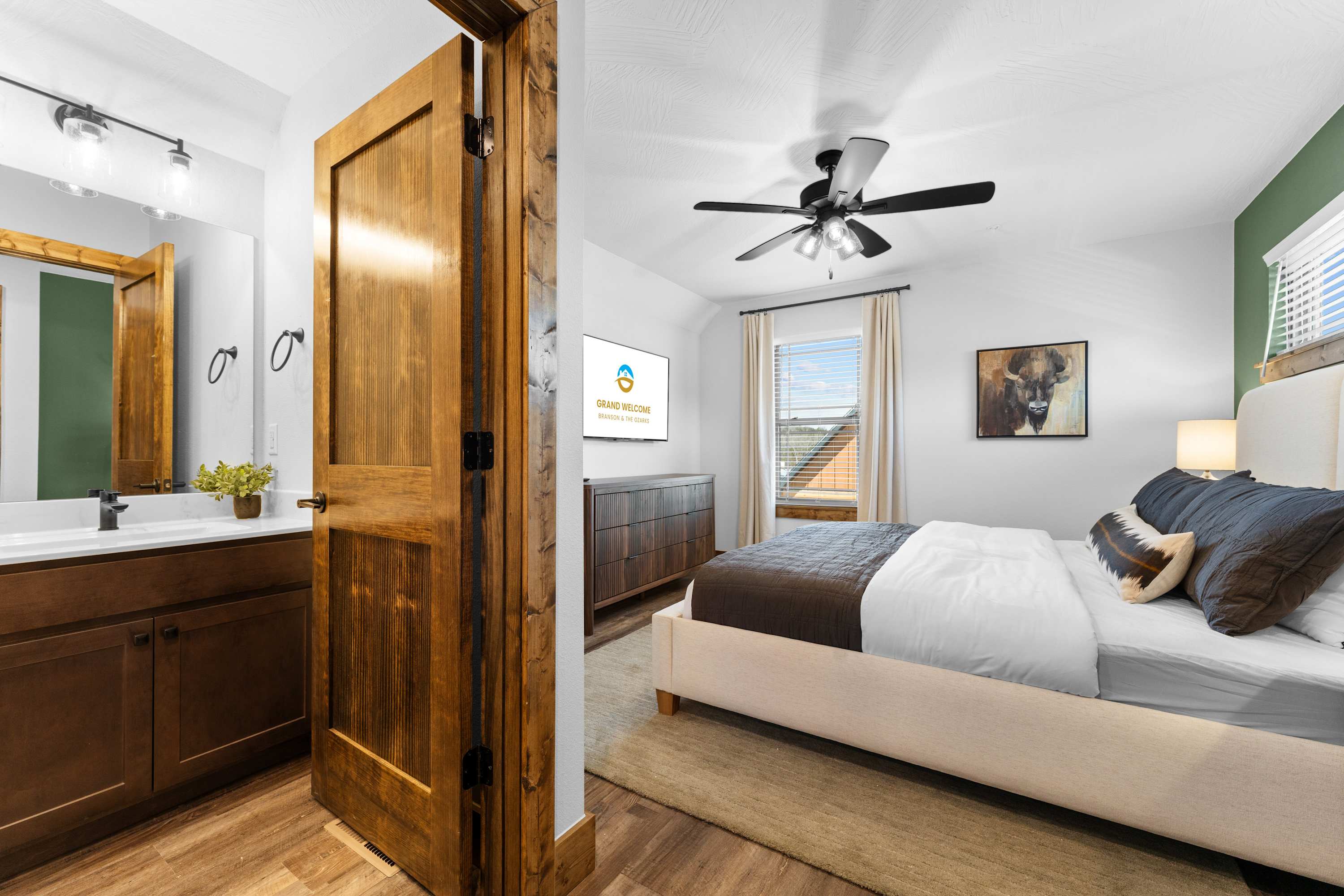 Bedroom #2 includes a king size bed, a smart TV, and an ensuite bathroom with a single vanity and a shower/tub combo.