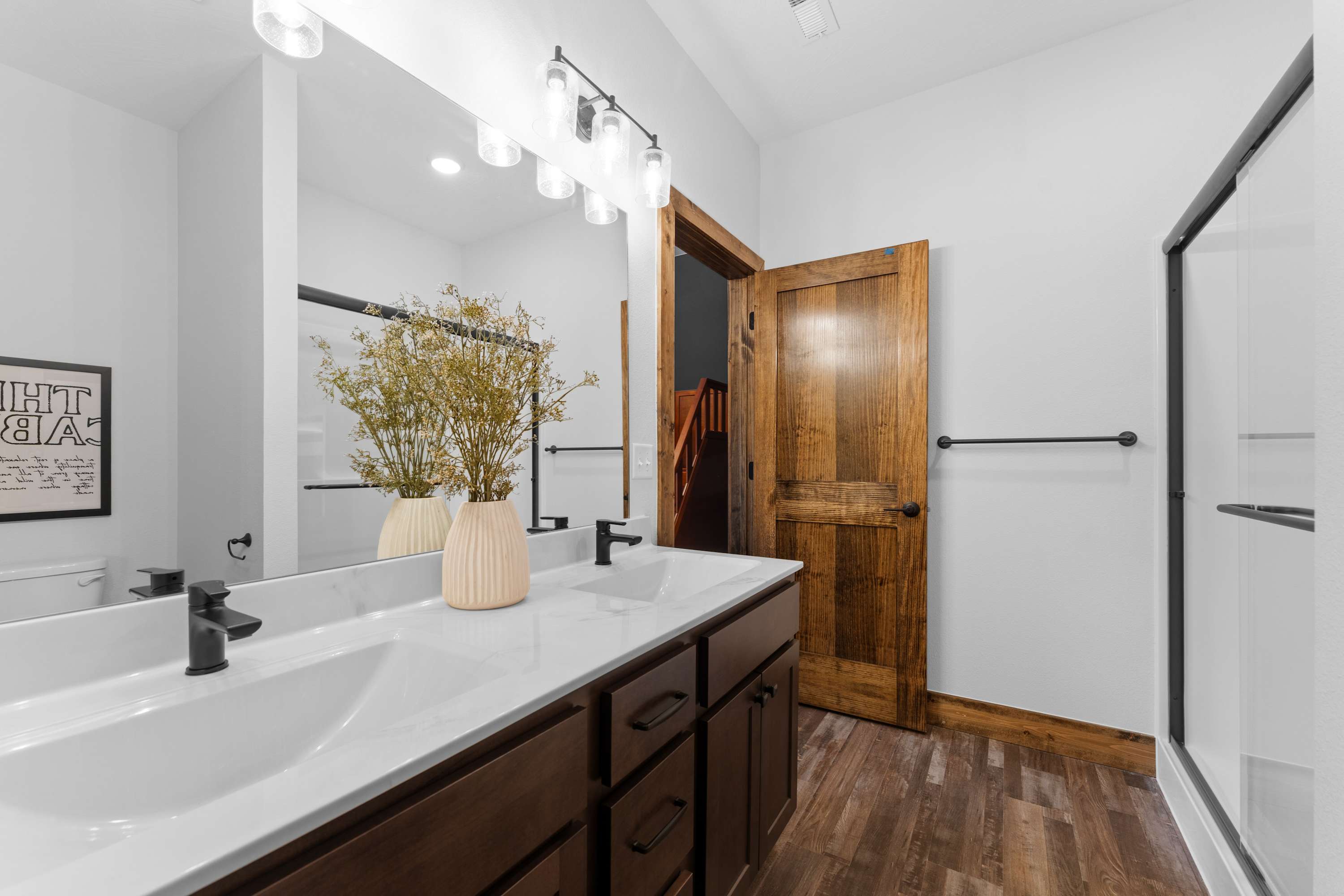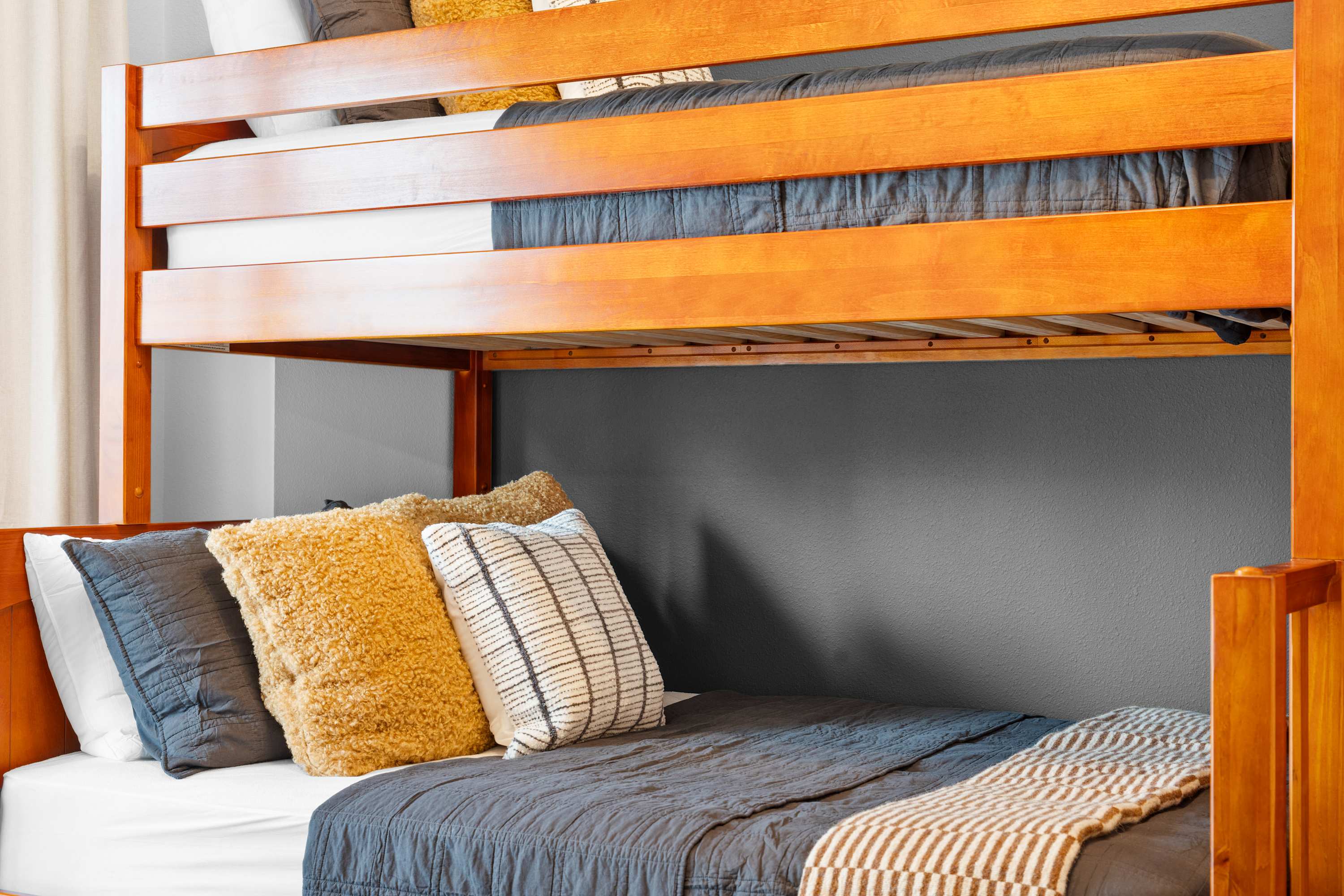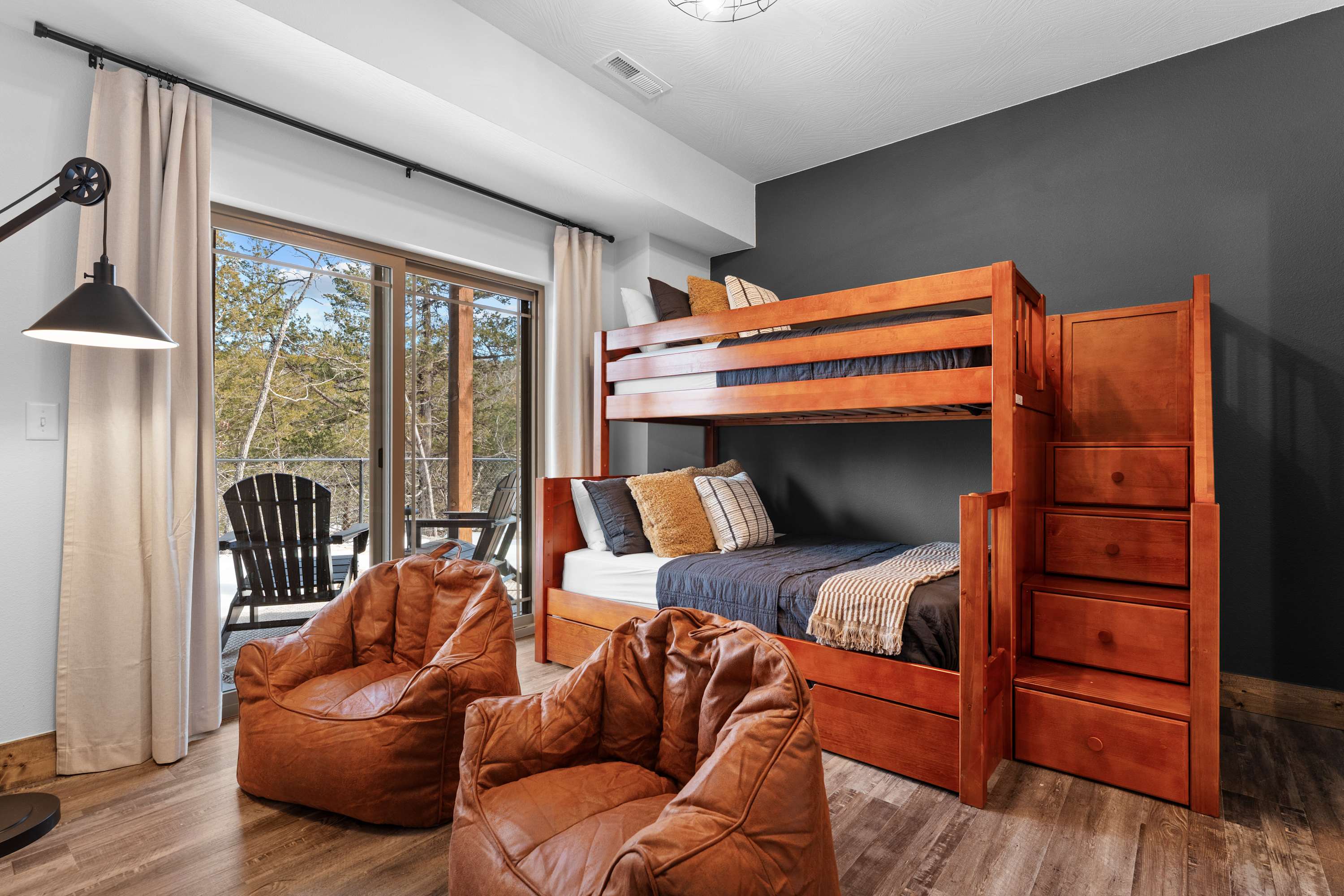 Bedroom #3 includes a set of twin-over-queen bunk beds, a smart TV, and an ensuite bathroom with a dual vanity and a walk-in shower, also accessible via the basement living room.