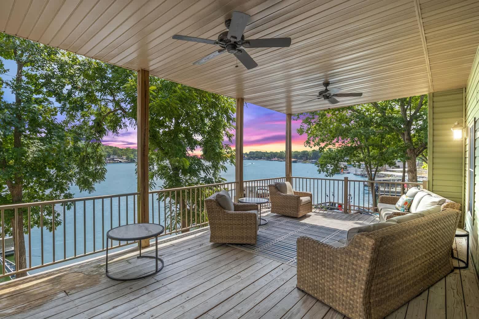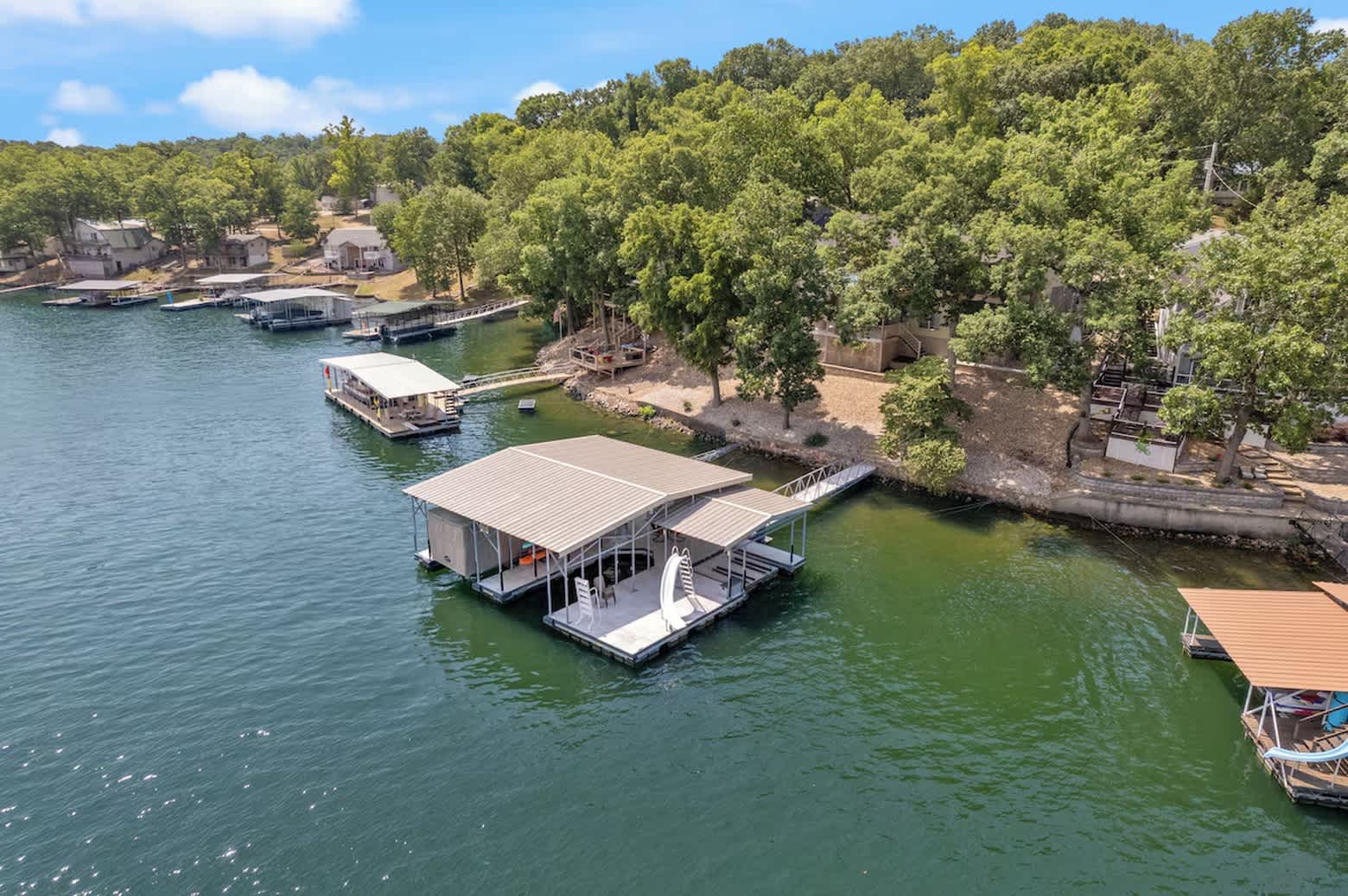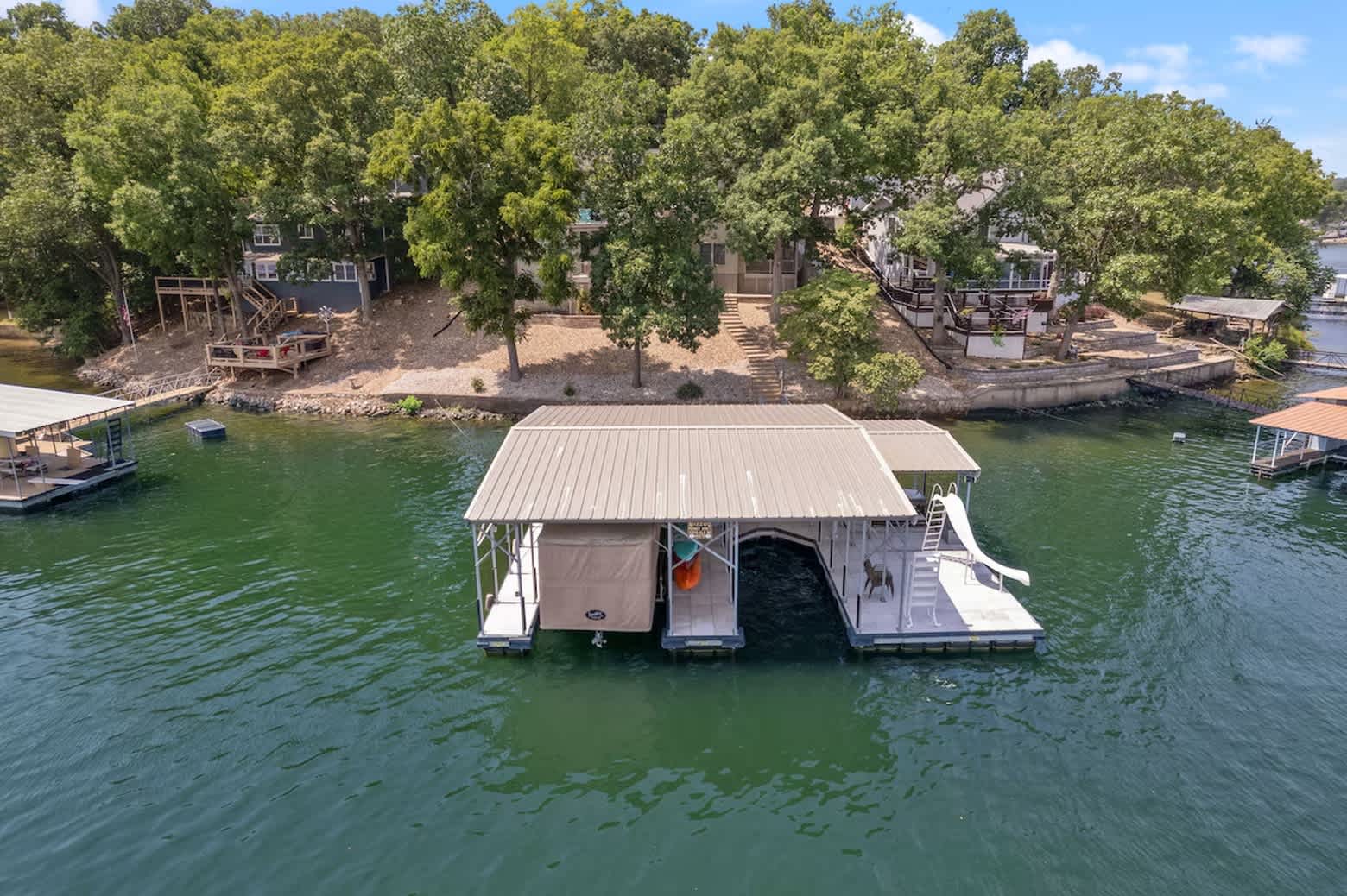 Eagle Ridge is a lakefront retreat tucked away in Buck Creek Cove, just off the 7 Mile Marker of the Lake of the Ozarks main channel, offering the perfect balance of calm waters and easy access to lake attractions. Located in a large, protected cove, this home is ideal for swimming, kayaking, and relaxing, while still being minutes from popular waterfront restaurants and entertainment. With a private dock and 12x26 boat slip, bringing your boat or renting one nearby is effortless.