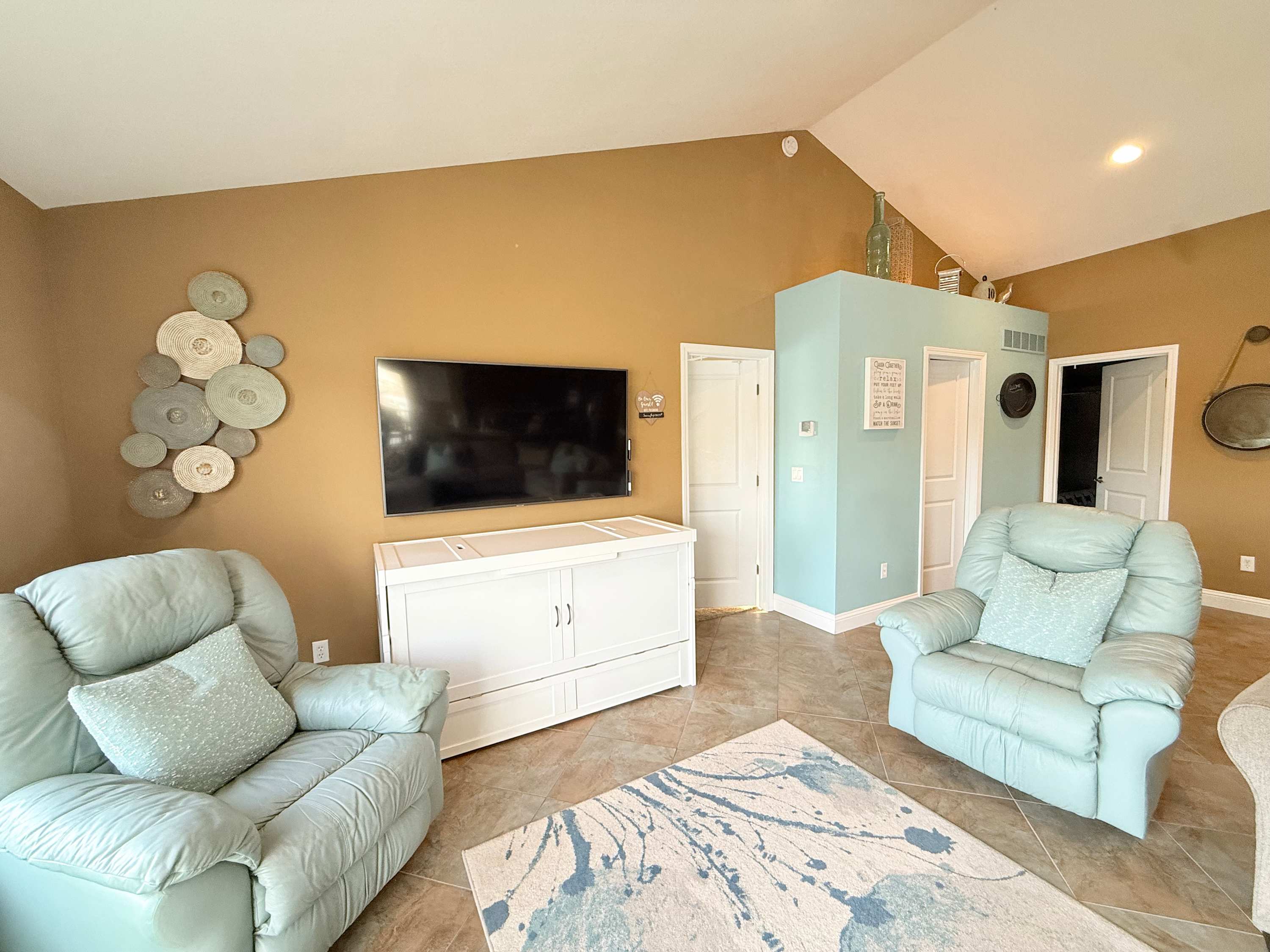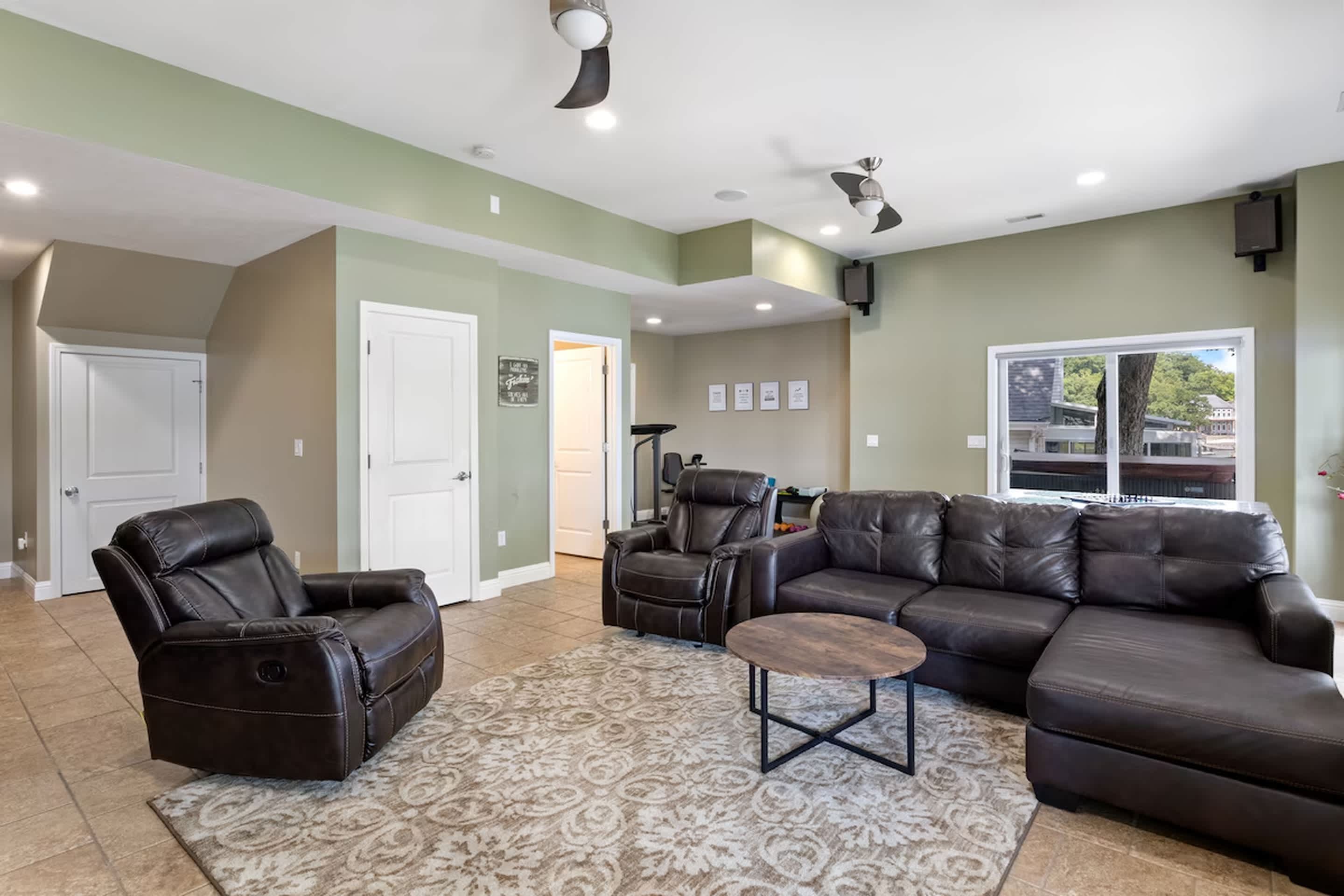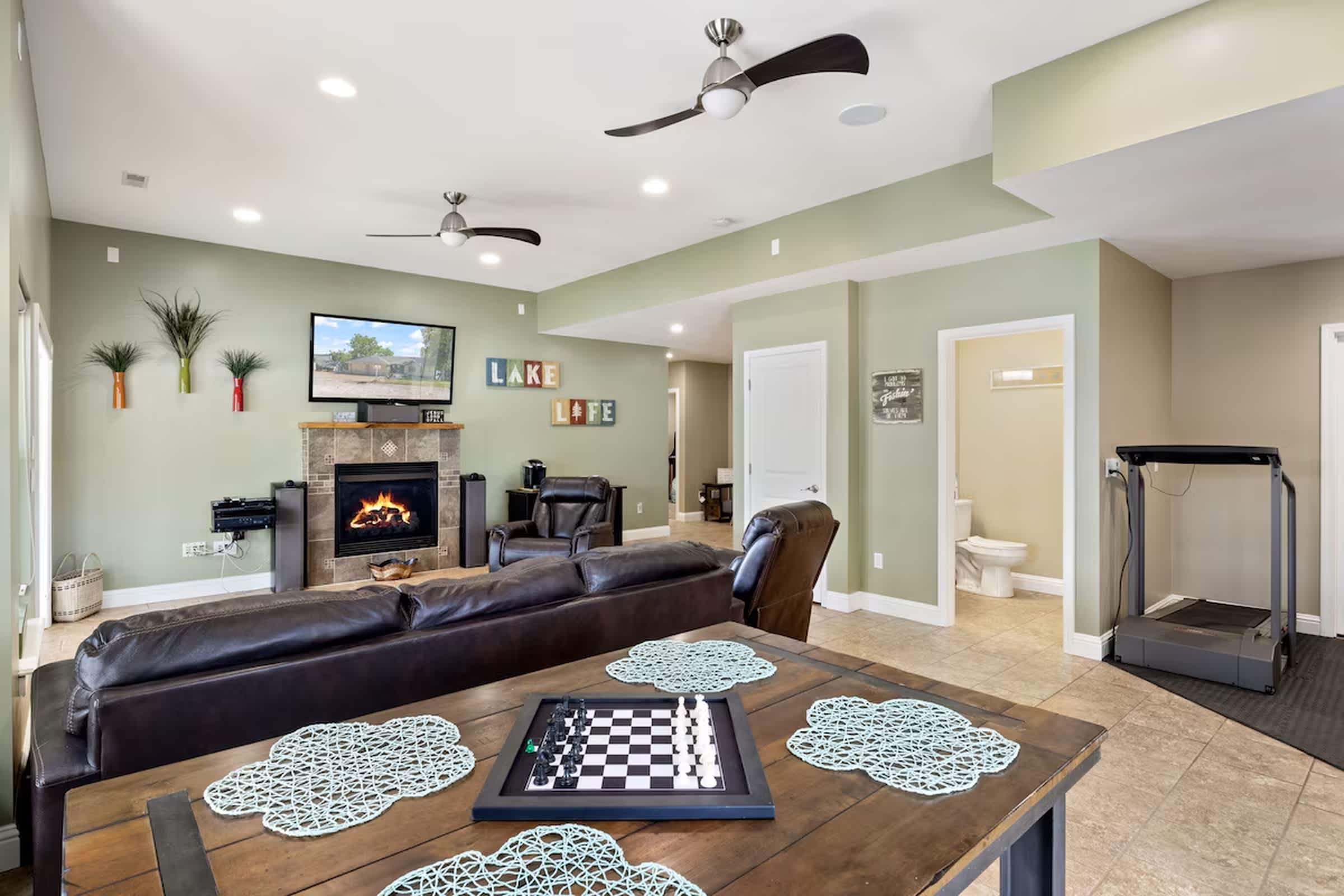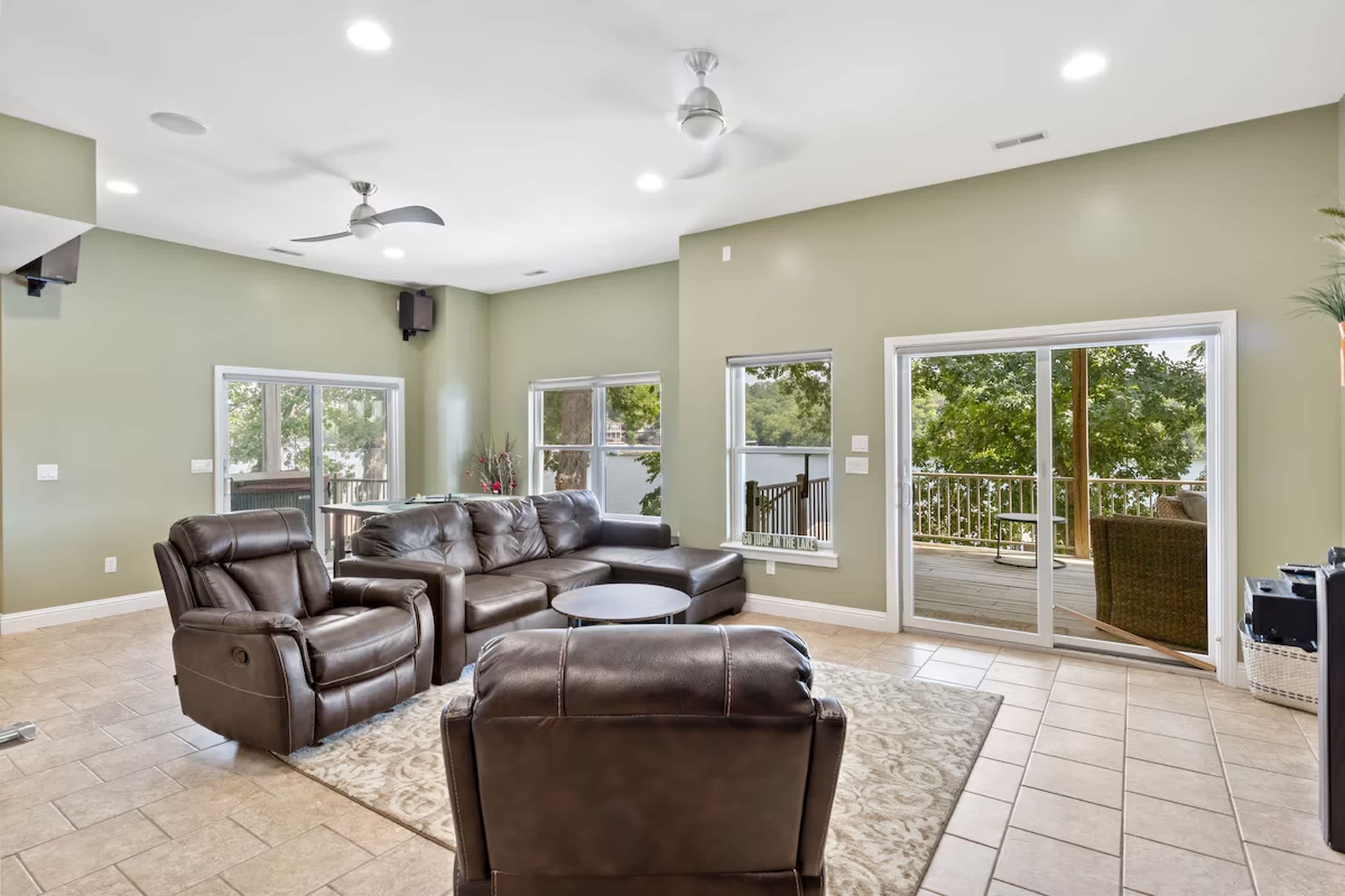 Step inside to an open-concept living, kitchen, and dining space designed for gathering — and enjoy step-free, access-friendly living throughout the entire main level. The main living room features a smart TV, a couch with chaise, two recliners, and a queen Murphy bed, creating a comfortable and versatile space to relax and unwind after a day on the water. The kitchen is both stylish and functional with stainless steel appliances, Keurig and drip coffee makers, and is fully equipped with all the appliances and tools you need for easy meals at home. Counter seating for six and a nearby dining table for six make it perfect for shared meals and game nights. Downstairs, a cozy lower-level living room offers its own smart TV, a comfortable couch with a queen sleeper, and two recliners—plus a dedicated fitness area and a table perfect for game nights—providing plenty of space for everyone to spread out, stay active, and relax.
