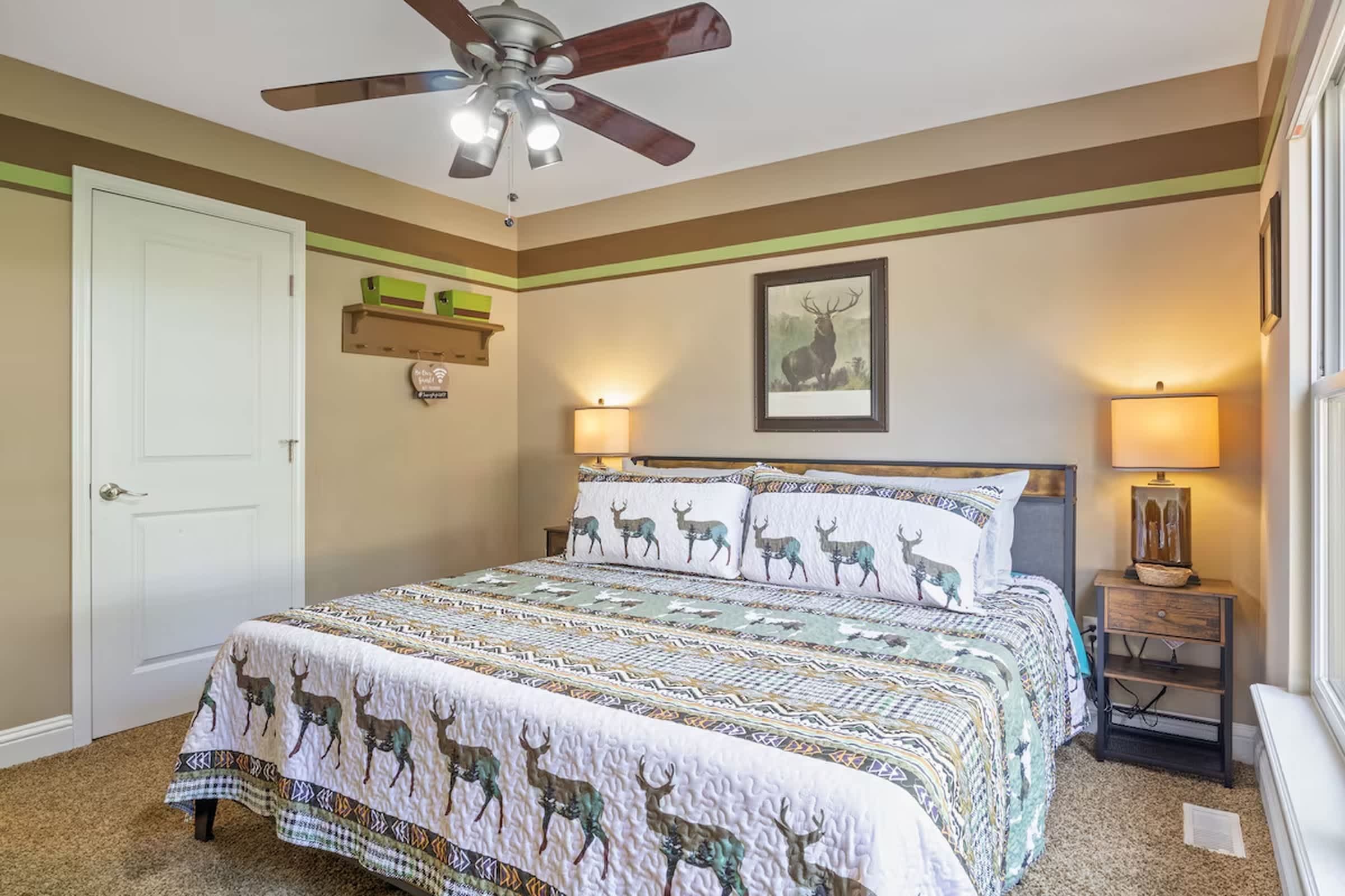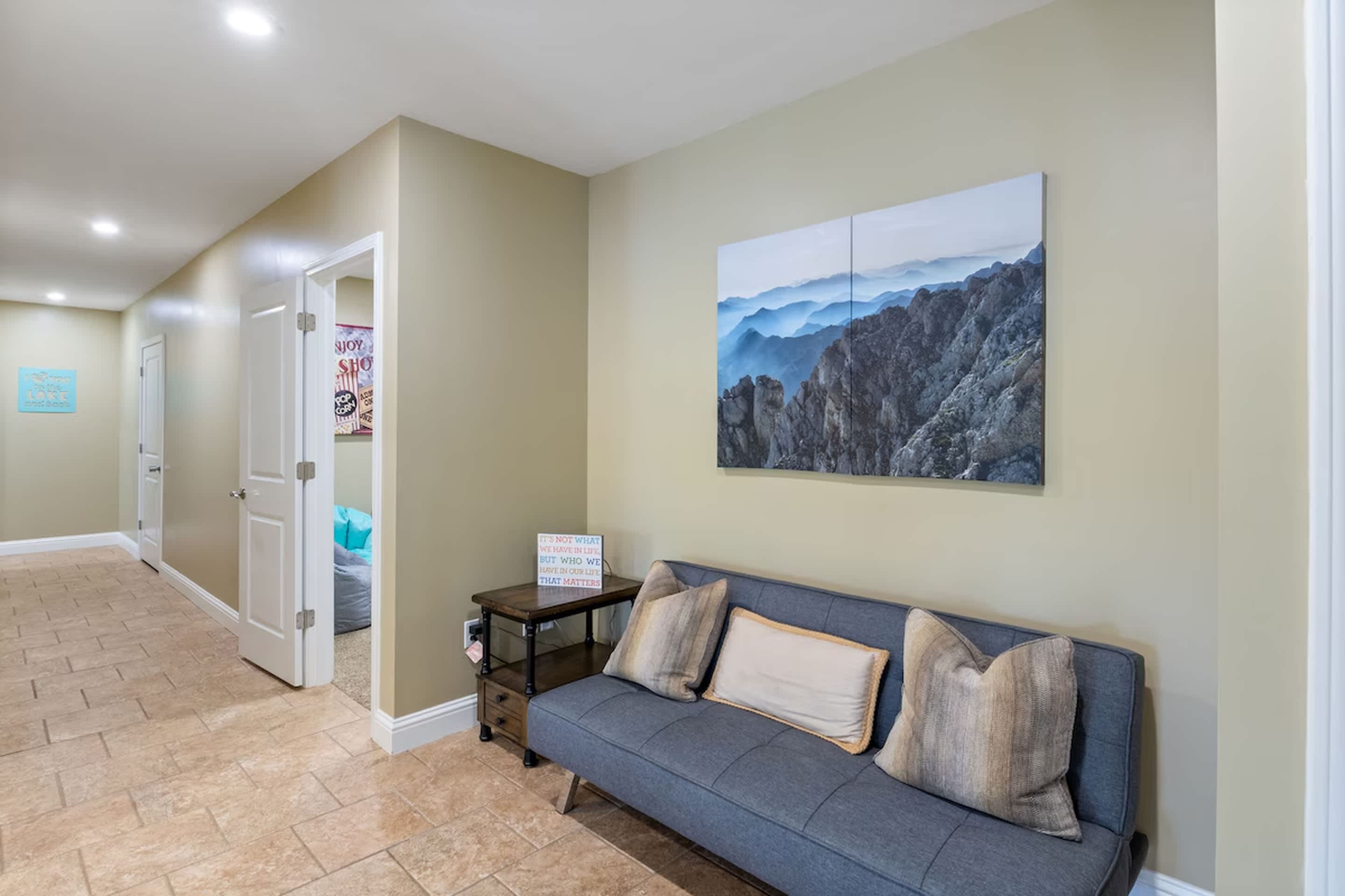 This home comfortably sleeps 18 guests between 4 private bedrooms, a queen size murphy bed in the upstairs living room, and a queen size sleeper sofa in the downstairs living room.