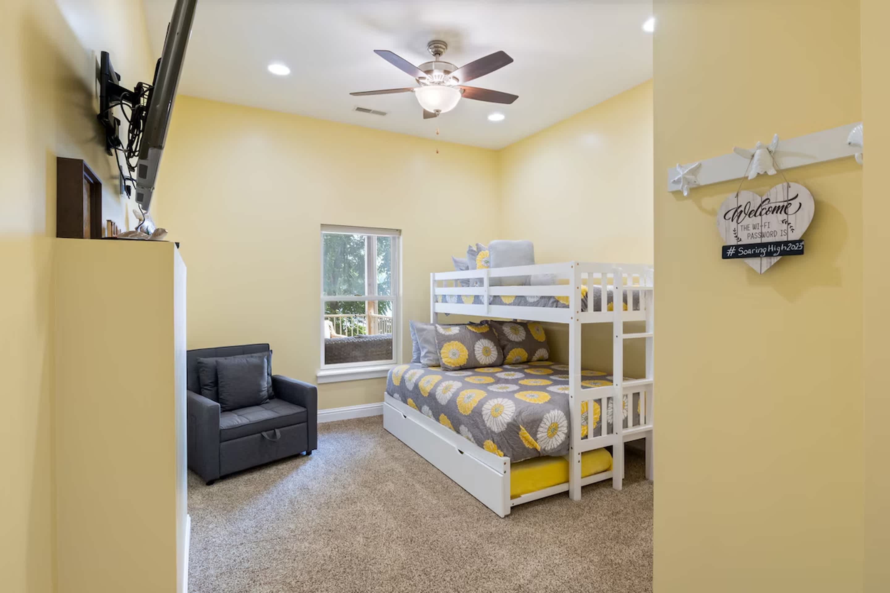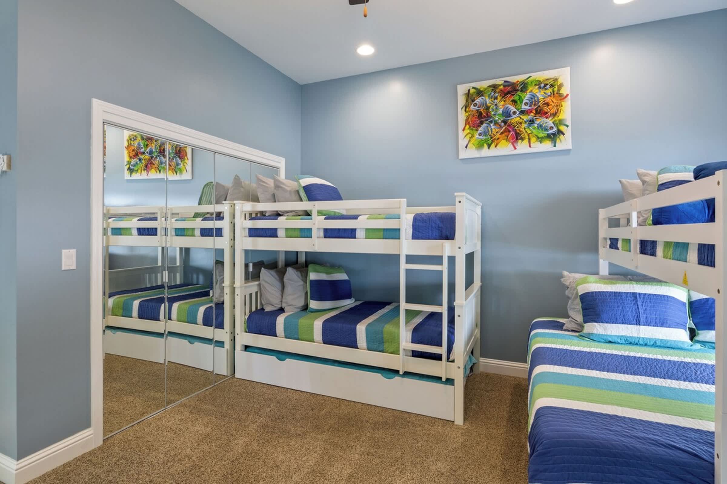 Bedroom #4 includes a set of twin-over-queen size bunk beds, a set of twin-over-twin size bunk beds, a twin size trundle bed, a smart TV, and a Jack-and-Jill bathroom shared with Bedroom #4.
