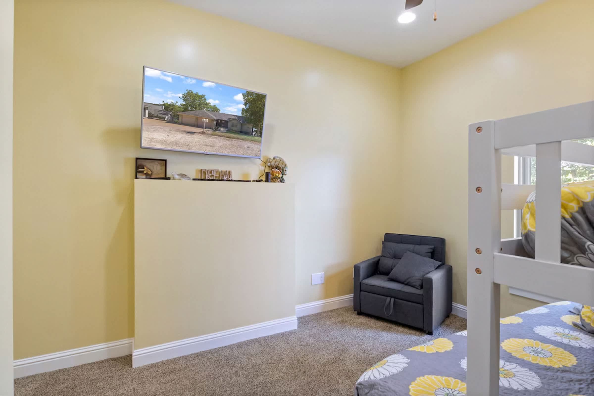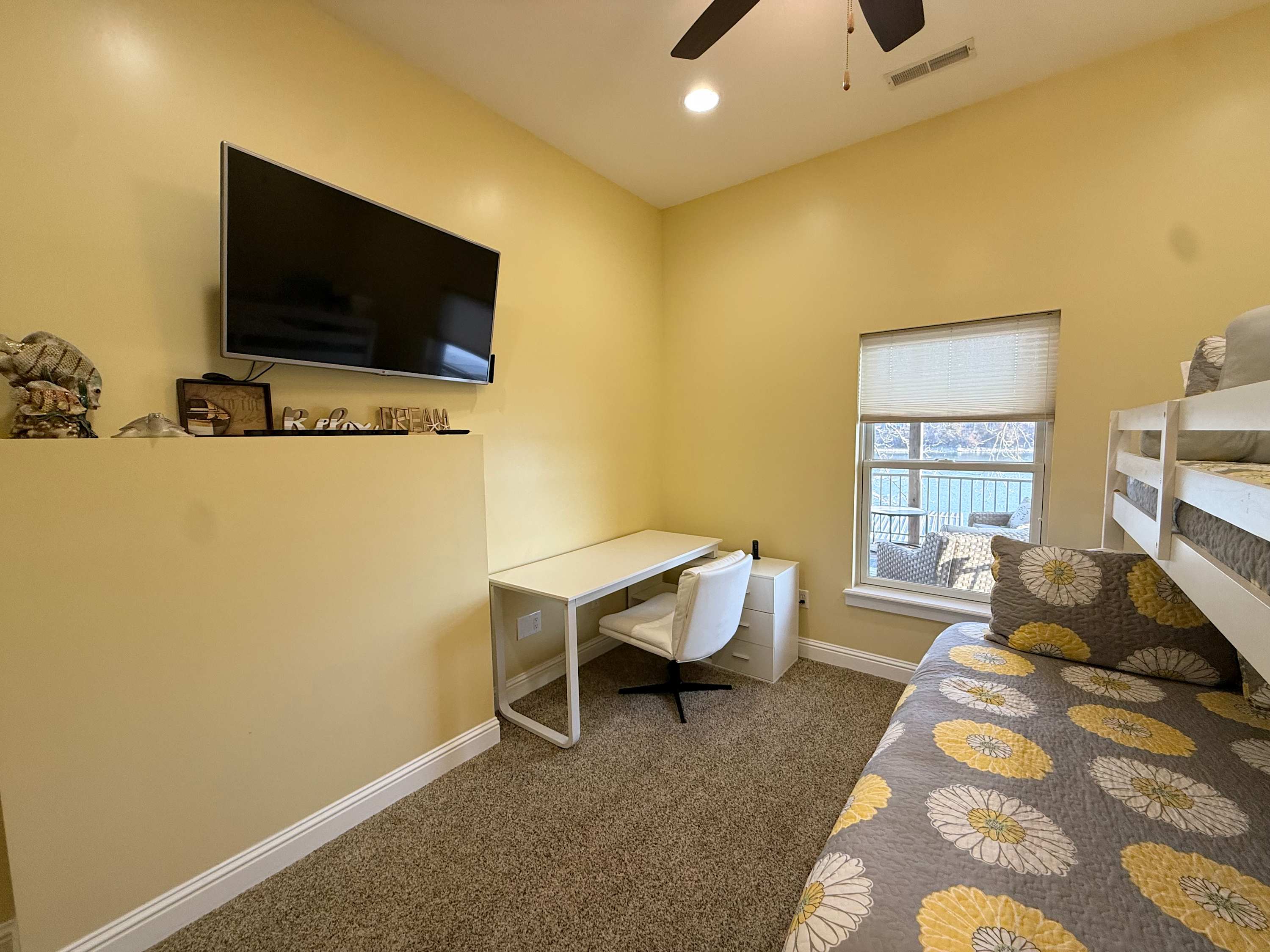 Bedroom #3 includes a set of twin-over-queen size bunk beds, a twin size trundle bed, a smart TV, a desk and a Jack-and-Jill bathroom with two separate single vanities and a shower/tub combo, shared with Bedroom #4.