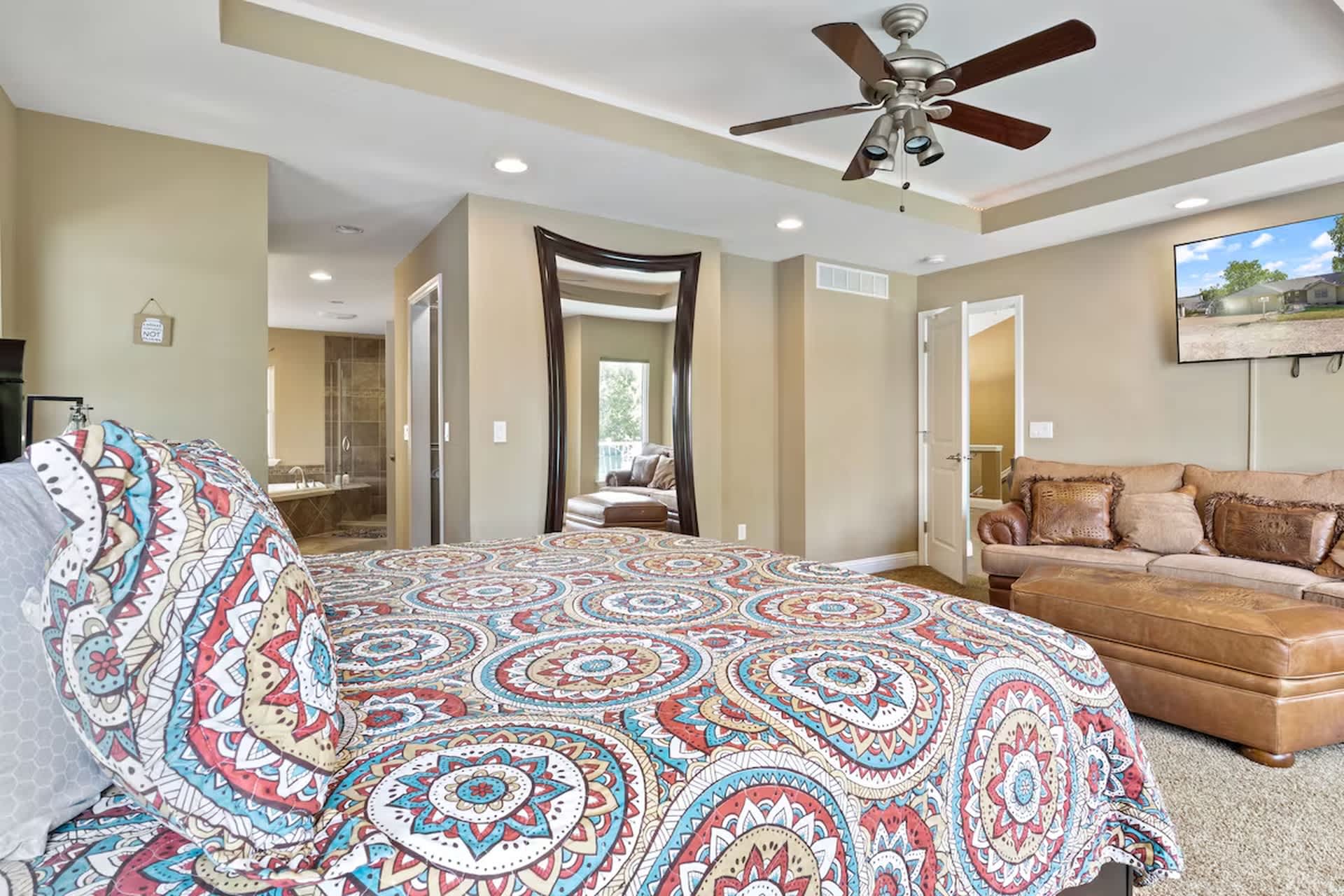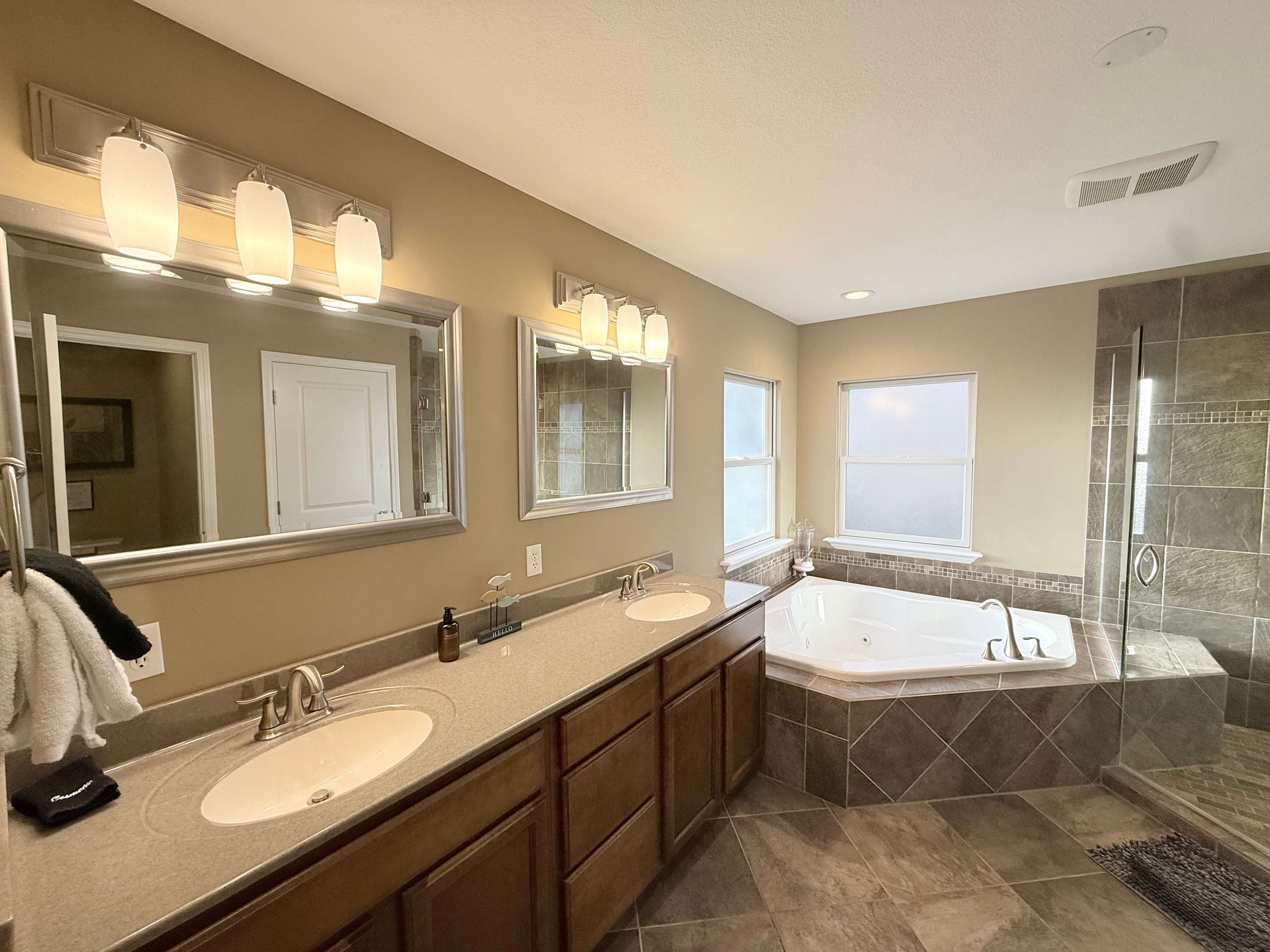 Bedroom #1 includes a king size bed, a smart TV, and an ensuite bathroom with a dual vanity, a jetted tub, and a walk-in shower.
