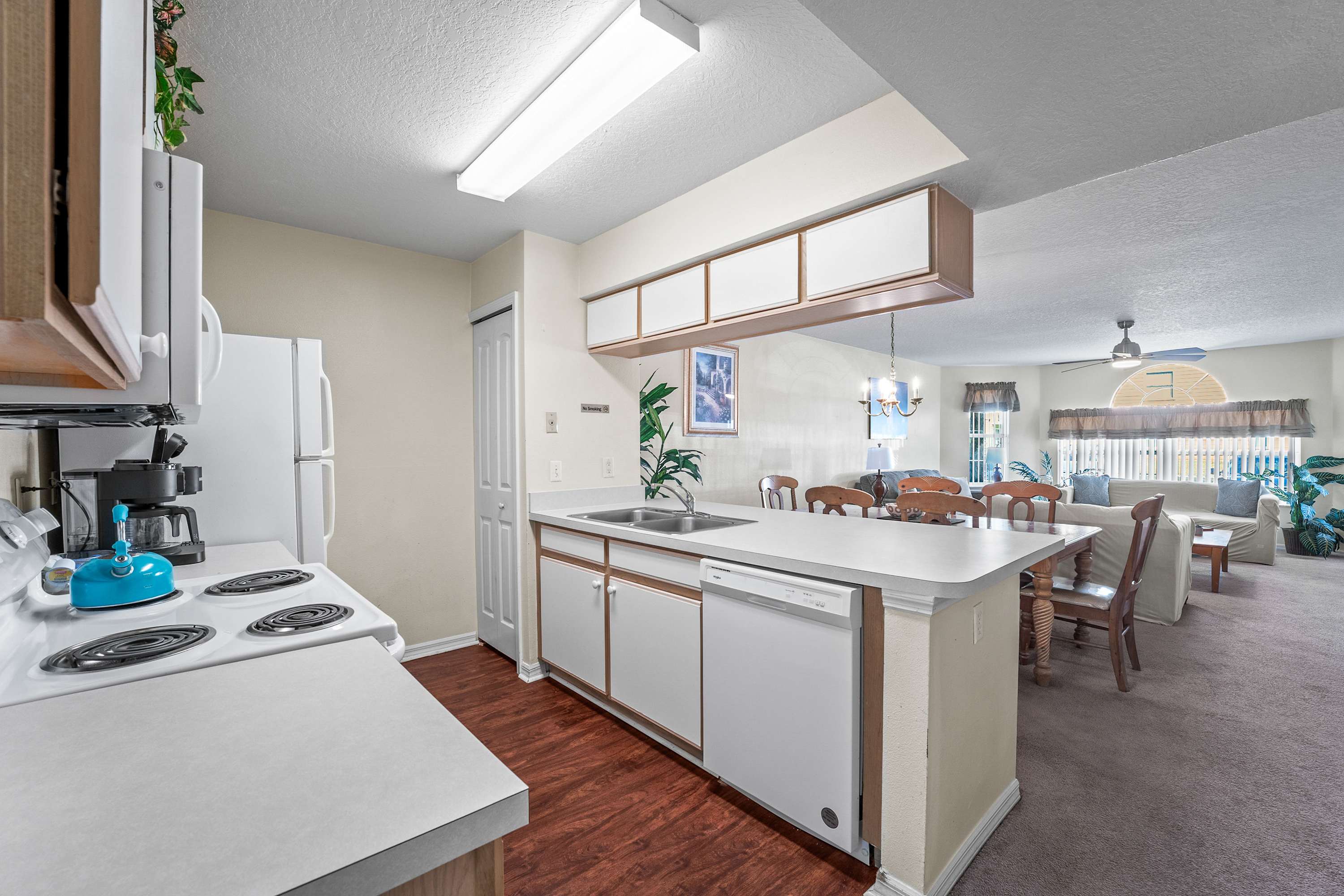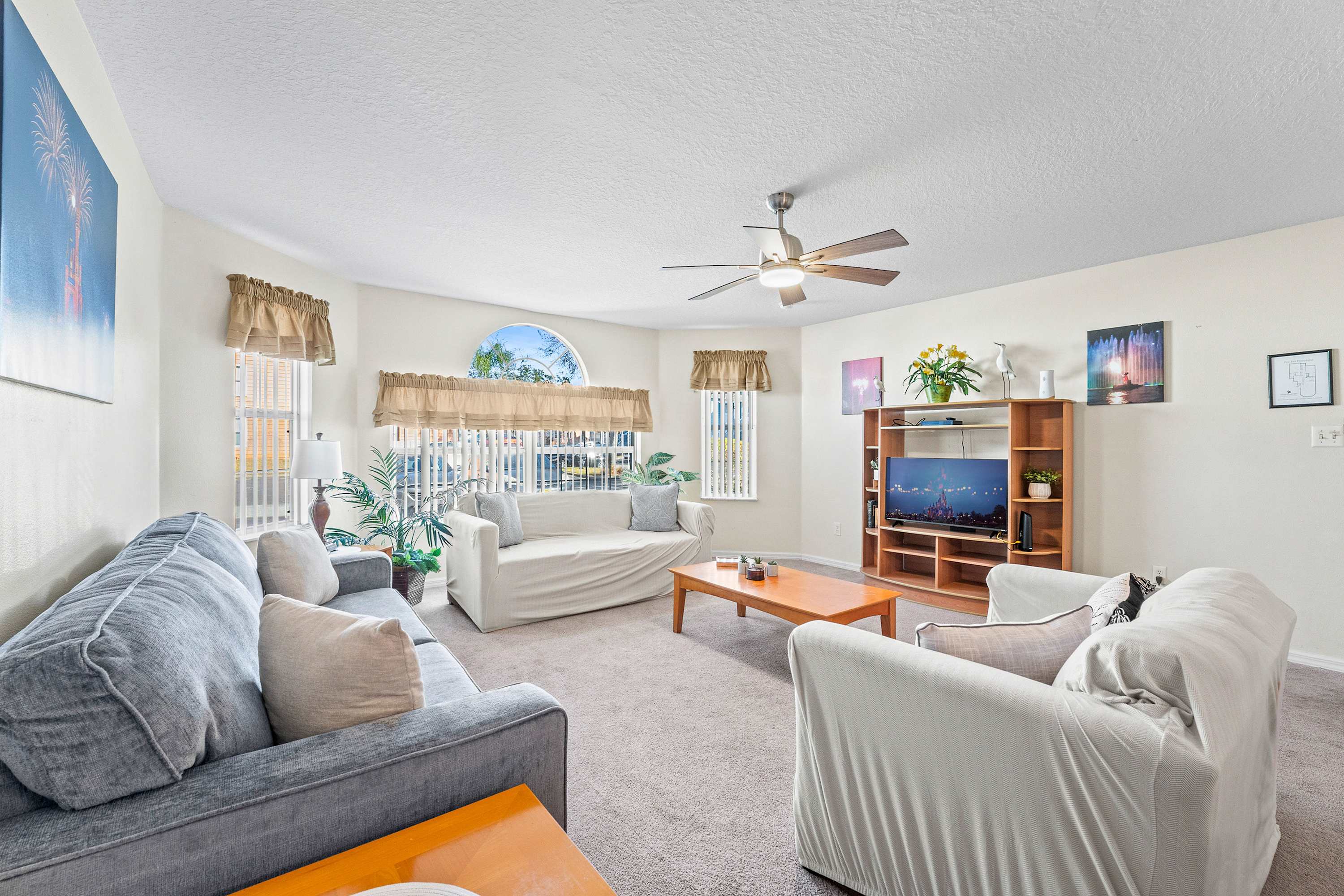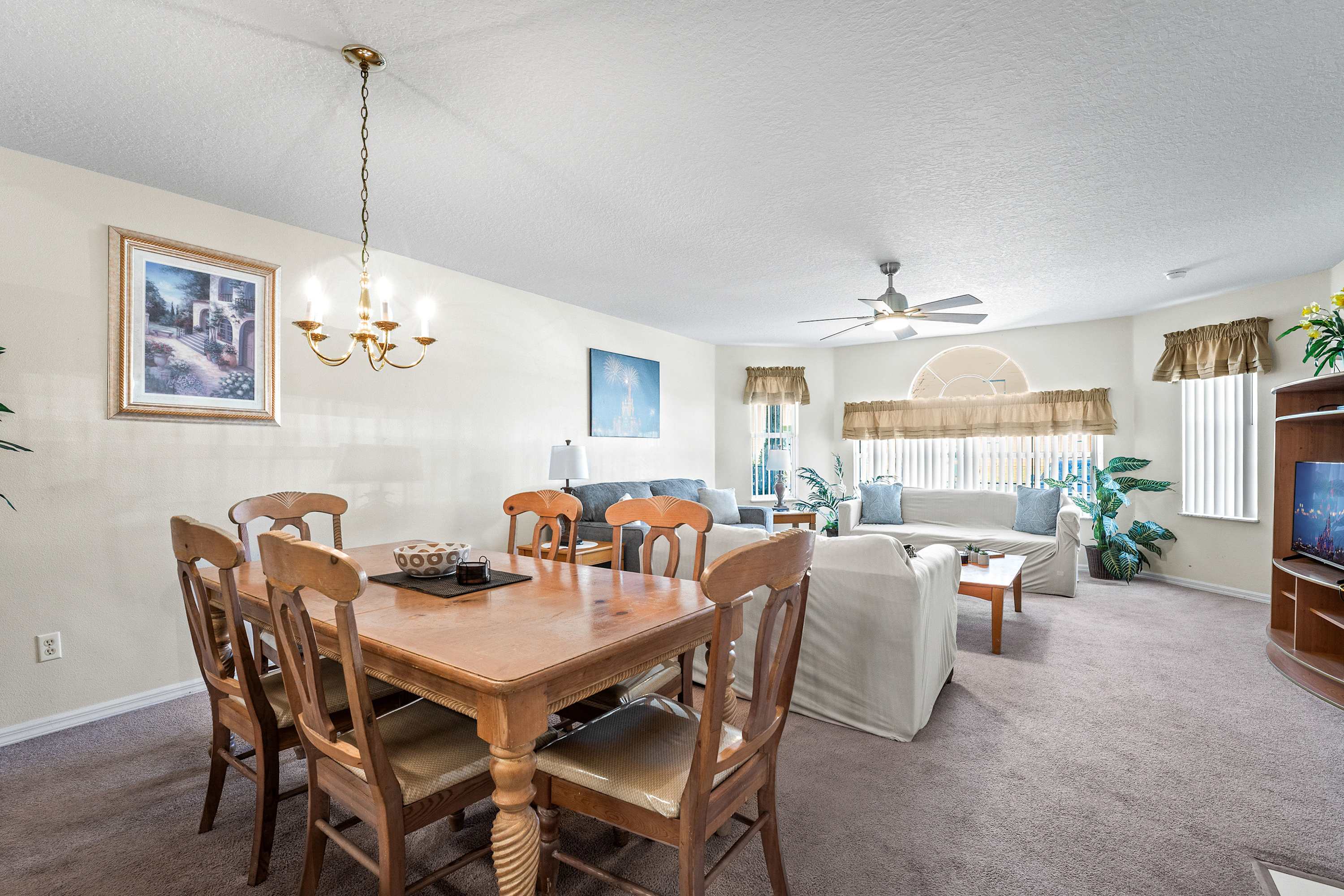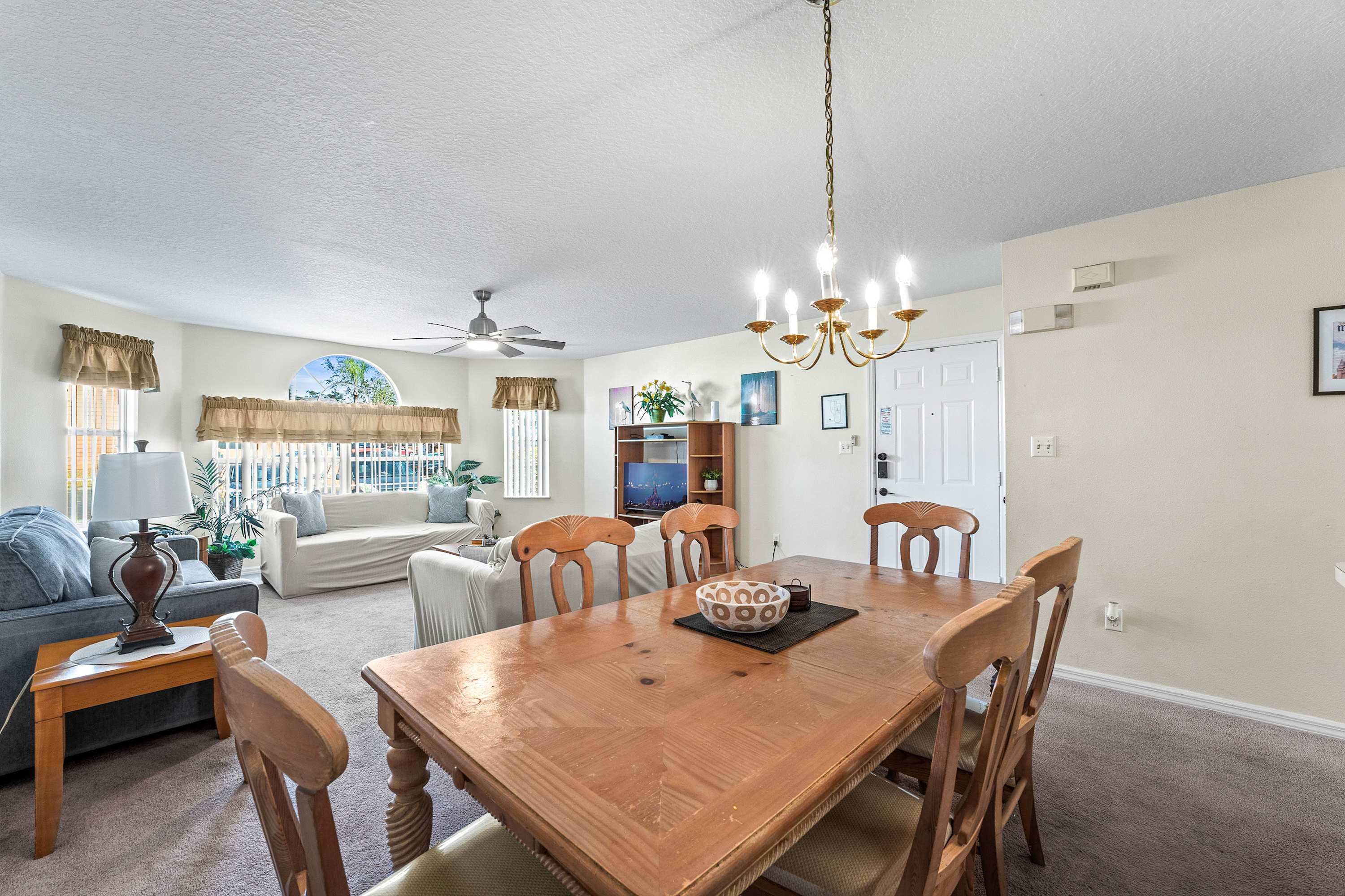 Welcome inside to a bright, comfortable living space filled with natural light from large windows, inviting you to relax on two plush sofas while enjoying your favorite shows on the smart TV. The open layout flows effortlessly into the fully equipped kitchen, complete with a Keurig to start your mornings right and everything you need to prepare meals with ease. Just beyond, the dining area with seating for six is ideal for family dinners, game nights, or planning your next park day.