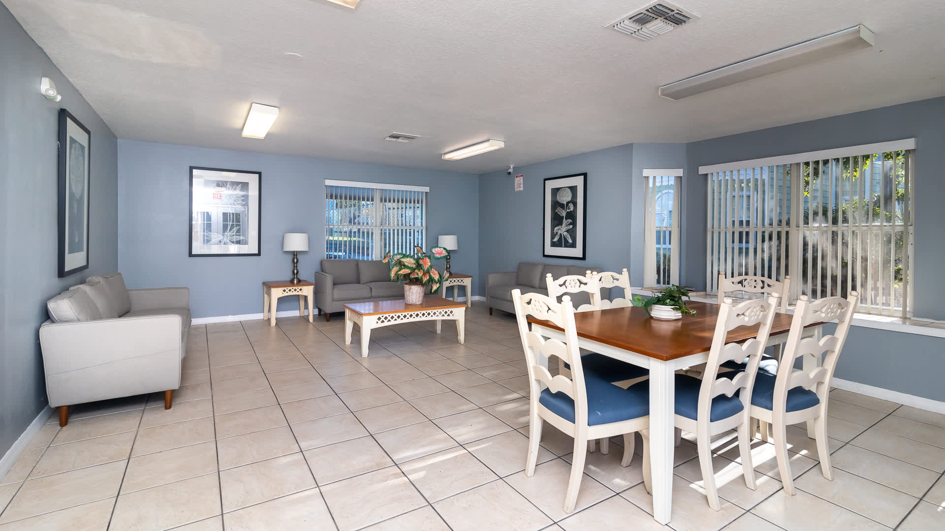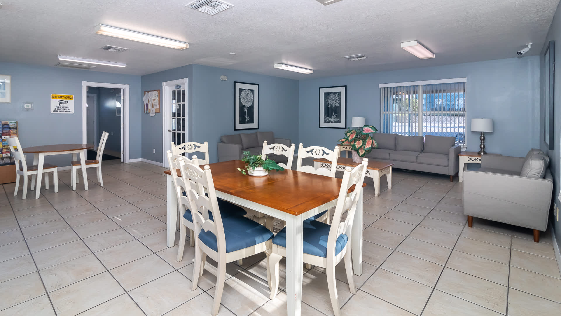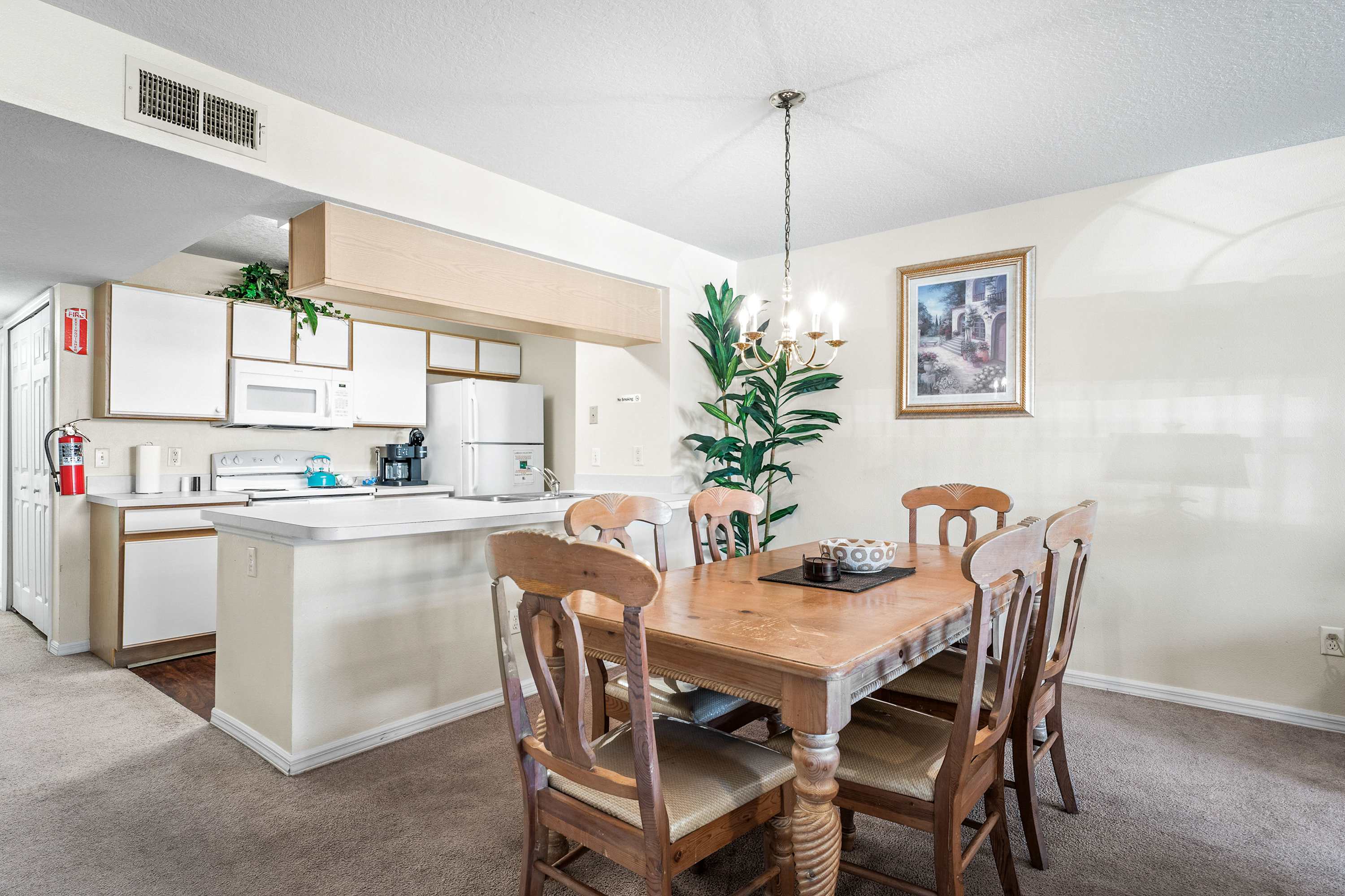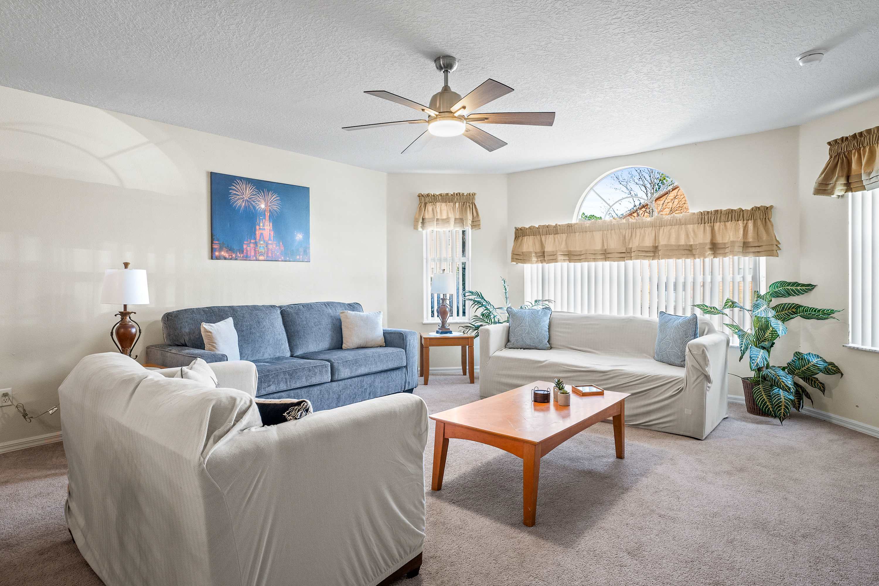 Welcome inside to a bright, comfortable living space filled with natural light from large windows, inviting you to relax on two plush sofas while enjoying your favorite shows on the smart TV. The open layout flows effortlessly into the fully equipped kitchen, complete with a Keurig to start your mornings right and everything you need to prepare meals with ease. Just beyond, the dining area with seating for six is ideal for family dinners, game nights, or planning your next park day.