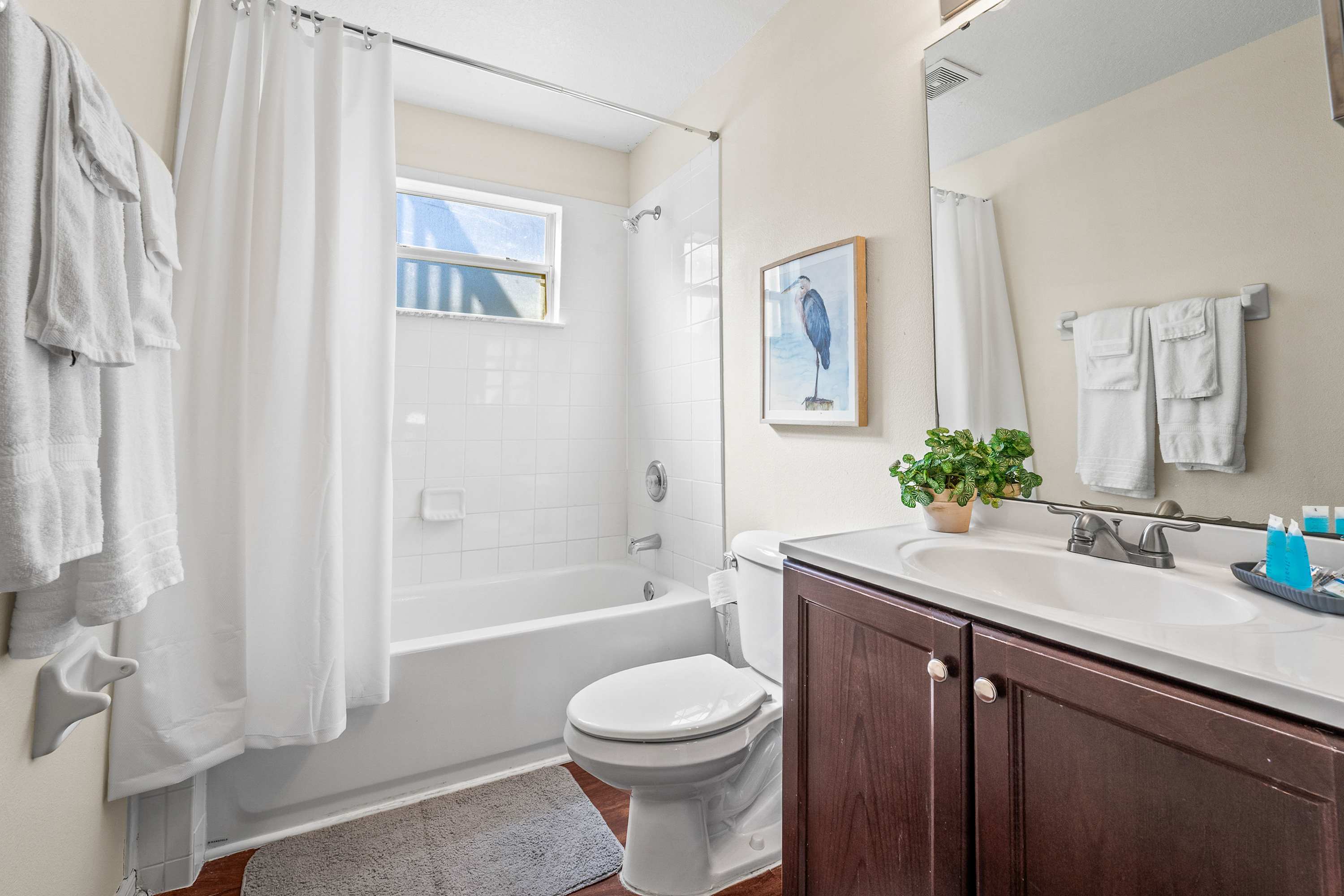 This home also includes an additional full guest bathroom with a single vanity and a shower/tub combo.