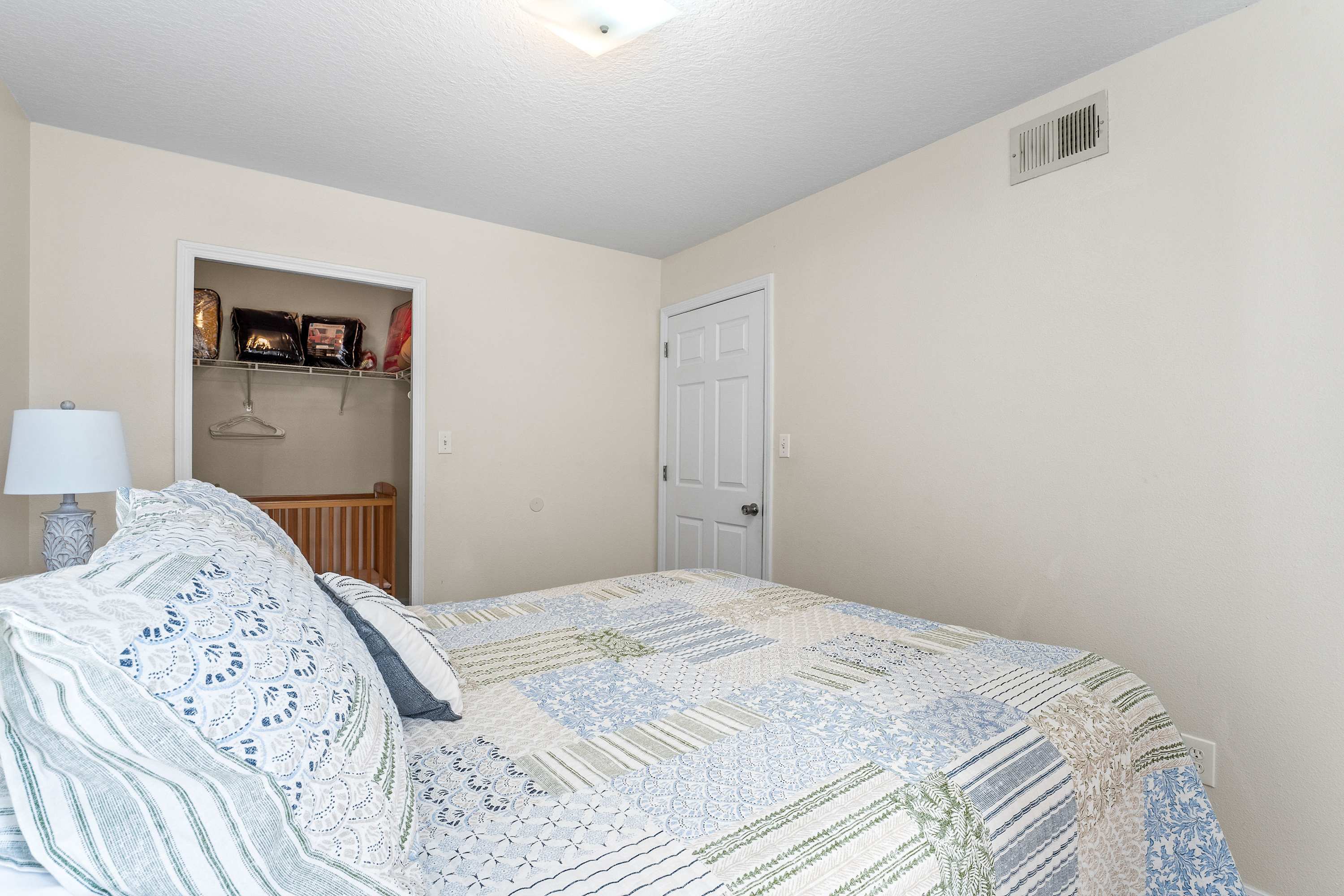 Bedroom #1 includes a queen size bed and a crib.