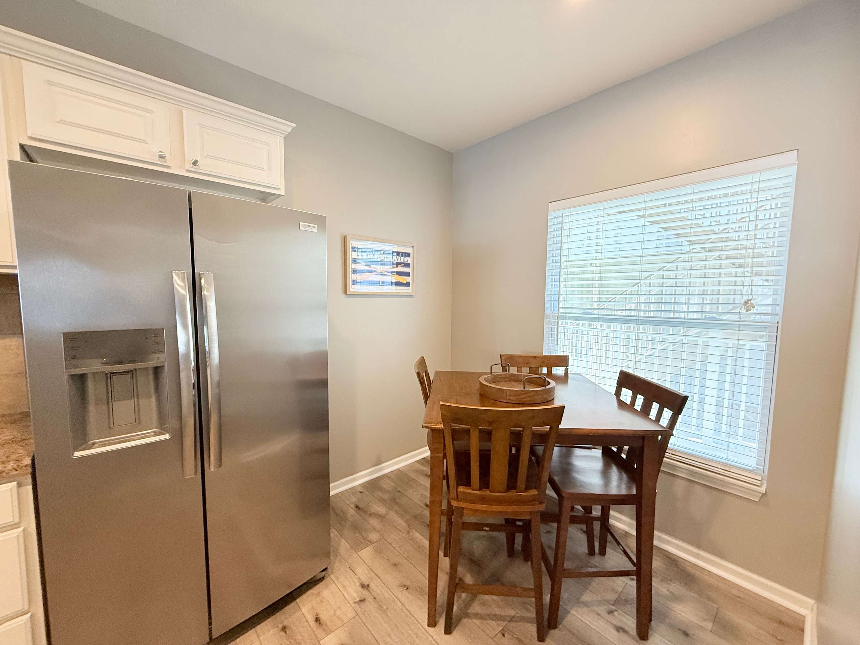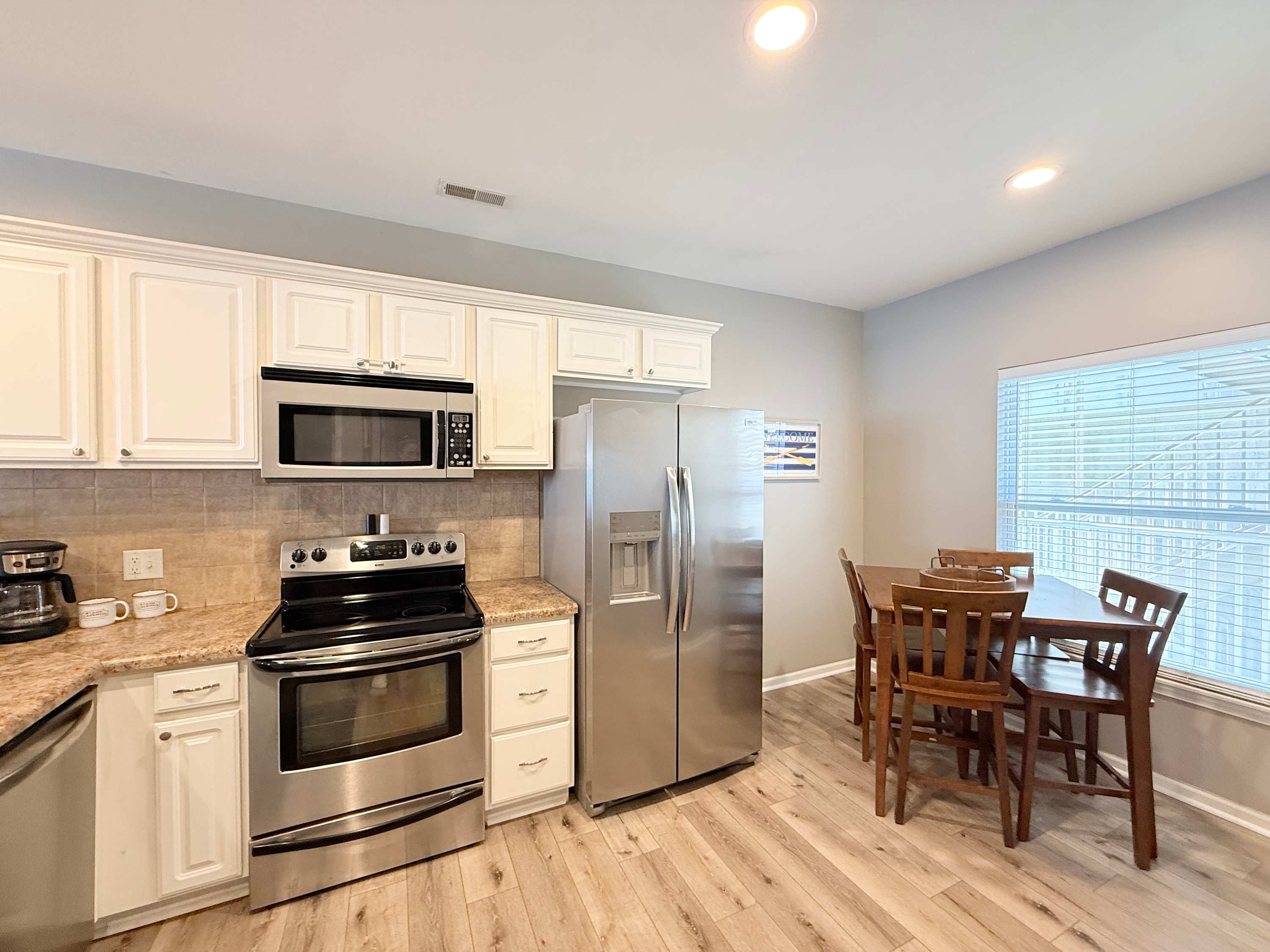 Step inside to a welcoming, well-appointed kitchen designed for easy meals and relaxed mornings. It features stainless steel appliances, counter seating for four, and an eat-in dining table for four, giving you everything you need to dine comfortably at home. The open layout flows seamlessly into the living room, where two couches and an armchair invite you to unwind while watching your favorite shows on the smart TV.
