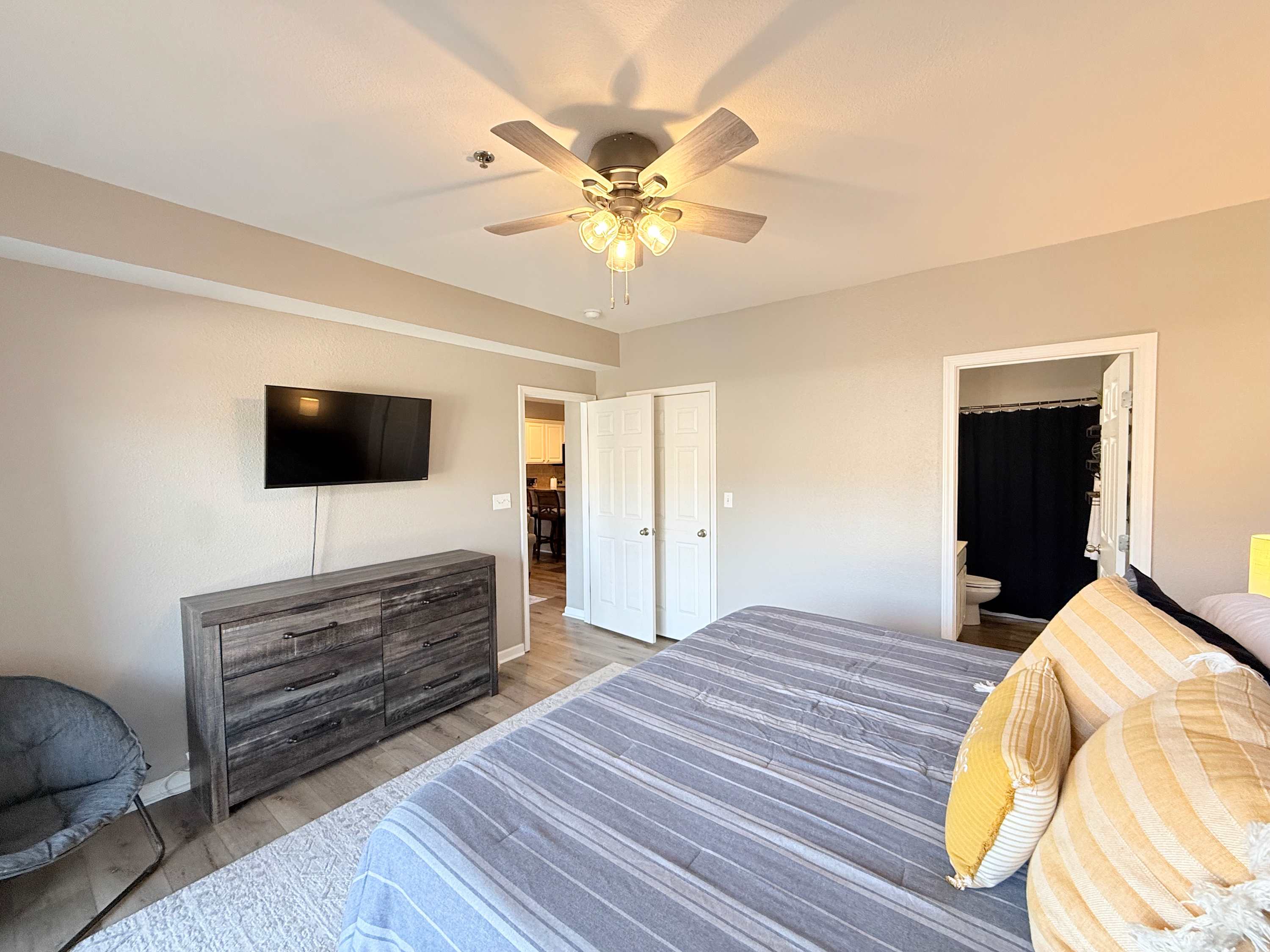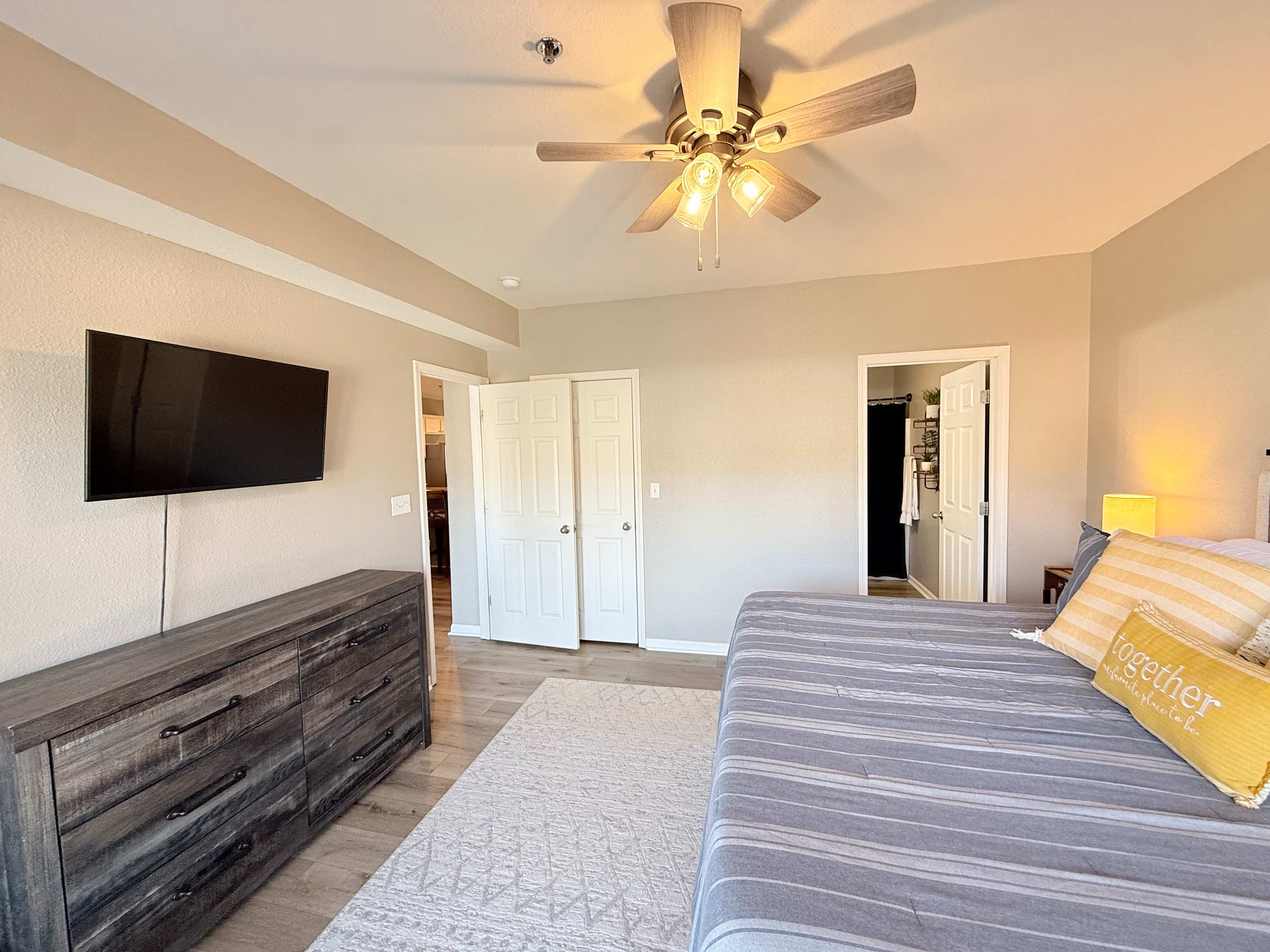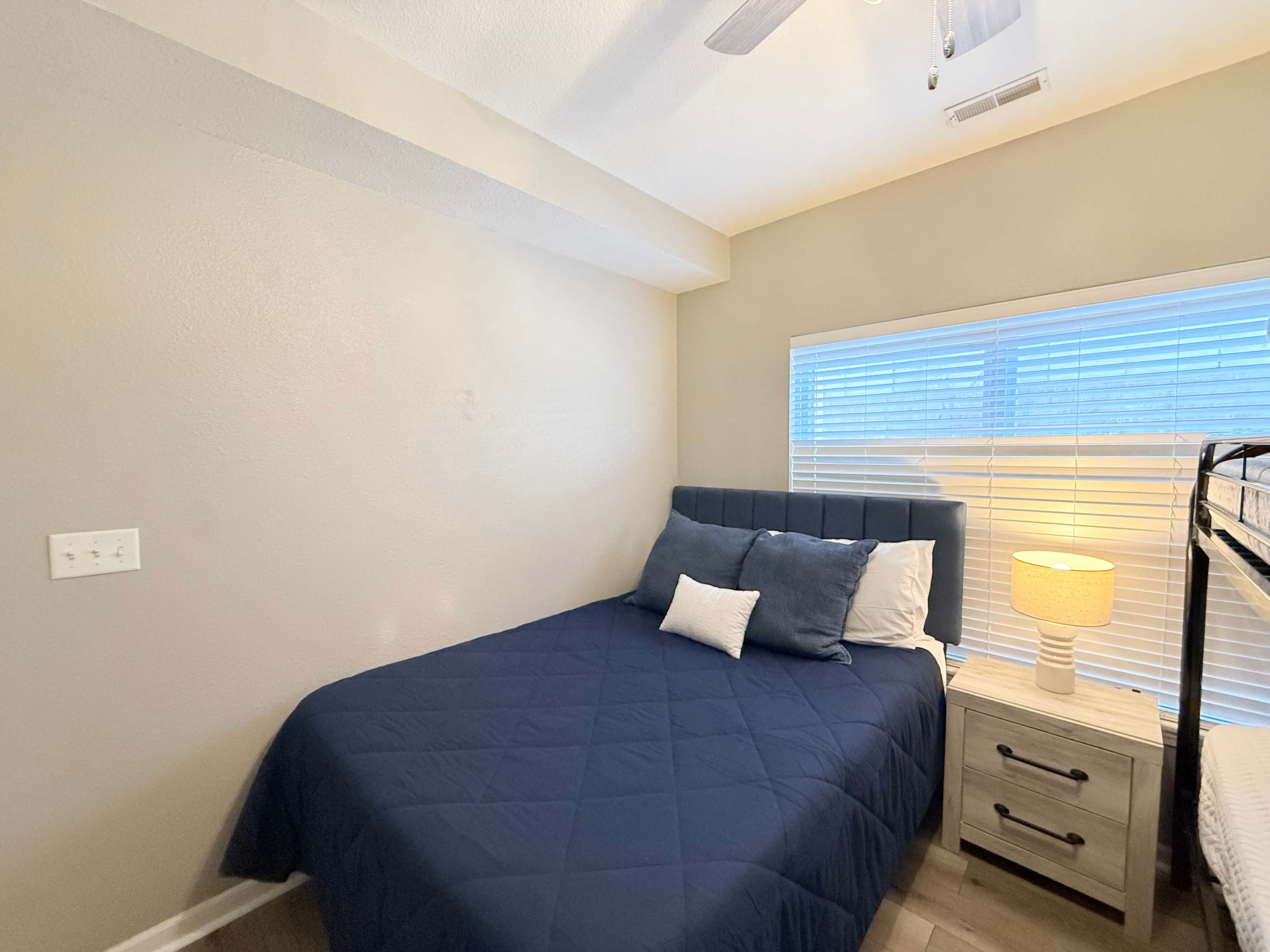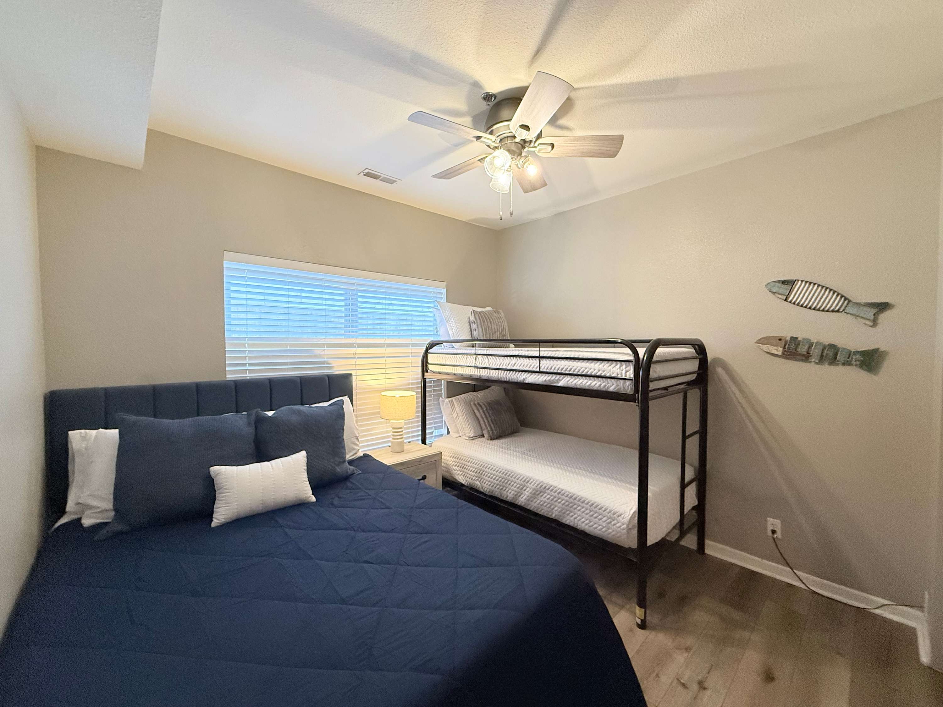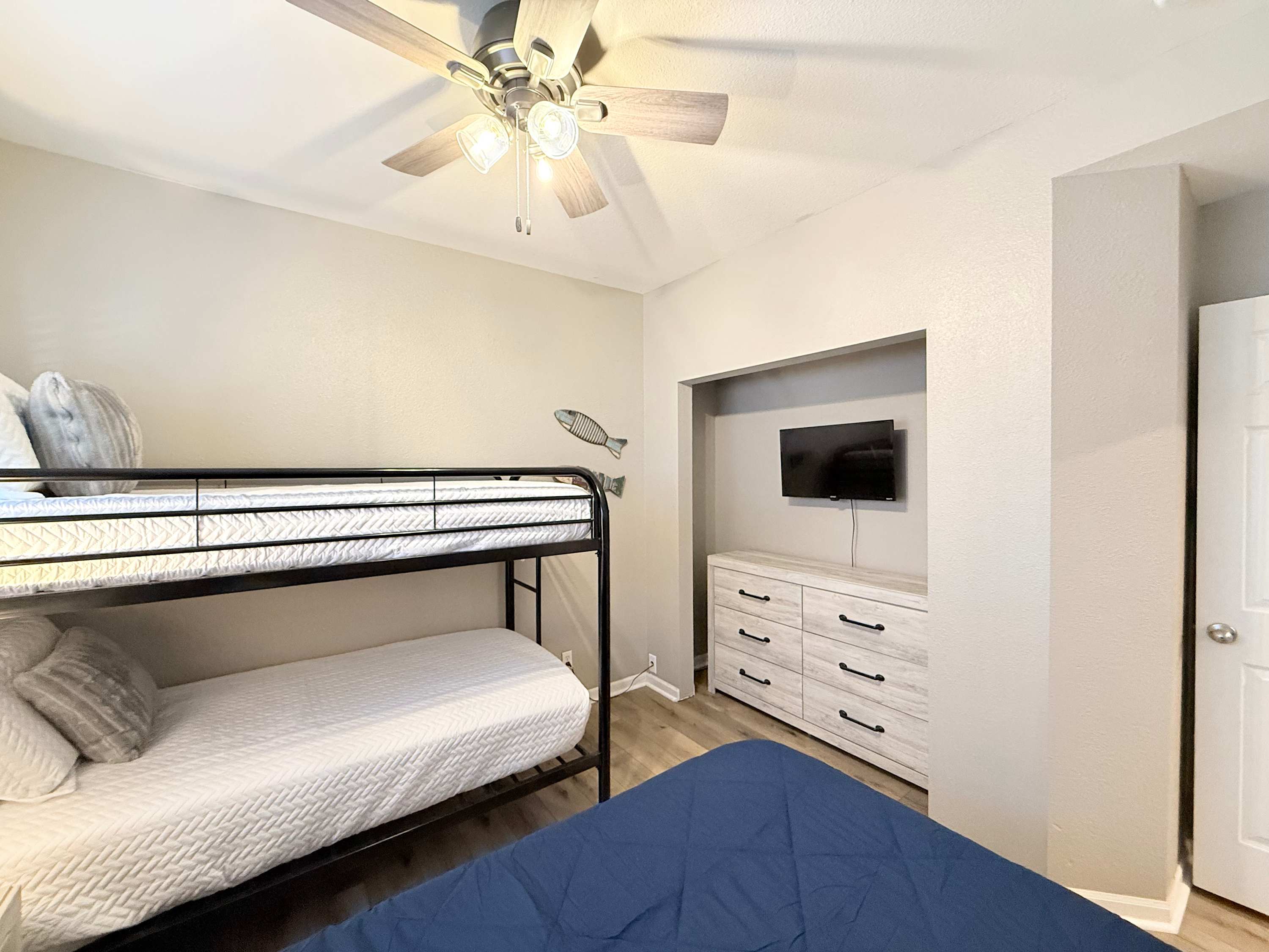 Bedroom #2 includes a set of twin-over-twin bunk beds, a queen size bed, and a smart TV.