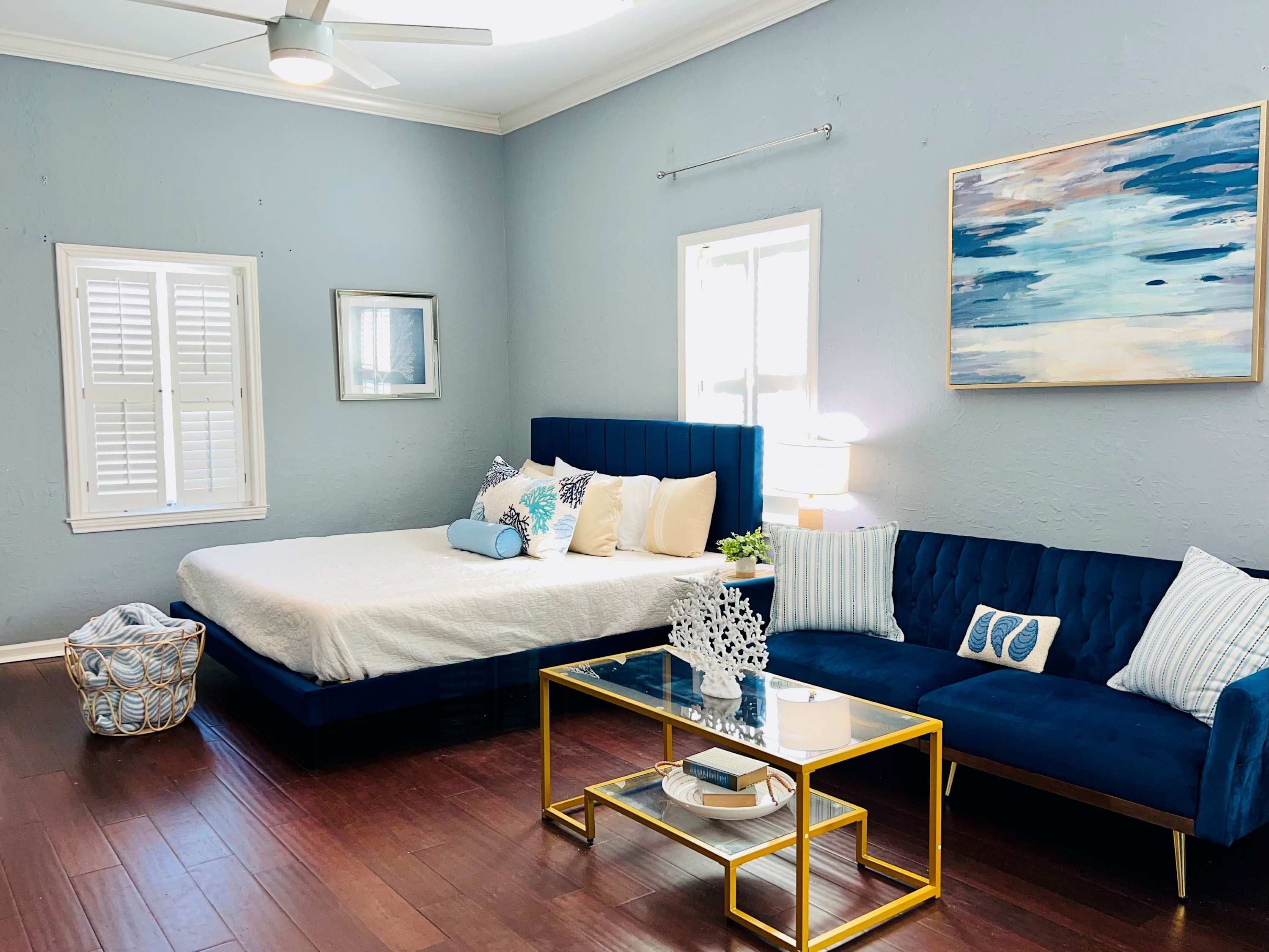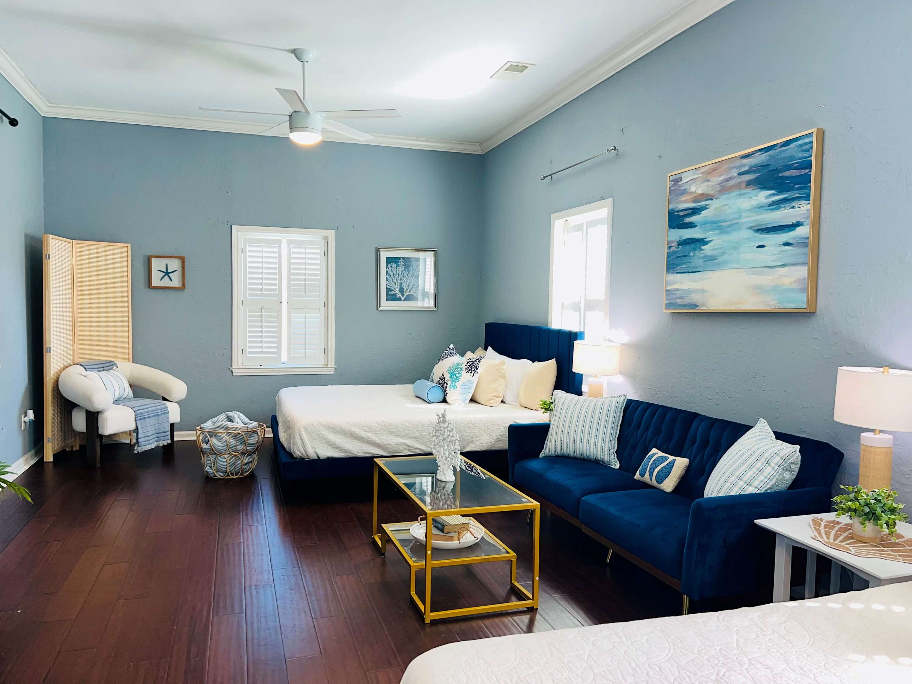 Unit B is a studio unit that comfortably sleeps 5 guests between 2 king size beds and a twin size sleeper sofa.