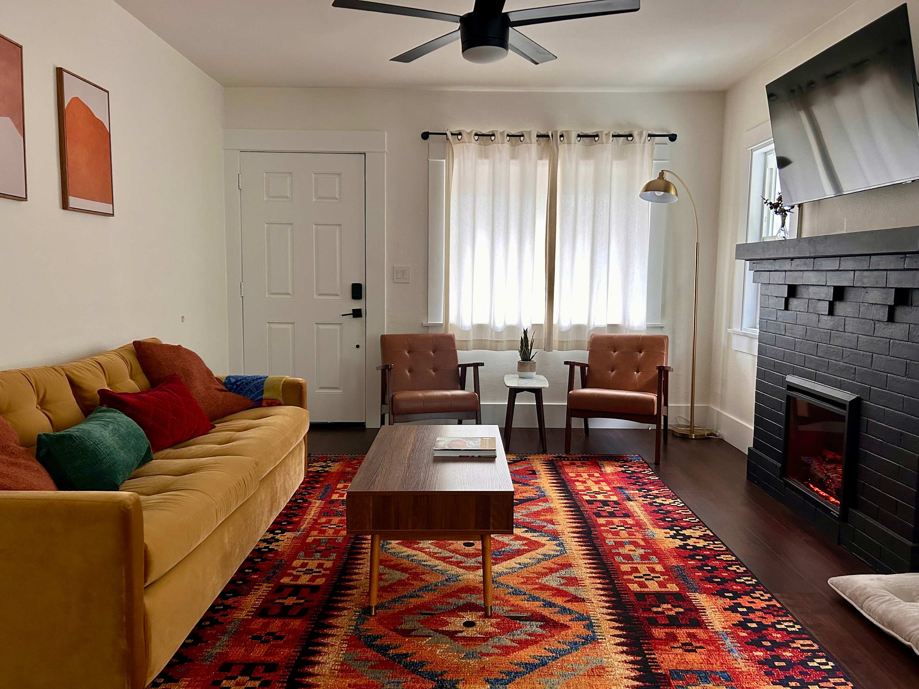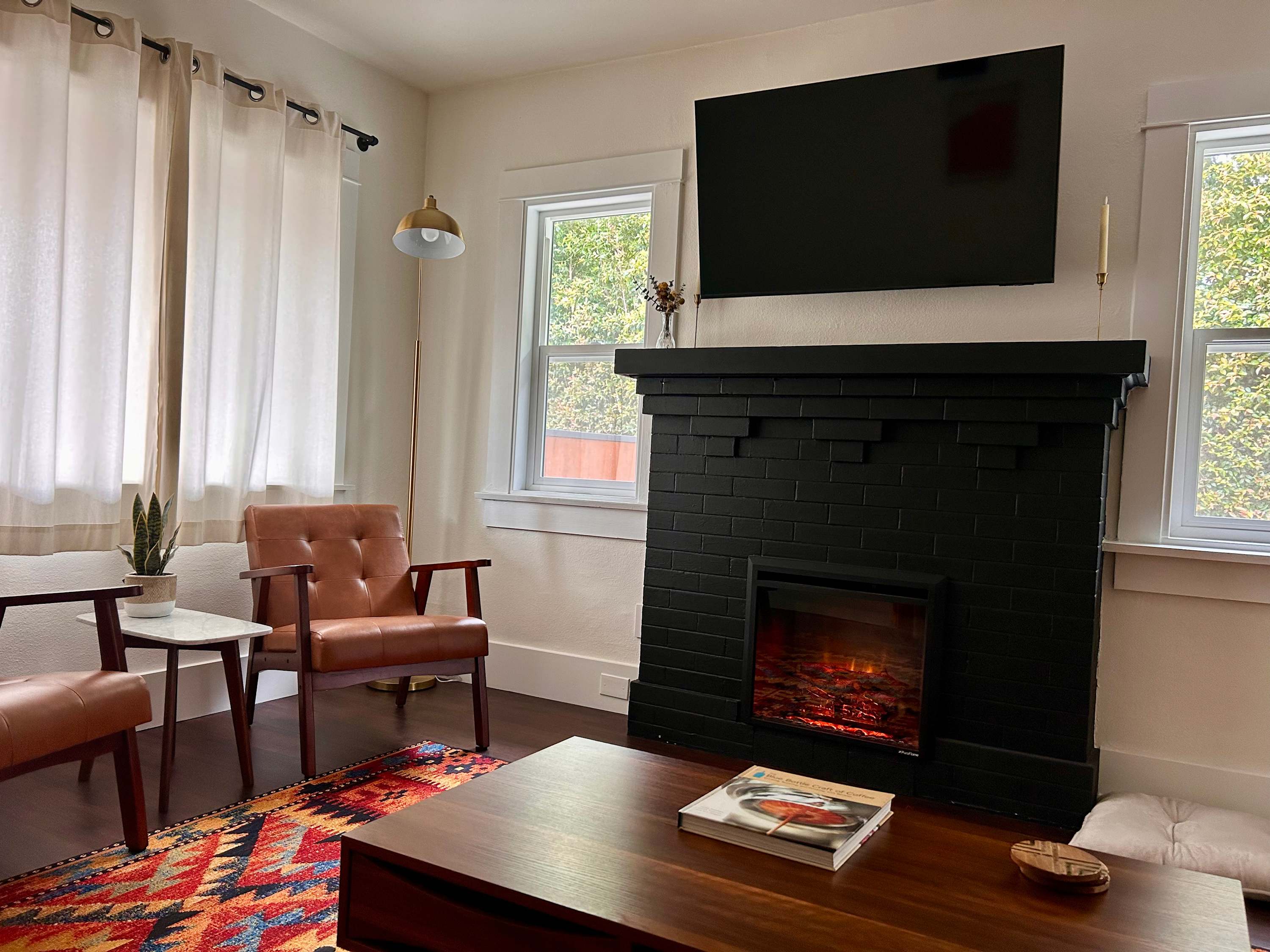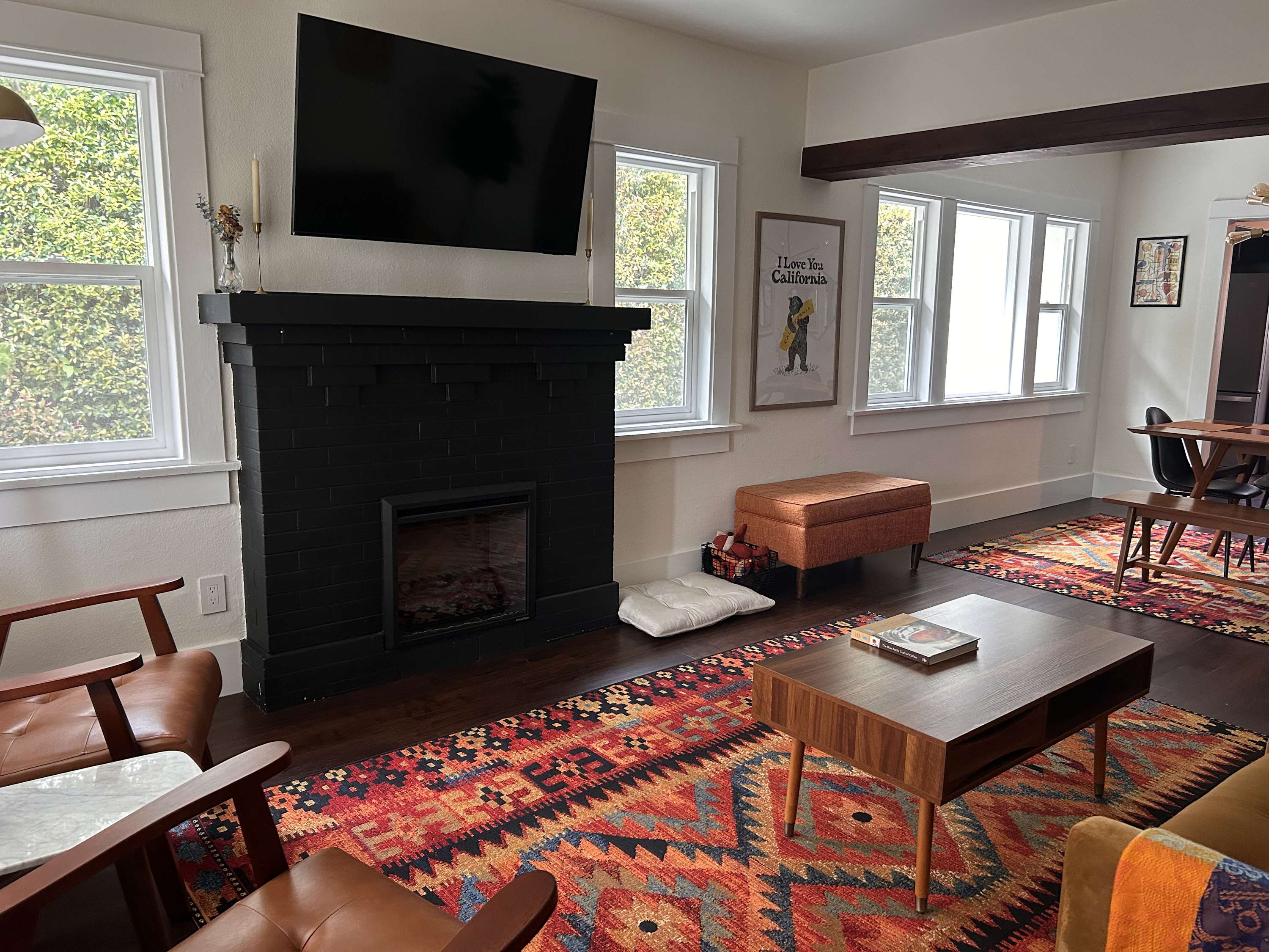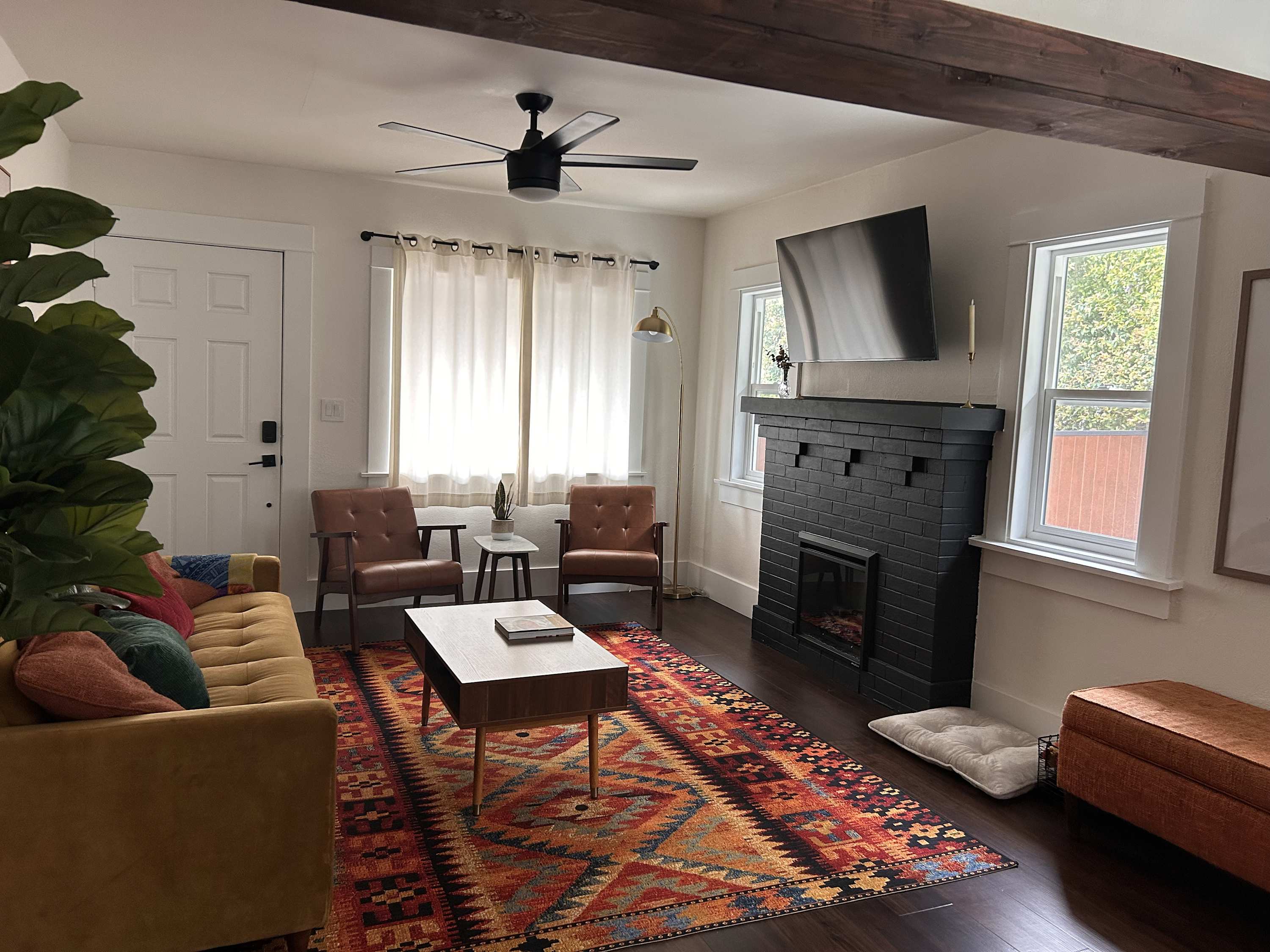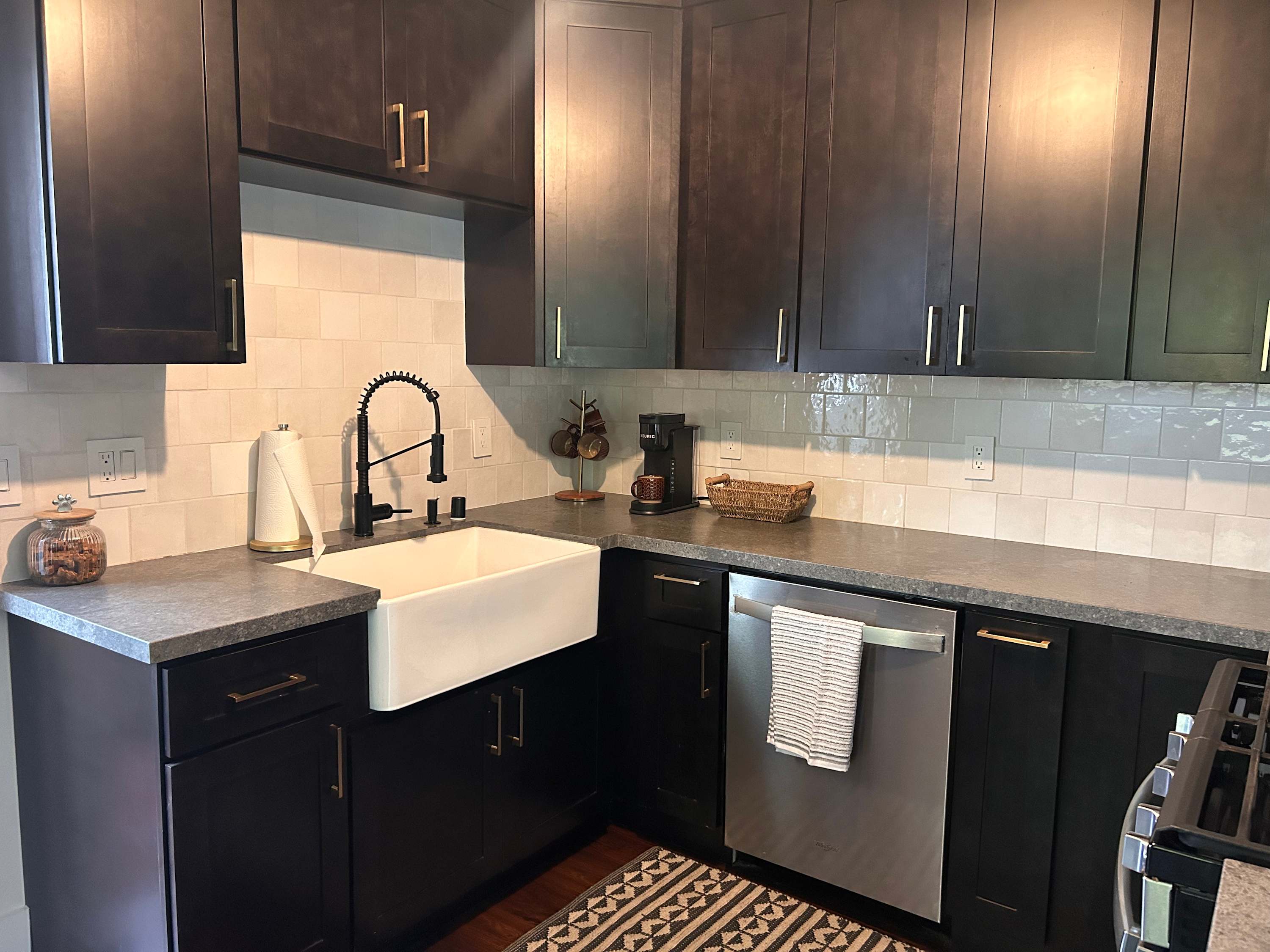 Inside, the charm continues with a cozy yet stylish living room that invites you to slow down. Sink into the couch or chairs, cue up a favorite show on the smart TV, or pull out the board games for a relaxed night in. Just beyond, a dining table for six creates the perfect gathering place for shared meals and laughter. The kitchen blends modern style with everyday convenience. Dark, sleek finishes and stainless steel appliances give it a polished feel, while the Keurig makes mornings effortless. Counter seating for two is perfect for quick breakfasts or evening cocktails, and the wet bar adds an extra touch of fun for entertaining.