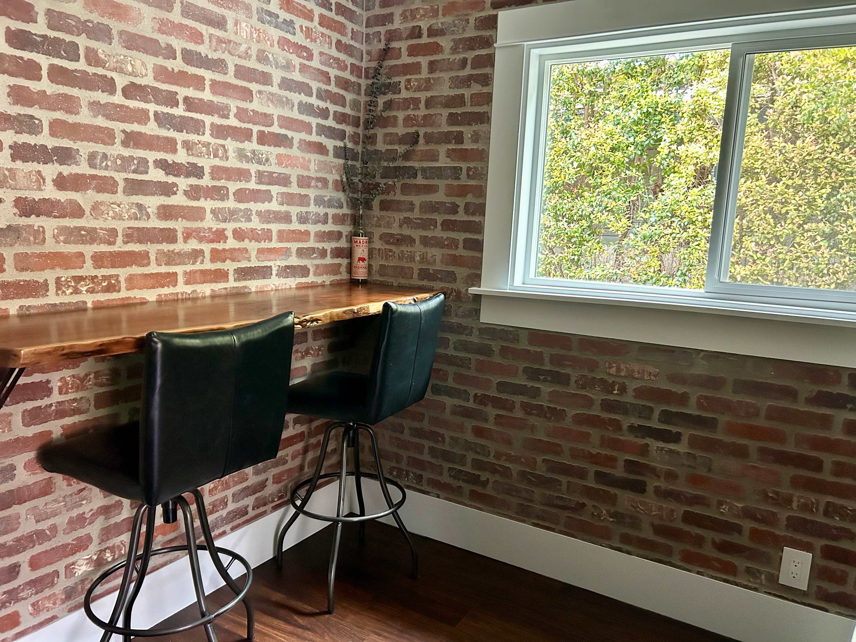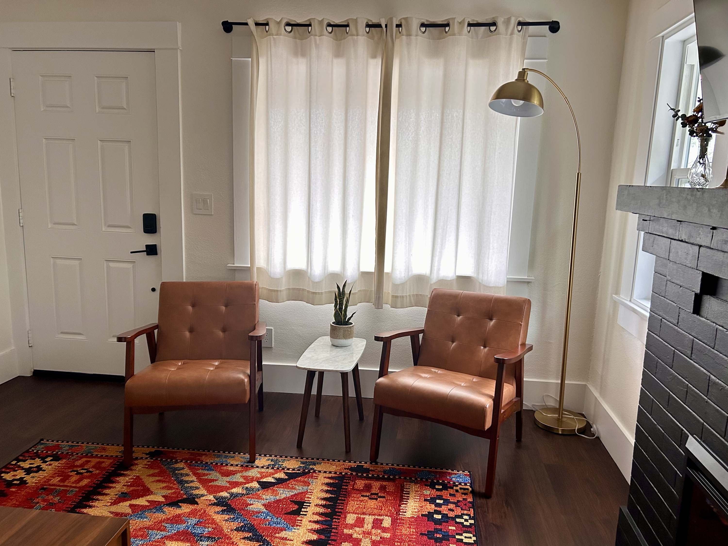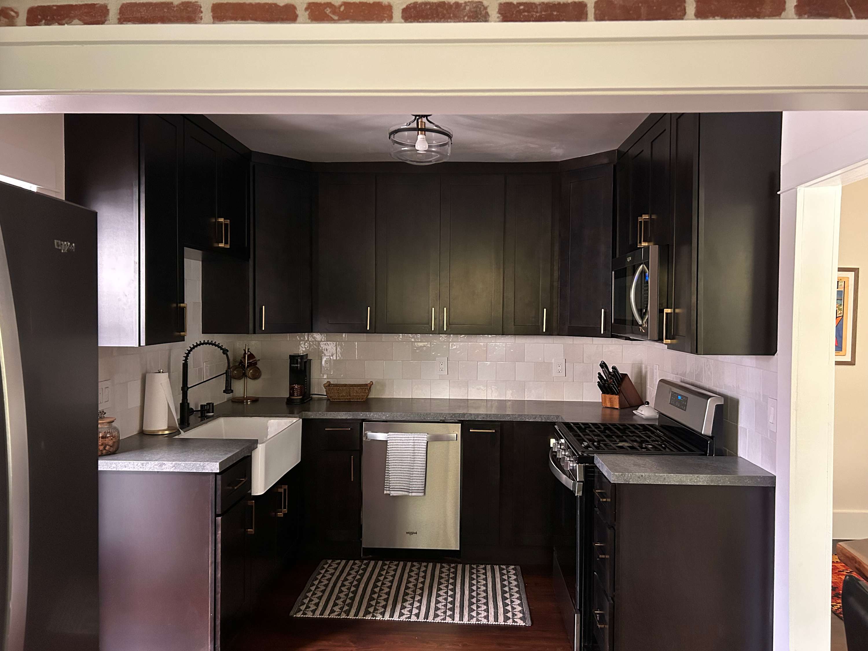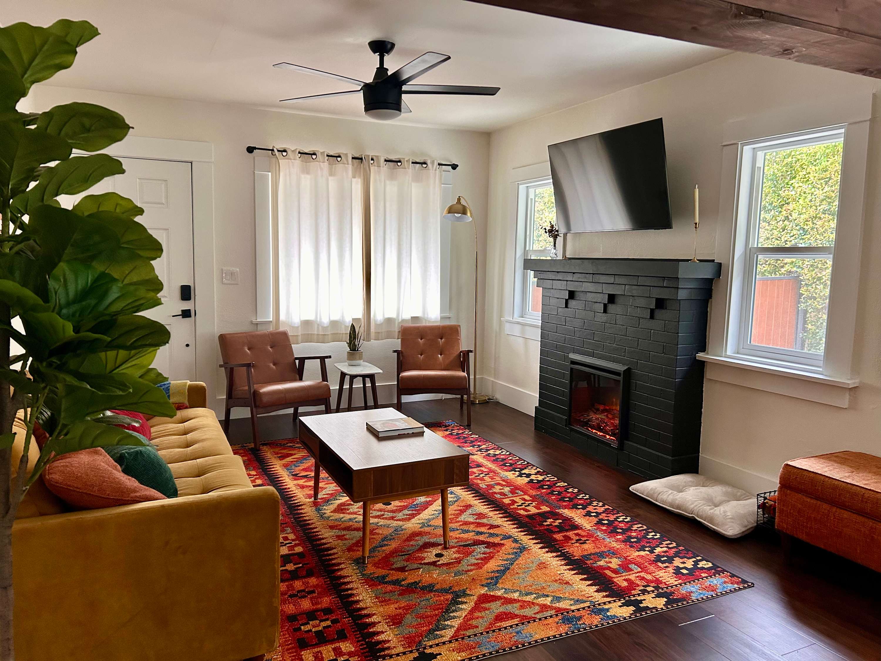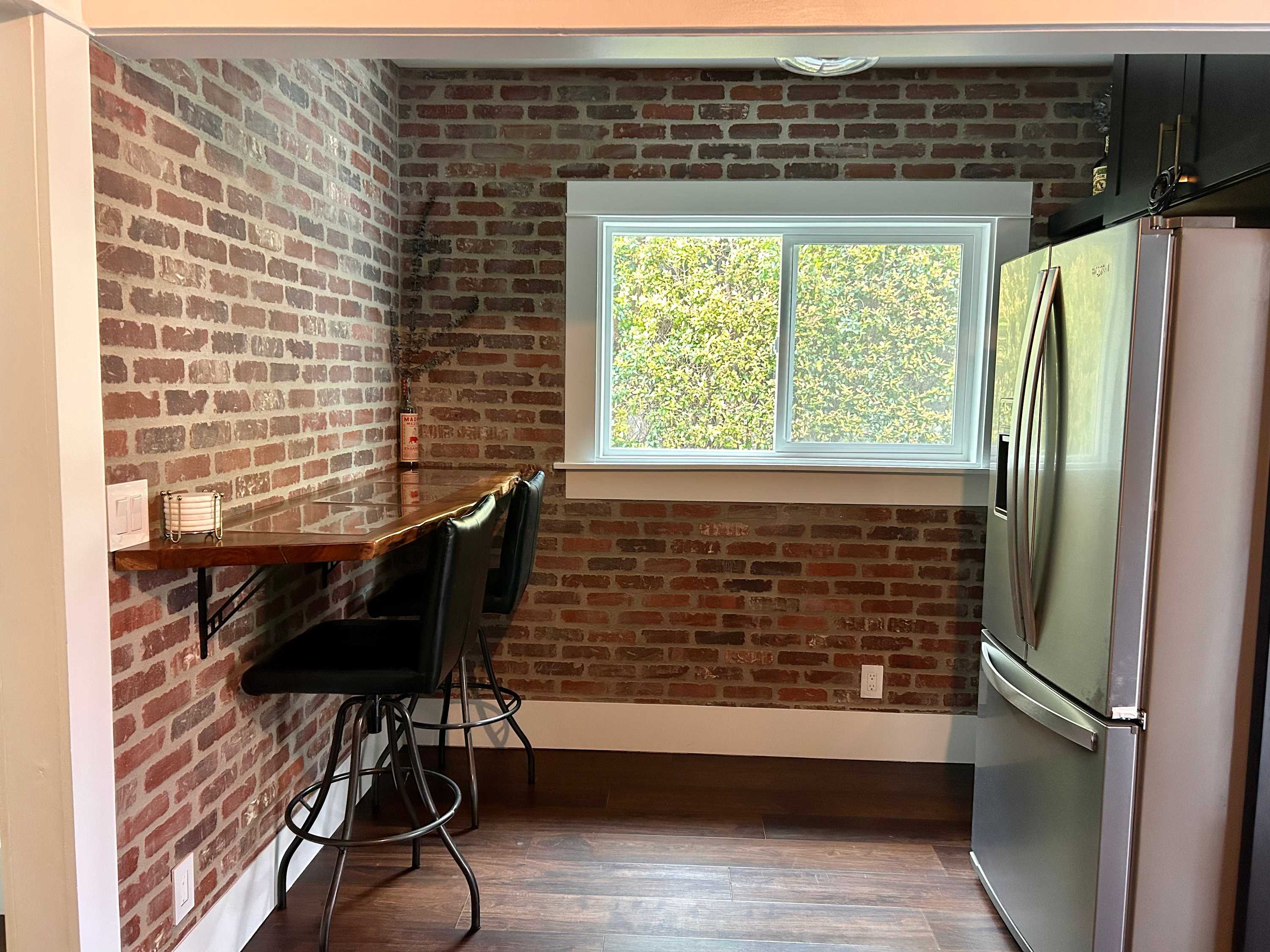 Inside, the charm continues with a cozy yet stylish living room that invites you to slow down. Sink into the couch or chairs, cue up a favorite show on the smart TV, or pull out the board games for a relaxed night in. Just beyond, a dining table for six creates the perfect gathering place for shared meals and laughter. The kitchen blends modern style with everyday convenience. Dark, sleek finishes and stainless steel appliances give it a polished feel, while the Keurig makes mornings effortless. Counter seating for two is perfect for quick breakfasts or evening cocktails, and the wet bar adds an extra touch of fun for entertaining.