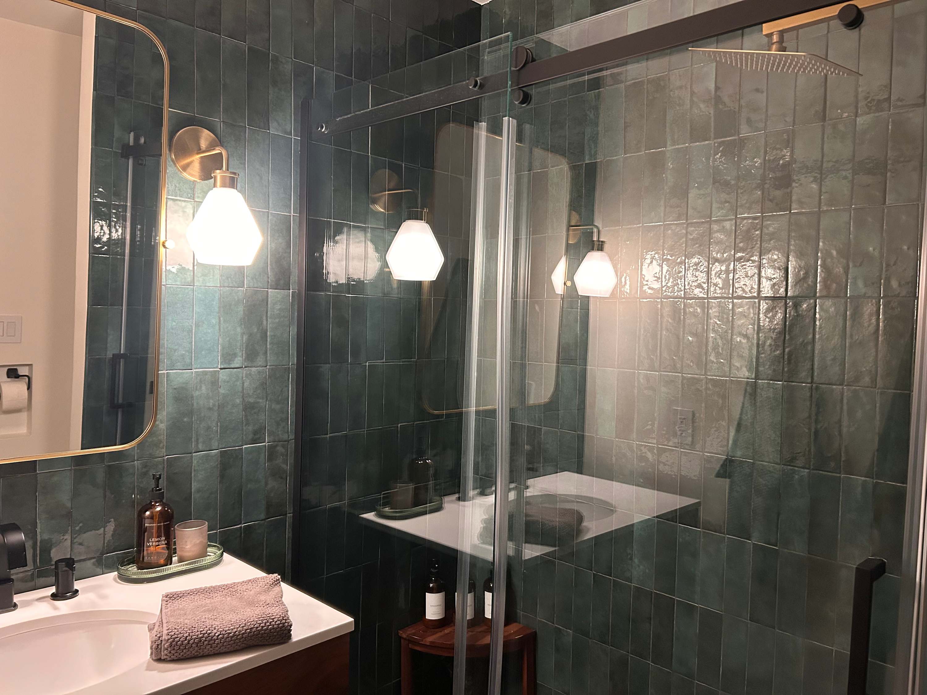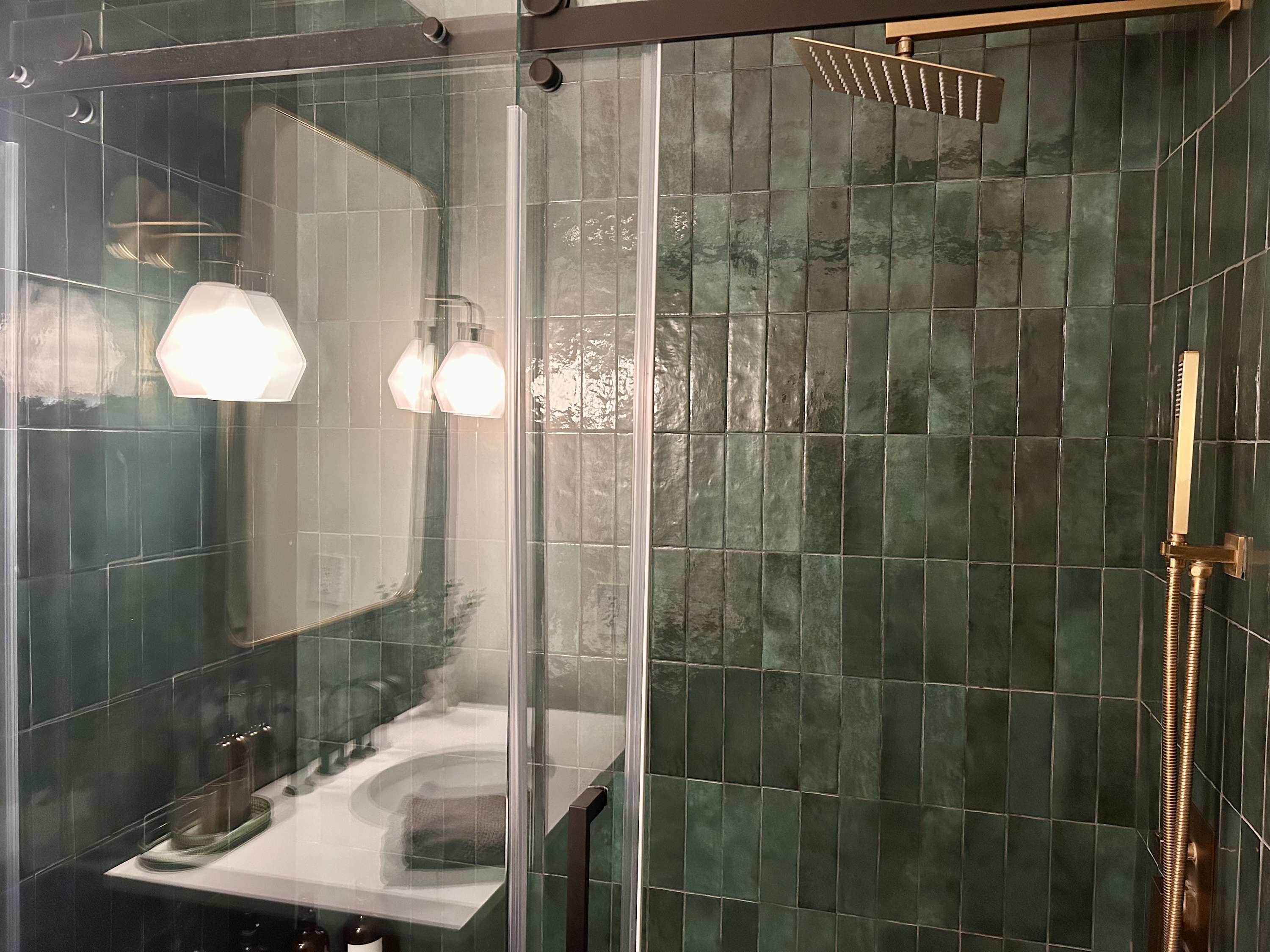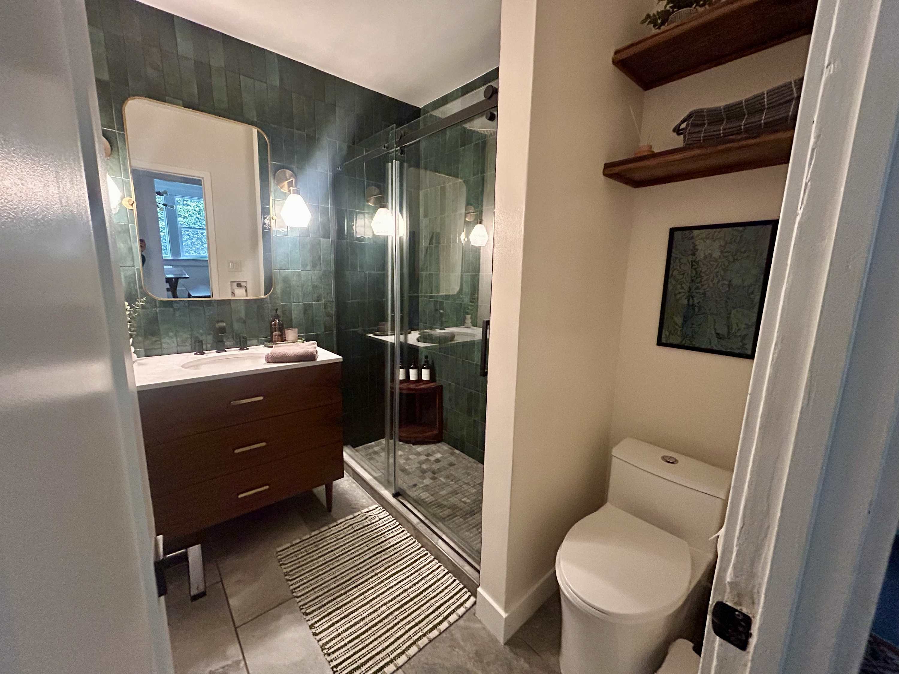 This home also includes a full guest bathroom with a single vanity and a walk-in shower.