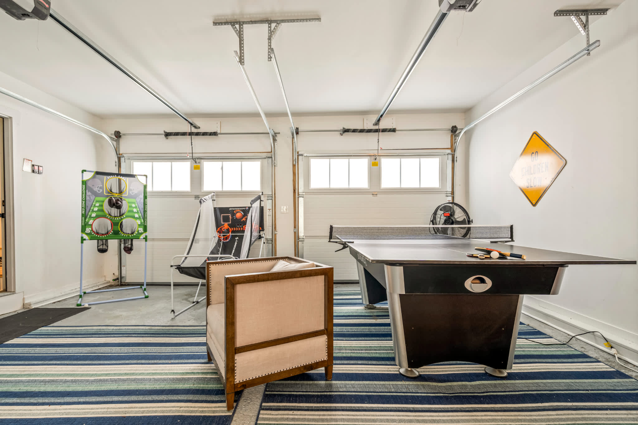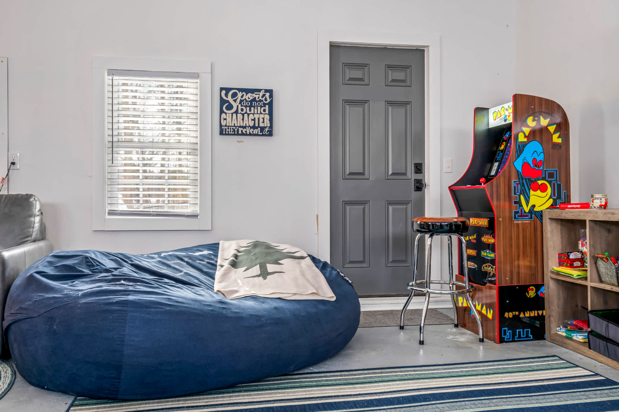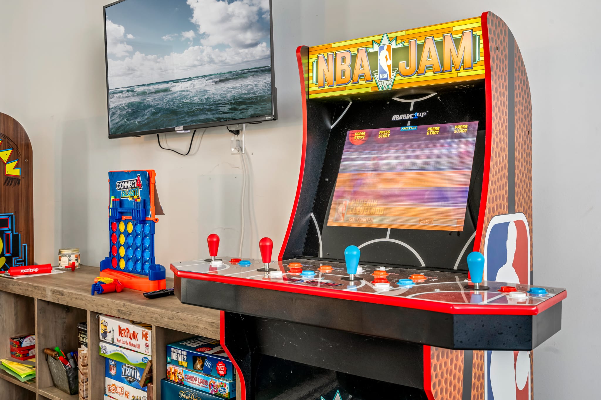 The layout flows seamlessly into the dining room, where a table for six sets the scene for shared meals, laughter-filled game nights, or a fresh lobster feast. Two wine fridges and a dedicated bar area make entertaining easy—whether you’re mixing cocktails or uncorking a favorite bottle. When it’s time for fun, the game room delivers. Challenge your crew to ping pong (or convert the table to air hockey), relive arcade nostalgia with Pac-Man and NBA Jam, shoot hoops with the mini basketball setup, or test your skills with the Red Zone Challenge. A smart TV and board games round out this lively space, offering entertainment for all ages.
