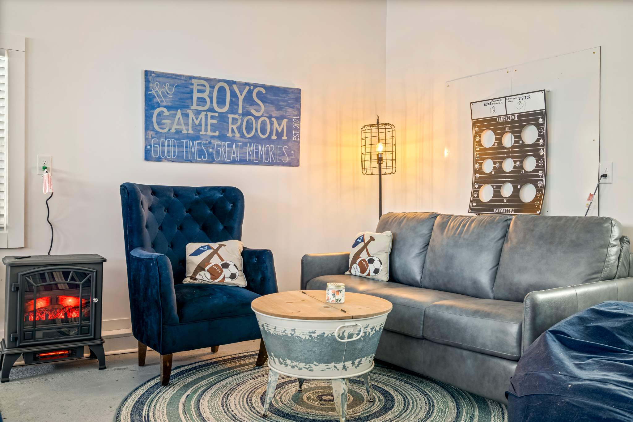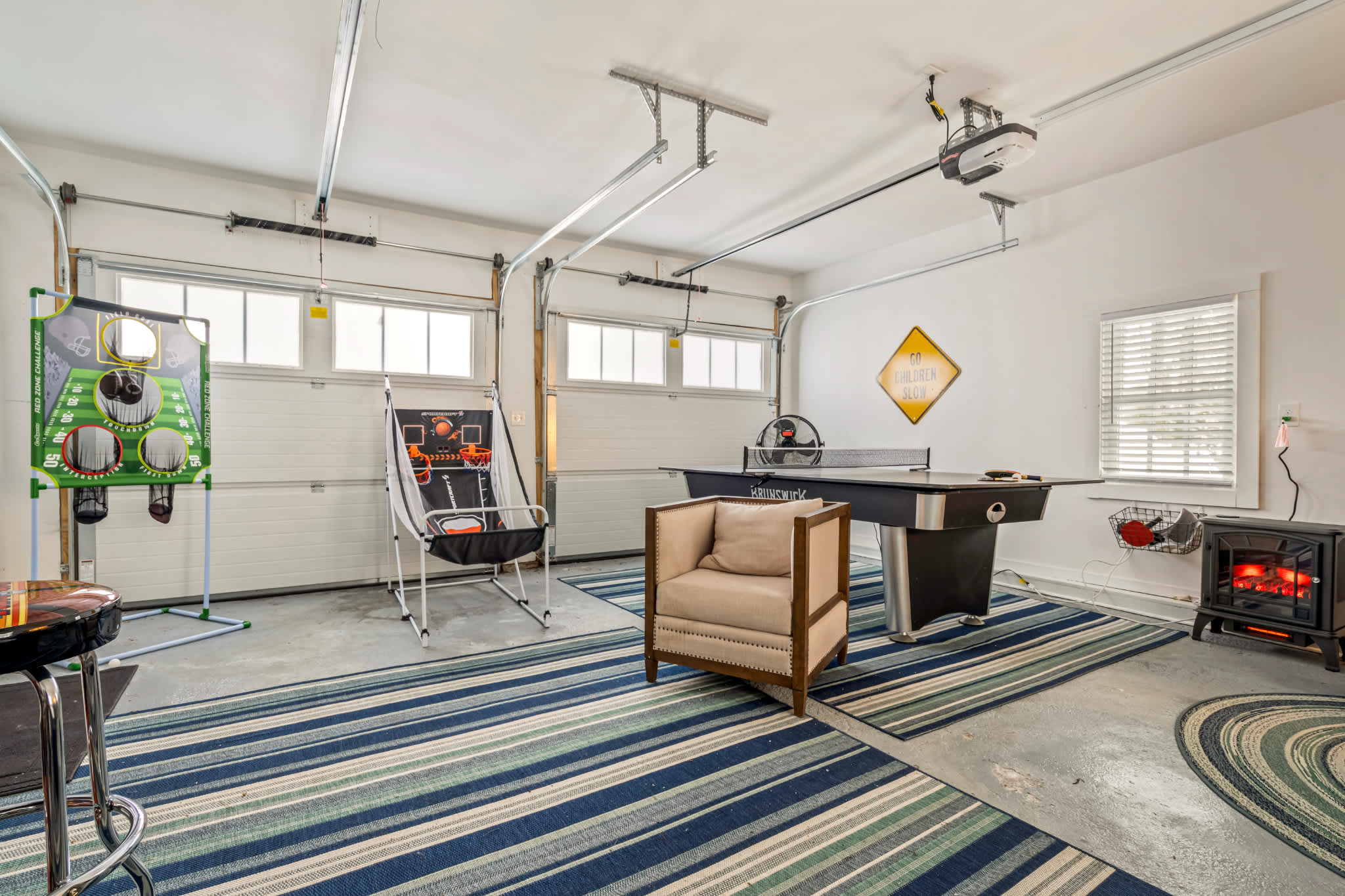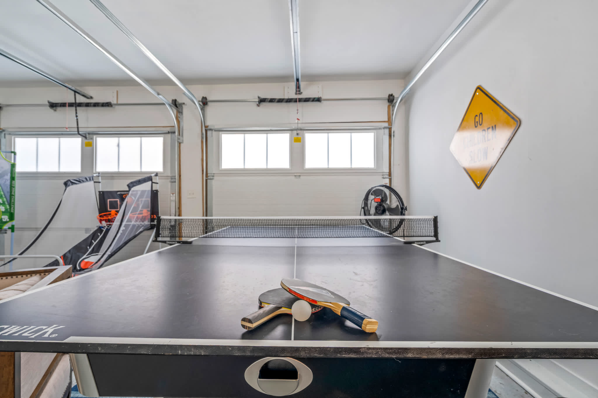The layout flows seamlessly into the dining room, where a table for six sets the scene for shared meals, laughter-filled game nights, or a fresh lobster feast. Two wine fridges and a dedicated bar area make entertaining easy—whether you’re mixing cocktails or uncorking a favorite bottle. When it’s time for fun, the game room delivers. Challenge your crew to ping pong (or convert the table to air hockey), relive arcade nostalgia with Pac-Man and NBA Jam, shoot hoops with the mini basketball setup, or test your skills with the Red Zone Challenge. A smart TV and board games round out this lively space, offering entertainment for all ages.