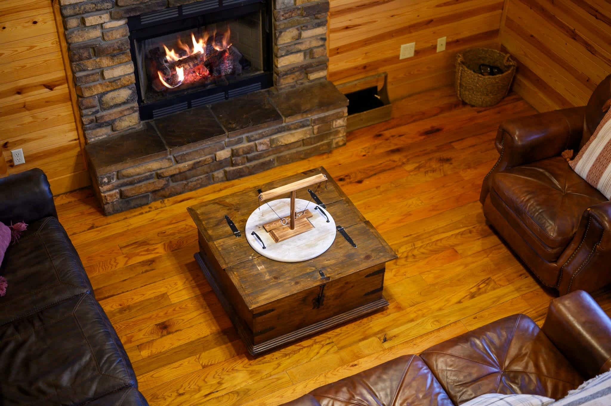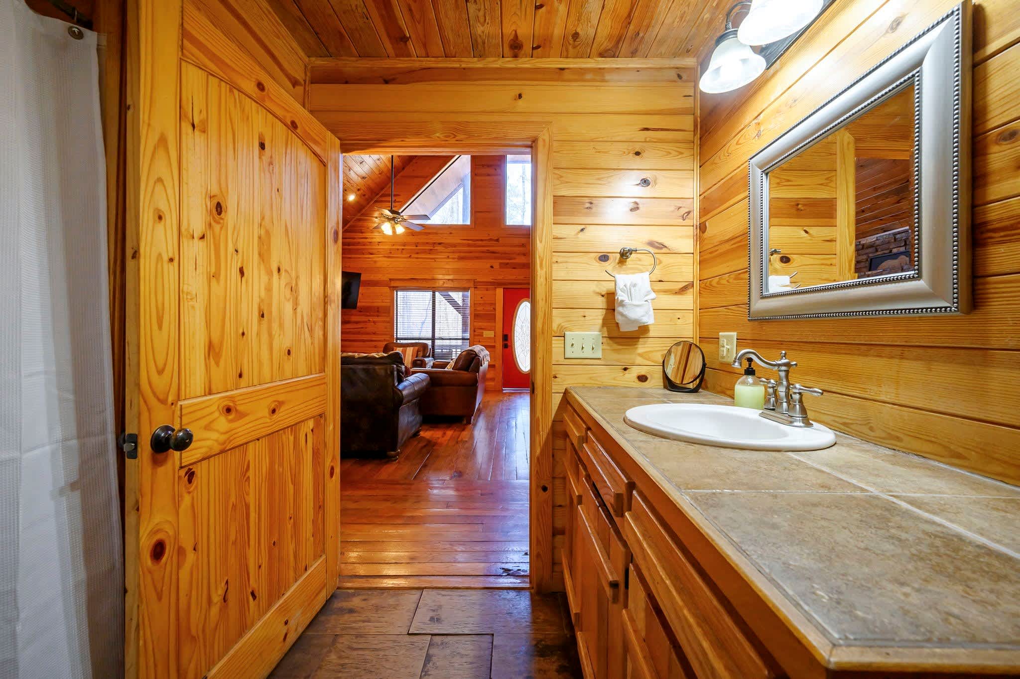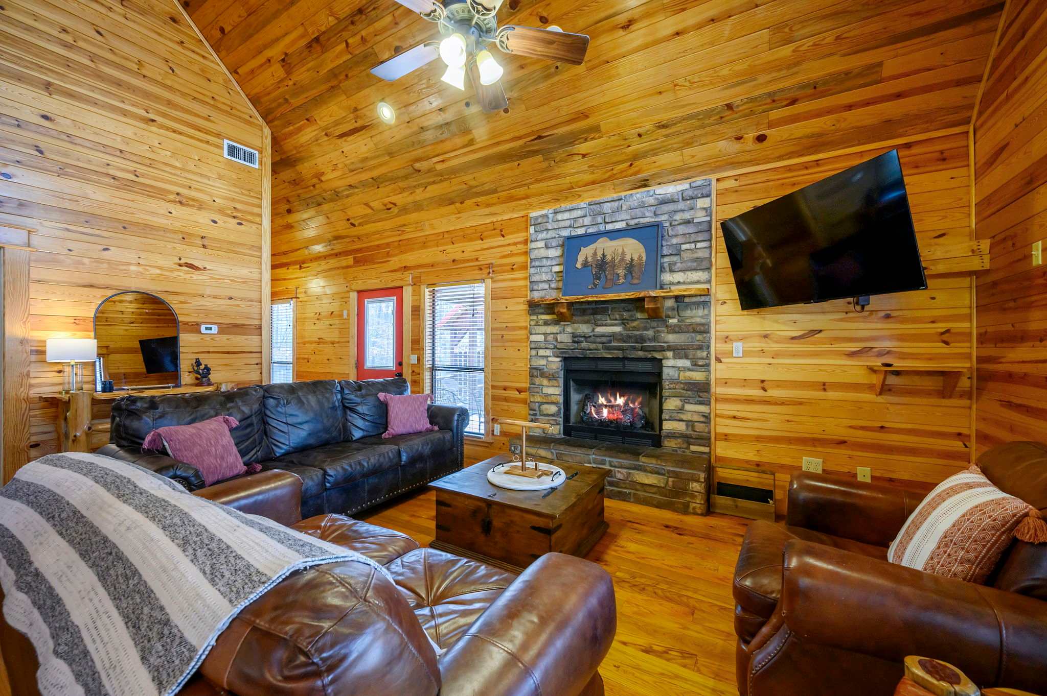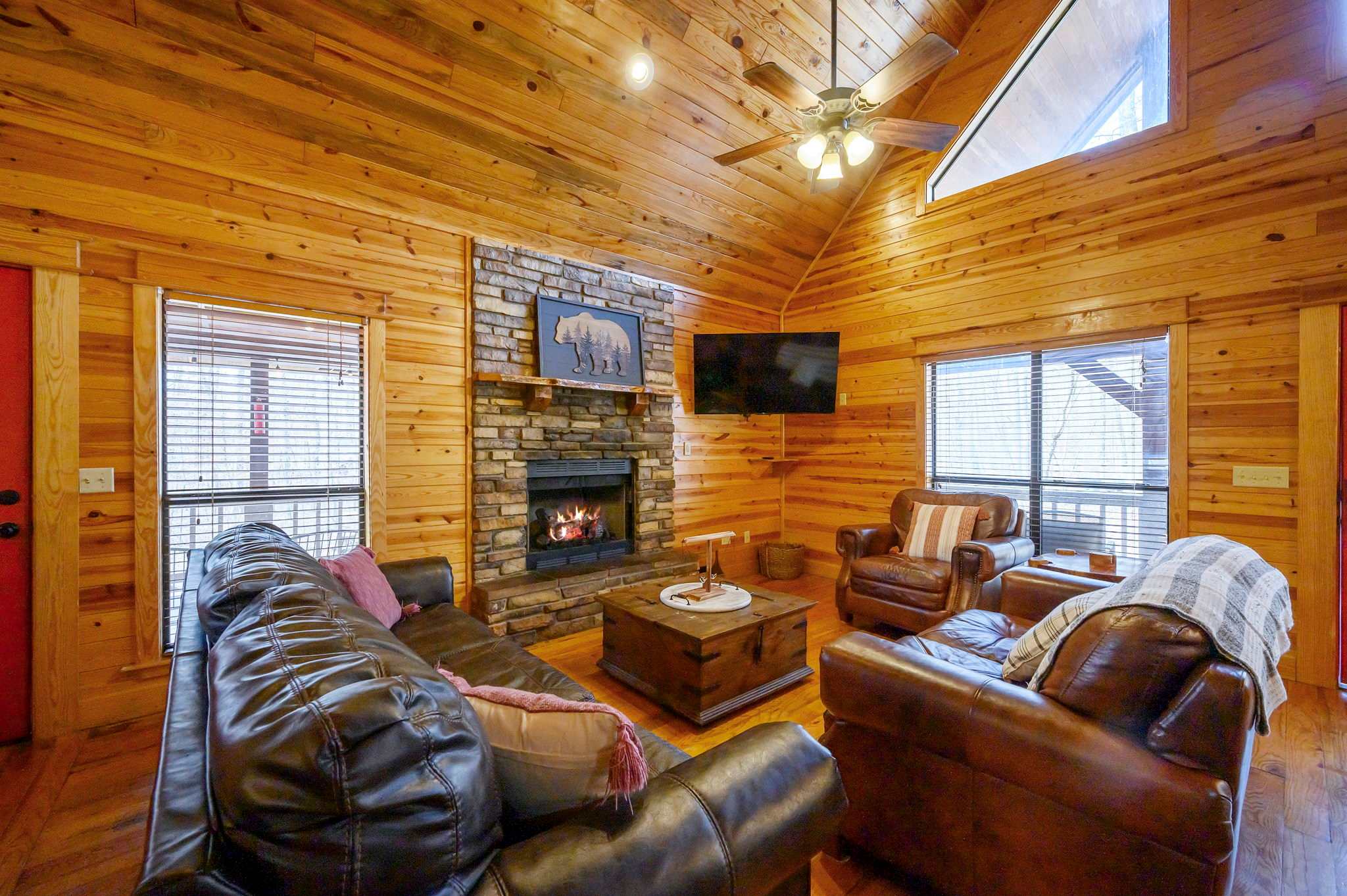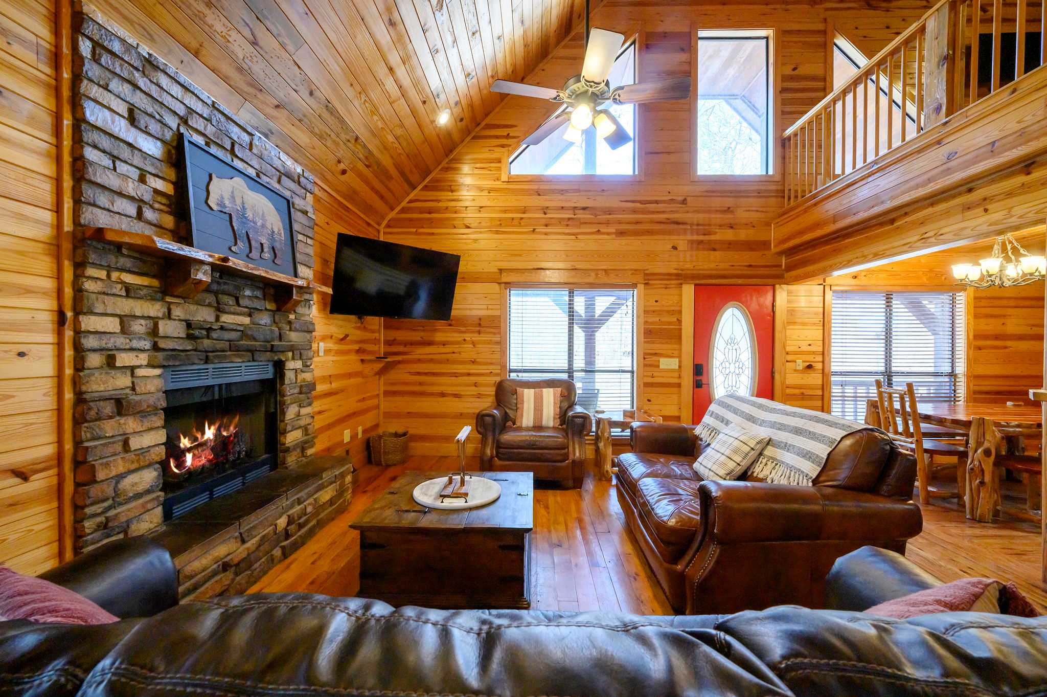 Start outside, where Kodiak Bear truly shines. Grill dinner on the deck beneath the trees, soak in the bubbling hot tub at sunset, then gather around the fire pit to roast marshmallows beside the picnic table under a canopy of stars. Make your way back into this two-story cabin and you’ll find the living room sets a warm, inviting tone with comfy leather furniture, a fireplace, large windows flooding the space with natural light, and a smart TV.