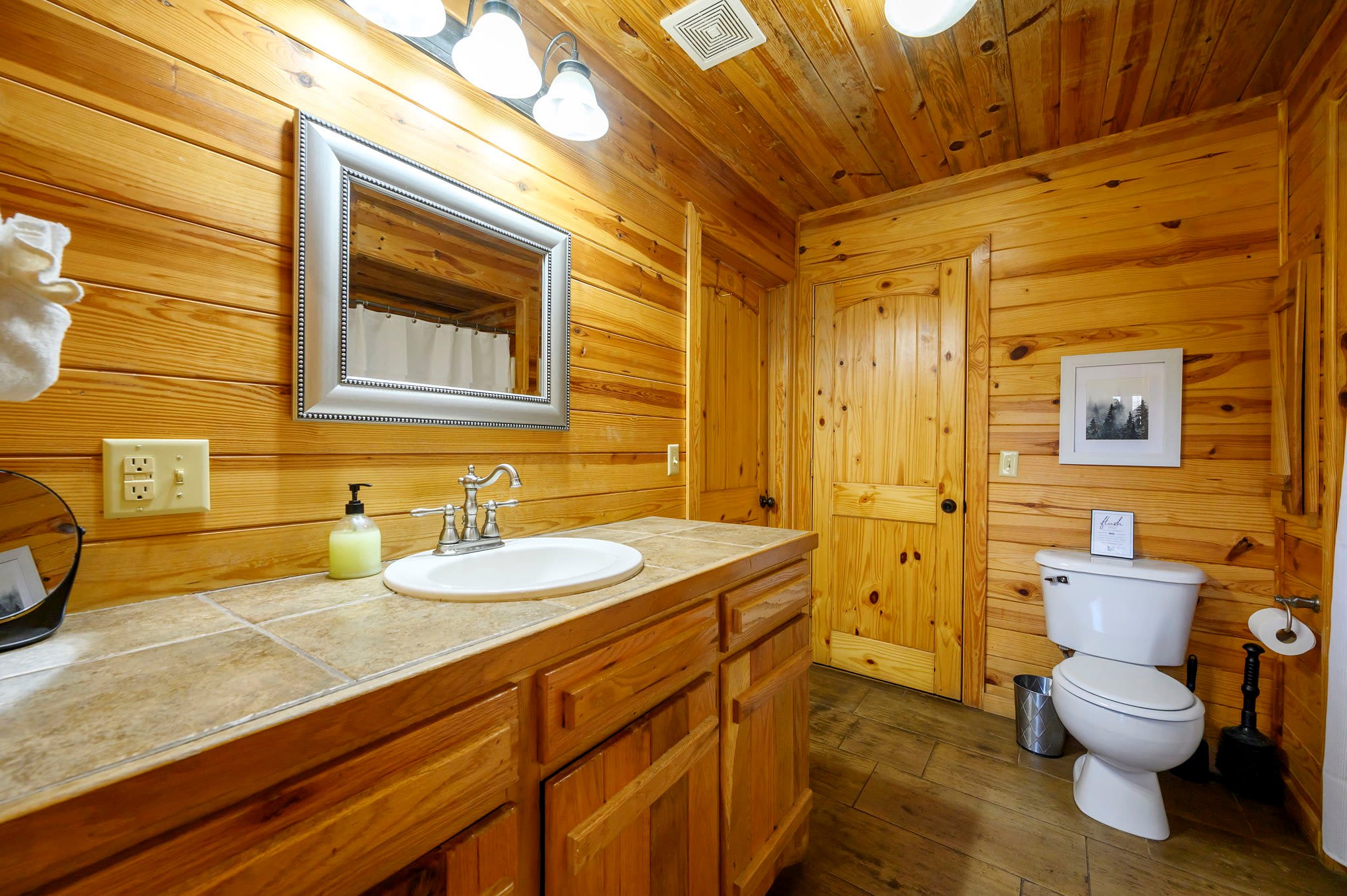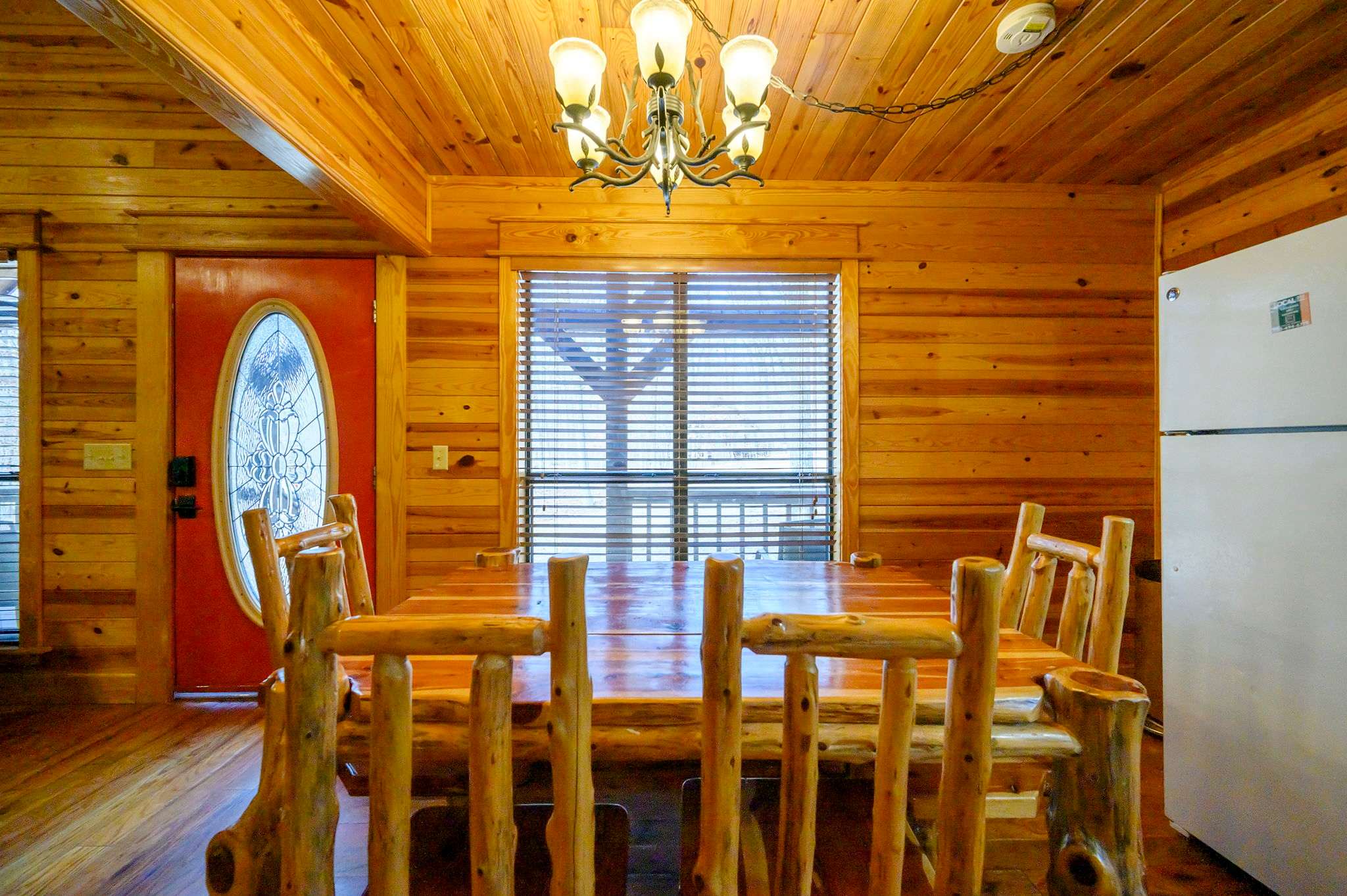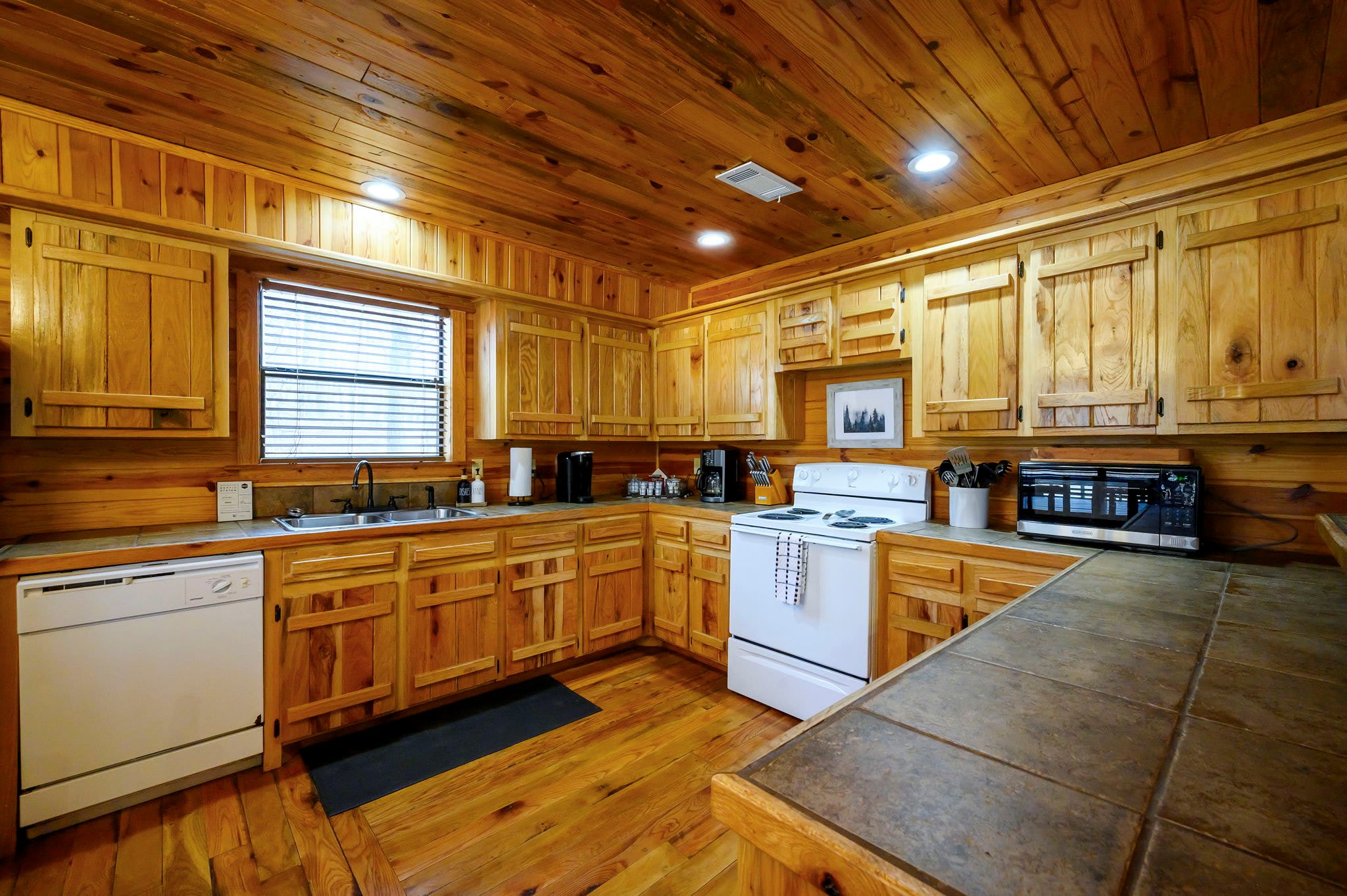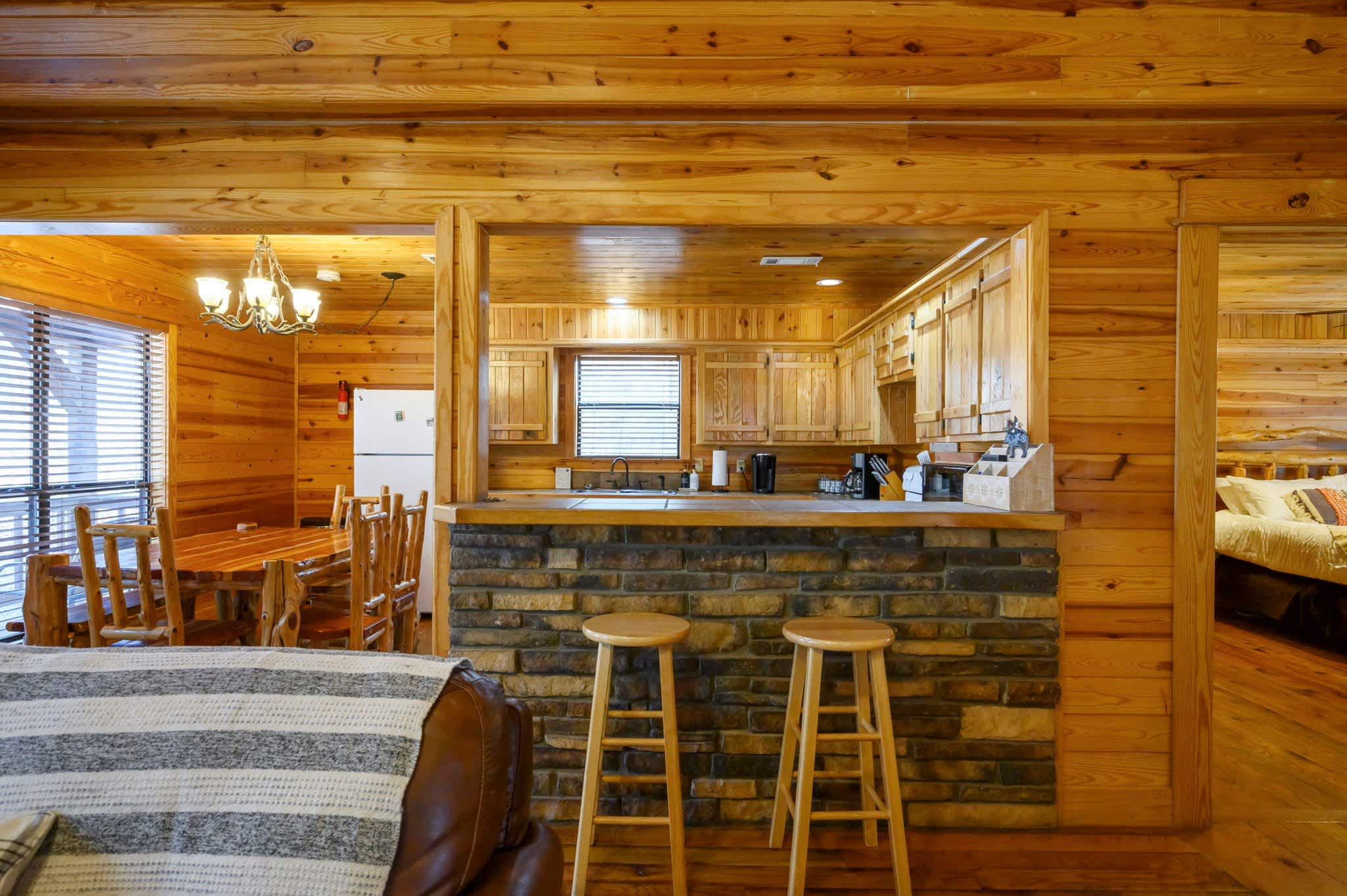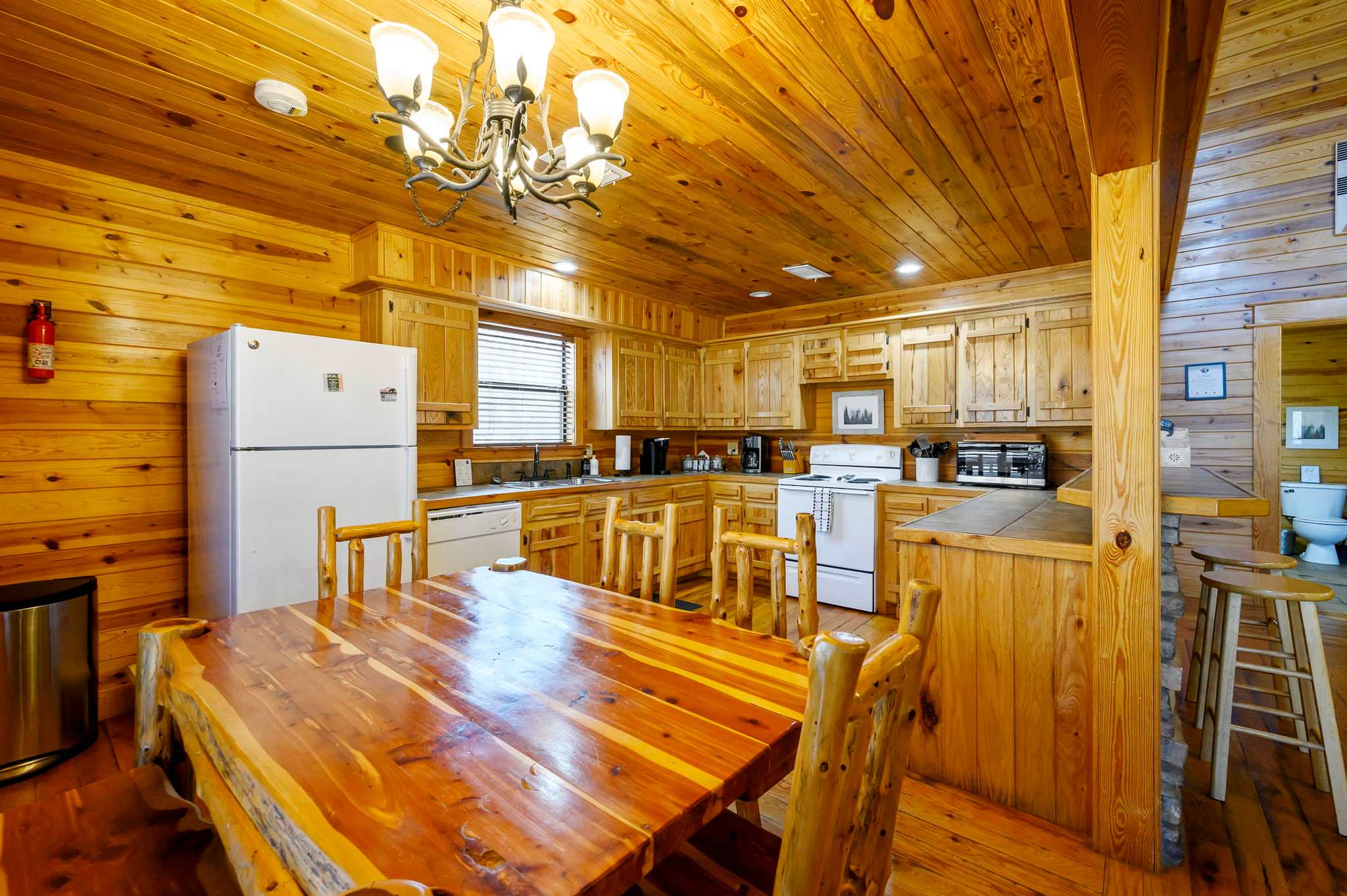 Start outside, where Kodiak Bear truly shines. Grill dinner on the deck beneath the trees, soak in the bubbling hot tub at sunset, then gather around the fire pit to roast marshmallows beside the picnic table under a canopy of stars. Make your way back into this two-story cabin and you’ll find the living room sets a warm, inviting tone with comfy leather furniture, a fireplace, large windows flooding the space with natural light, and a smart TV.