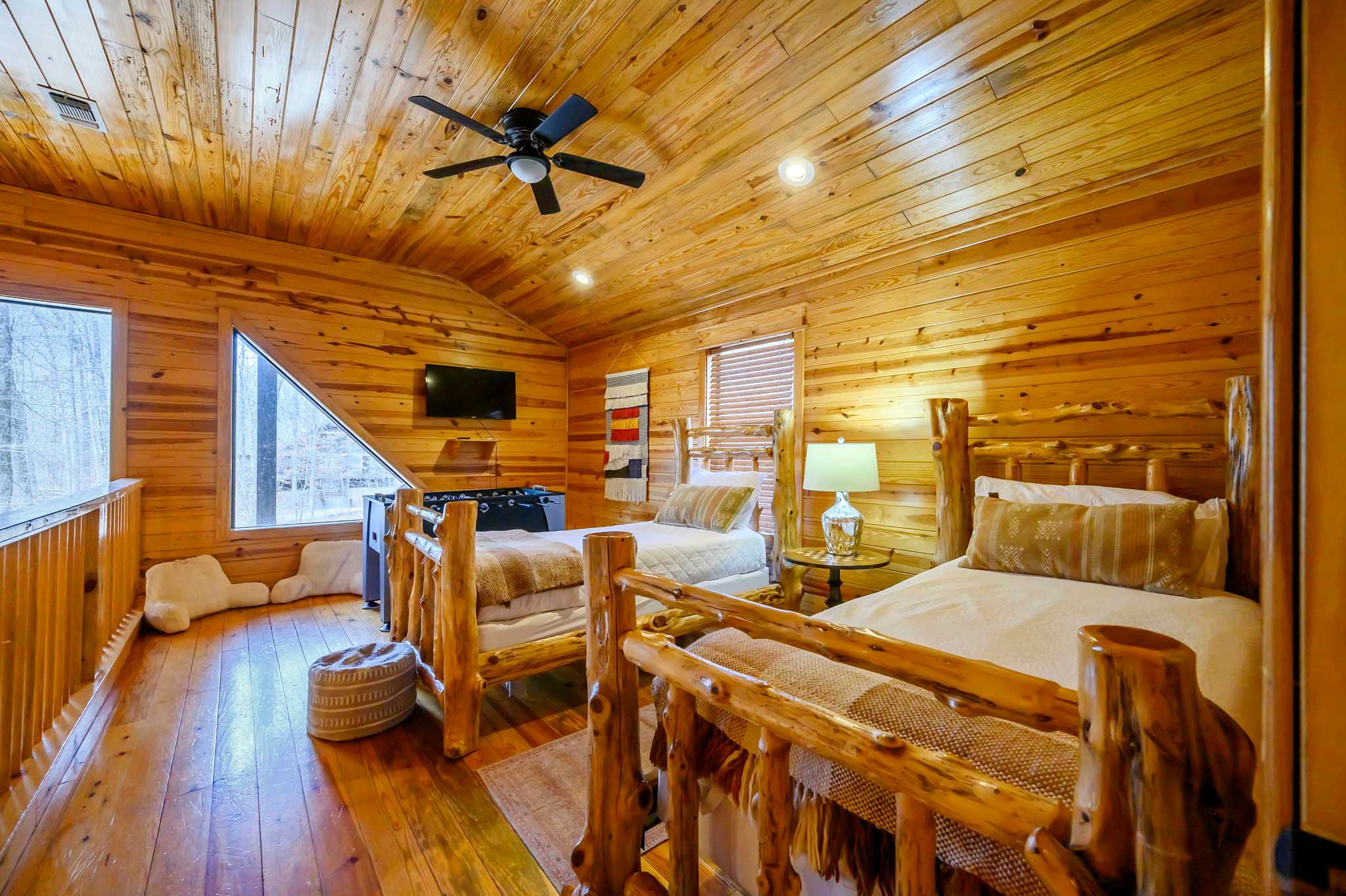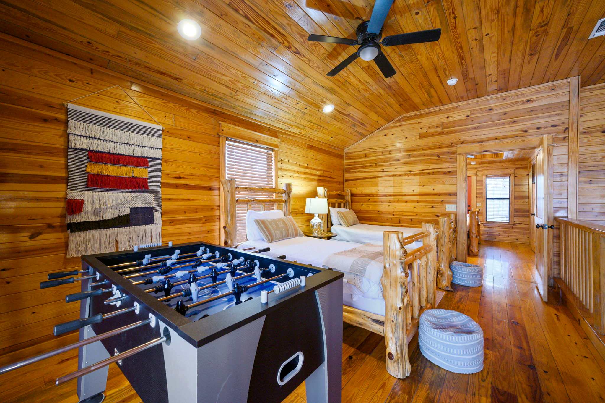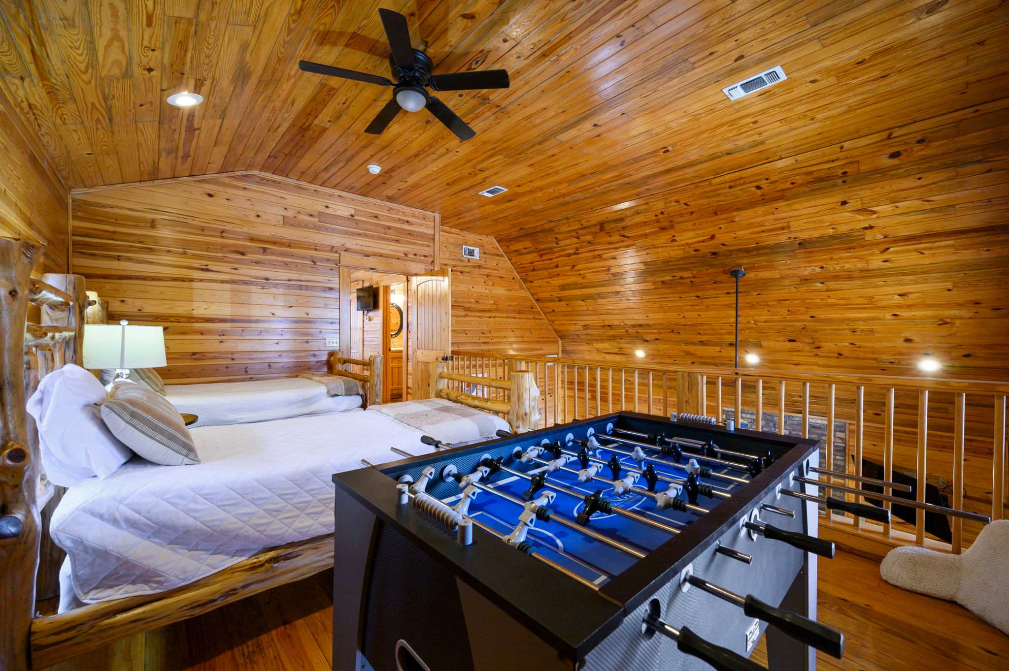 The kitchen captures the full cabin vibe with rustic wood finishes and all the amenities you need to cook memorable family meals. Start your mornings with coffee from the Keurig, then gather around the dining table for six to plan the day’s adventures. Upstairs, the loft overlooks the living room below, adding to the open, airy feel. Here you’ll find another smart TV and a foosball table — perfect for friendly competitions or giving kids and teens their own hangout space.