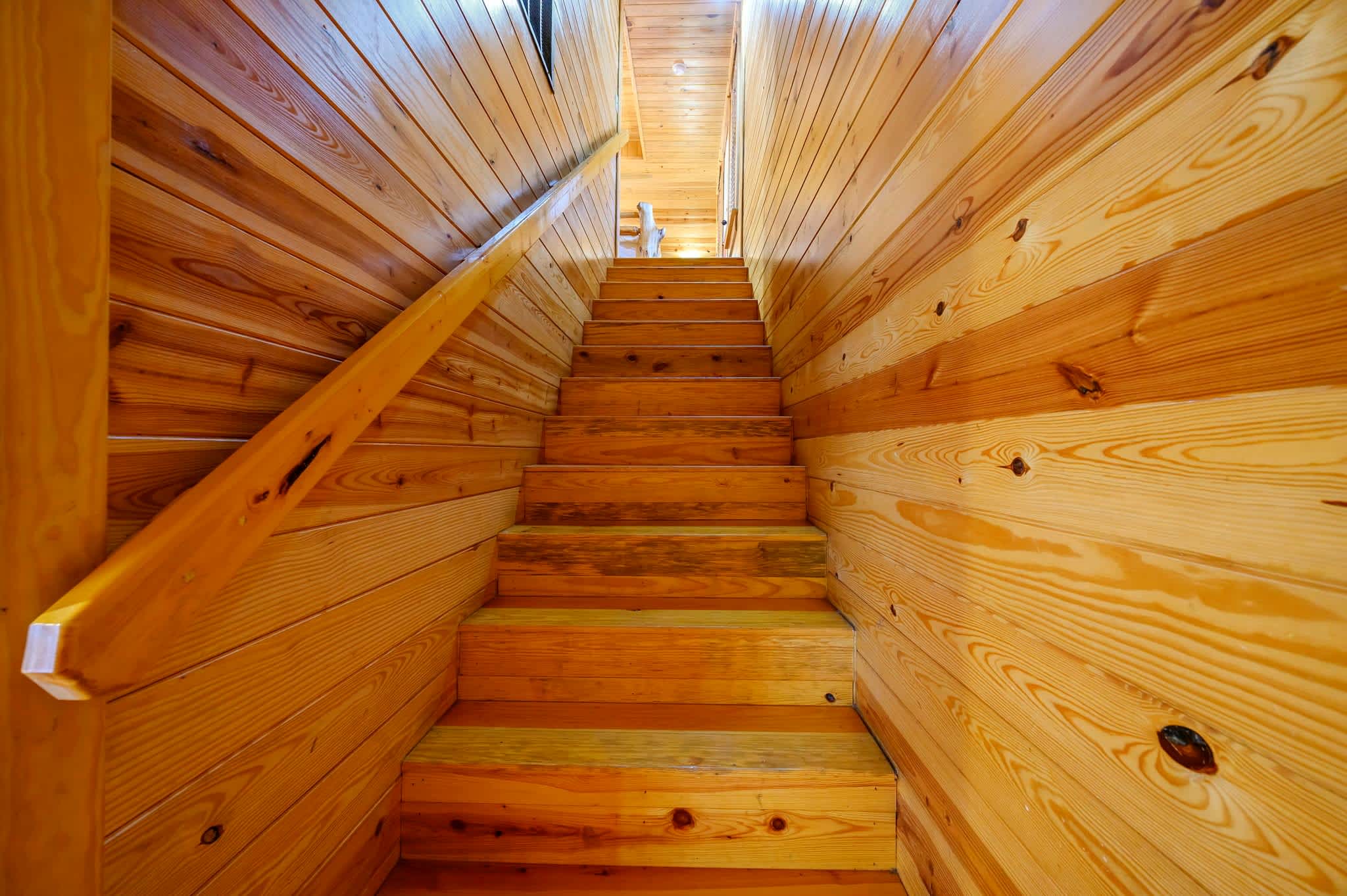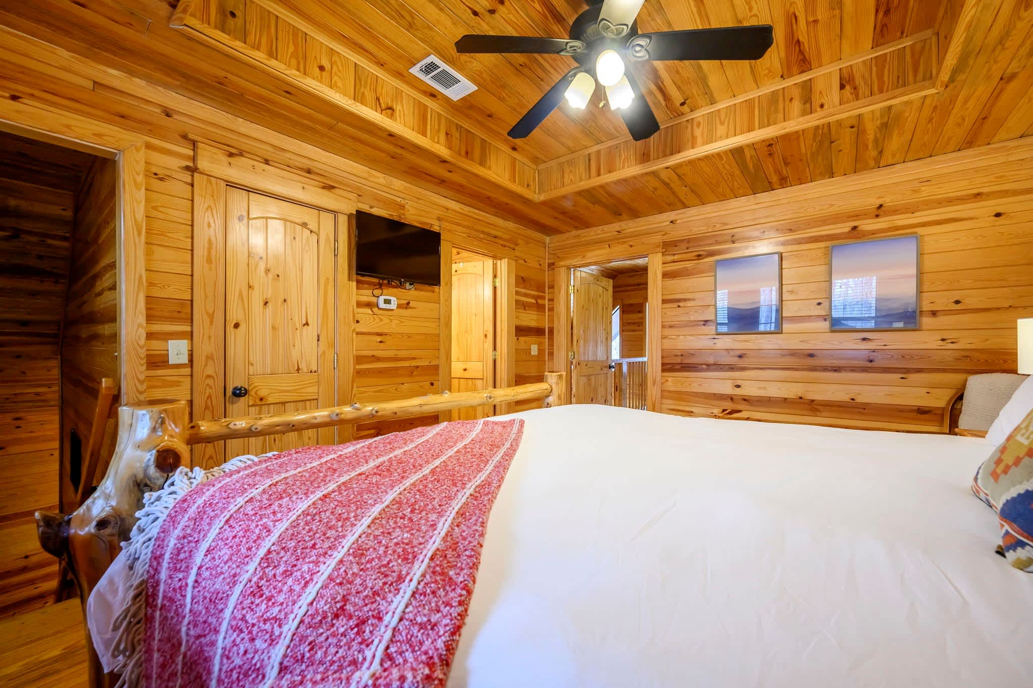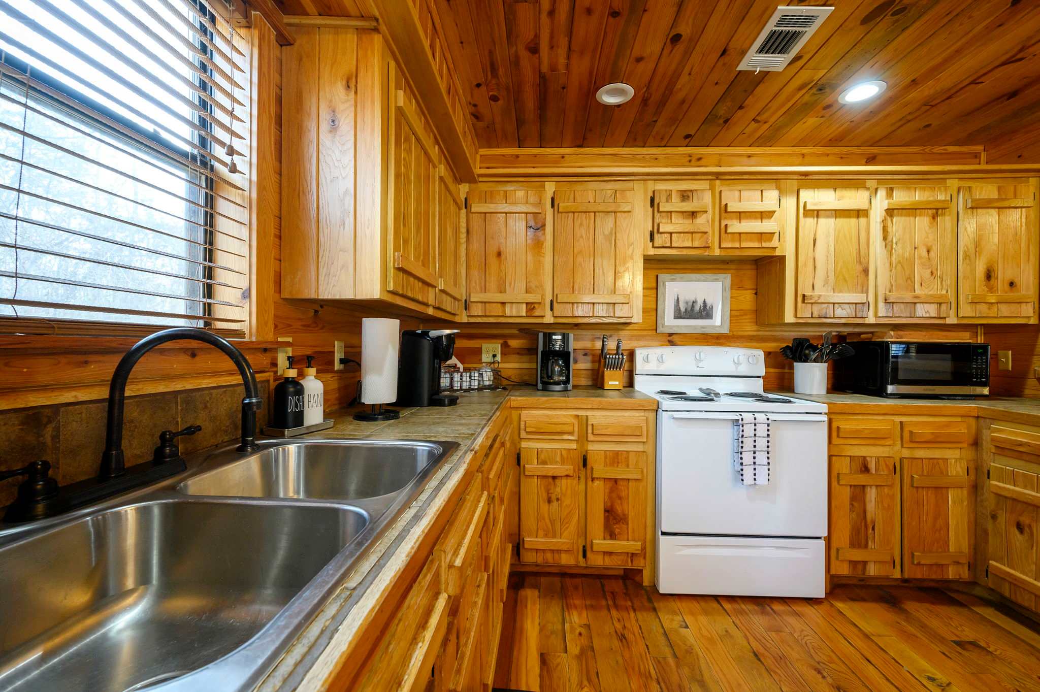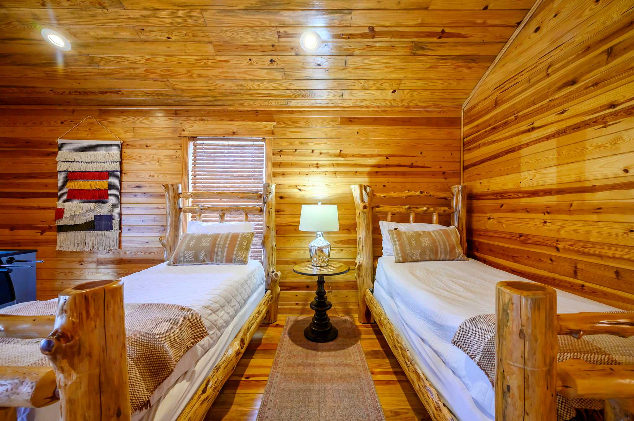 The kitchen captures the full cabin vibe with rustic wood finishes and all the amenities you need to cook memorable family meals. Start your mornings with coffee from the Keurig, then gather around the dining table for six to plan the day’s adventures. Upstairs, the loft overlooks the living room below, adding to the open, airy feel. Here you’ll find another smart TV and a foosball table — perfect for friendly competitions or giving kids and teens their own hangout space.
