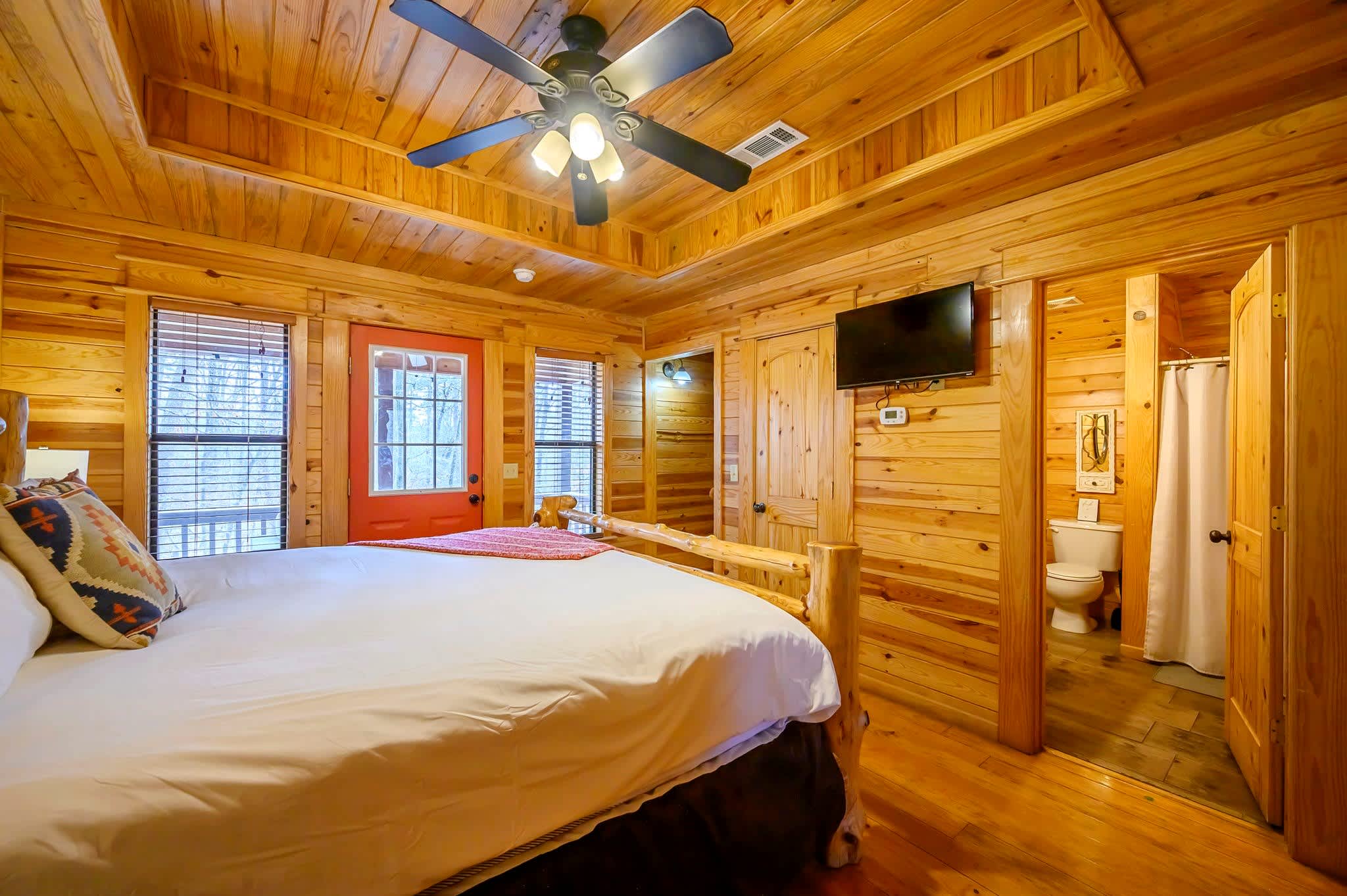 Bedroom #2 includes a king size bed, a smart TV, deck access, and an ensuite bathroom with a single vanity and a shower/tub combo,