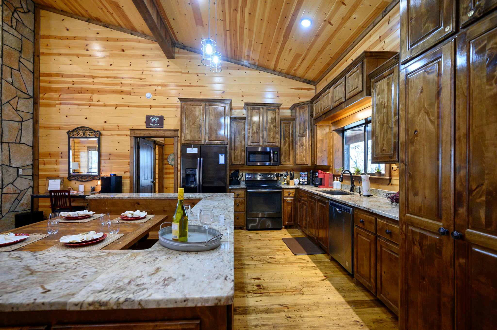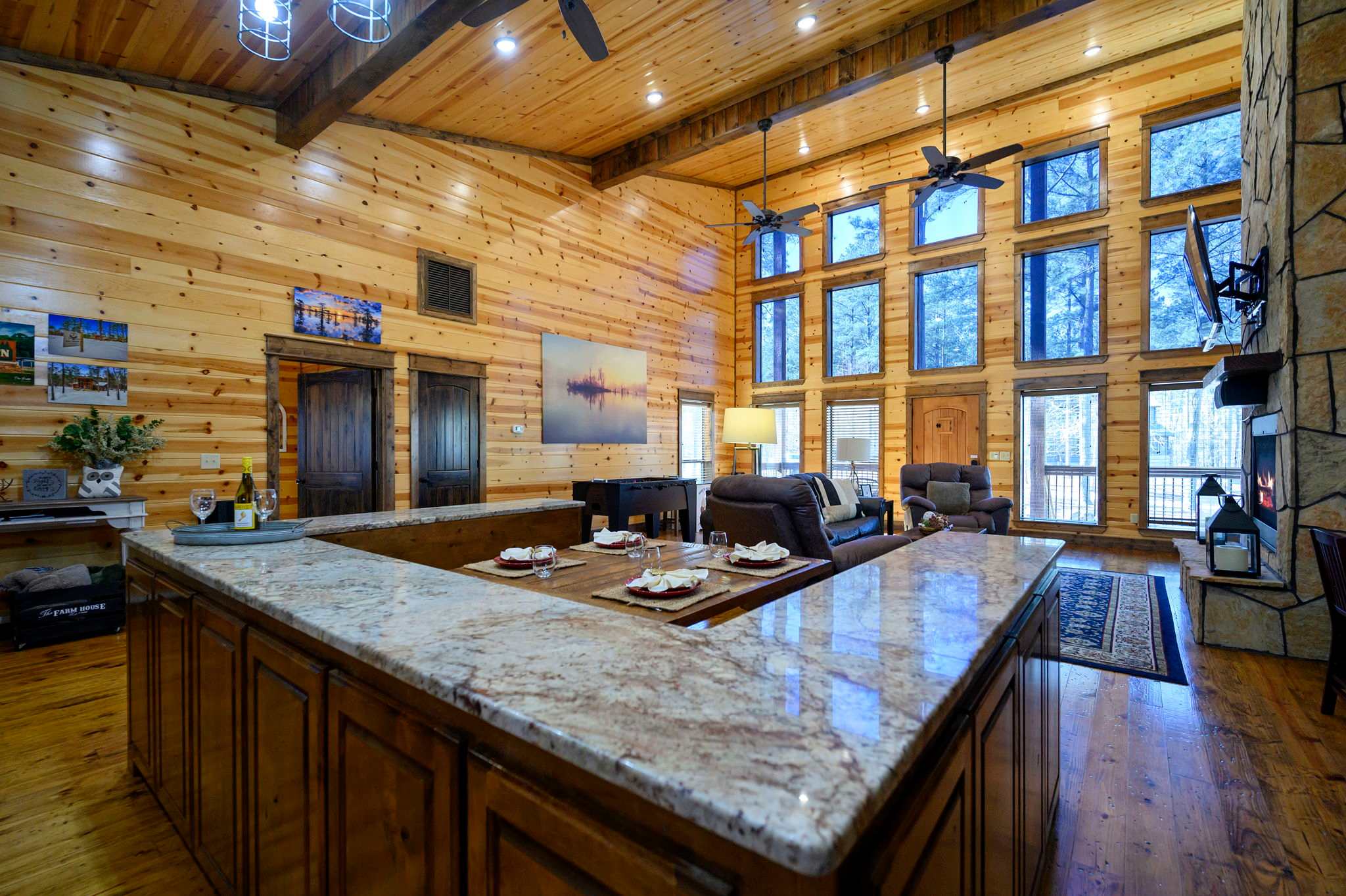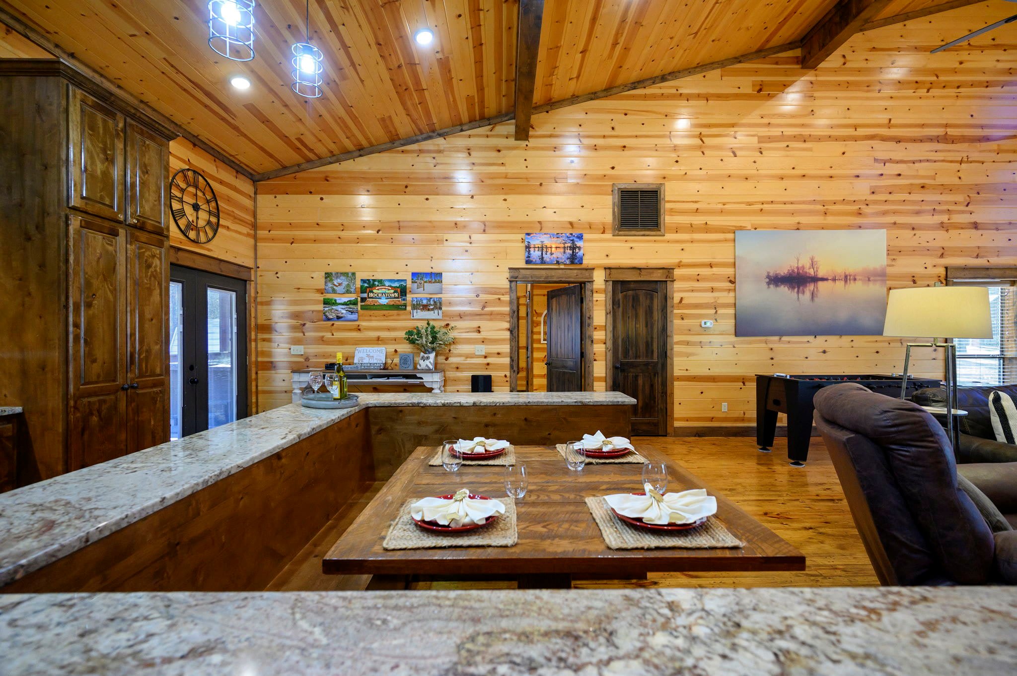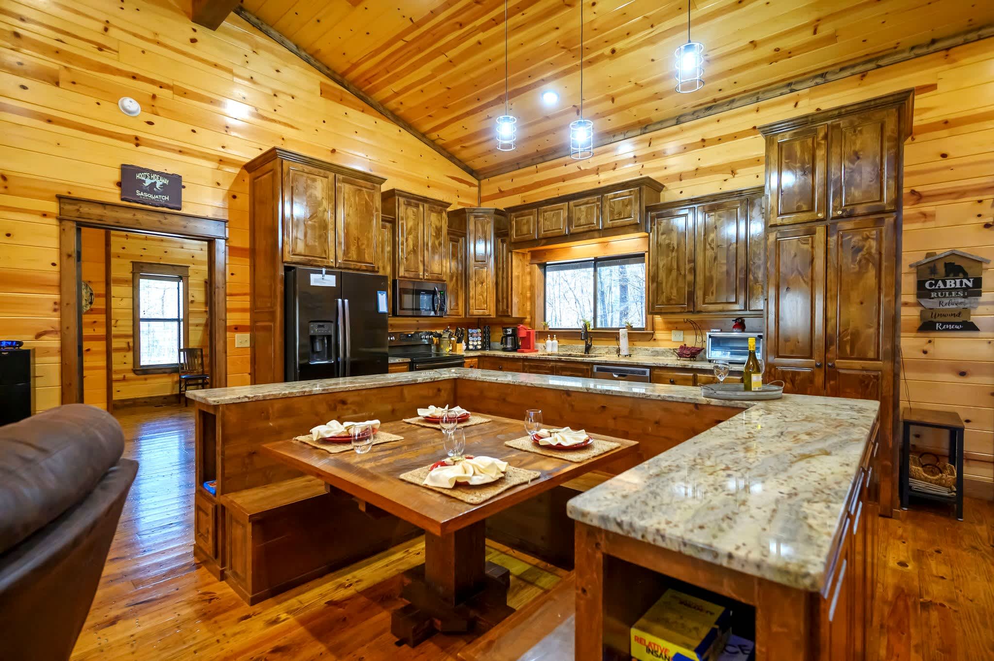 Step inside and you’re immediately welcomed by soaring high ceilings and warm cabin vibes that make the space feel both grand and cozy. The living room invites you to sink into oversized, ultra-comfy furniture with plenty of room for everyone to spread out. Picture evenings gathered around the indoor fireplace, a movie playing on the smart TV, while others challenge each other to a lively game of foosball or dig into a stack of classic board games for a little friendly competition. The open-concept kitchen keeps everyone connected, featuring rich dark cabinetry that enhances the rustic charm. Start your mornings with a fresh cup from the Keurig before preparing breakfast together, then gather around the dining table for six to share meals, stories, and plans for the day ahead.