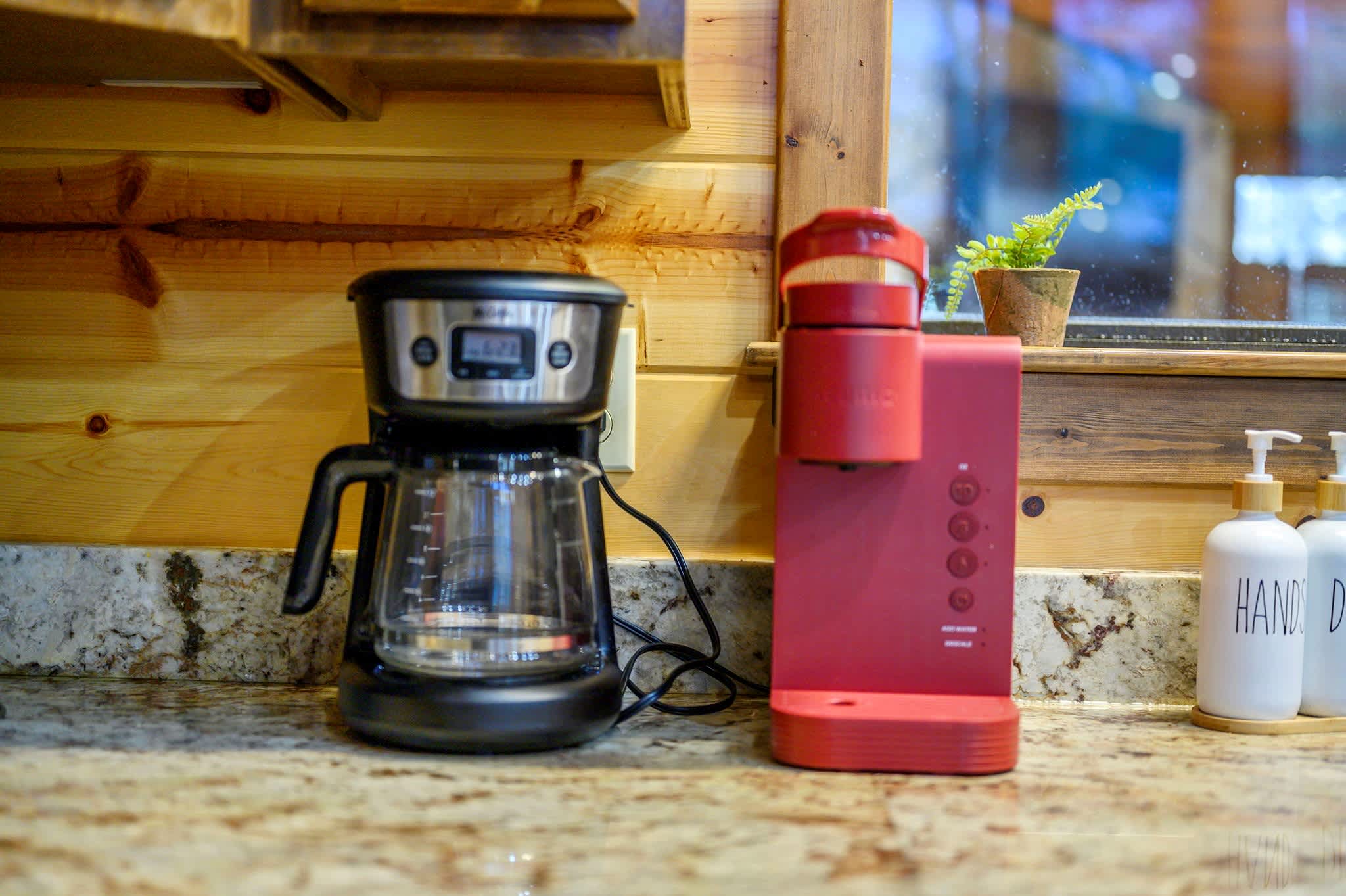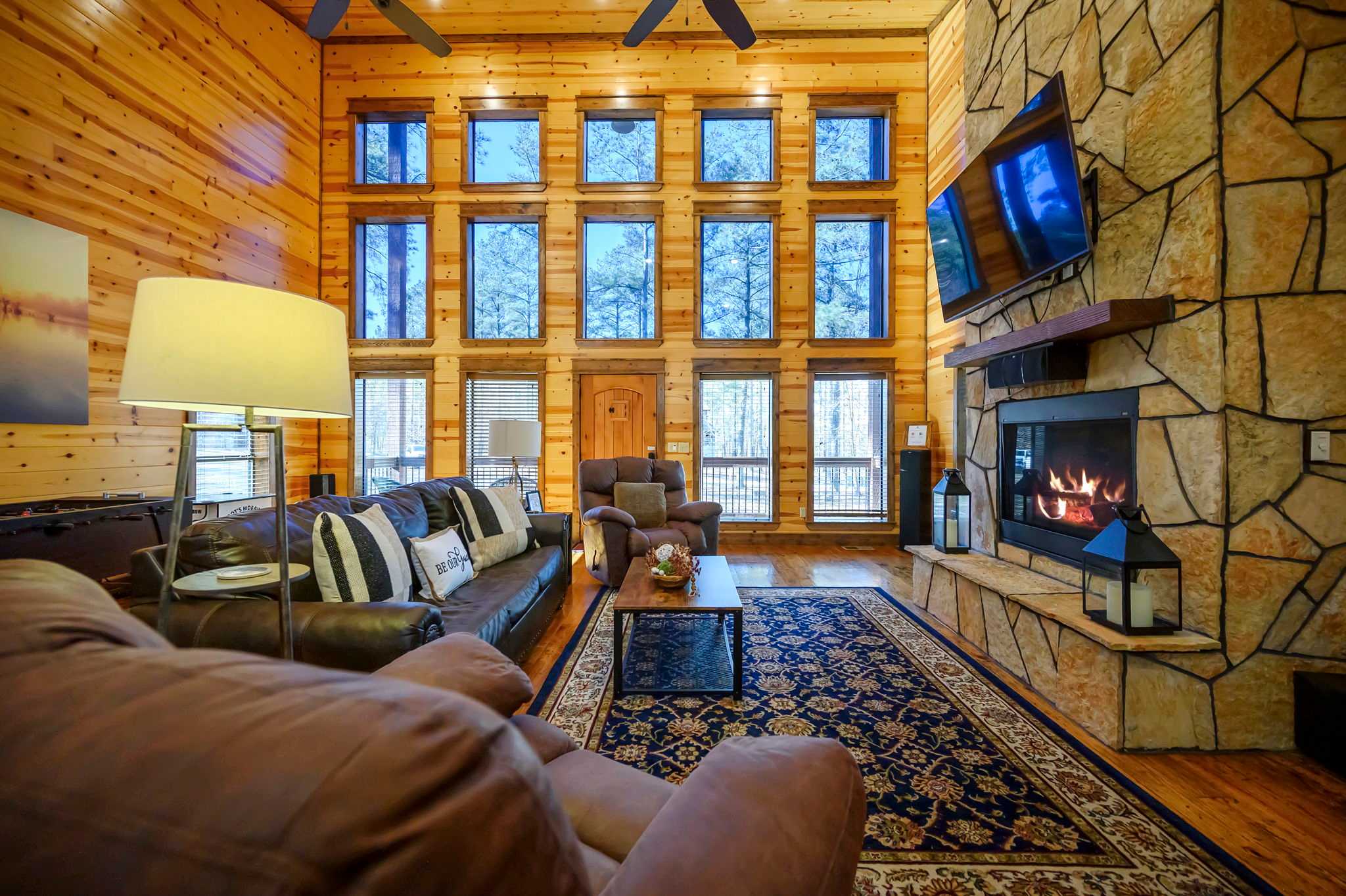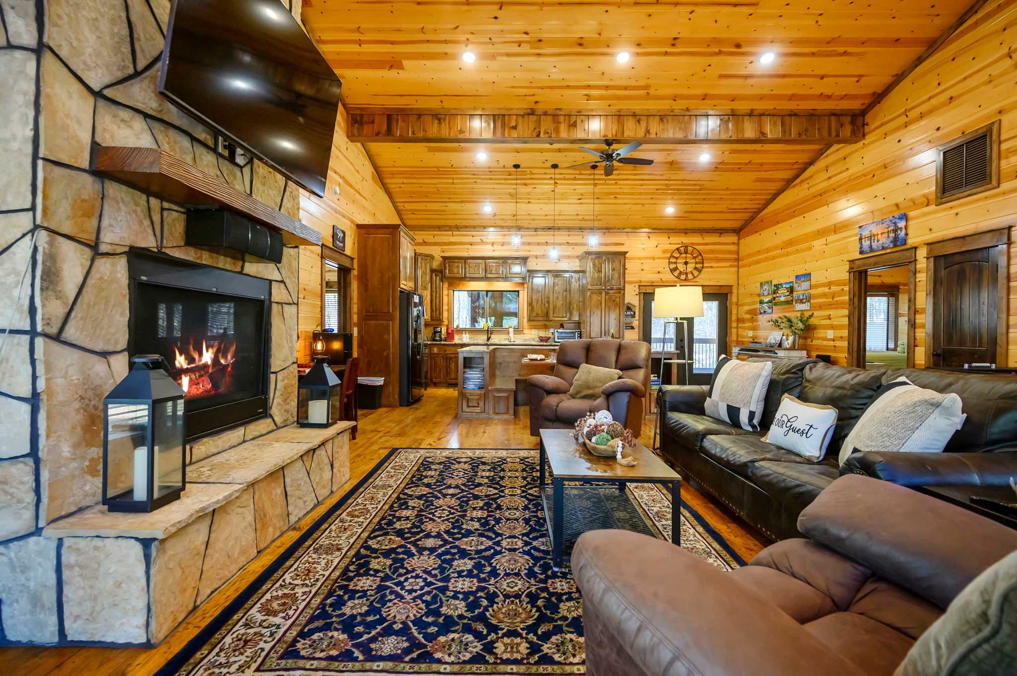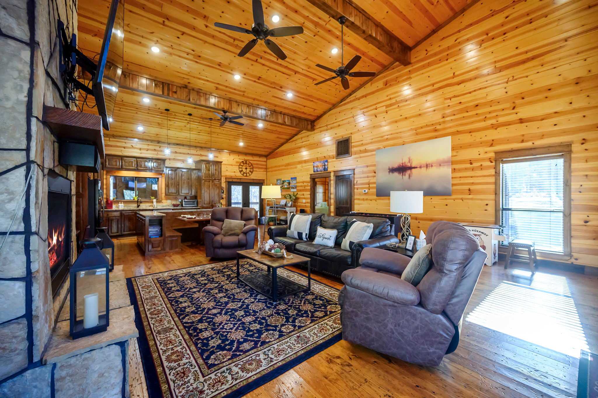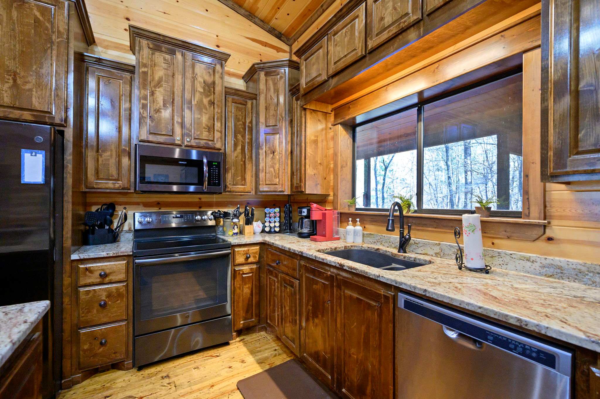 Step inside and you’re immediately welcomed by soaring high ceilings and warm cabin vibes that make the space feel both grand and cozy. The living room invites you to sink into oversized, ultra-comfy furniture with plenty of room for everyone to spread out. Picture evenings gathered around the indoor fireplace, a movie playing on the smart TV, while others challenge each other to a lively game of foosball or dig into a stack of classic board games for a little friendly competition. The open-concept kitchen keeps everyone connected, featuring rich dark cabinetry that enhances the rustic charm. Start your mornings with a fresh cup from the Keurig before preparing breakfast together, then gather around the dining table for six to share meals, stories, and plans for the day ahead.