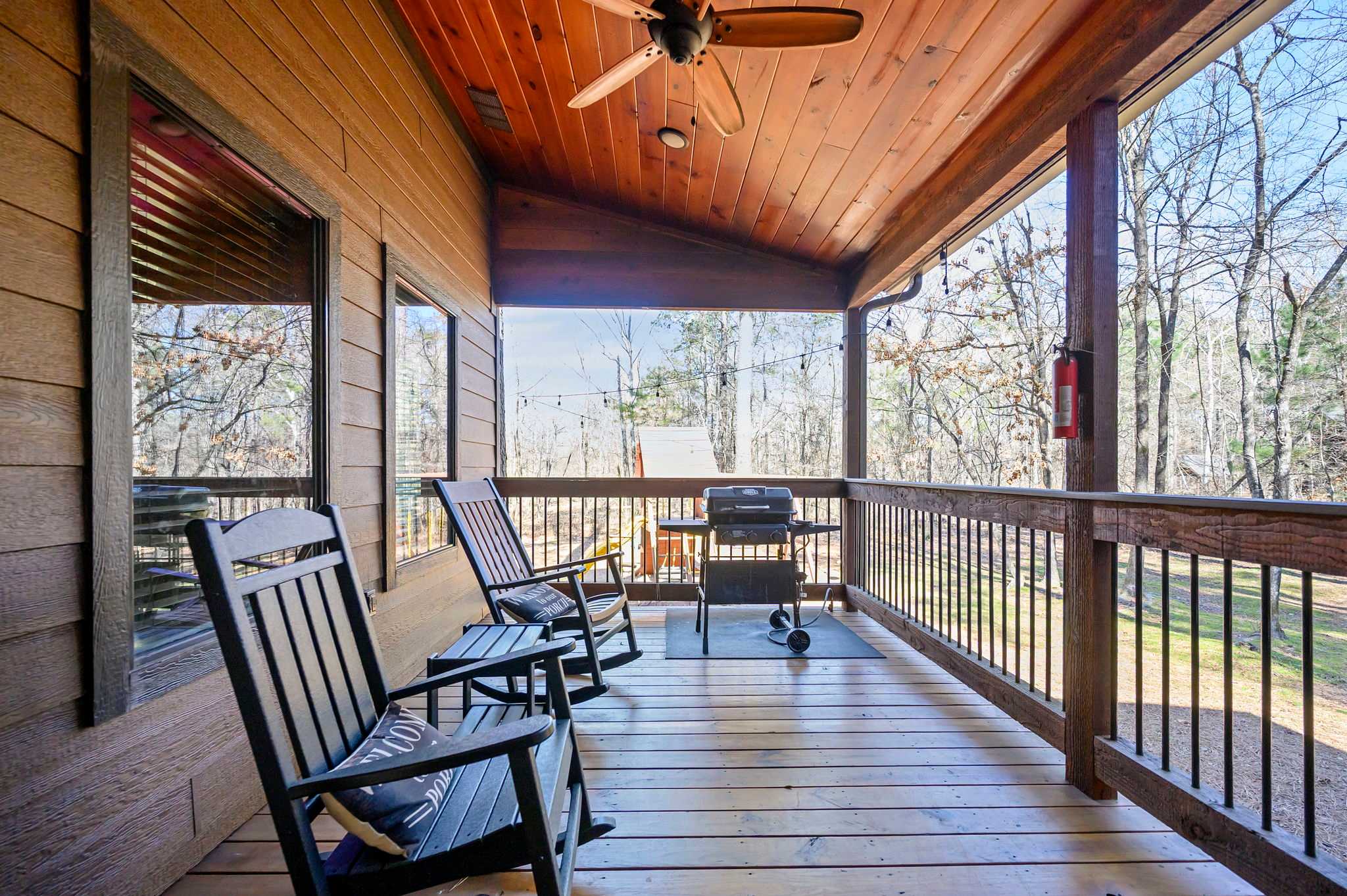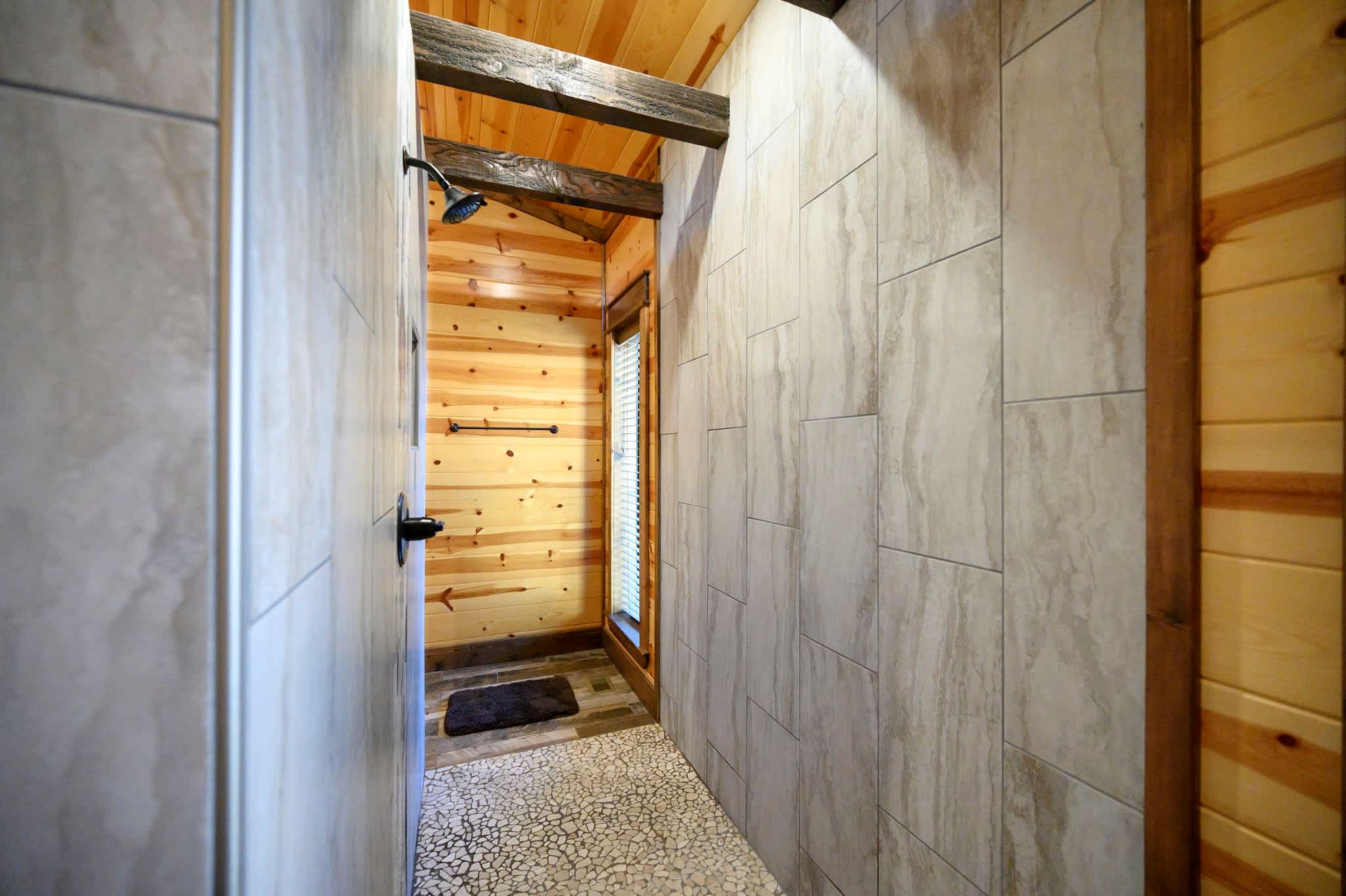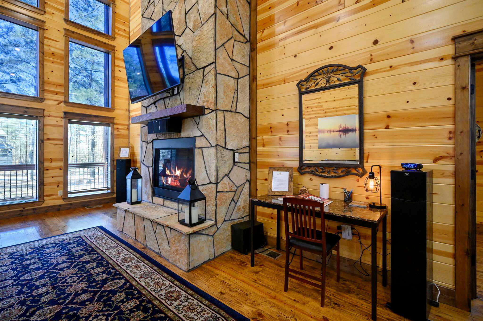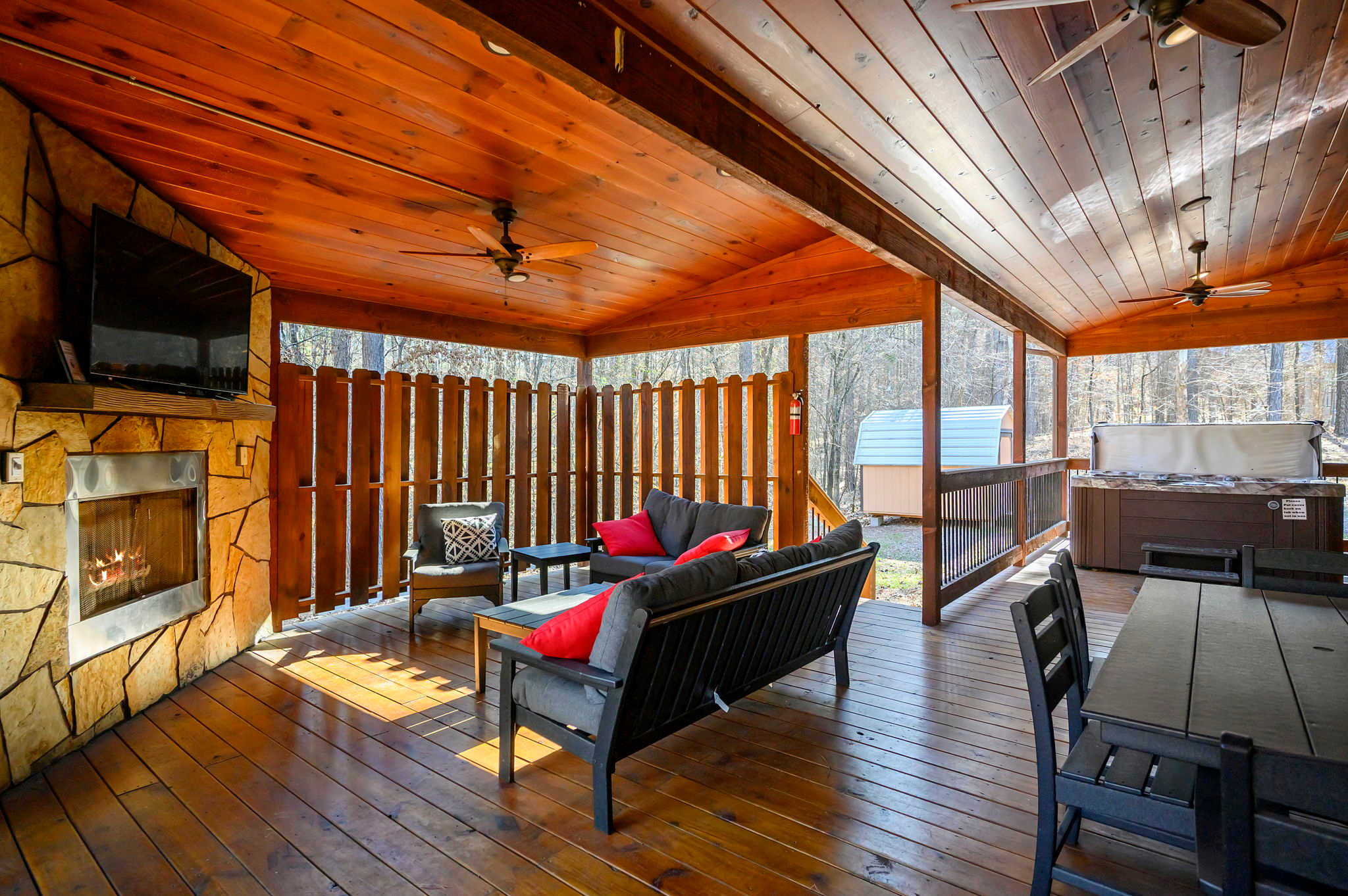 Outside is where Hoot’s Hideaway truly shines. The covered deck feels like a second living room, complete with comfortable seating, its own TV, and an outdoor fireplace—perfect for crisp evenings in the woods. Fire up the grill for dinner and enjoy al fresco dining at the outdoor table, then slip into the hot tub under a canopy of stars. Down in the yard, the fire pit waits for marshmallow roasting, storytelling, and late-night laughter.
